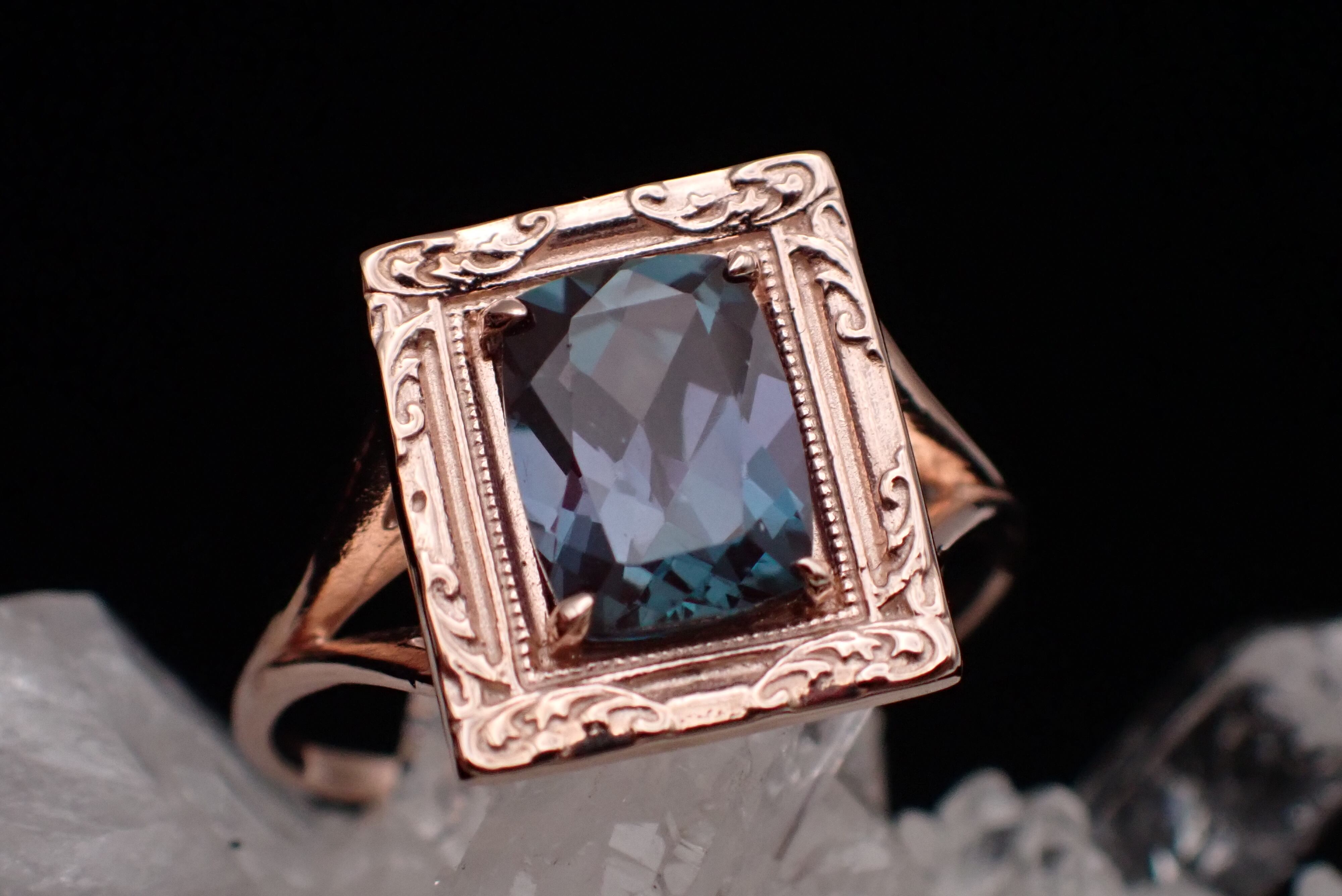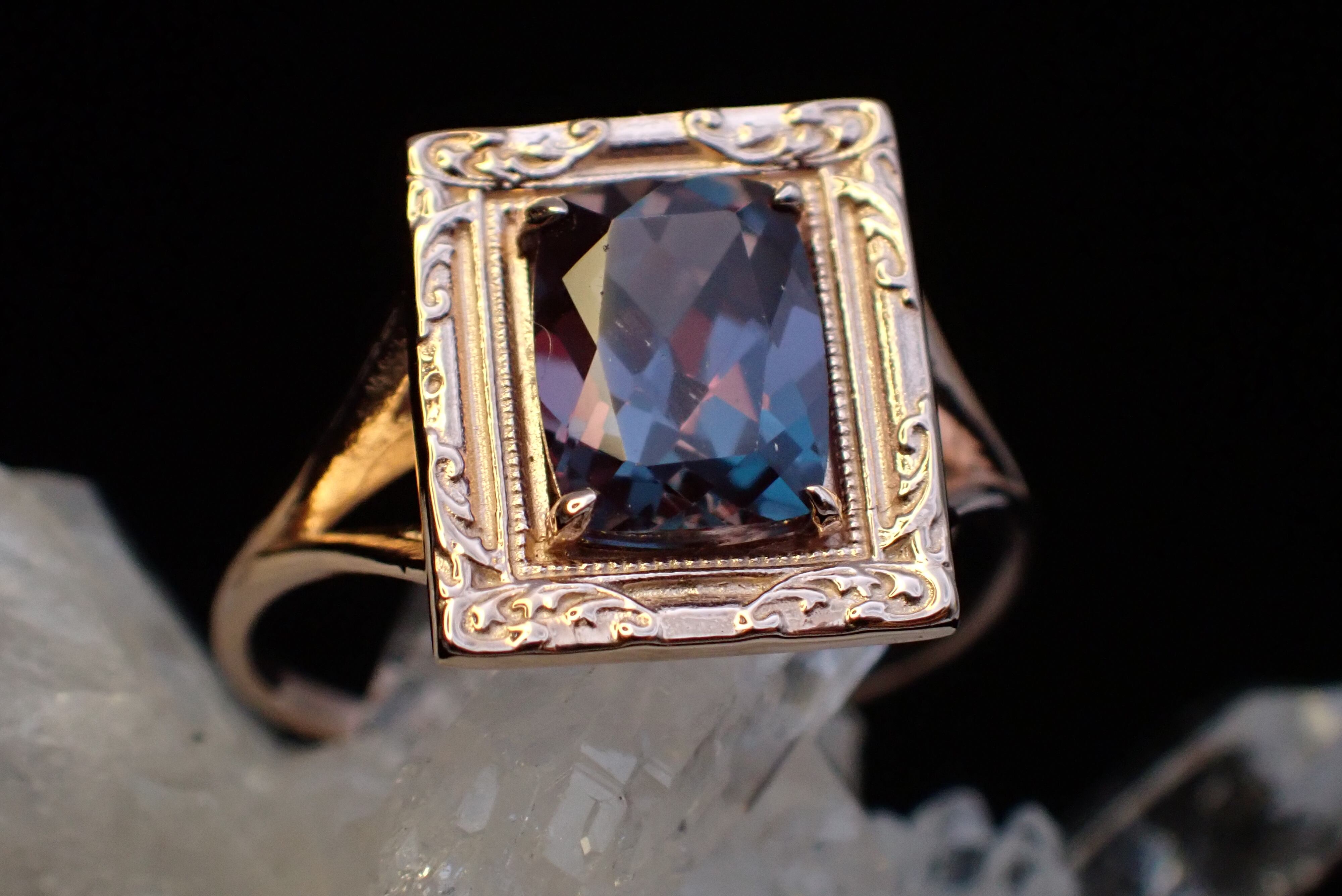 カラーチェンジと蛍光の美しい合成アレキサンドライトを絵画のように、美しい額縁の中へ納めました。