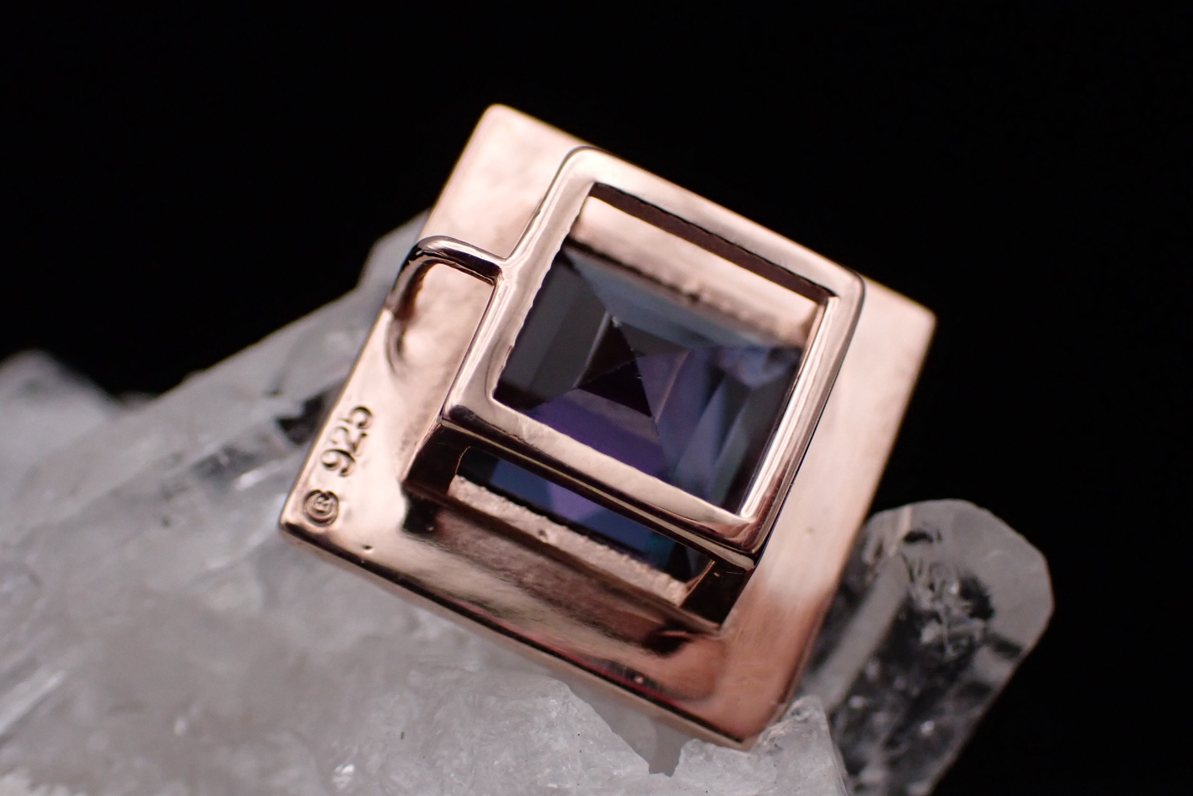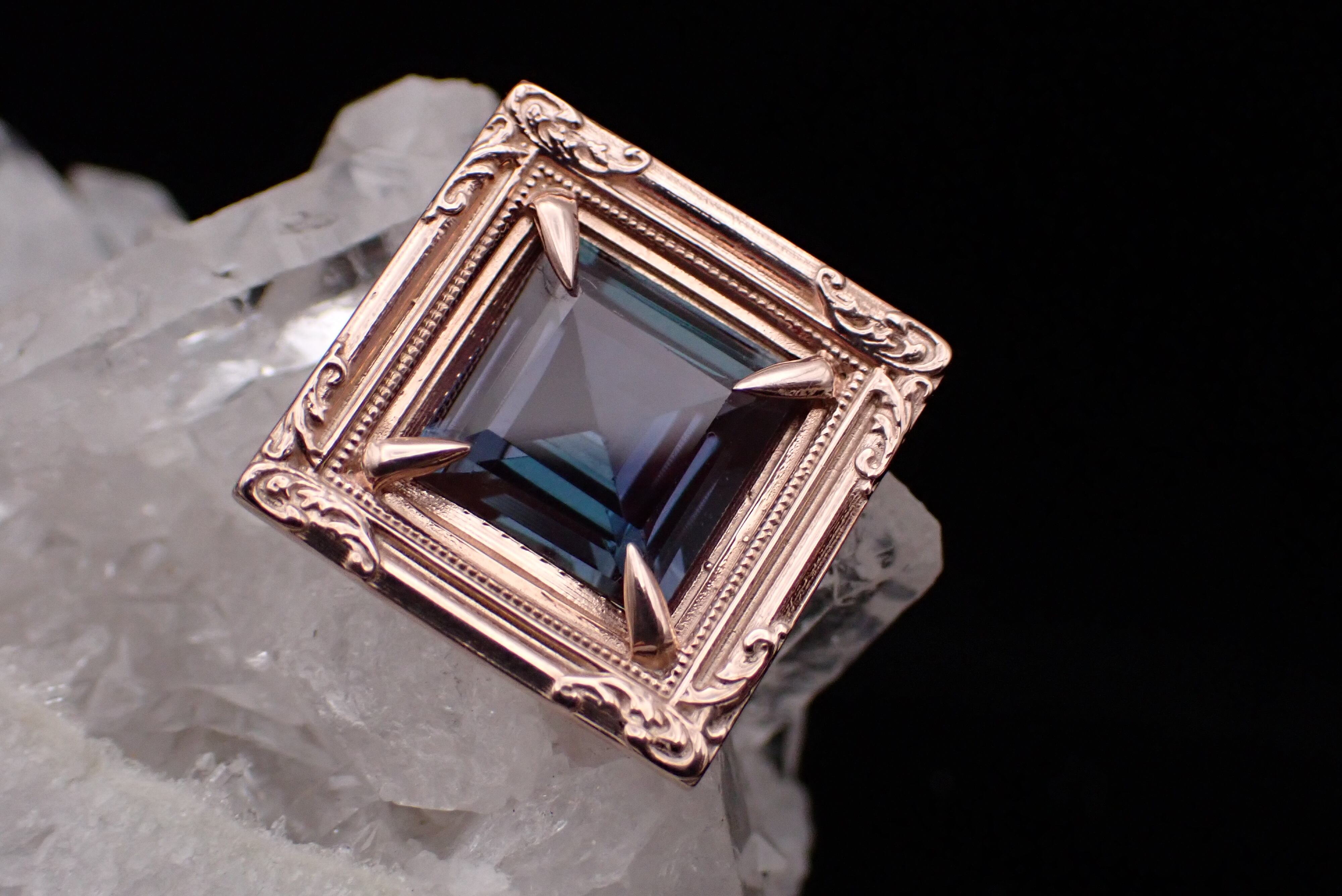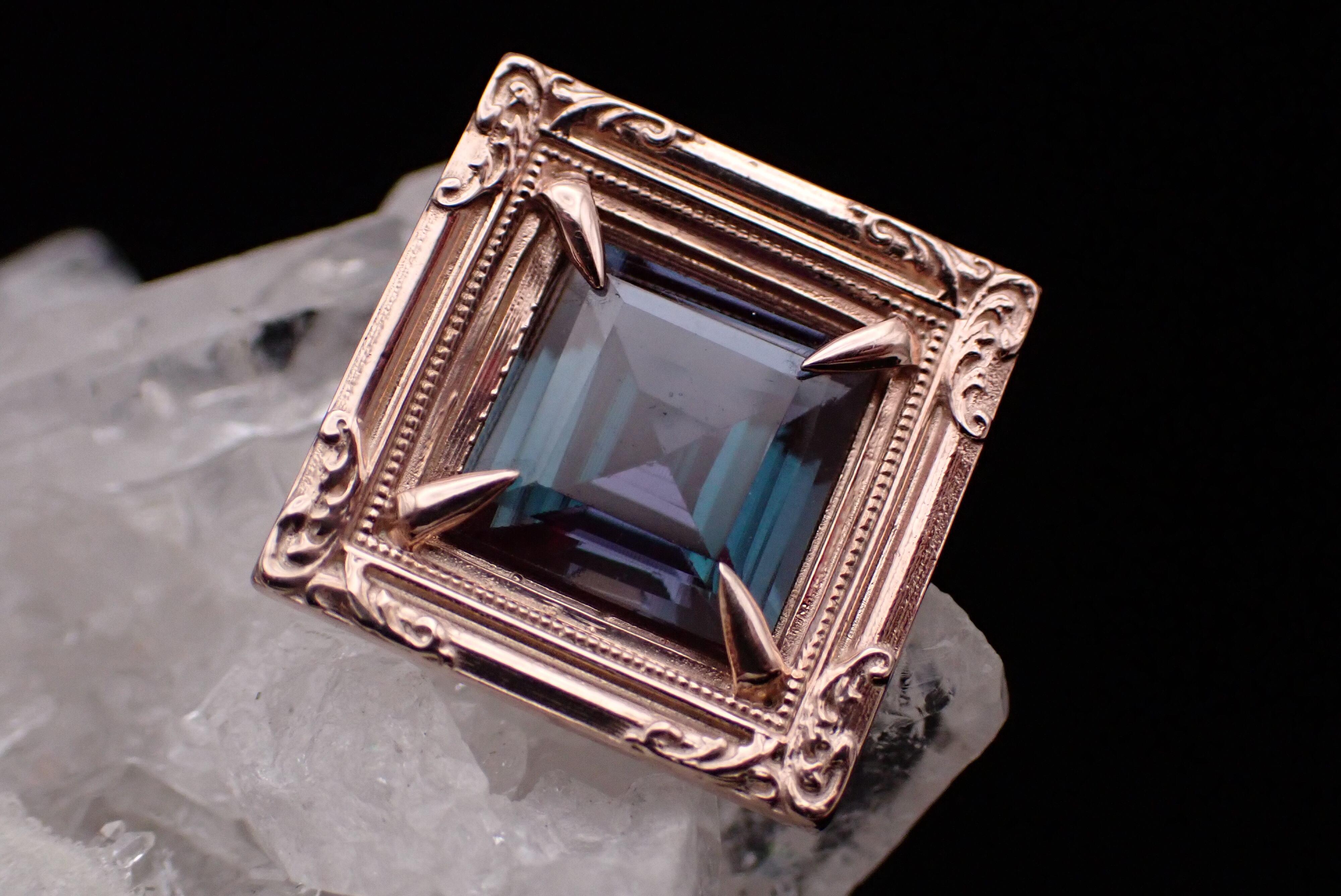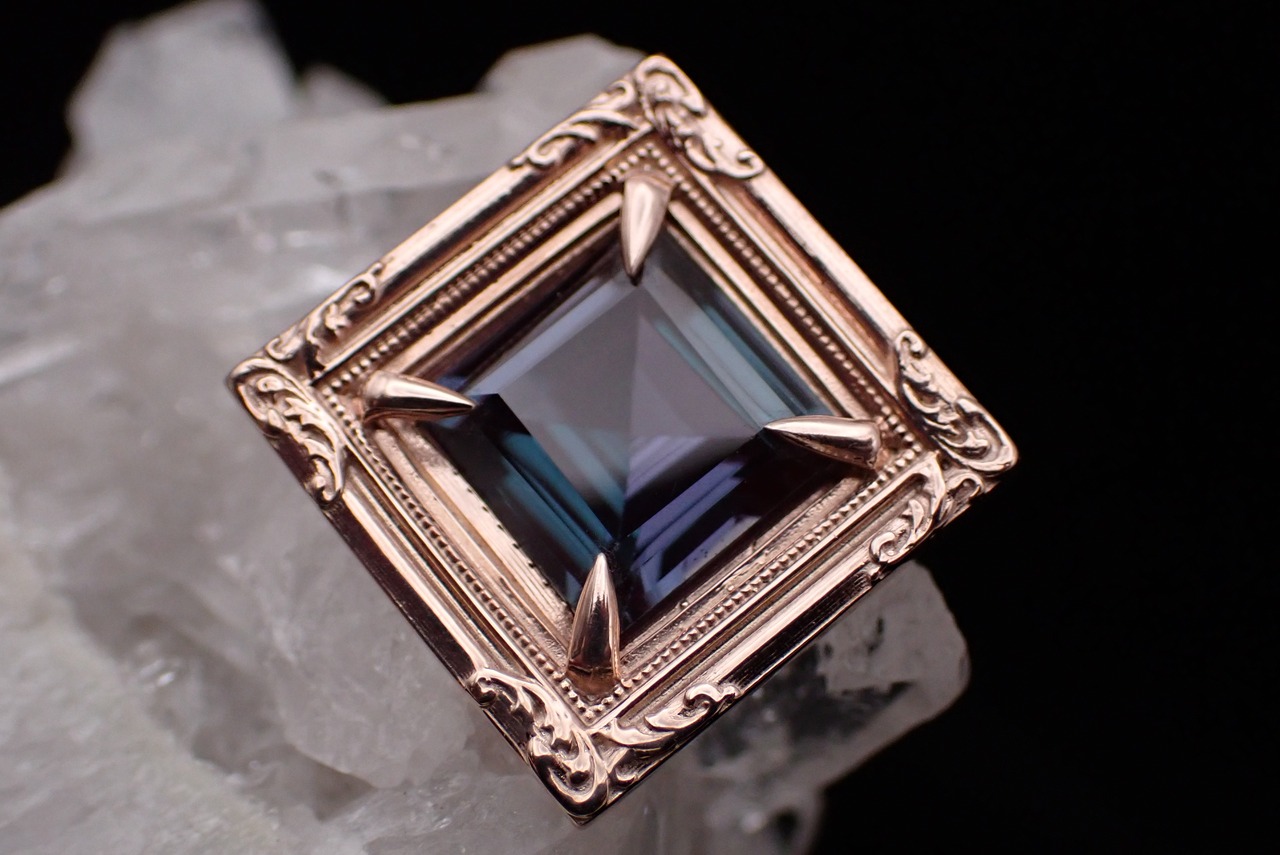 まるで石を絵画のように、美しい額縁の中へ合成アレキサンドライトを納めました。