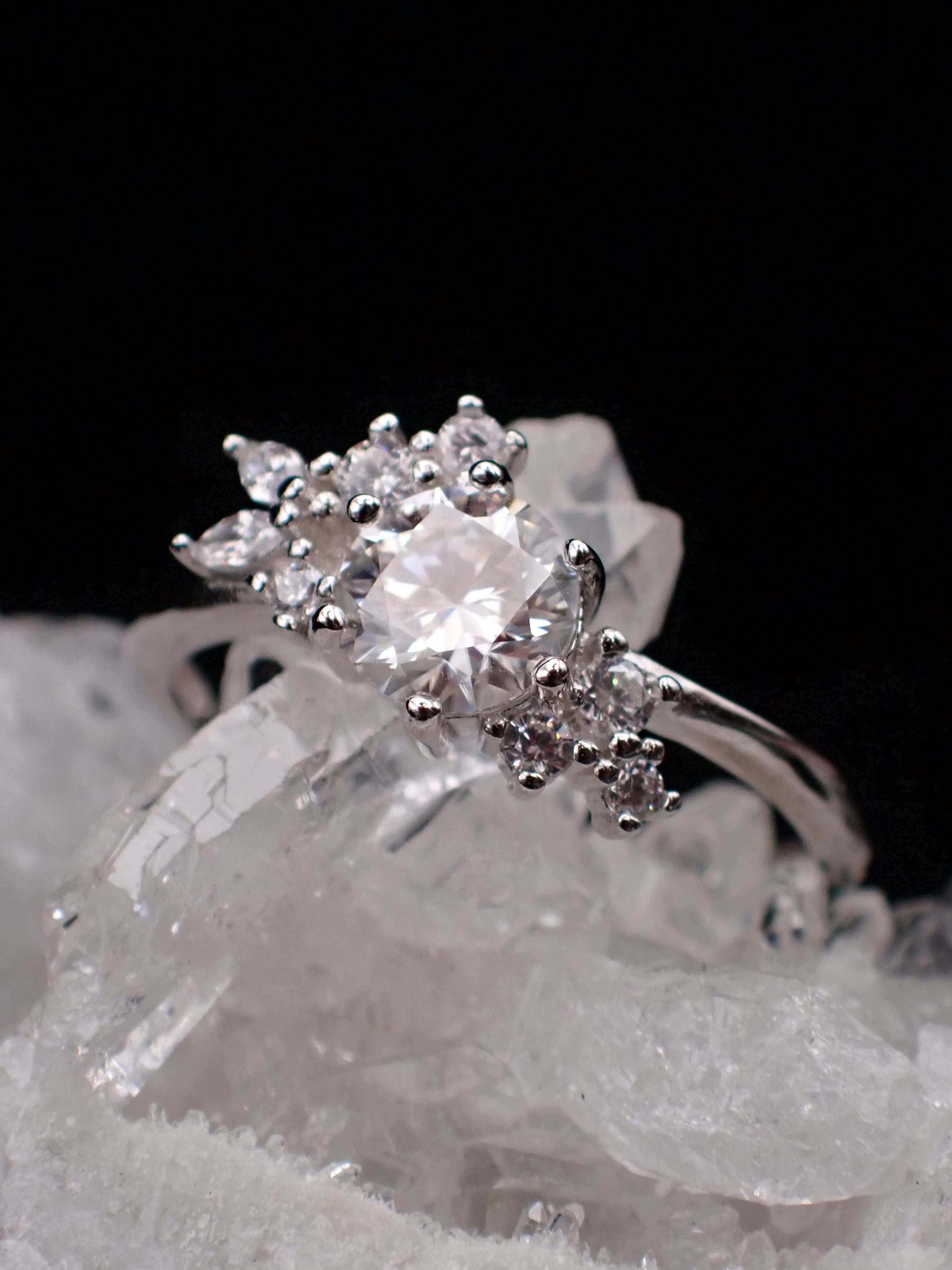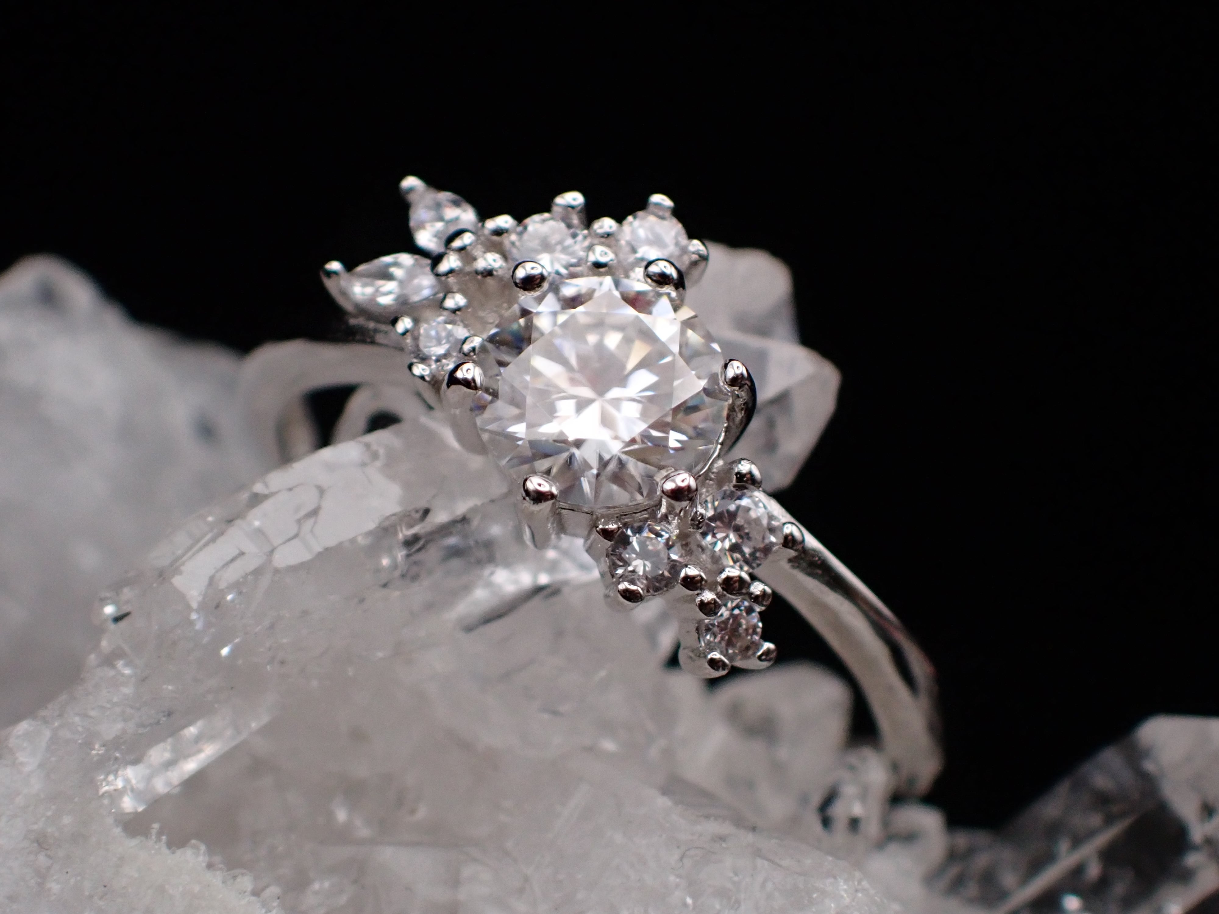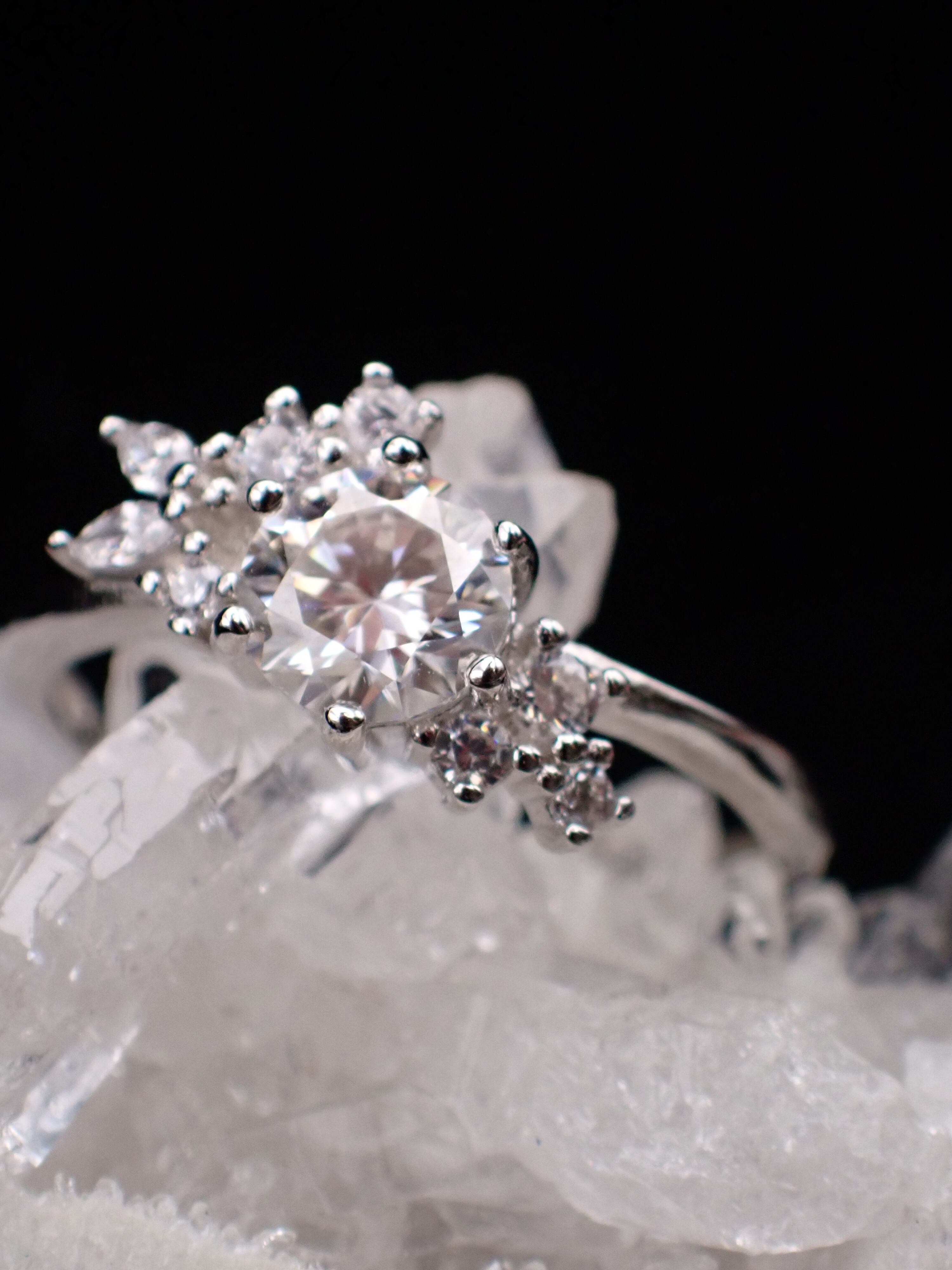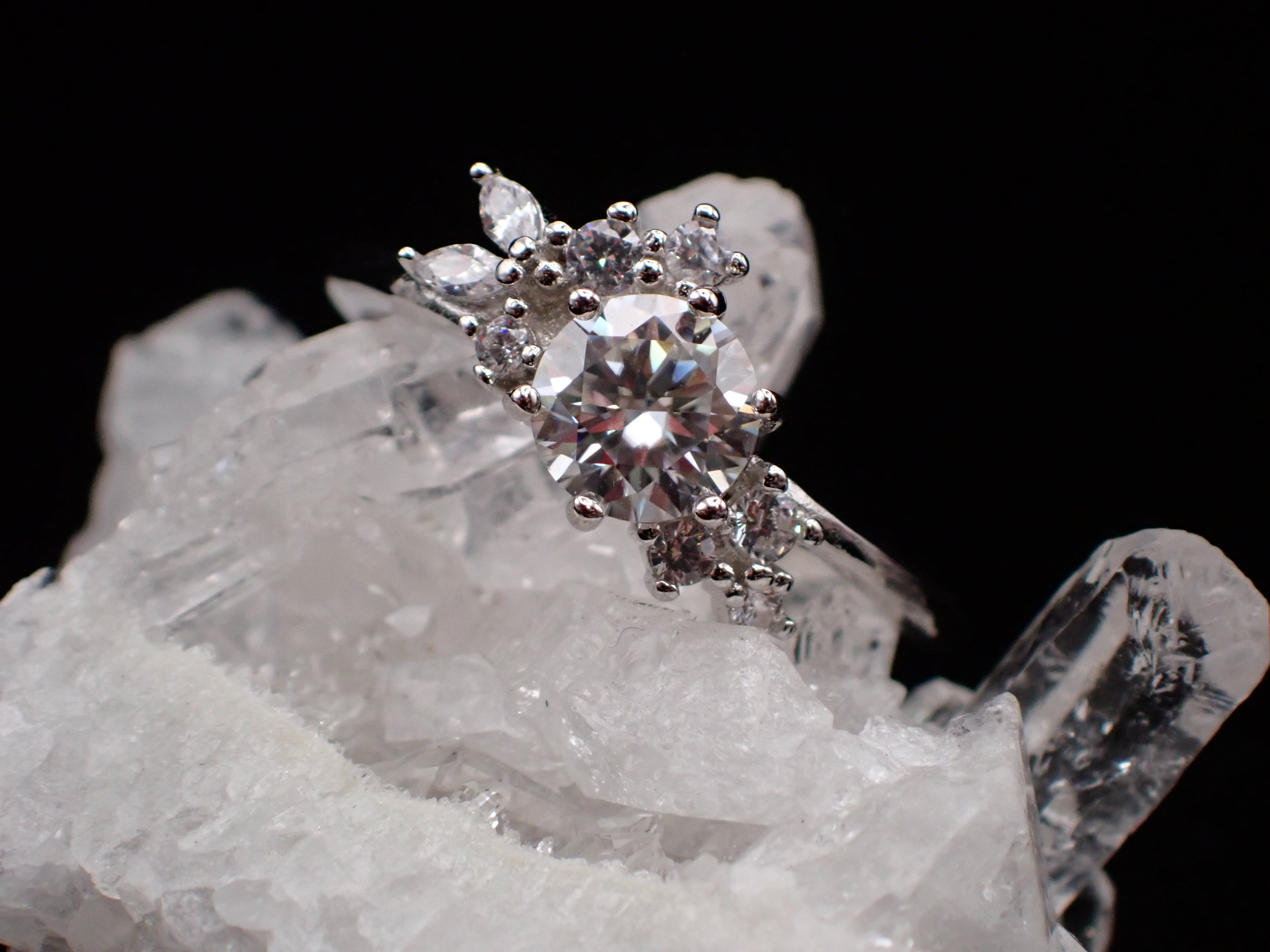 花束のように並んだ小さなジルコニアたちが、カットが美しいモアッサナイトをさらに輝かせる繊細なリングです。