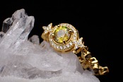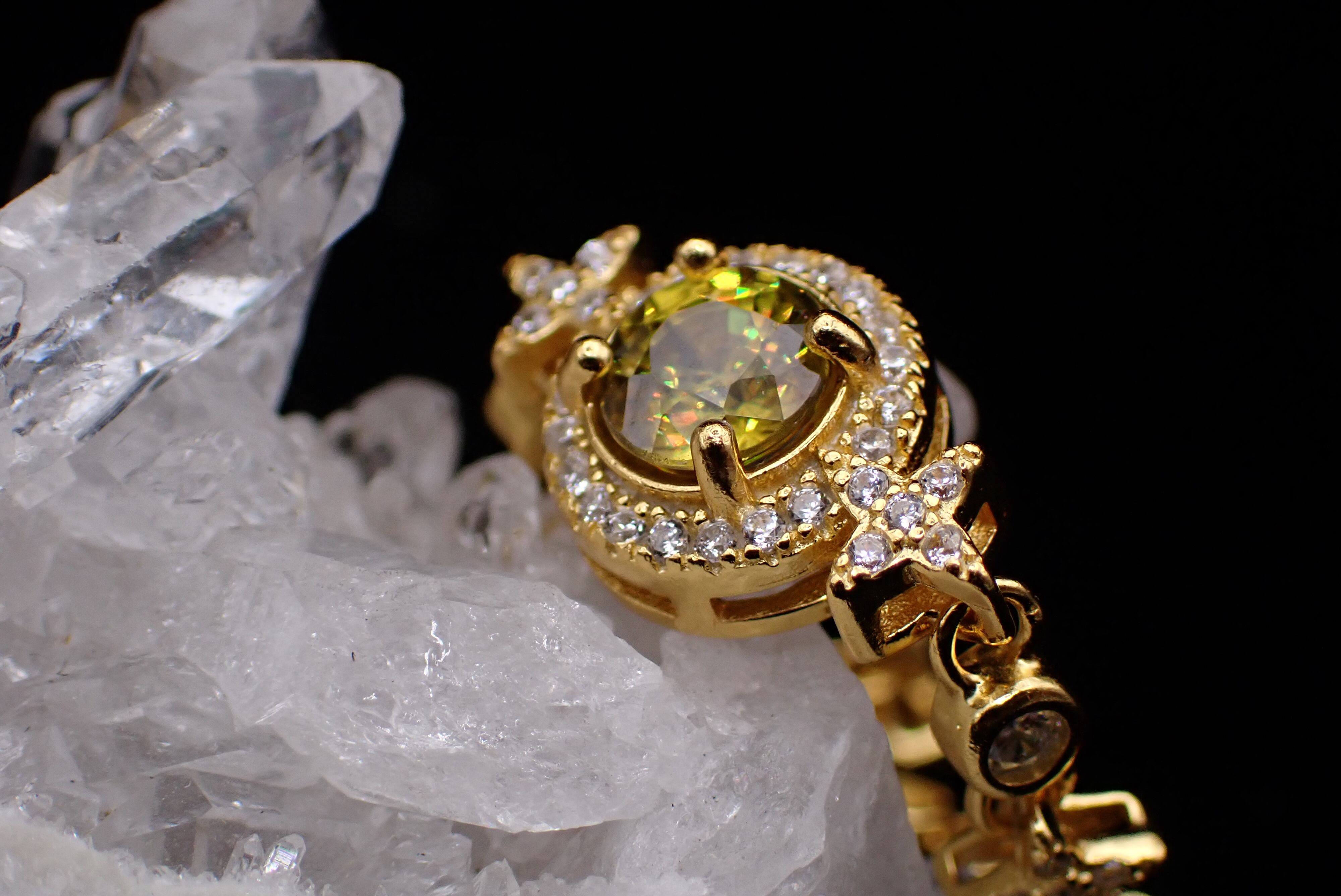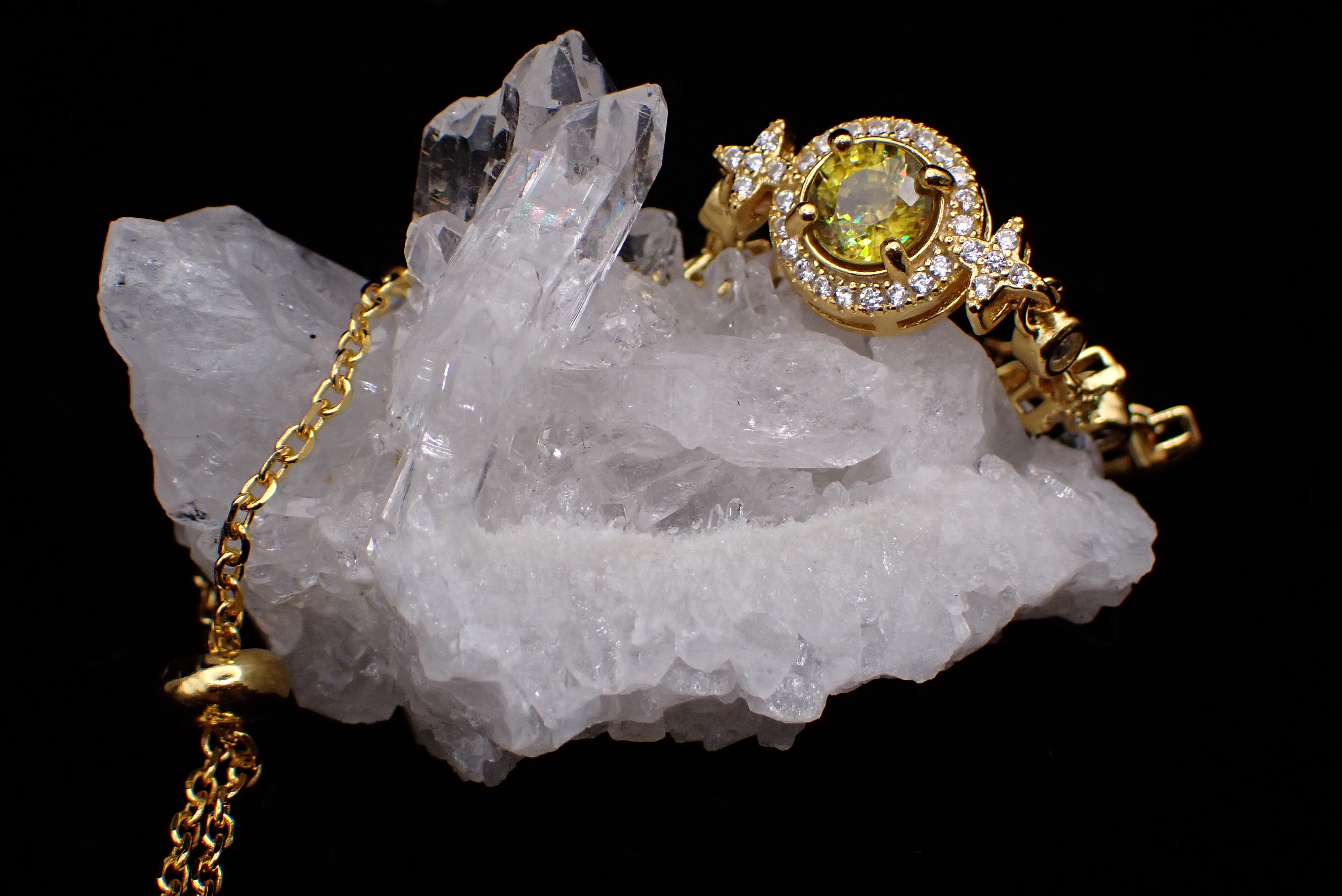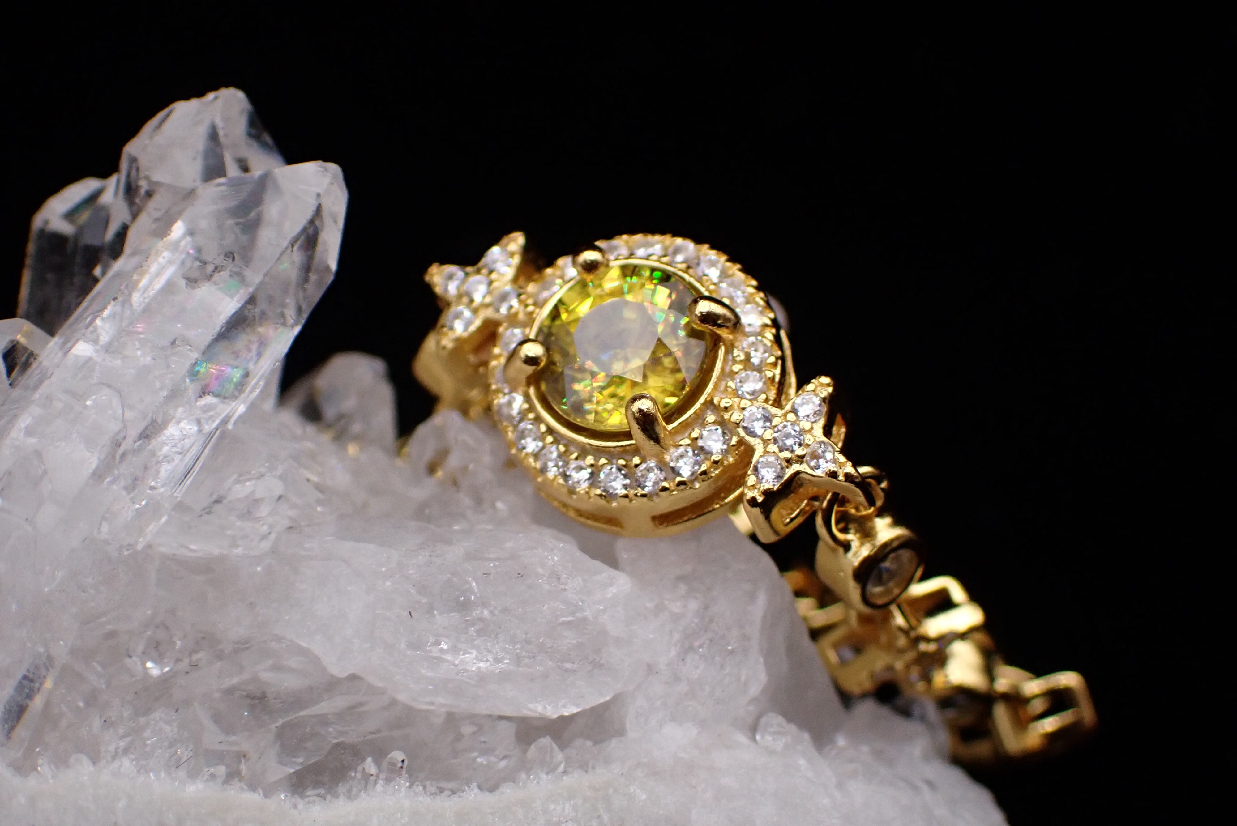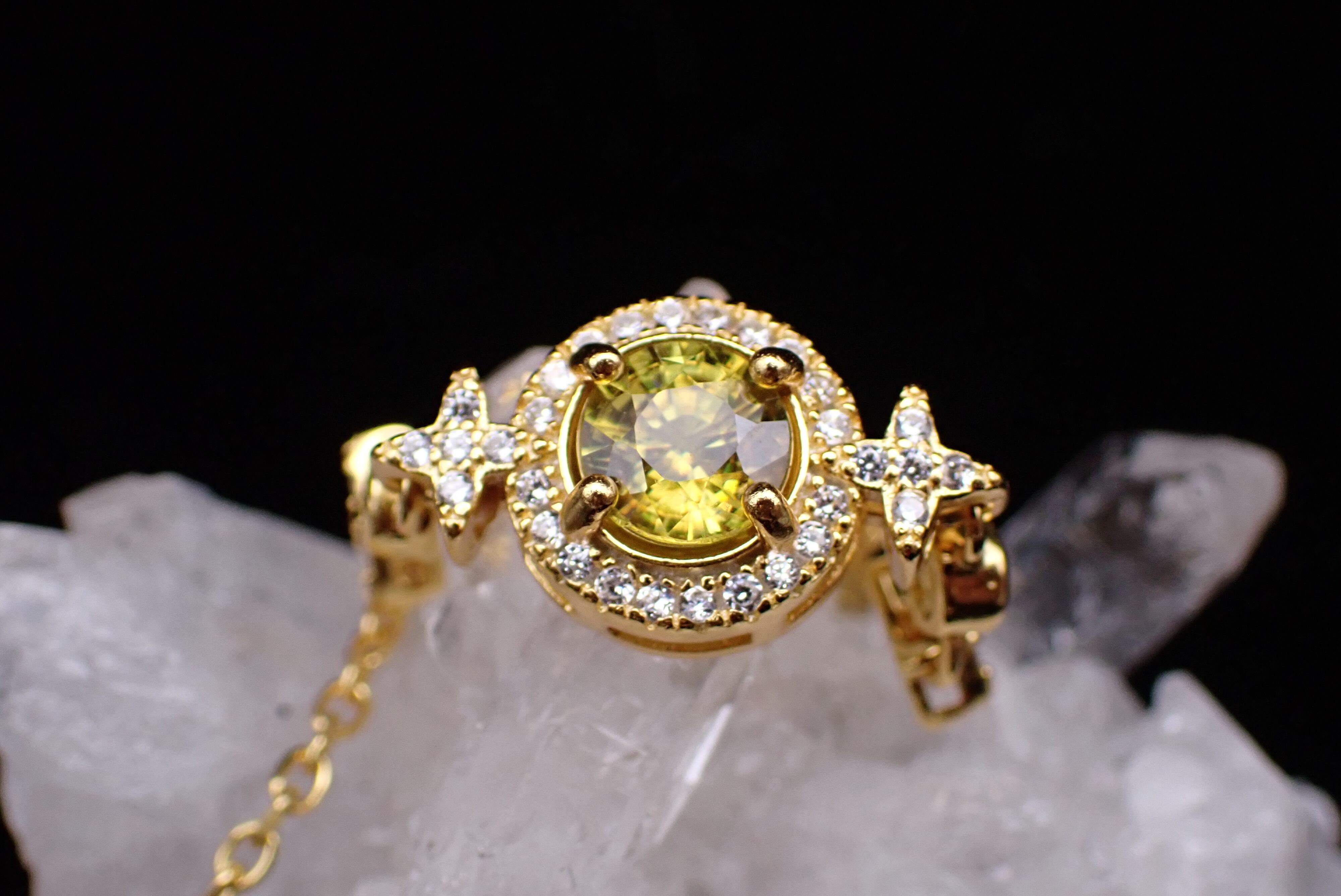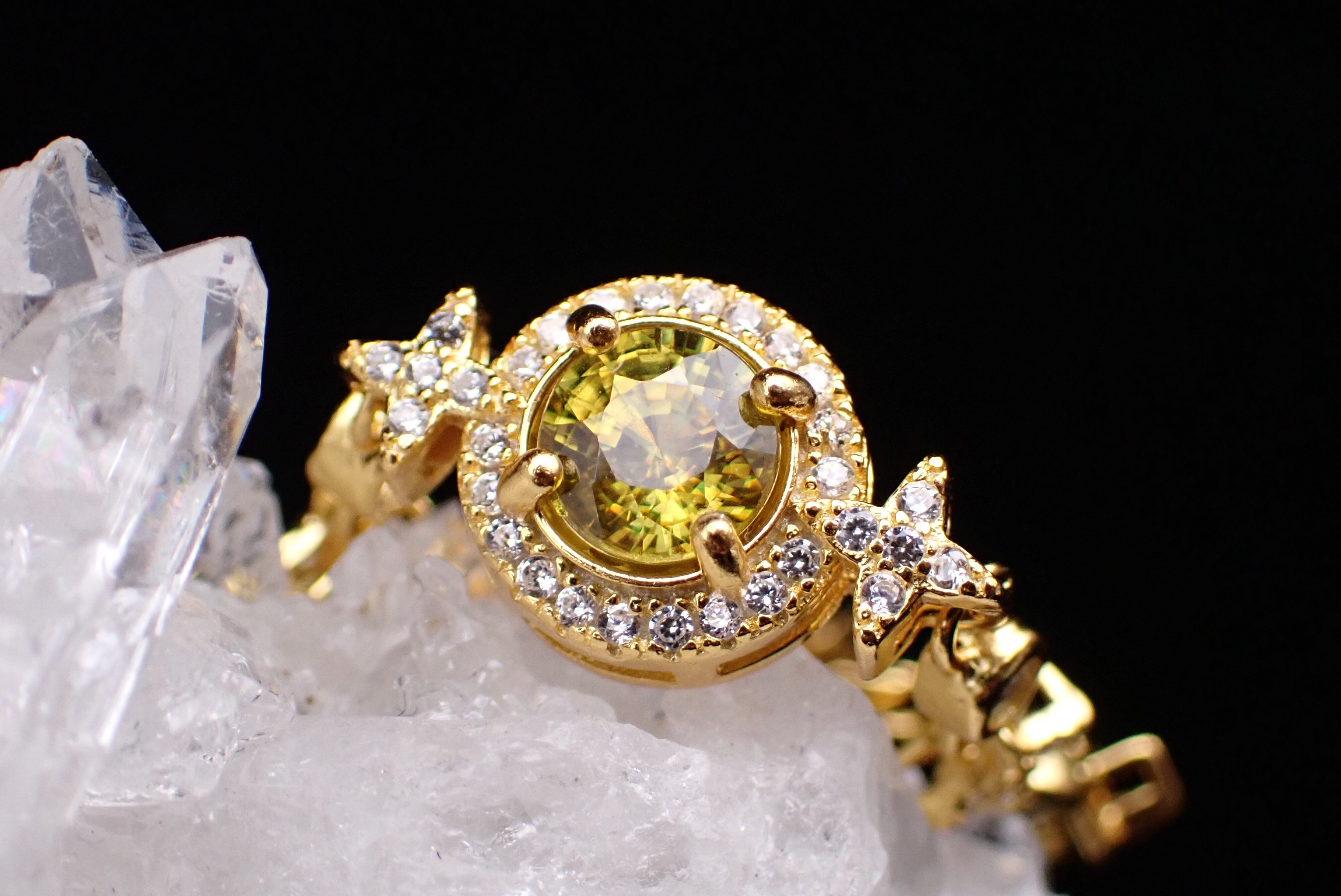 まるで流星群のように星たちが連なった中央に、ギラギラとしたファイアの見えるスフェーンが輝きます。