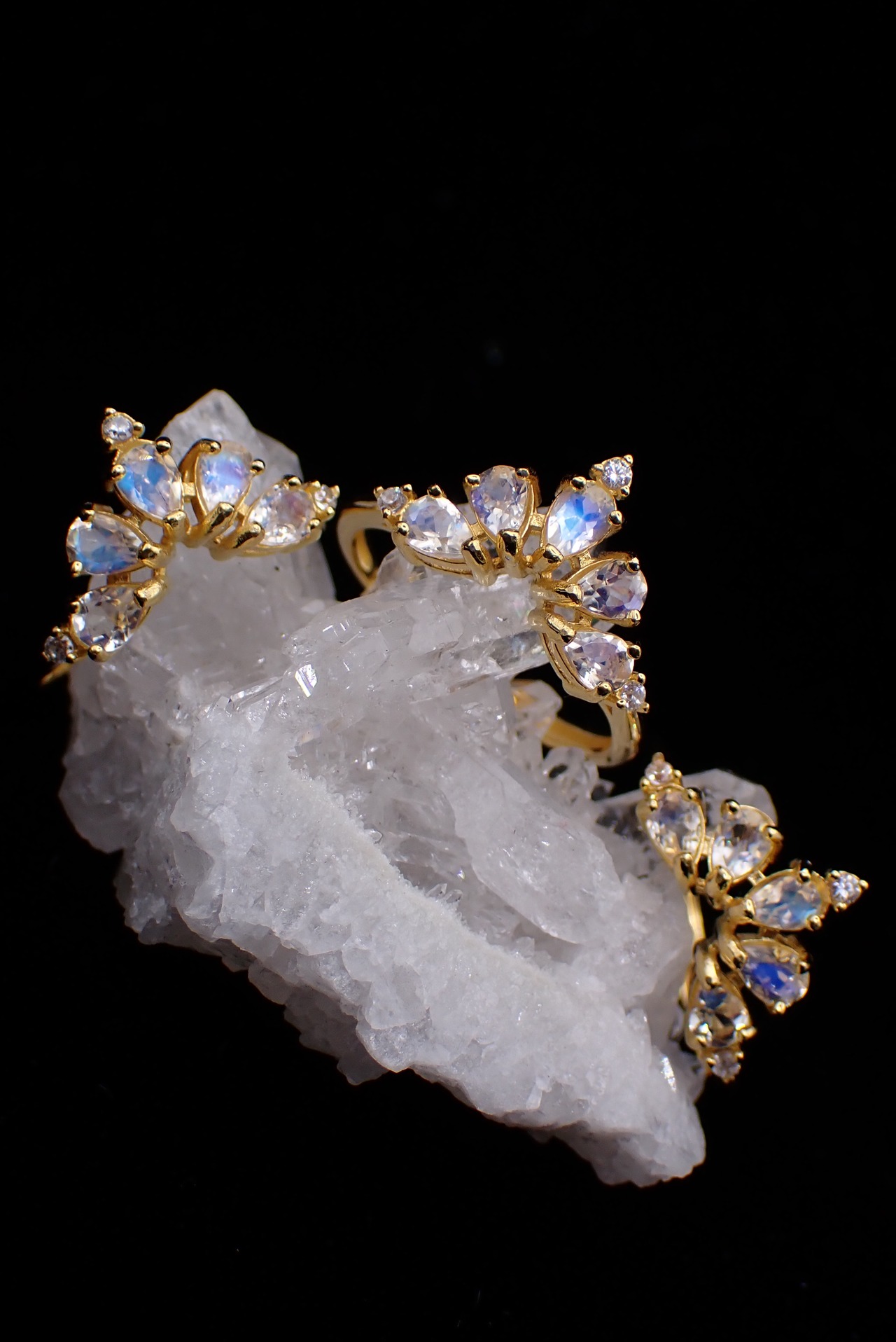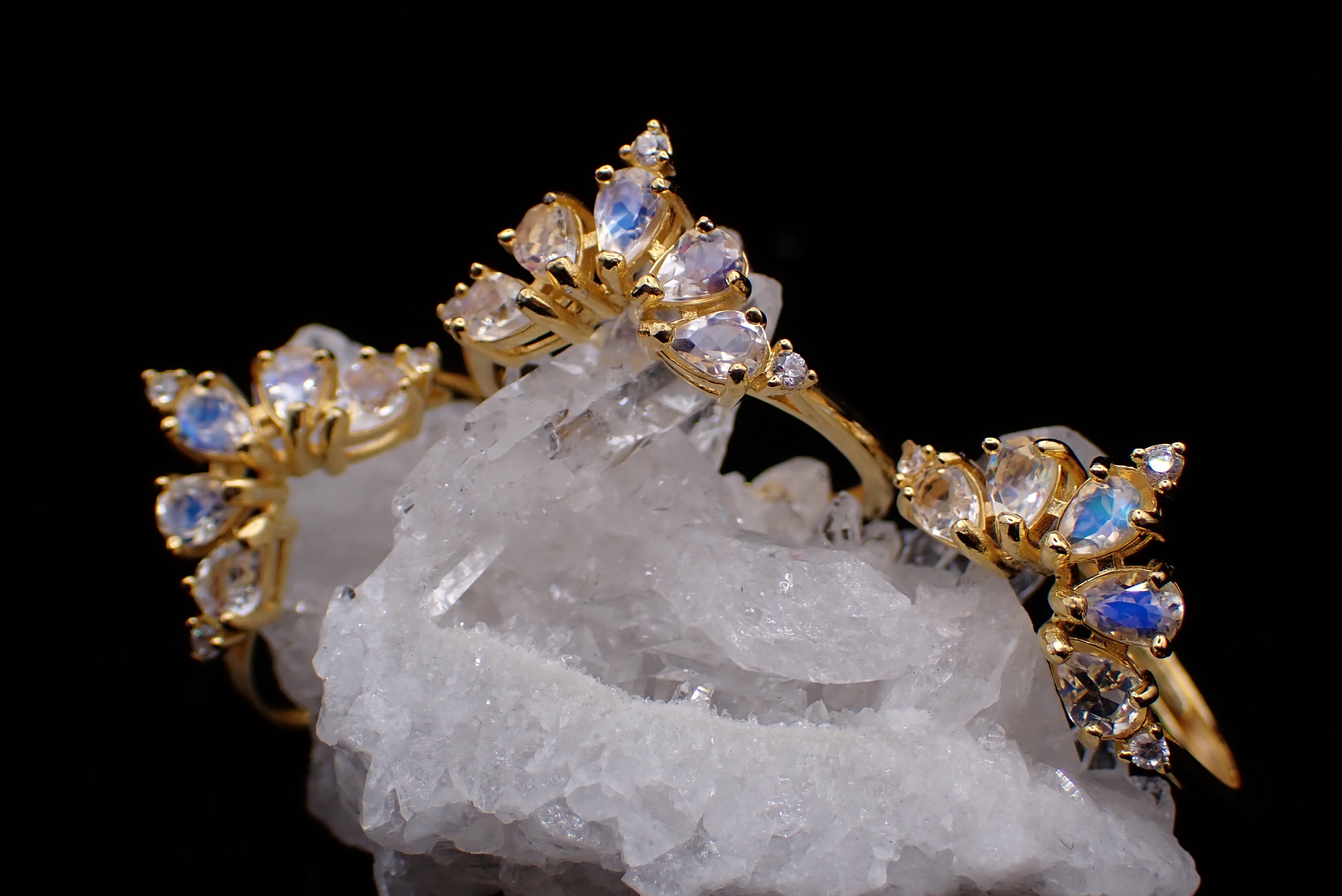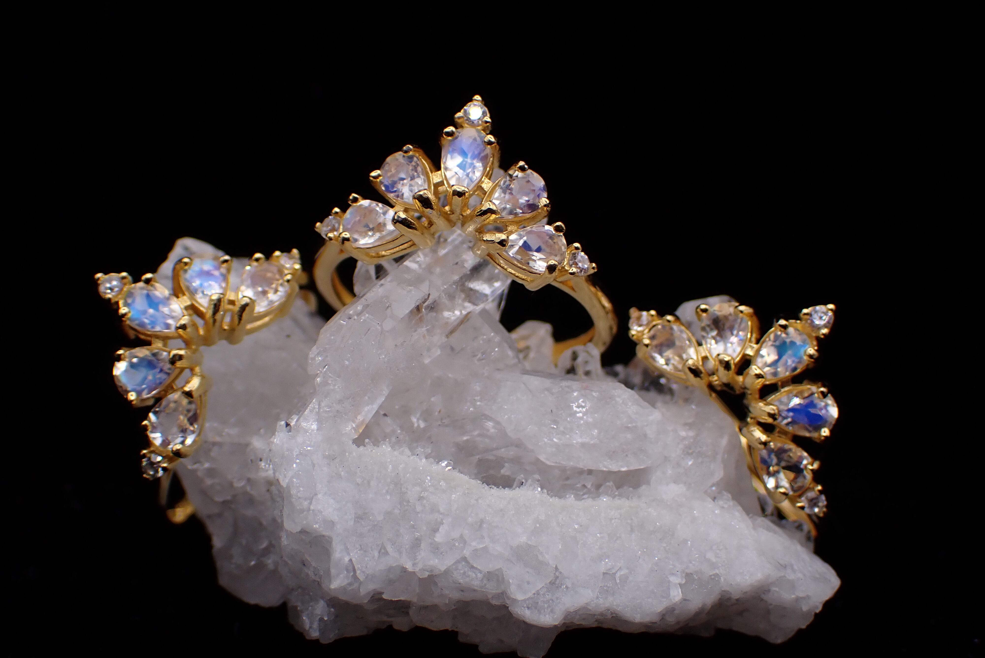 ドロップのアンデシンラブラドライトたちが5つ、孔雀が羽根をひろげたように並んだリングです。