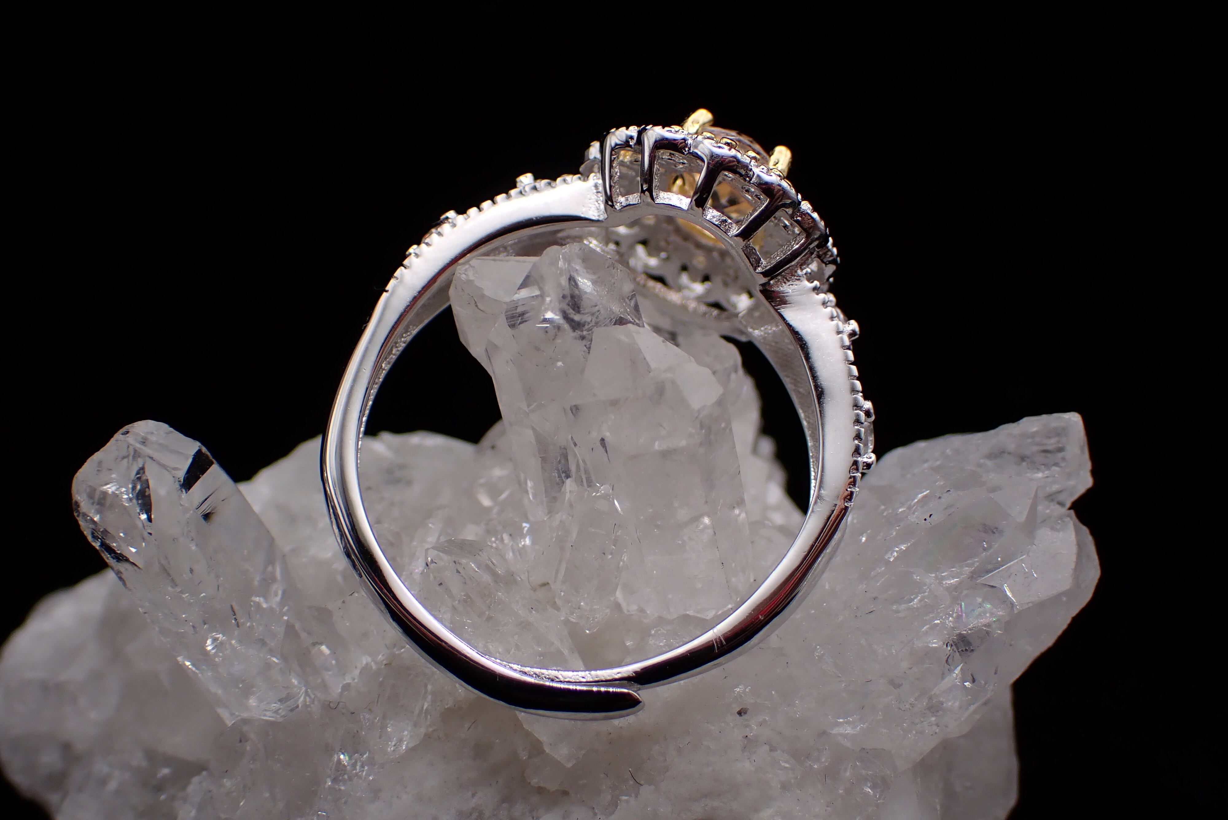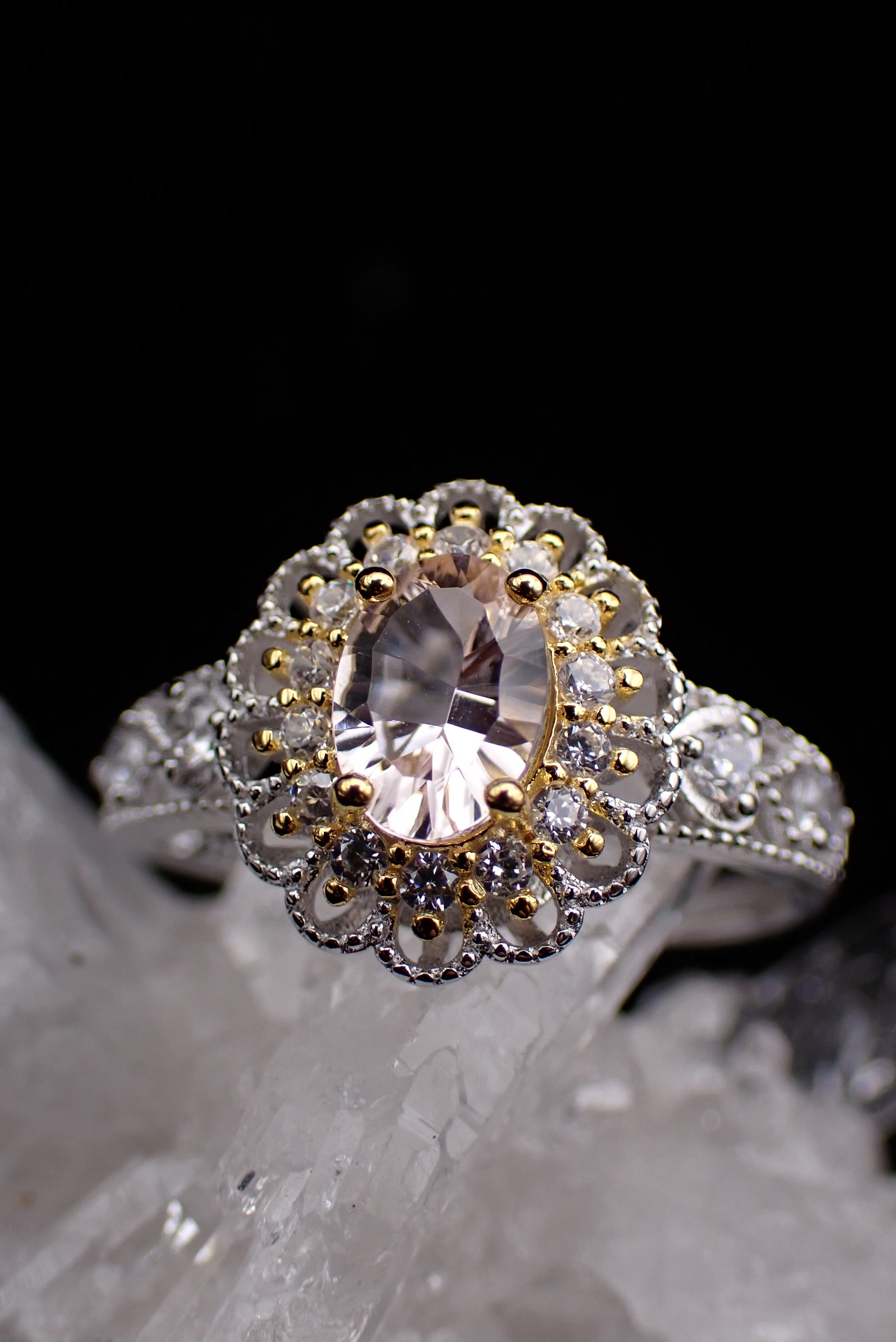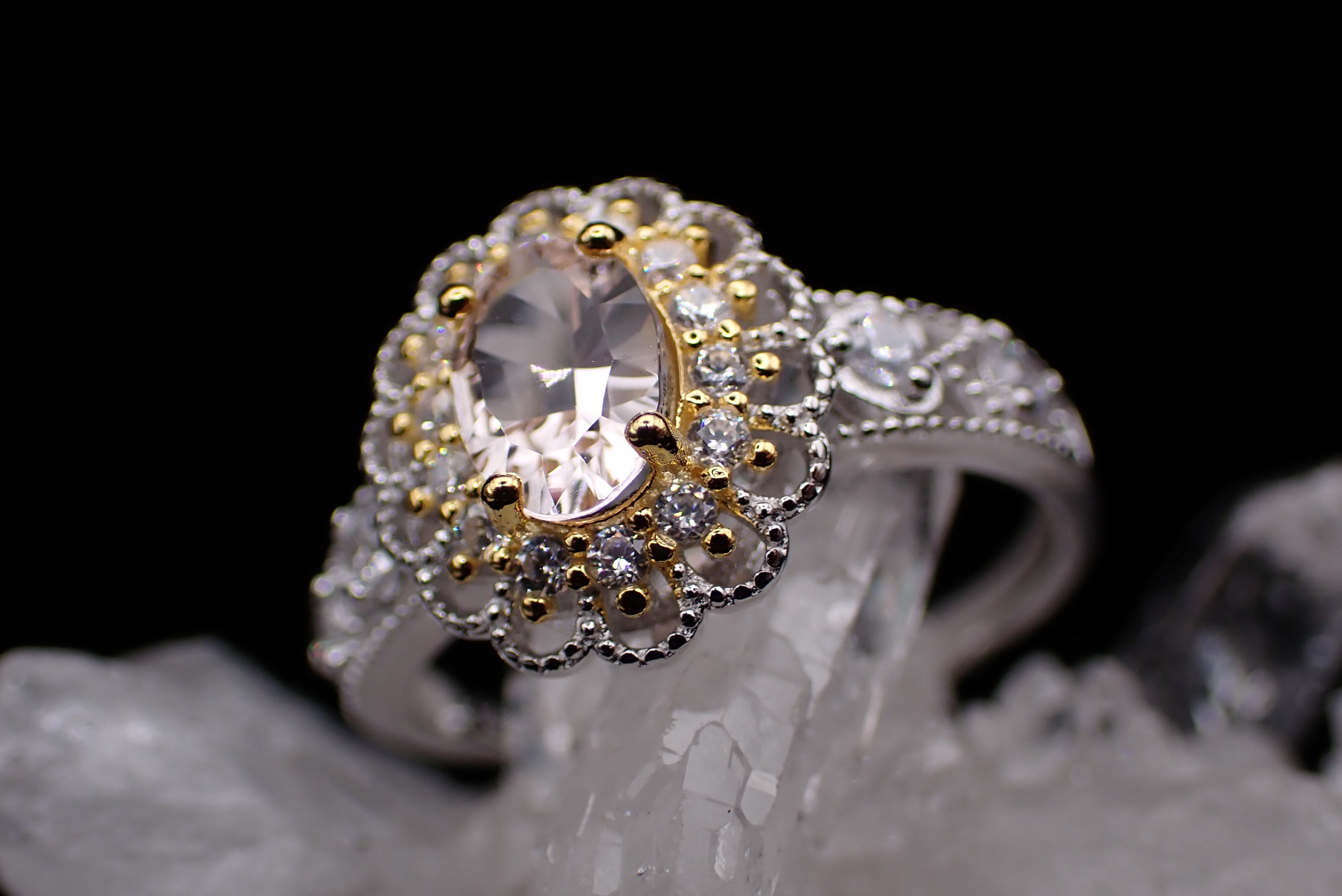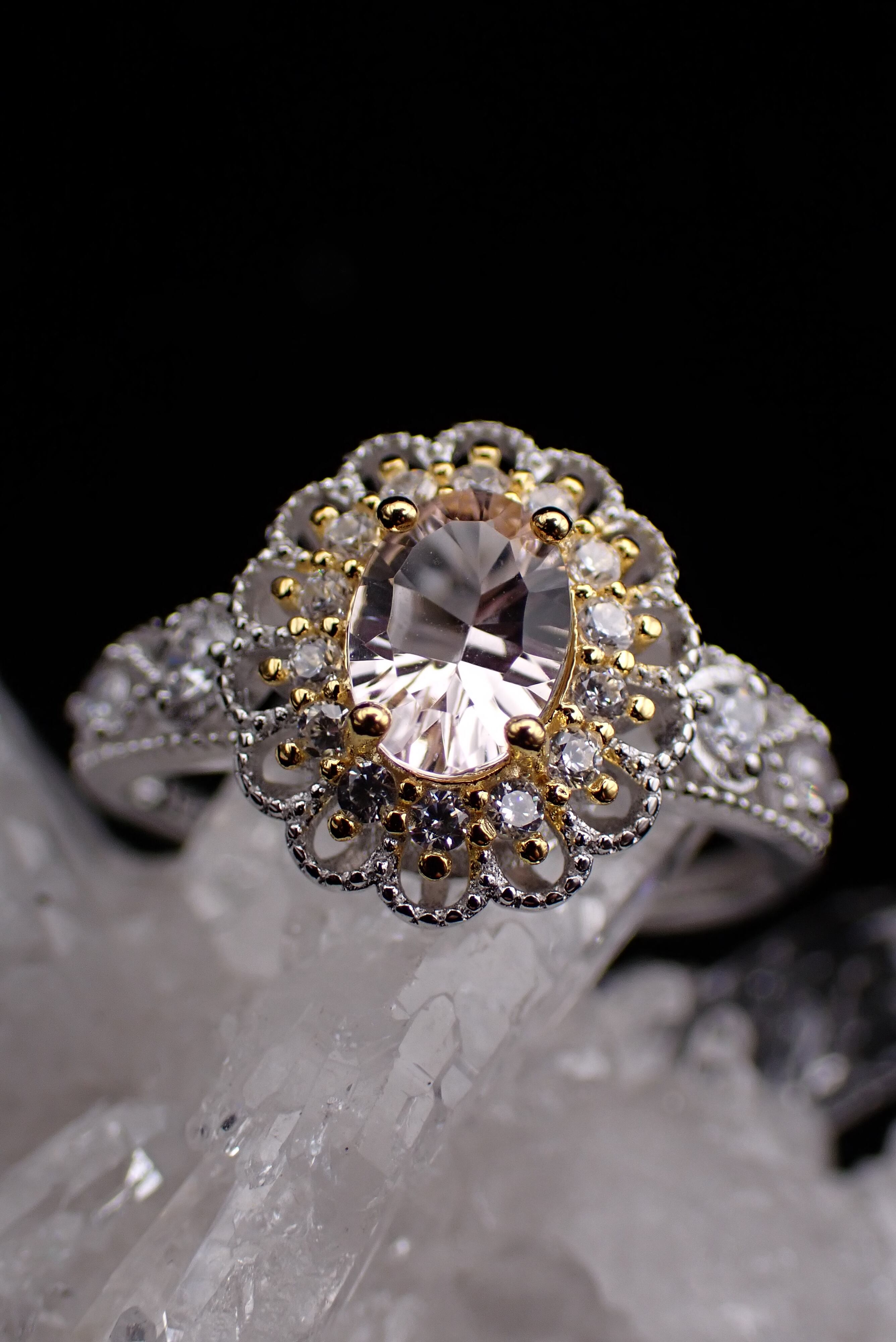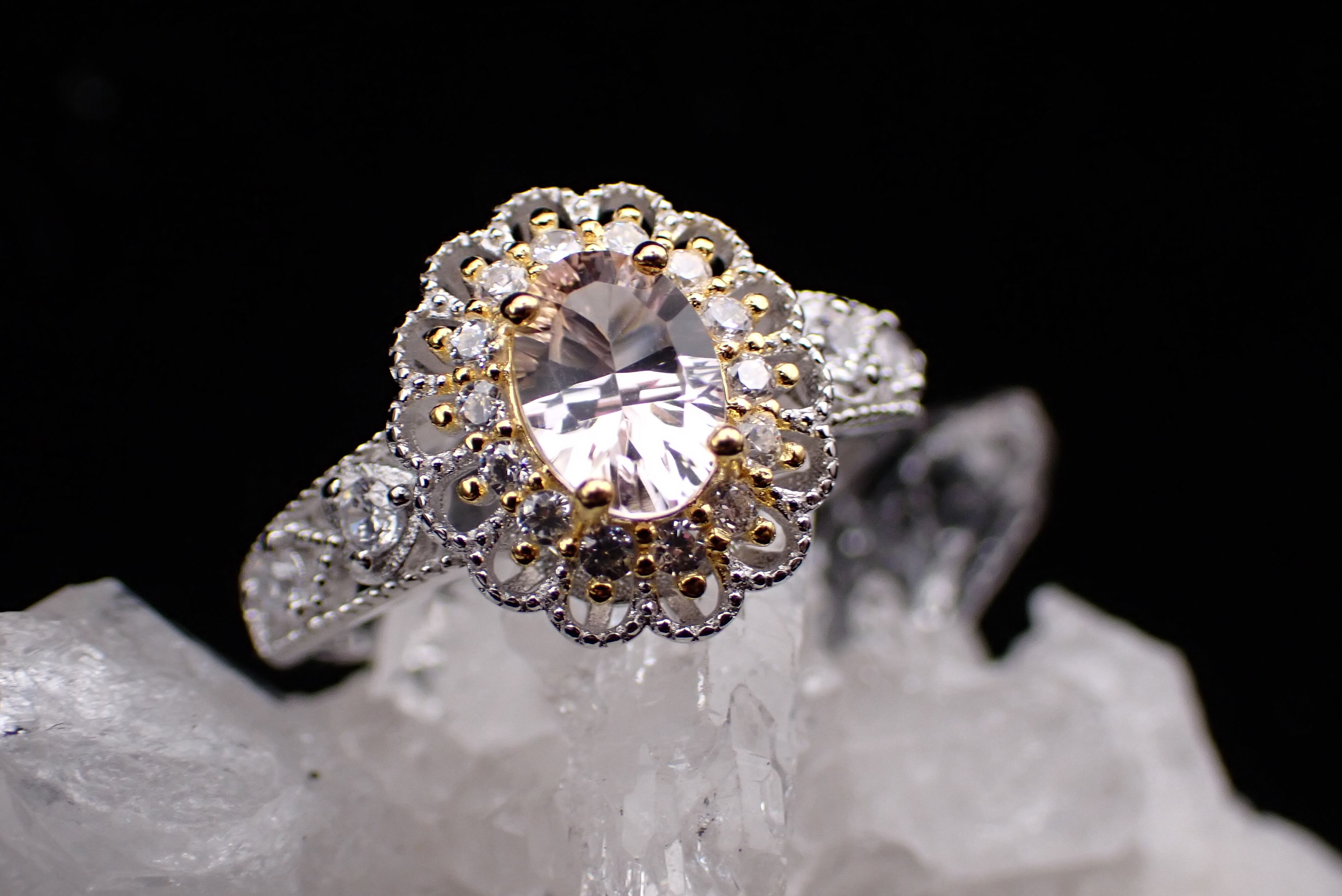 可愛らしく花開くジルコニアたちがキラキラと輝き、美しいモルガナイトの輝きを引き立てます。