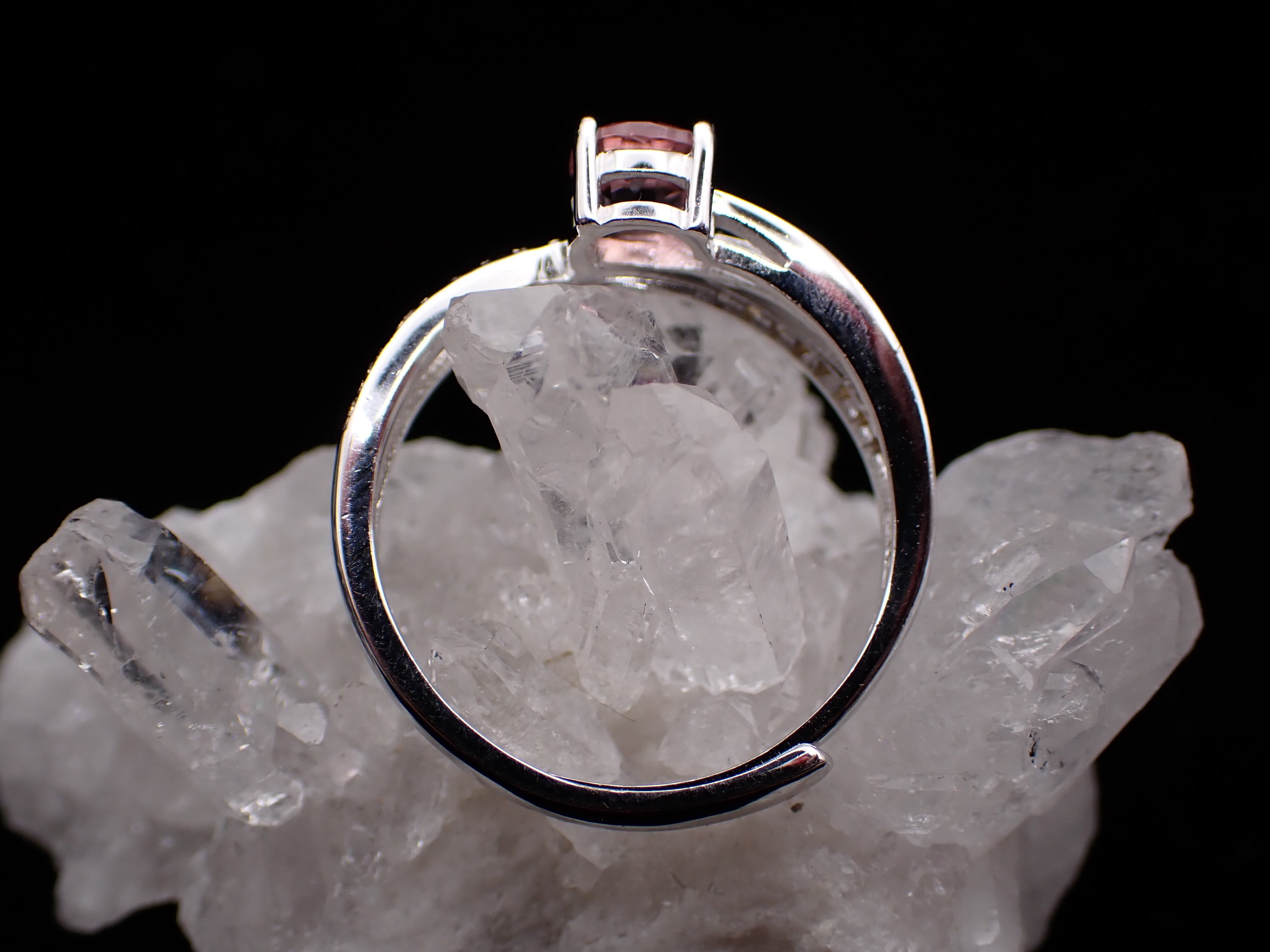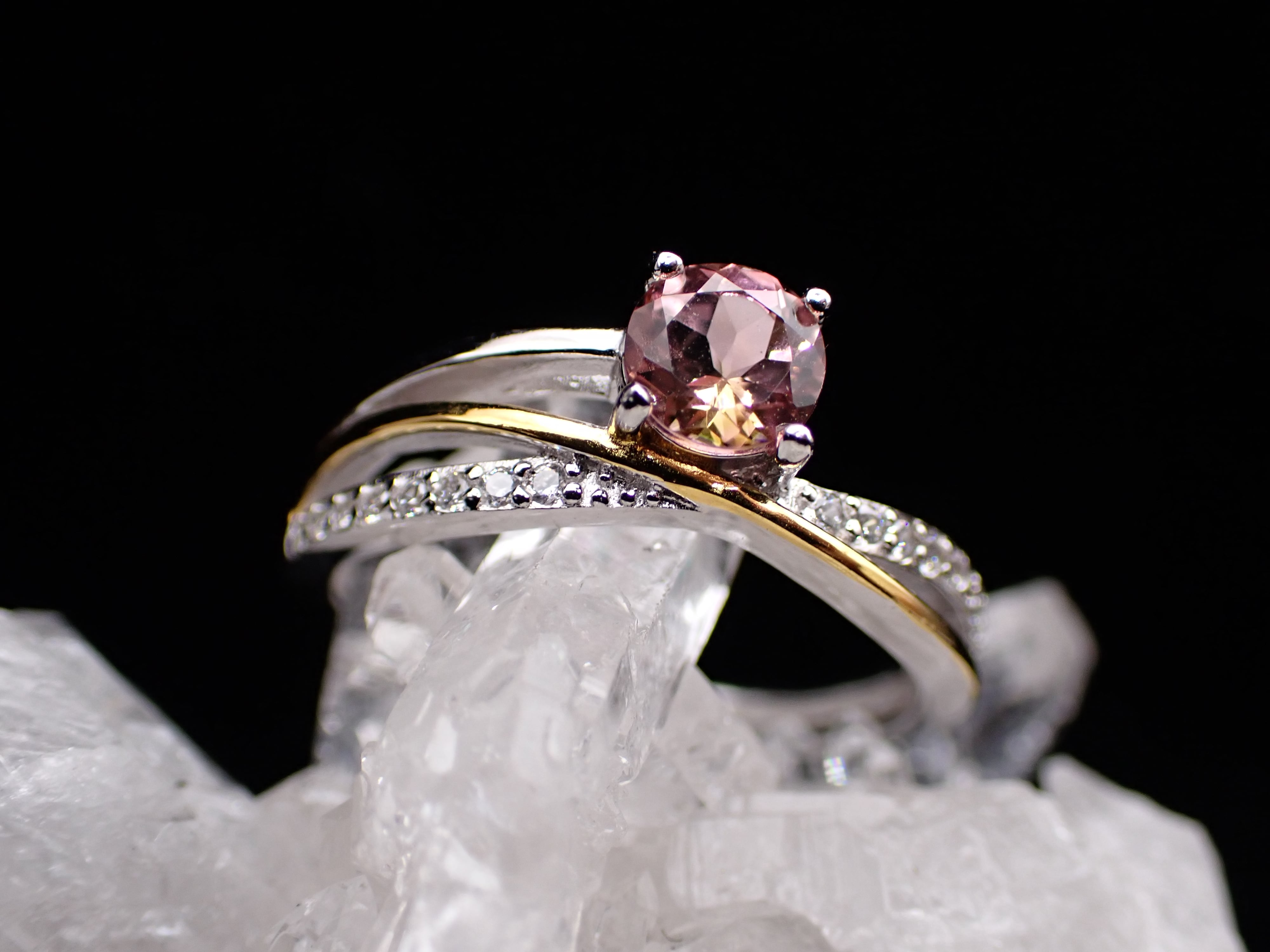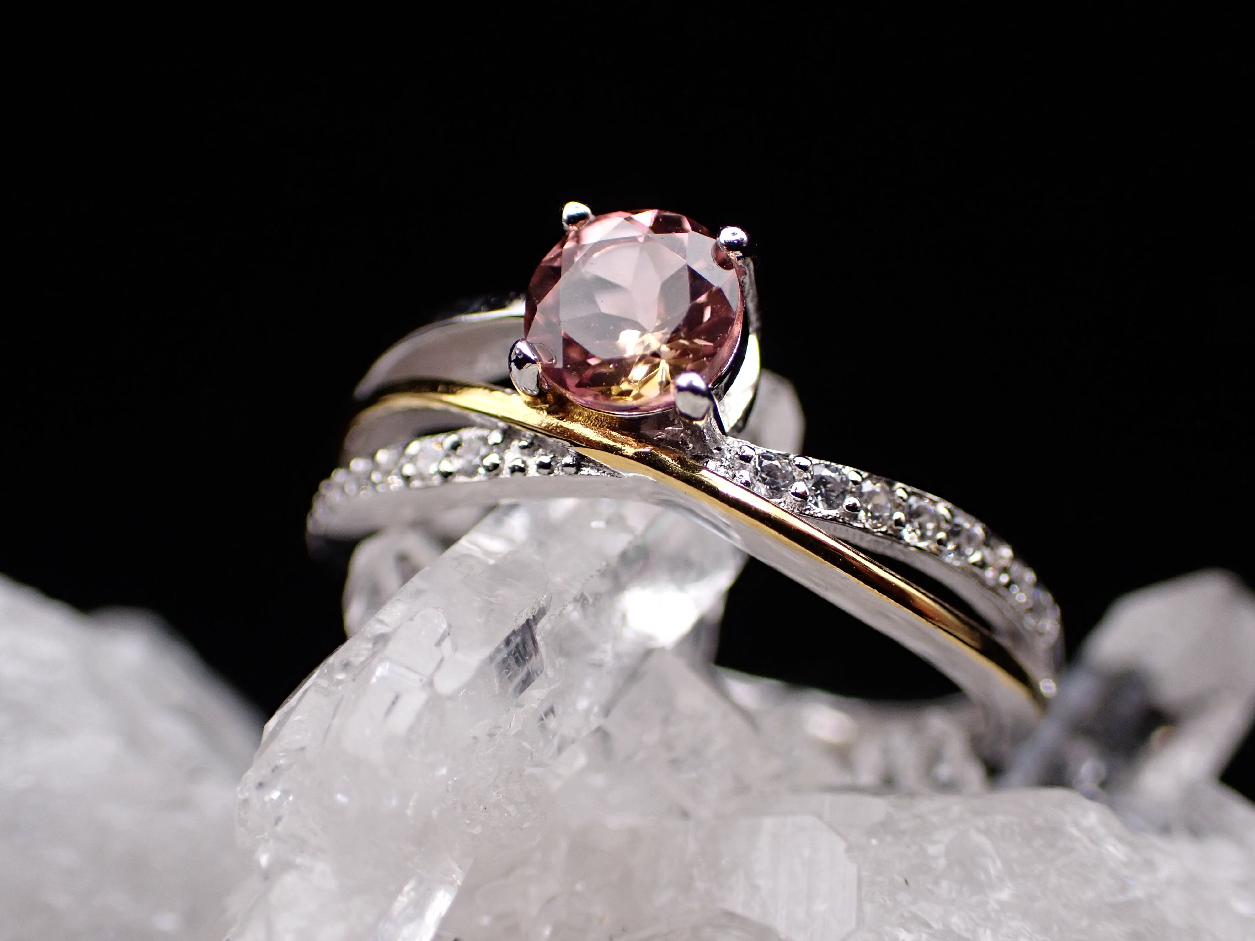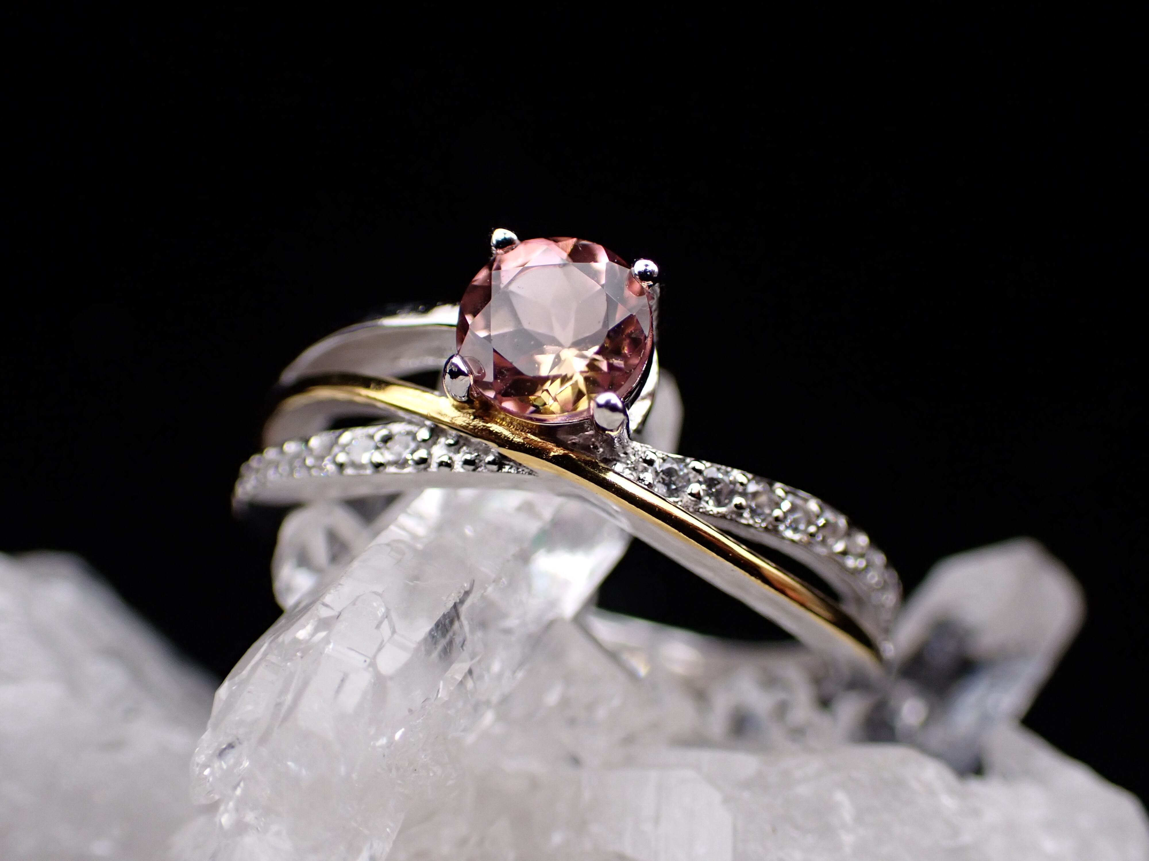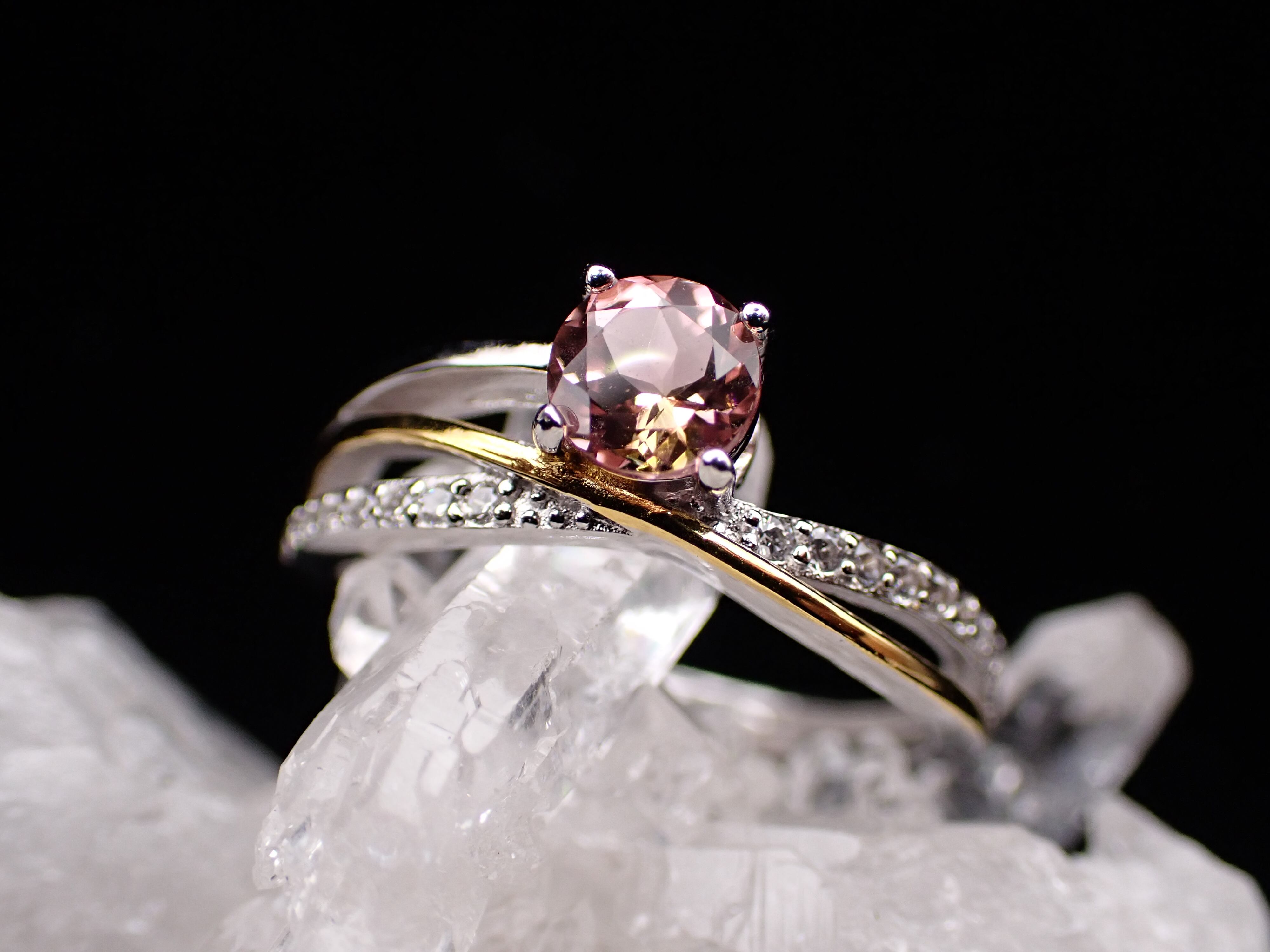 流れるようなゴールドとシルバーが交差する中央に、ピンクとイエローがはっきり見えるが美しいストルマリンが鎮座します。