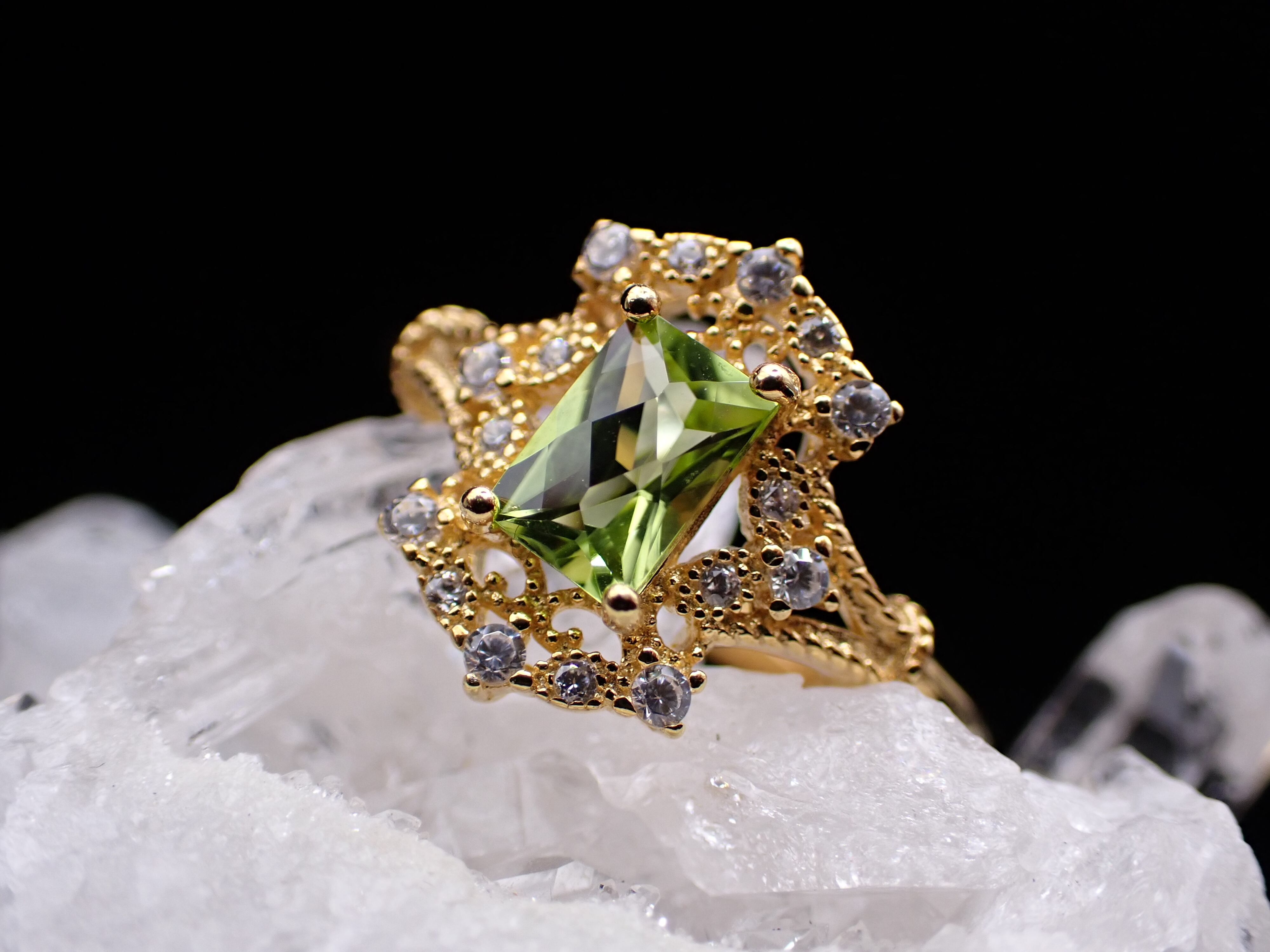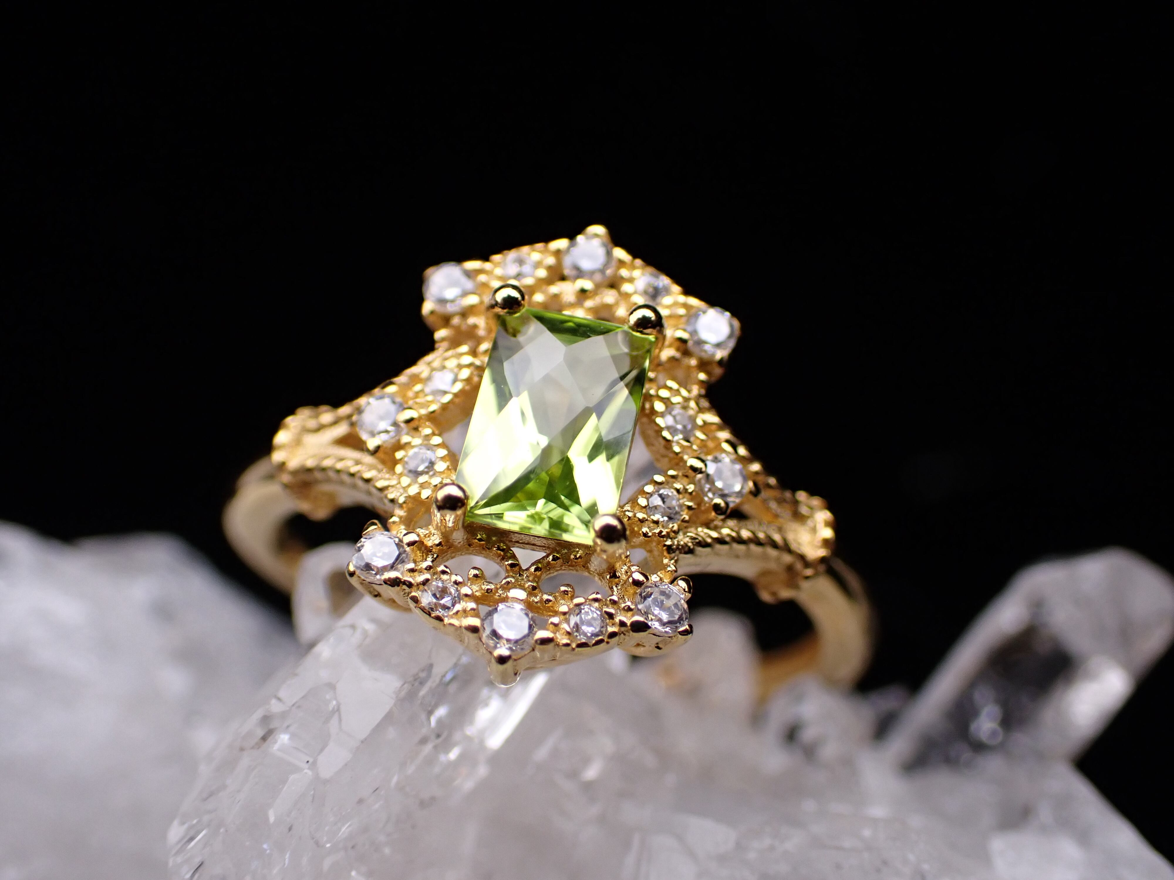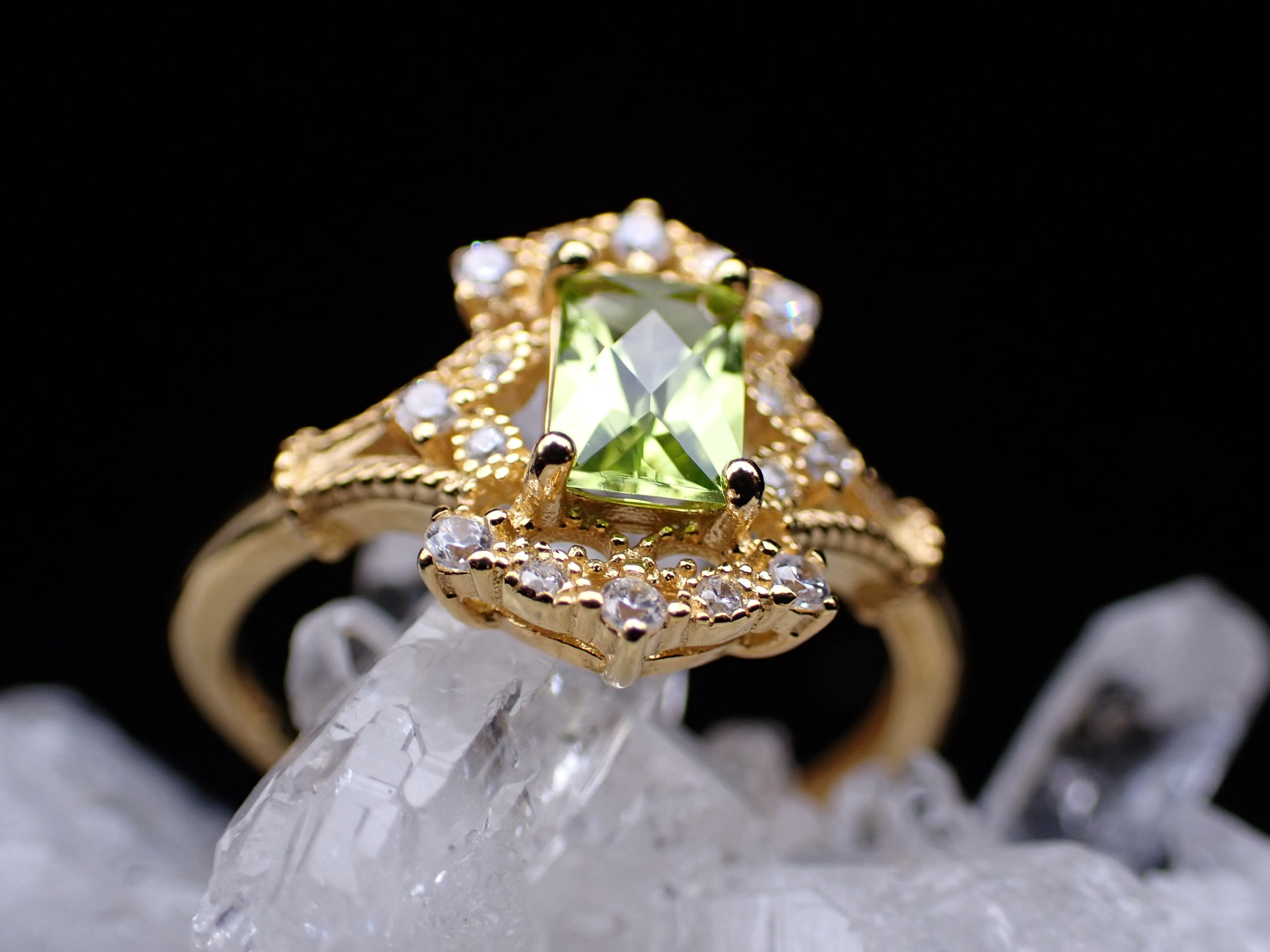 取り巻きのジルコニアたちがキラキラと輝き、ペリドットの美しい輝きを引き立てます。