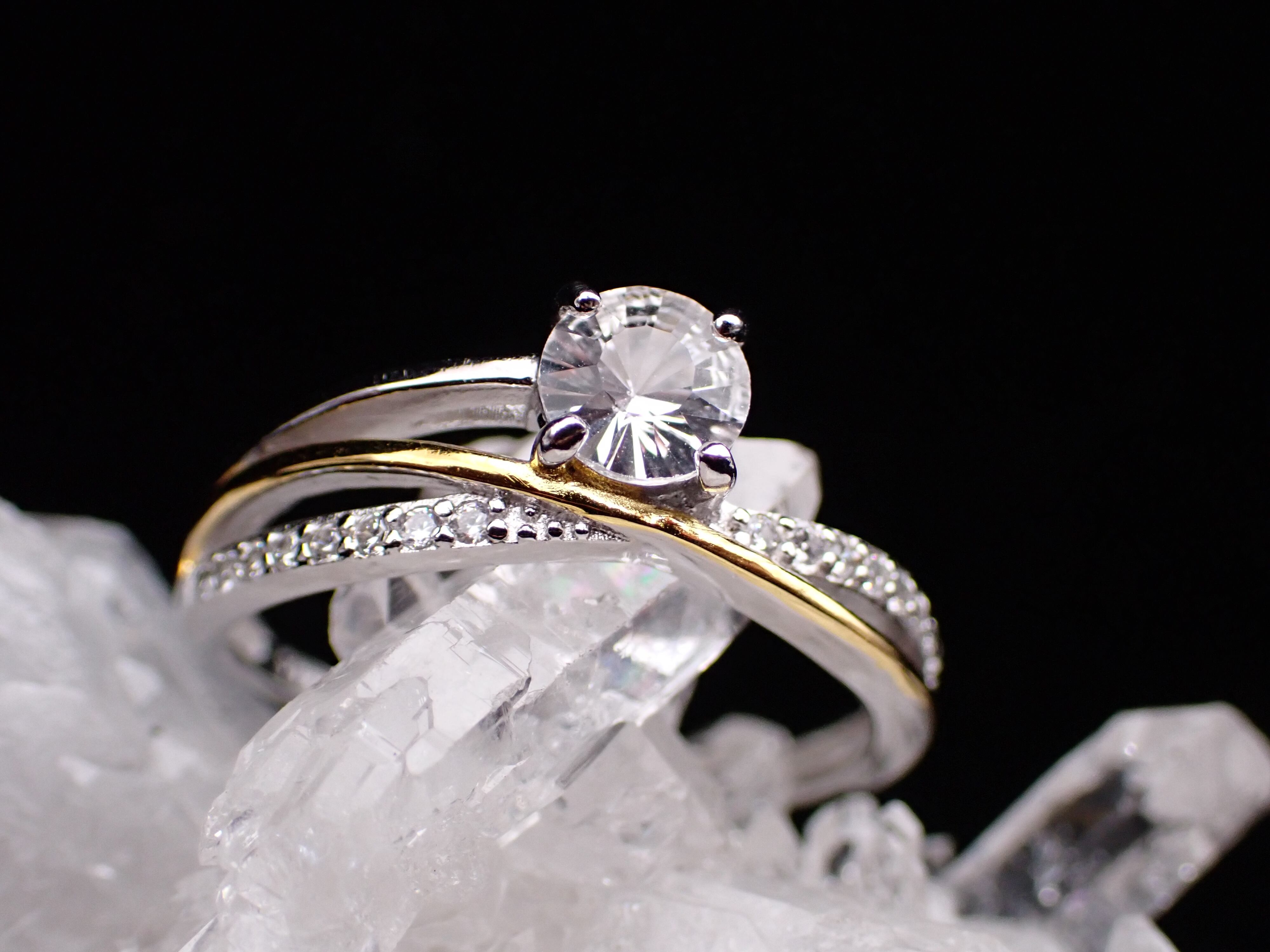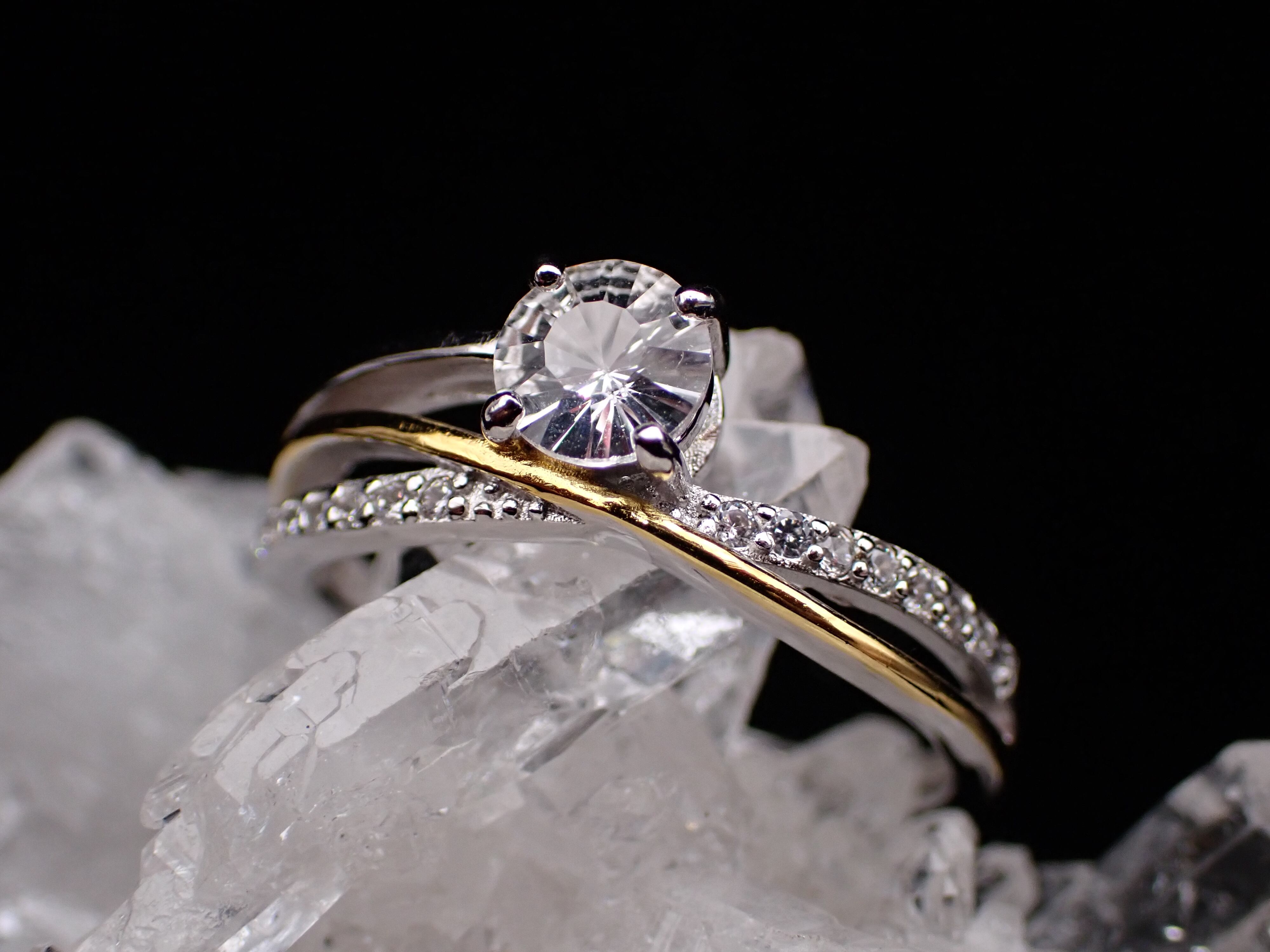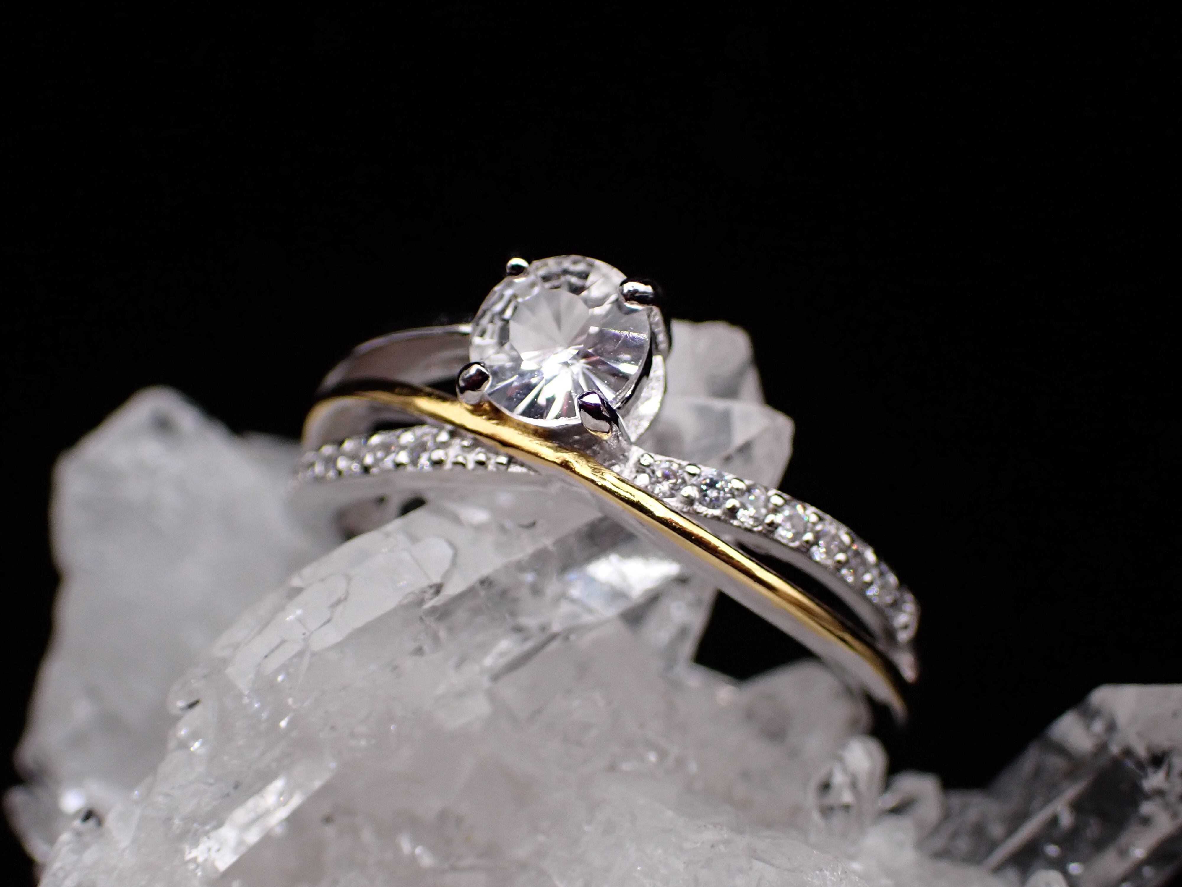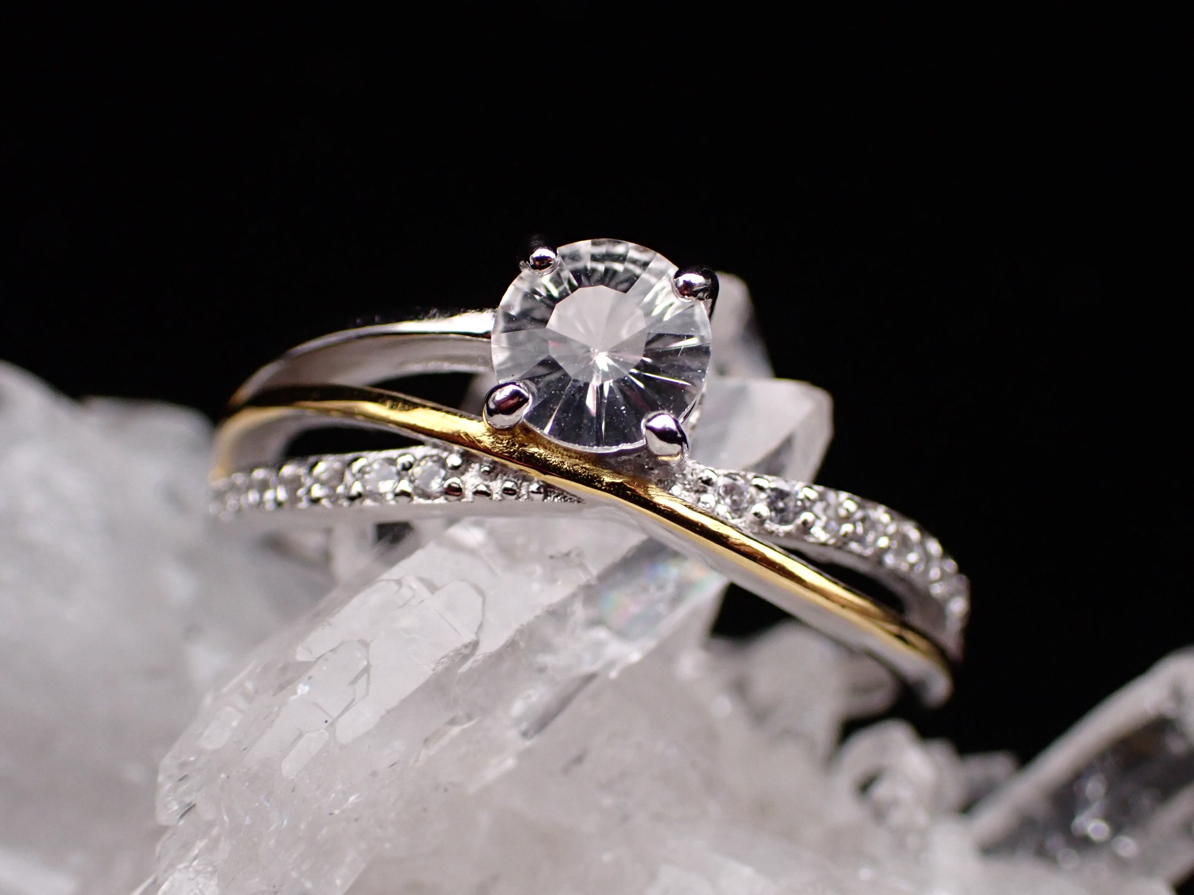 流れるようなゴールドとシルバーが交差する中央に、5mmUPのホワイトトパーズが鎮座します。
