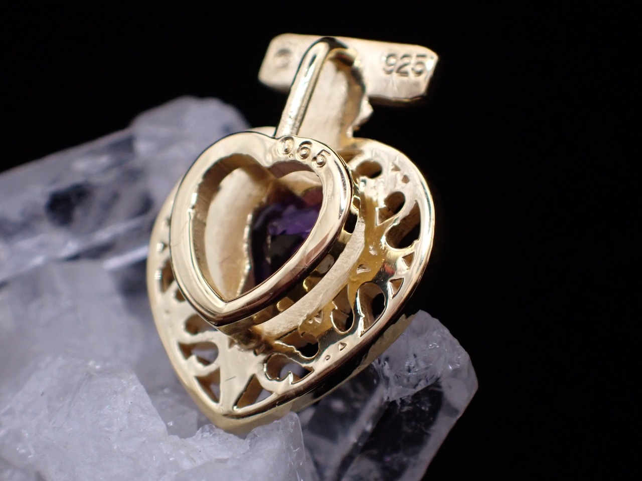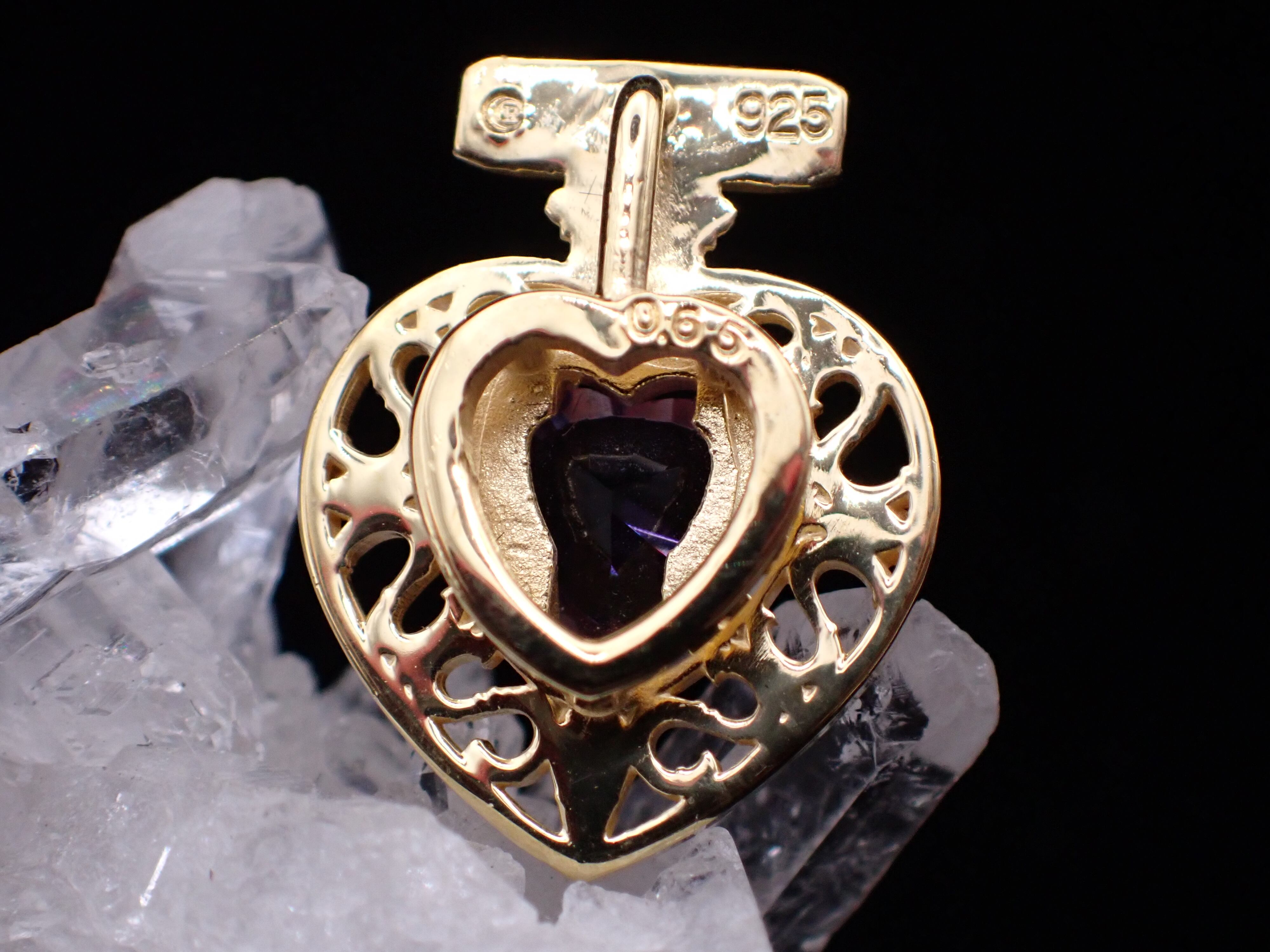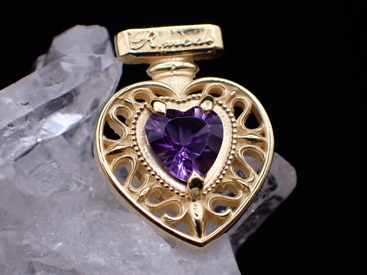 アール・ヌーヴォーシリーズの中でも人気の透かしデザインを活かし、芳しい香りが広がるようなハート型の香水瓶の中へ石を納めました。
