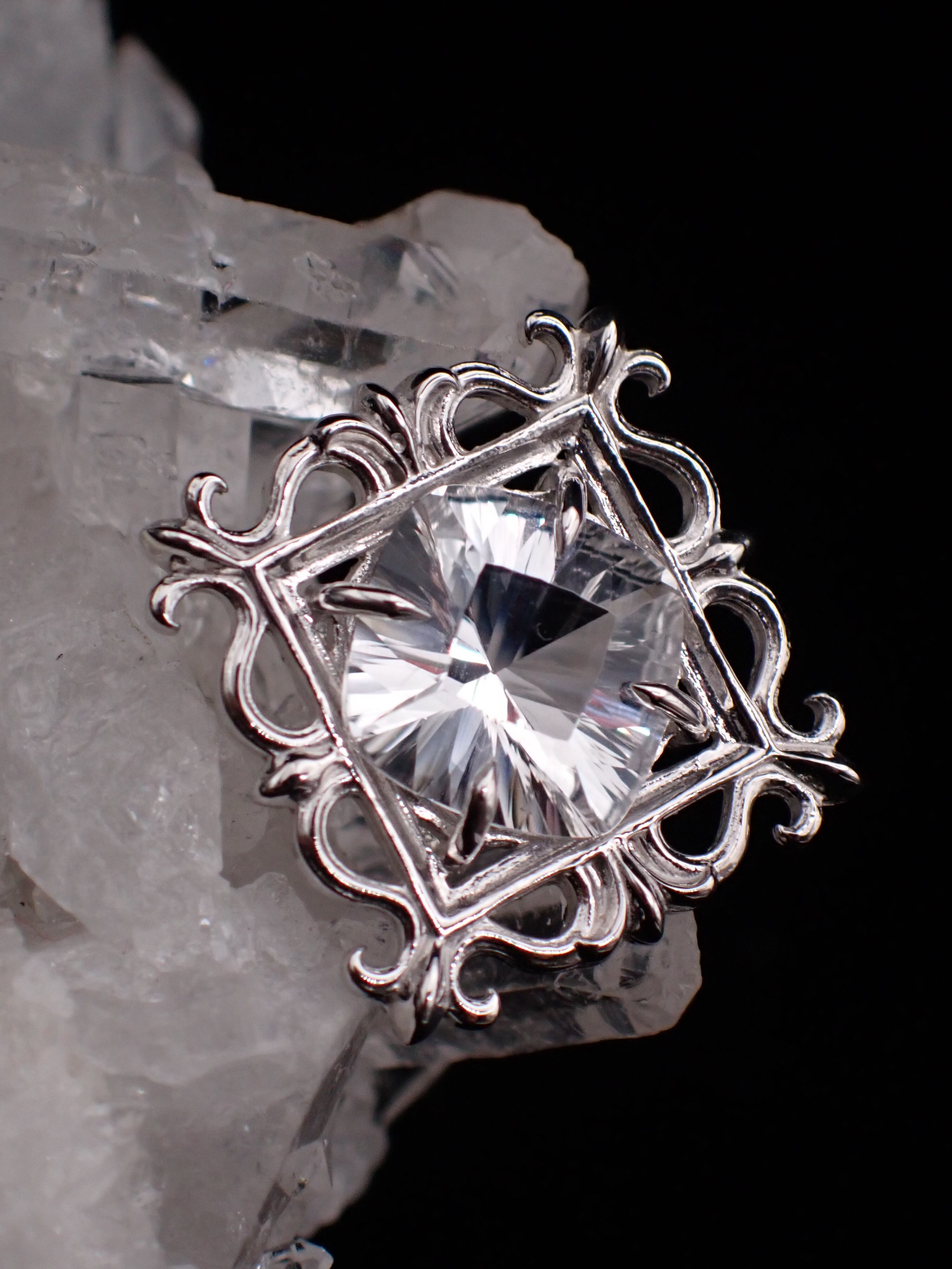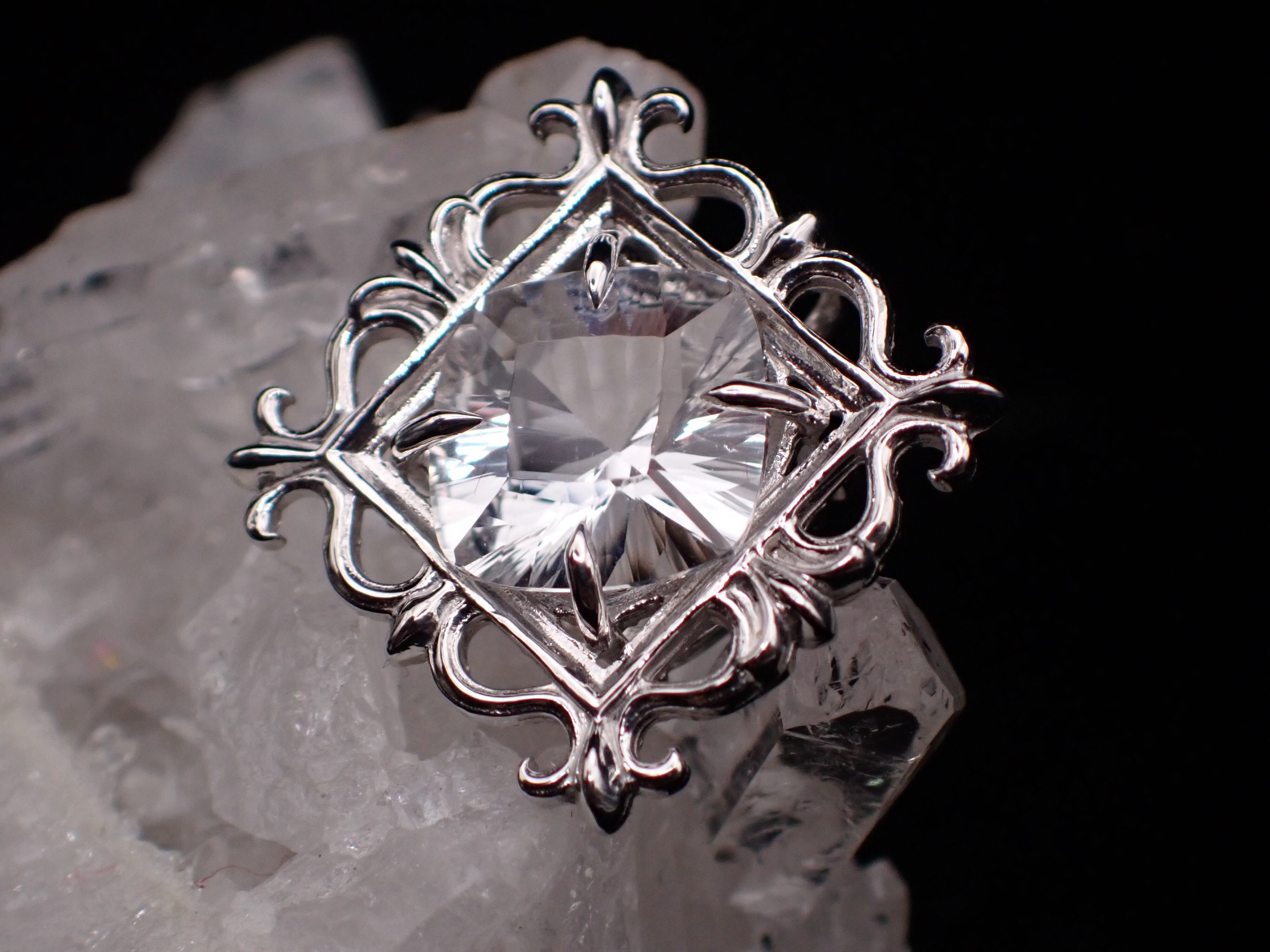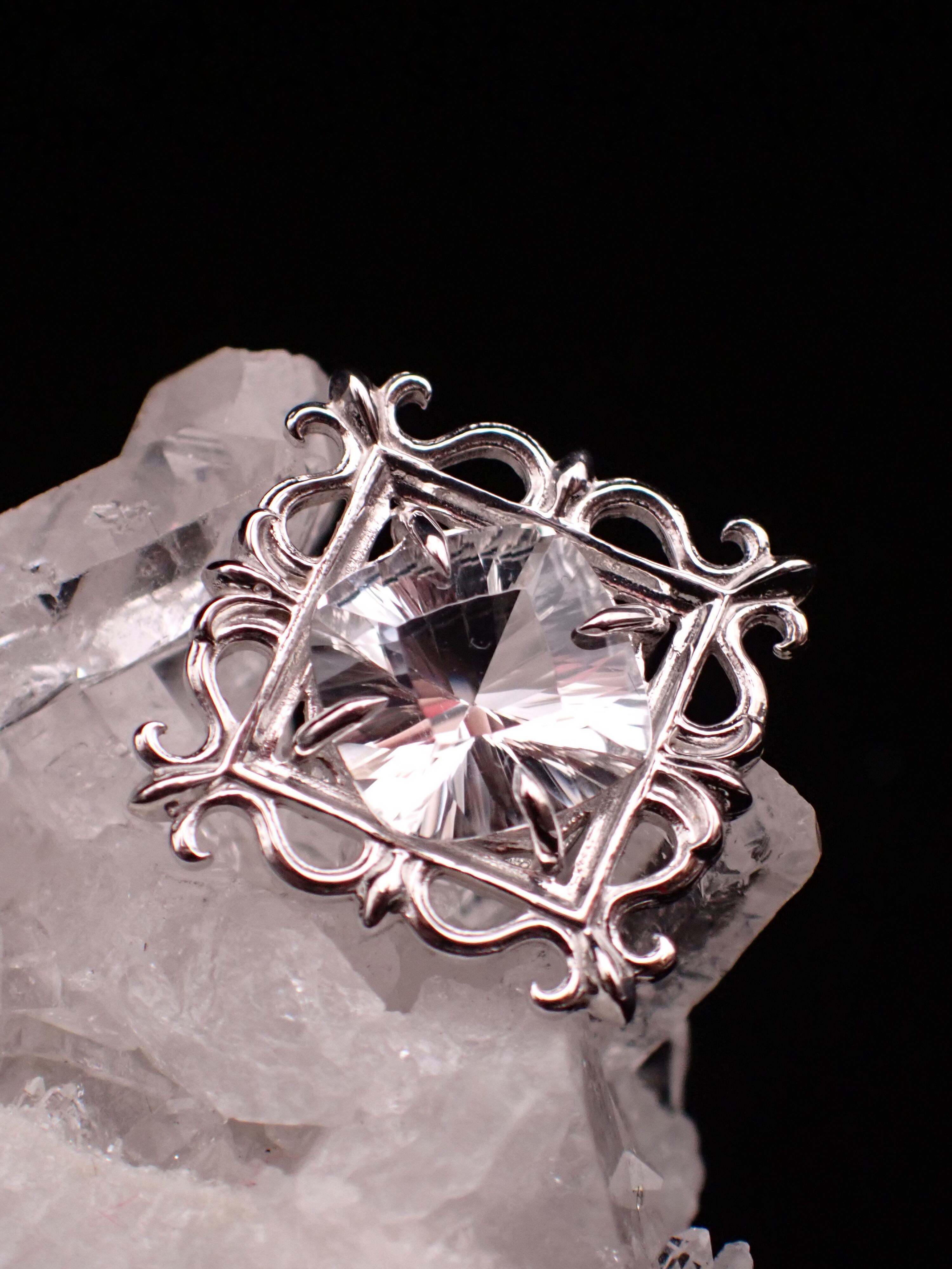 まるで石を絵画のように、美しい額縁の中へ、コンケーブカットのホワイトトパーズを納めました。