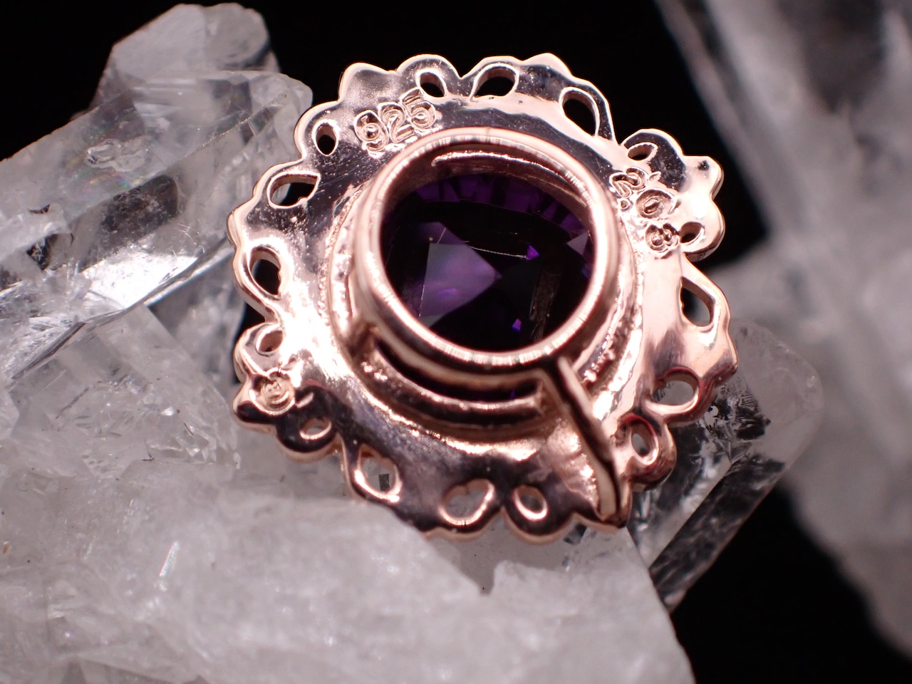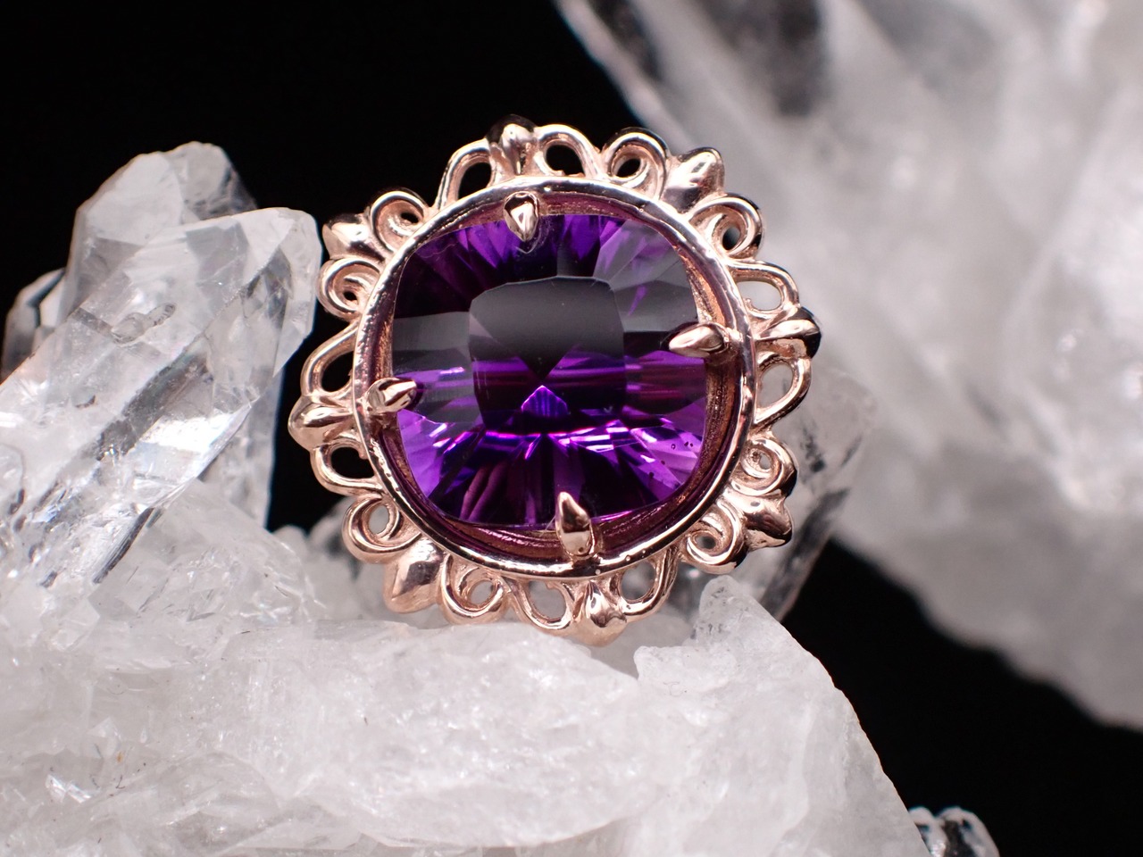 まるで石を絵画のように、美しい額縁の中へ、コンケーブカットのアメジストを納めました。