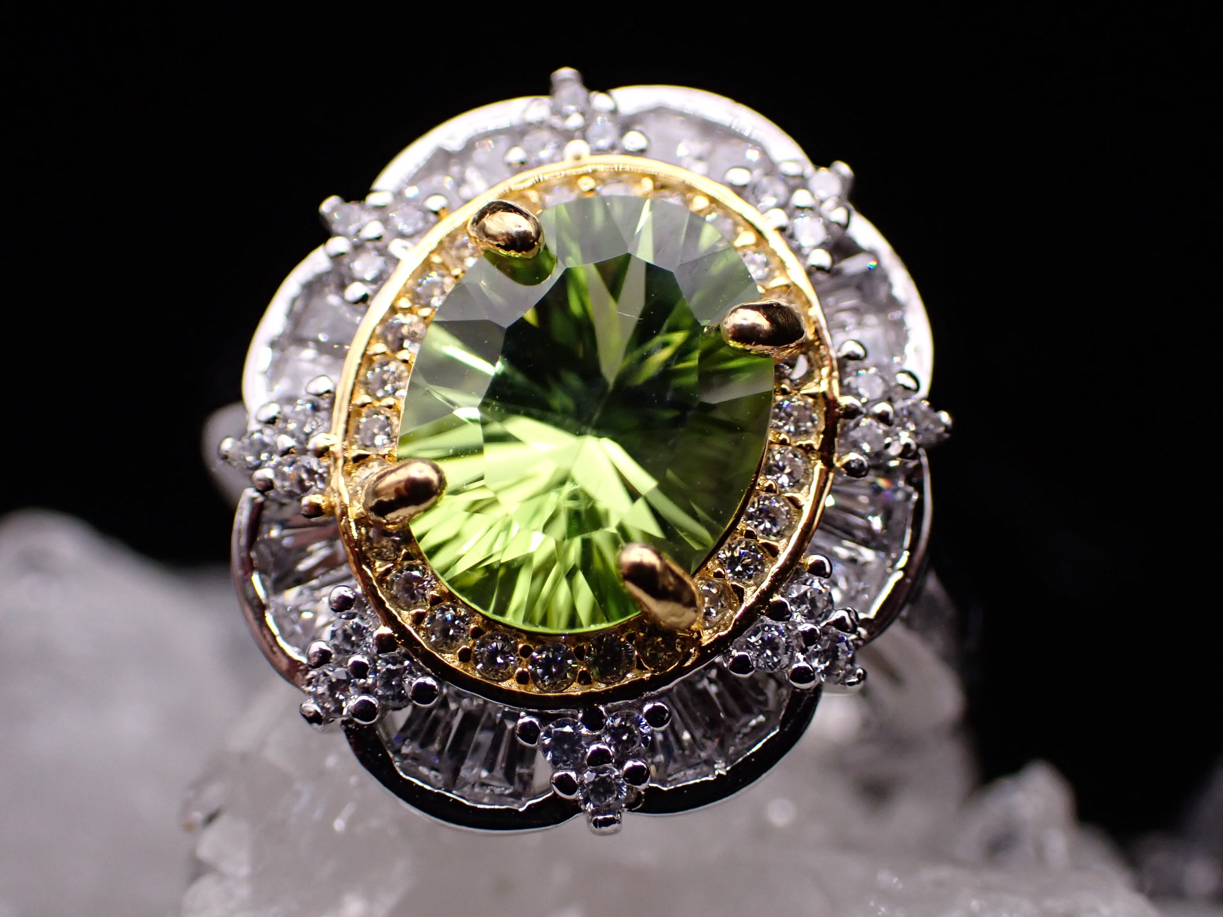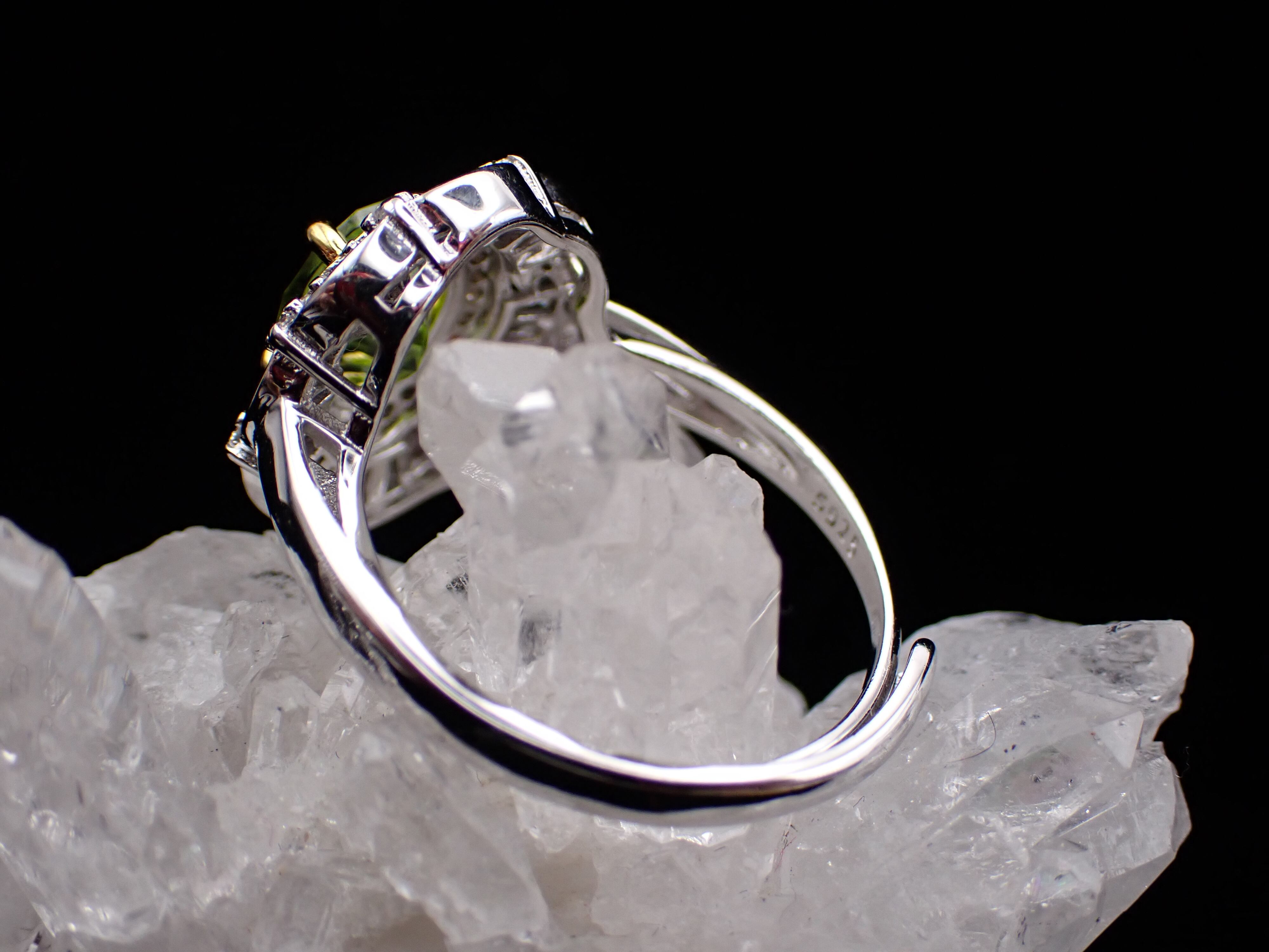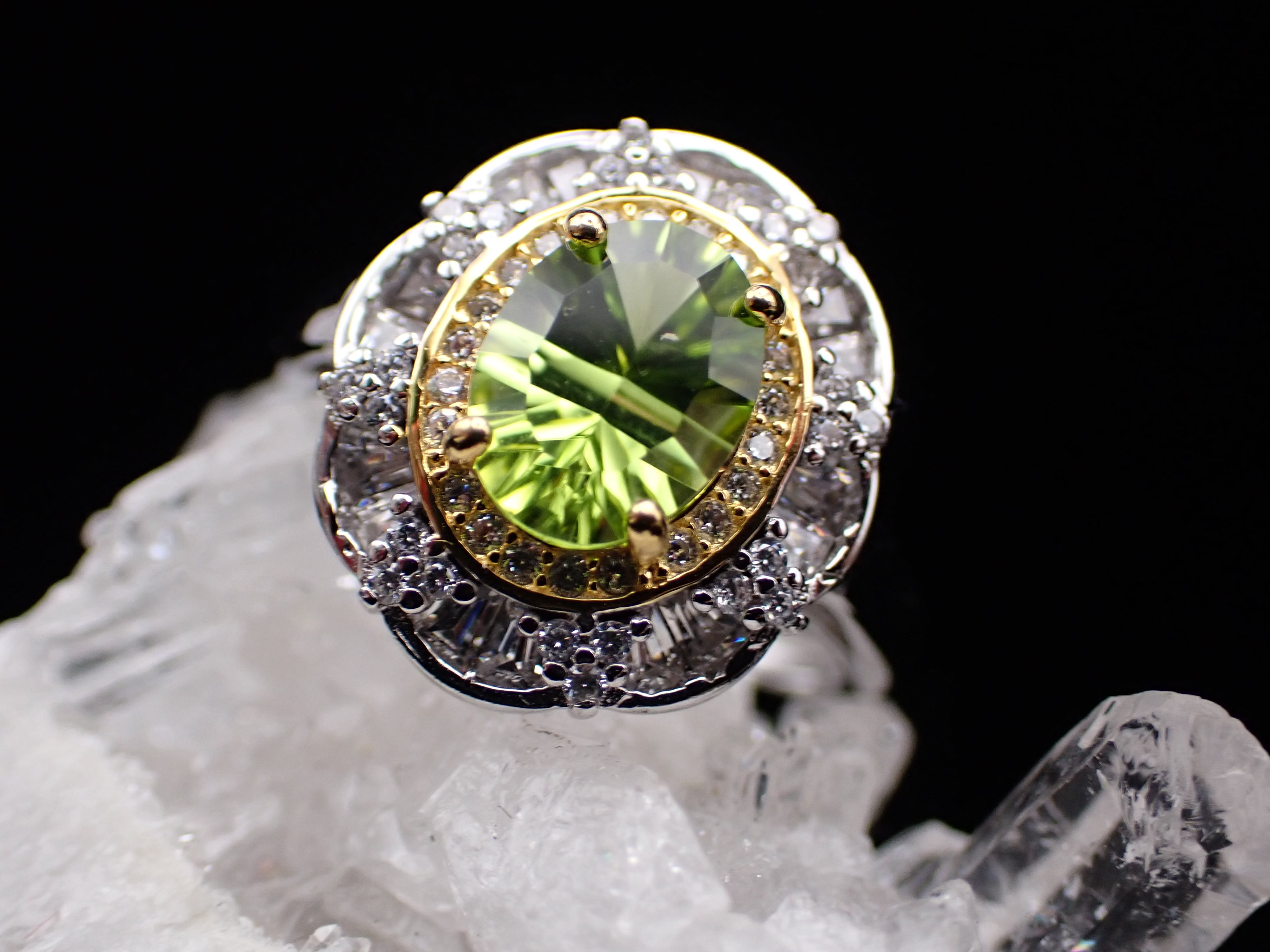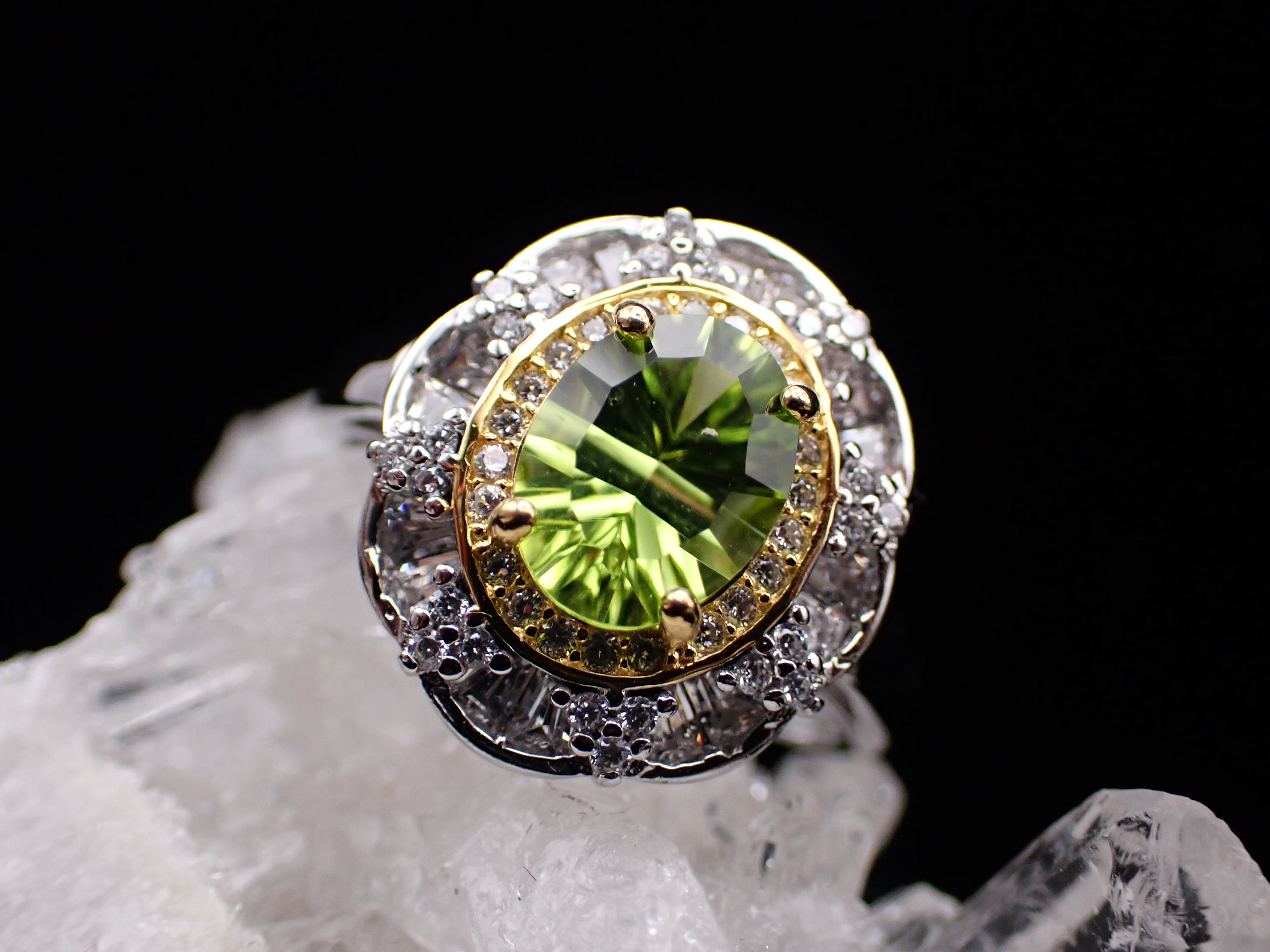 取り巻きのジルコニアたちがキラキラと輝き、ペリドットの美しい輝きを引き立てます。