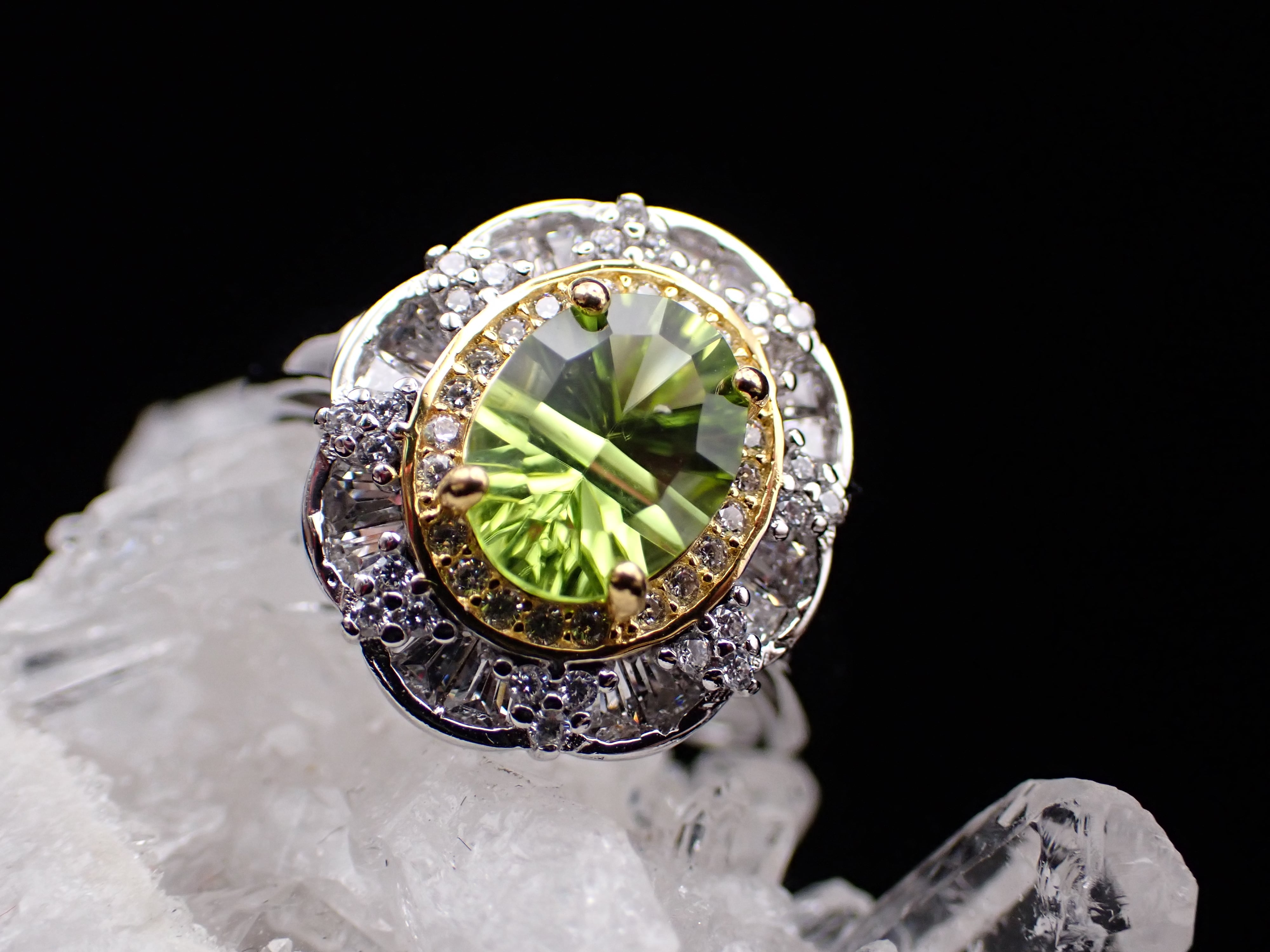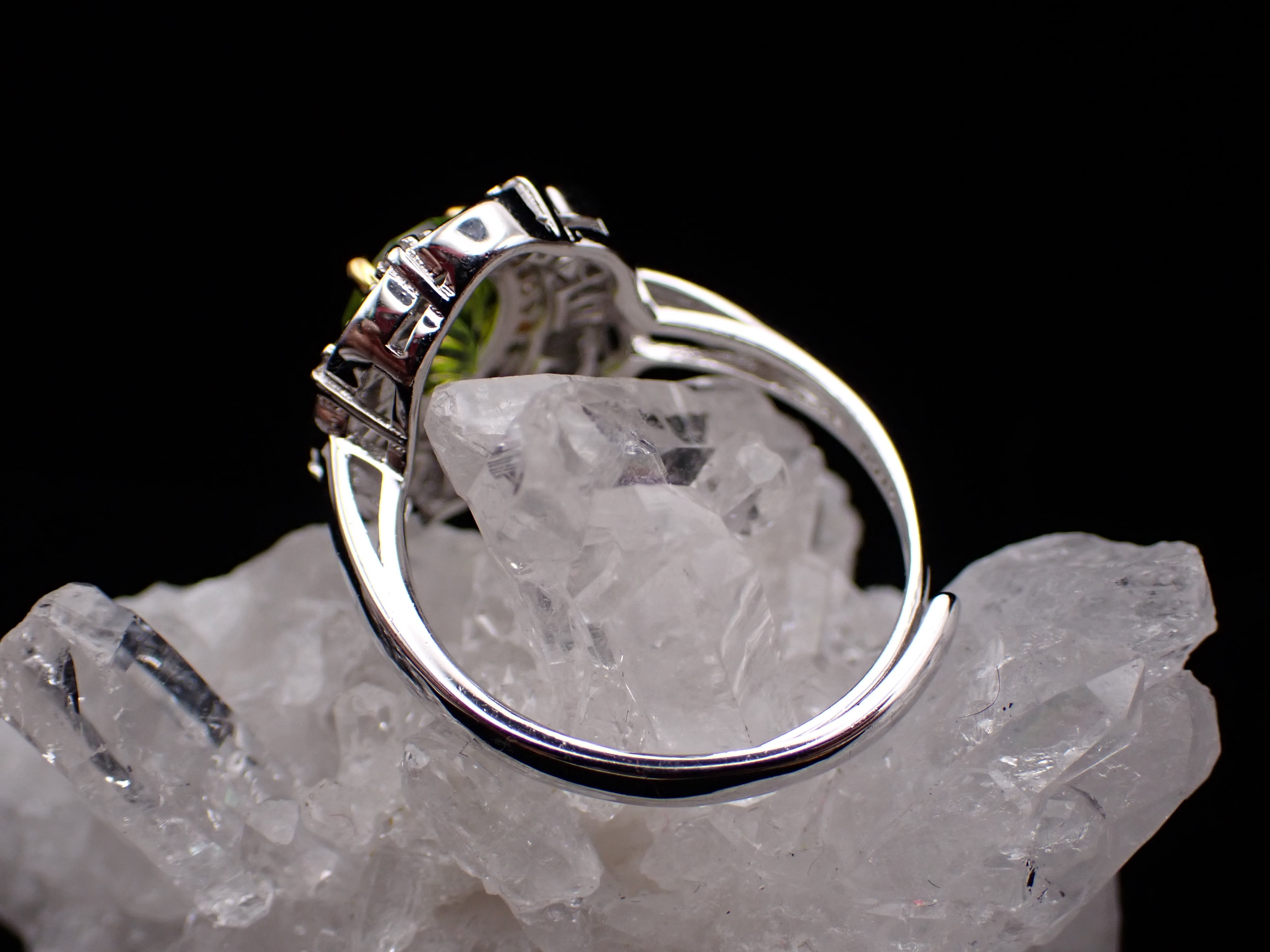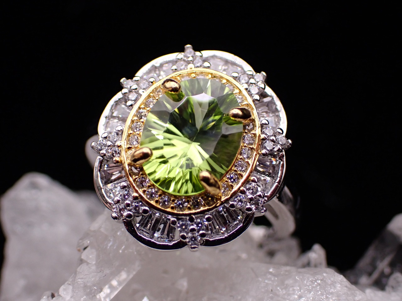 取り巻きのジルコニアたちがキラキラと輝き、ペリドットの美しい輝きを引き立てます。