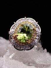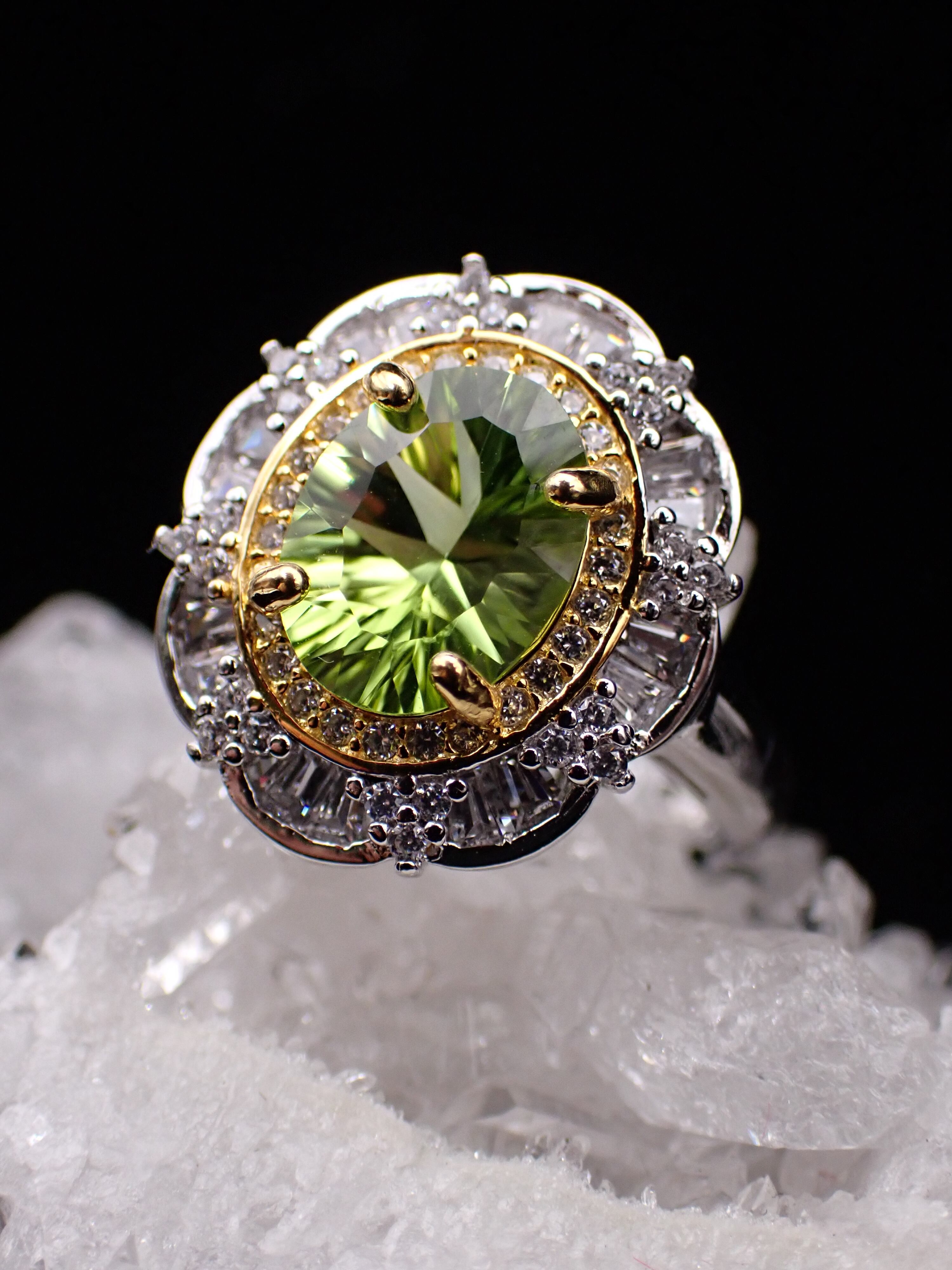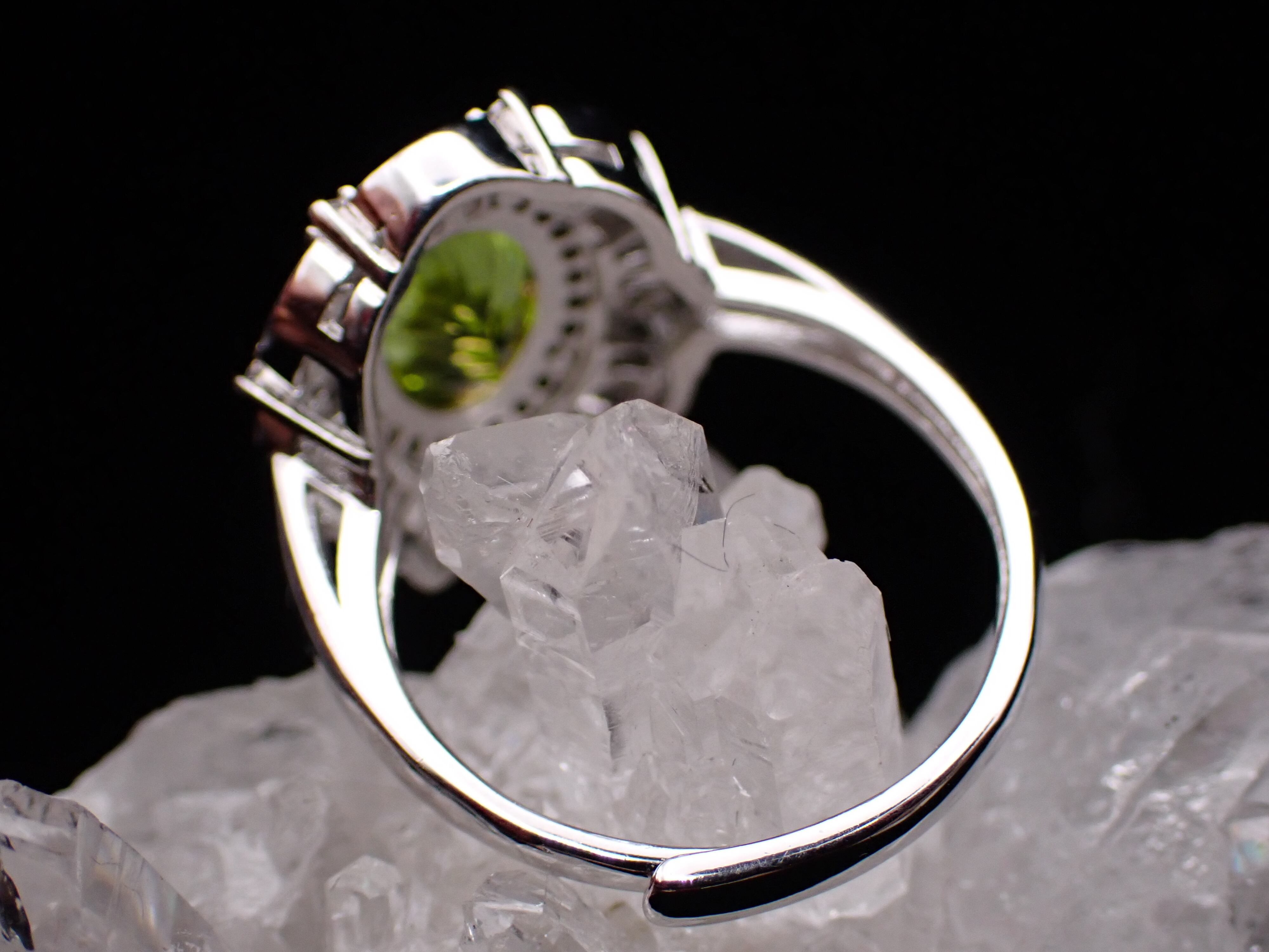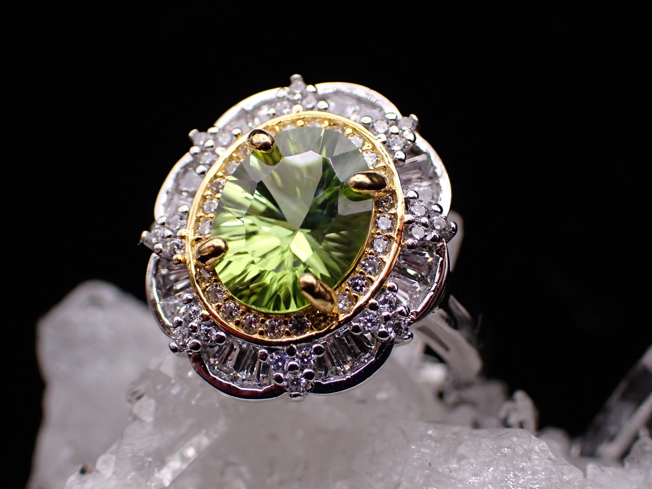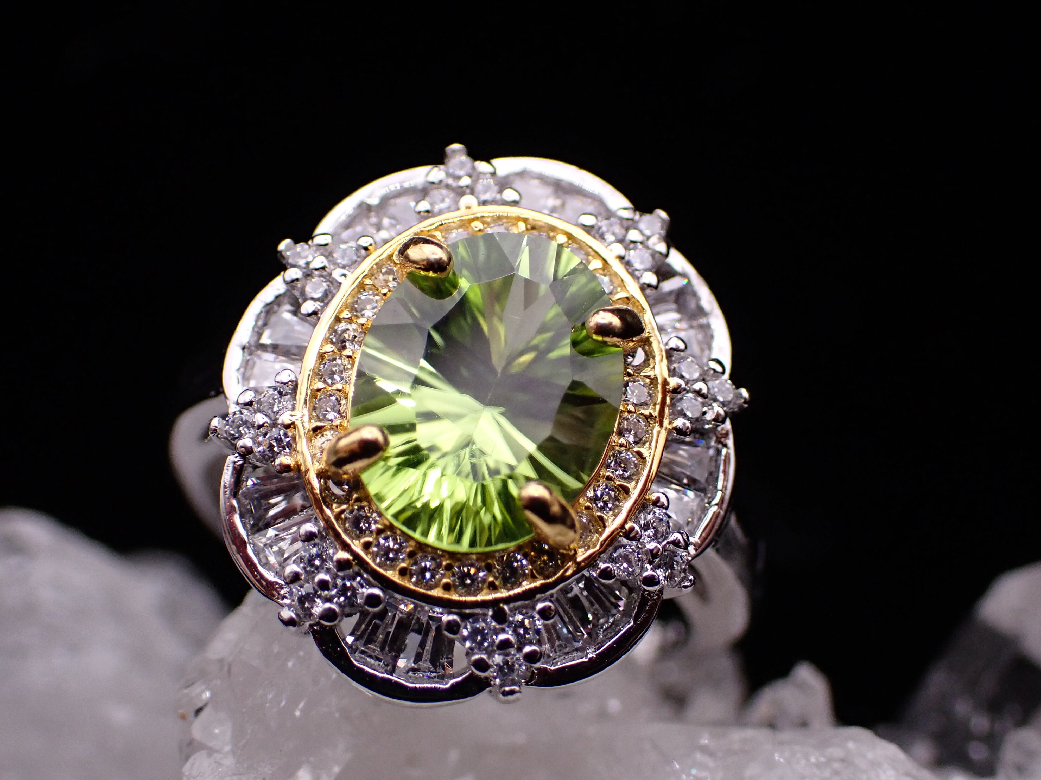 取り巻きのジルコニアたちがキラキラと輝き、ペリドットの美しい輝きを引き立てます。
