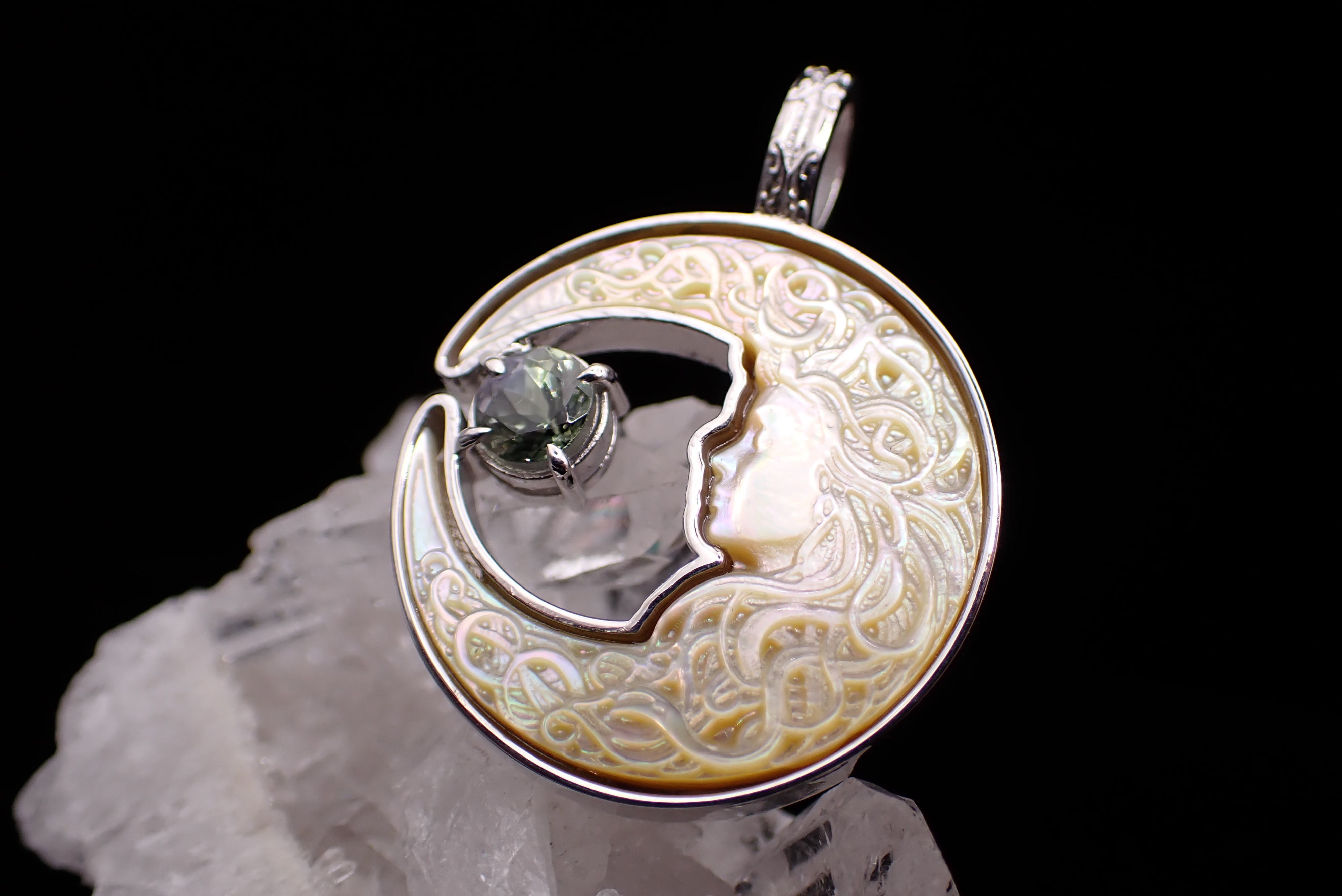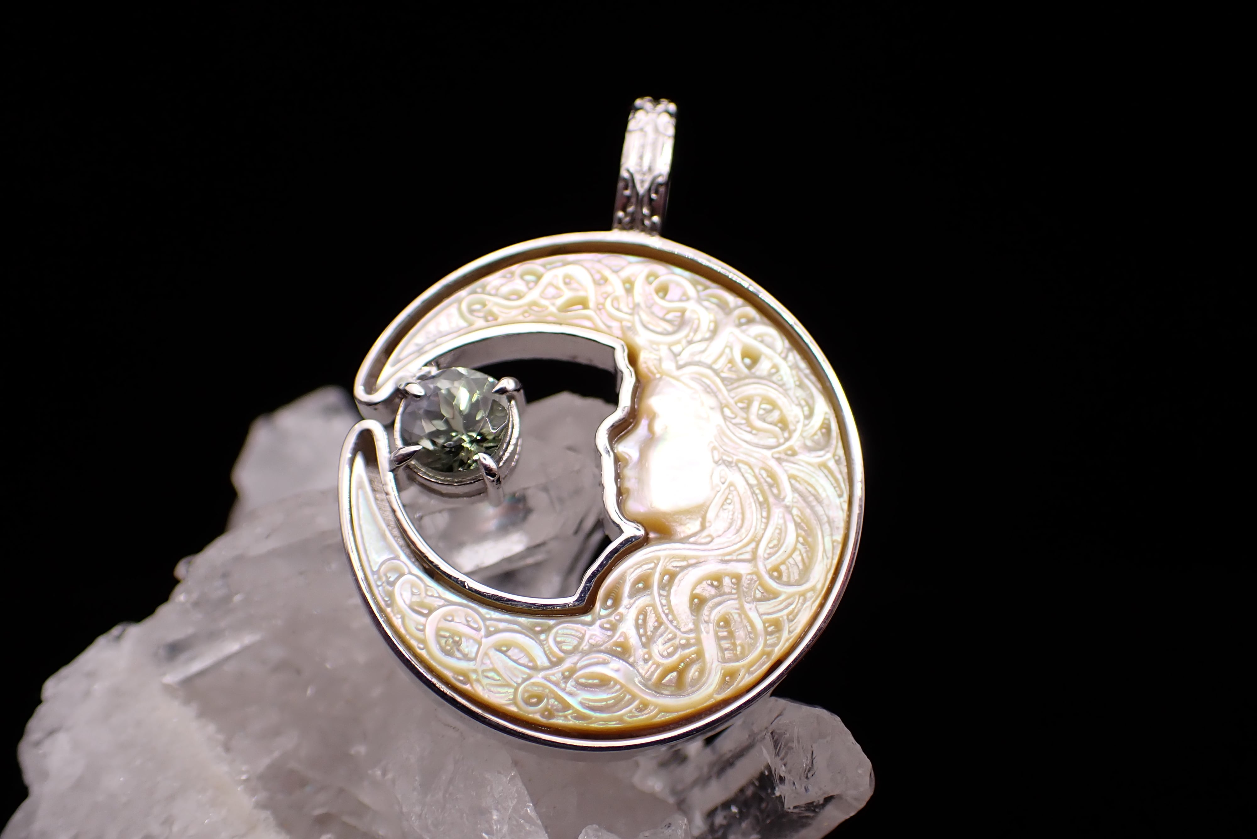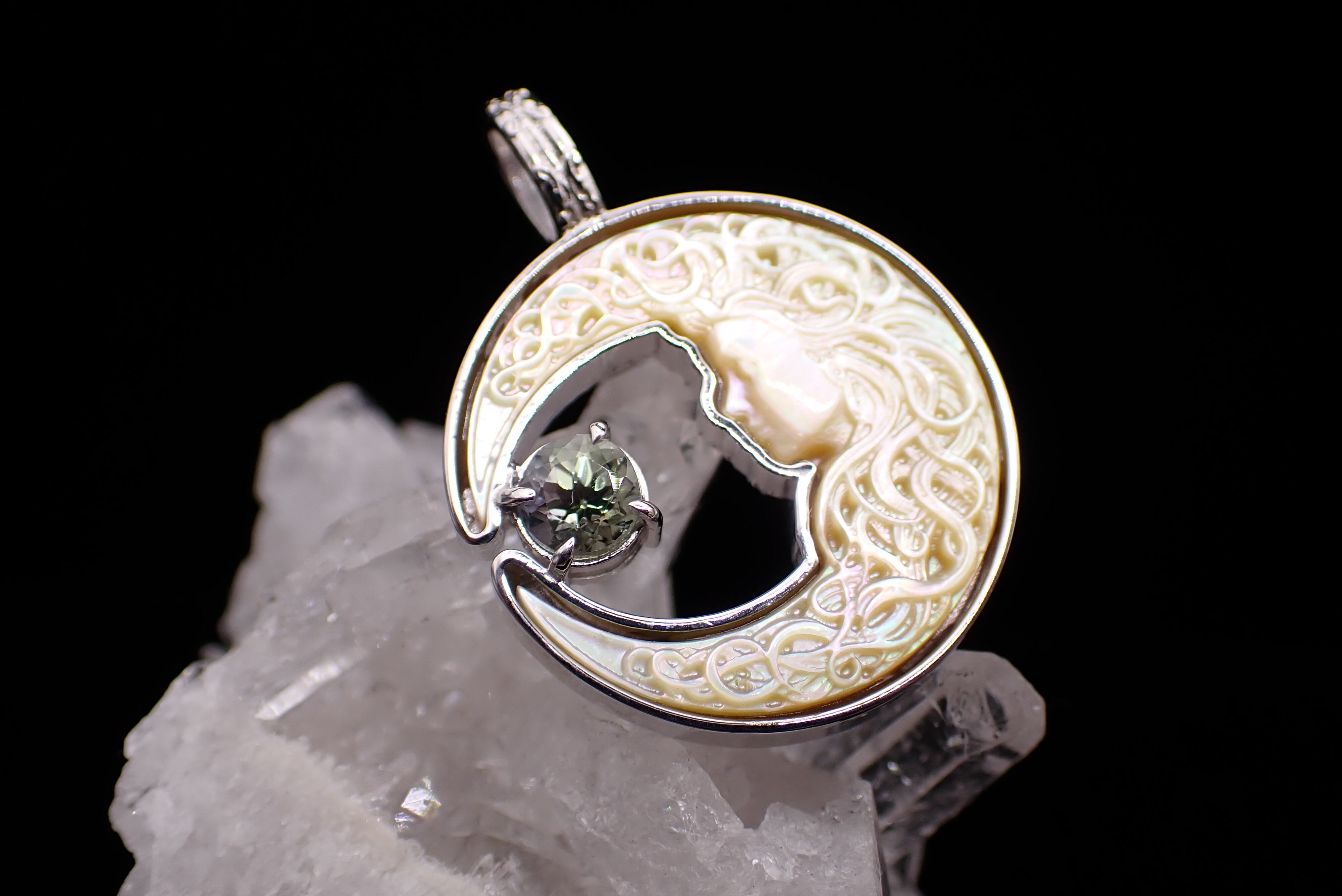 美しく描かれた白蝶貝の月の中に、深く輝くゾイサイトのペンダントです。