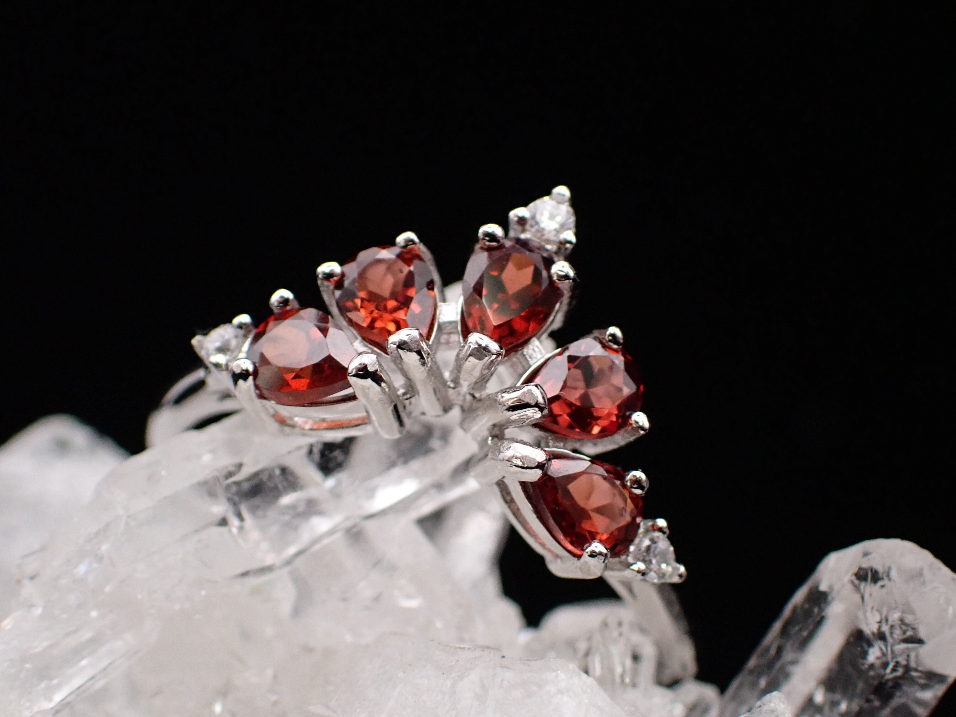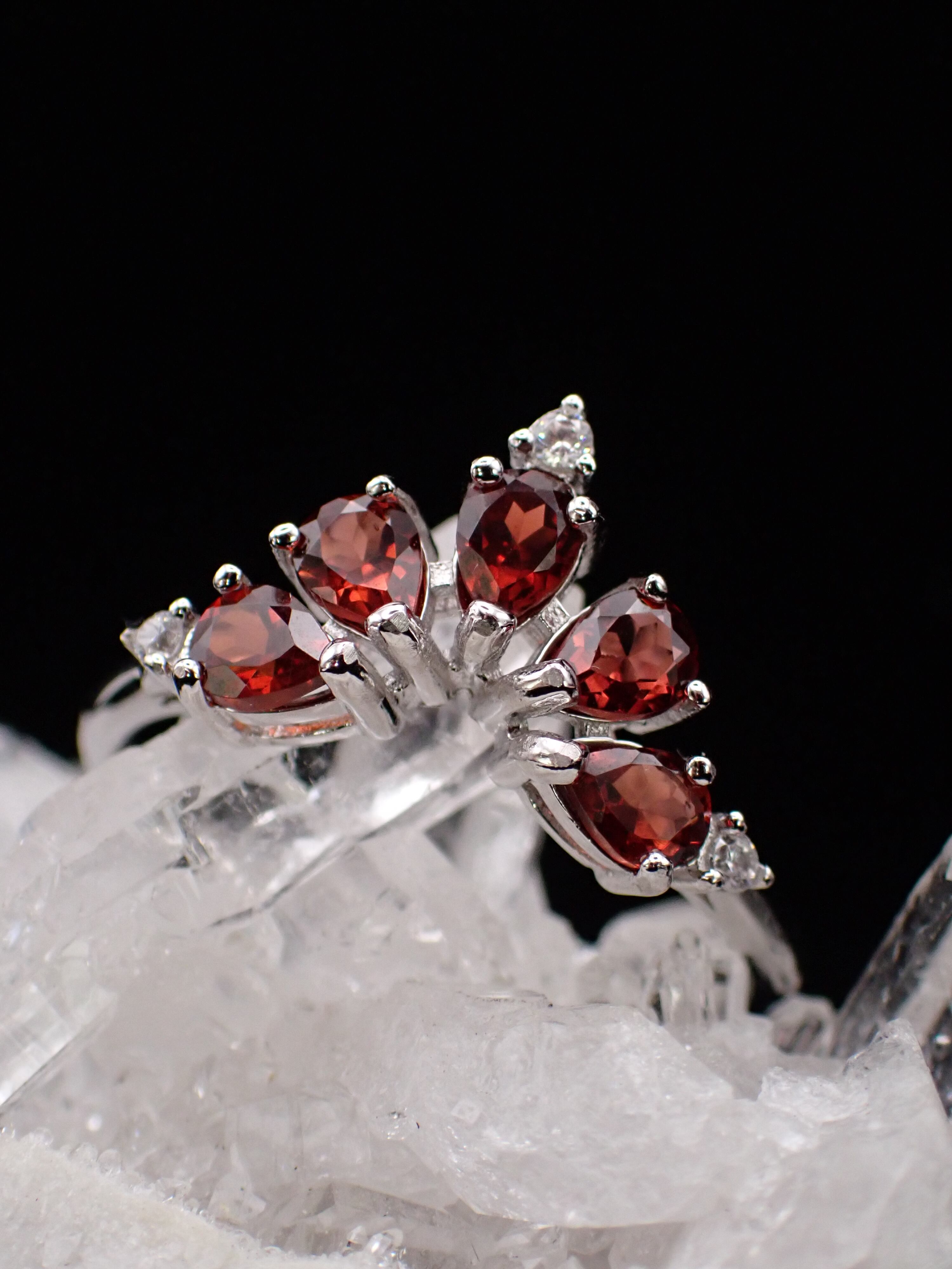 ドロップのガーネットたちが5つ、孔雀が羽根をひろげたように並んだリングです。