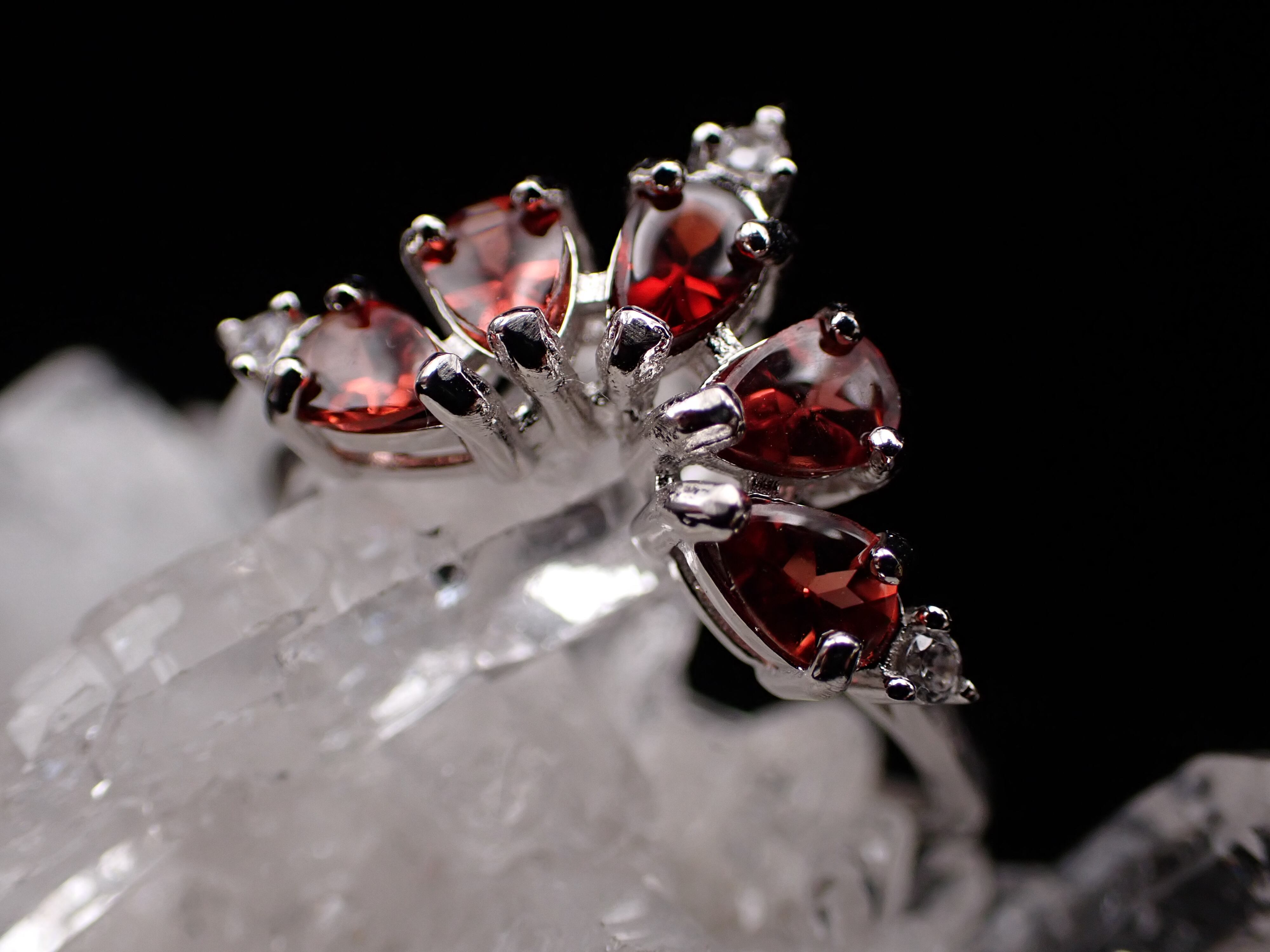 バフトップカットのドロップガーネットたちが5つ、孔雀が羽根をひろげたように並んだリングです。