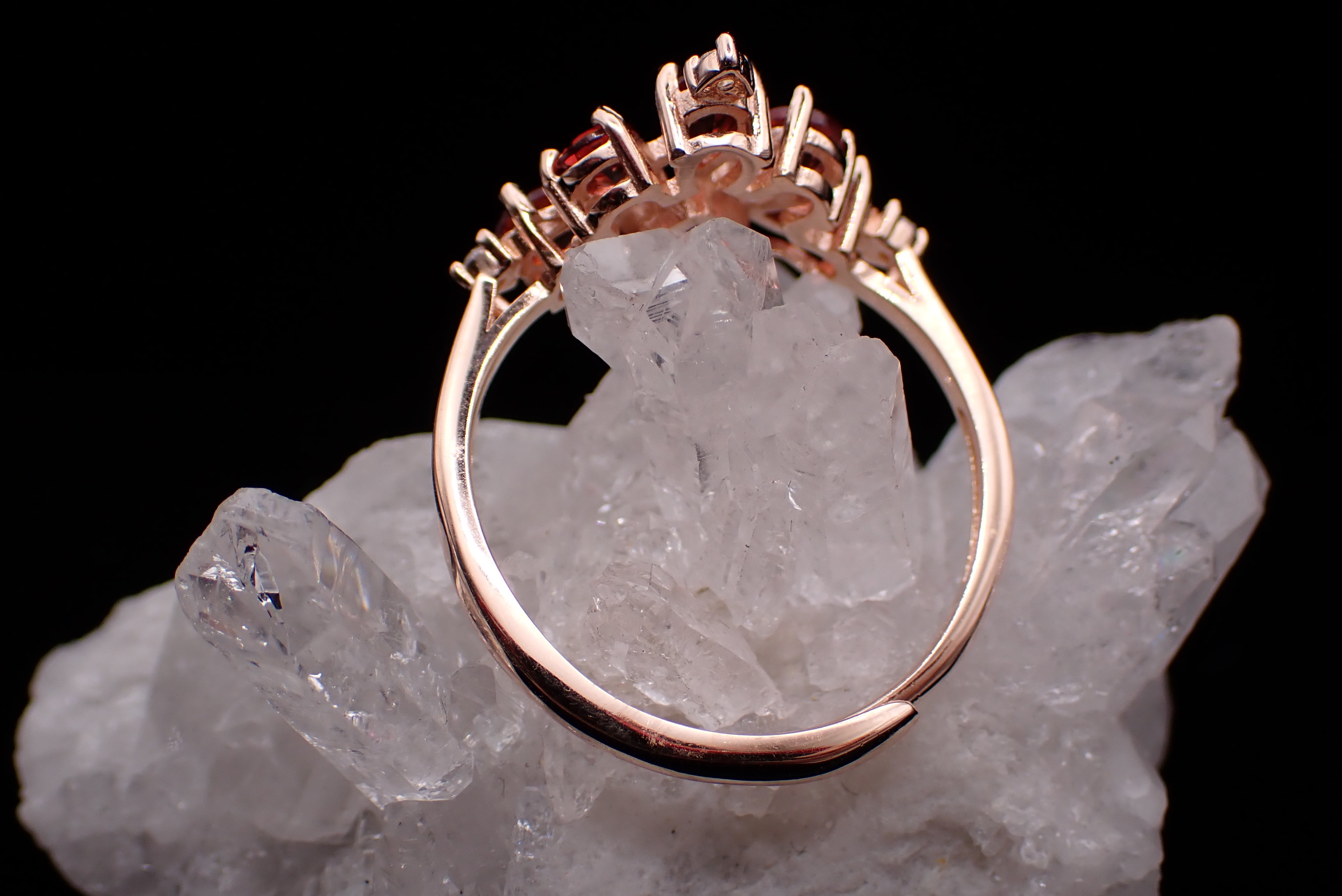 ドロップのガーネットたちが5つ、孔雀が羽根をひろげたように並んだリングです。