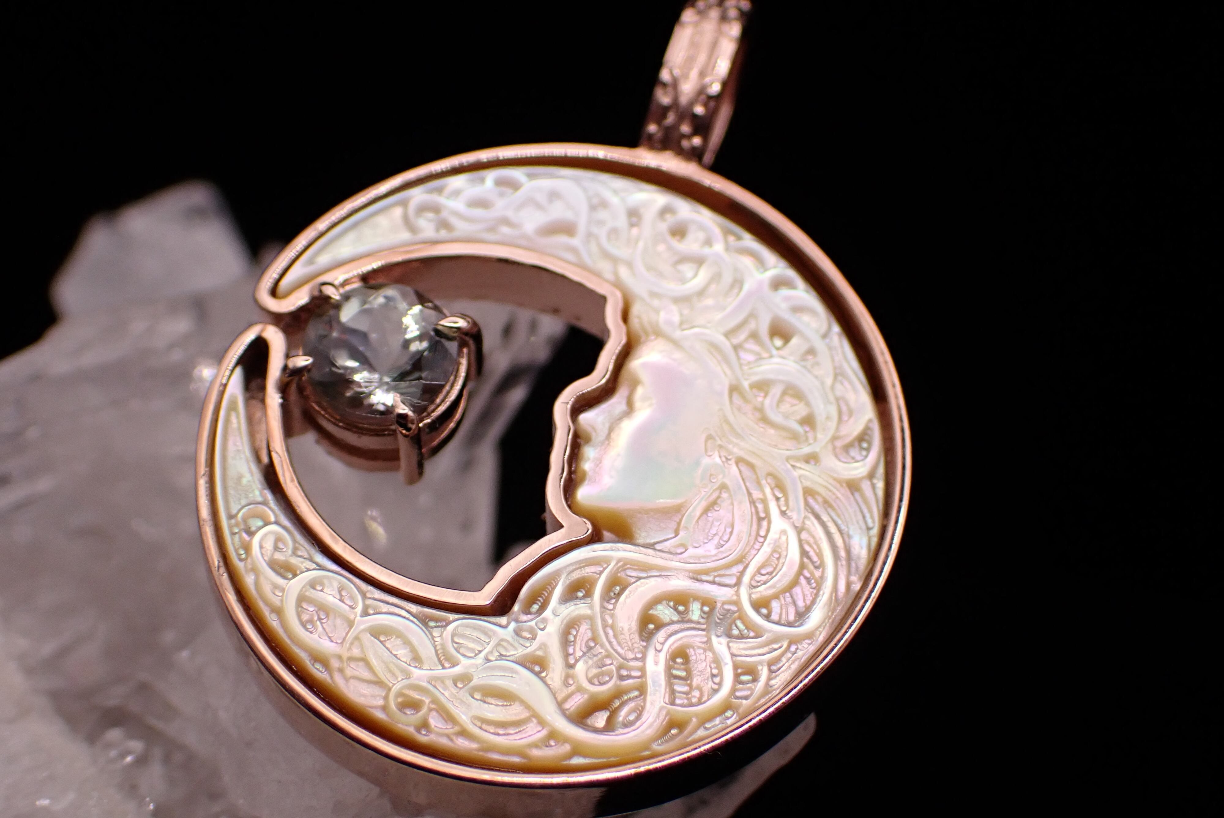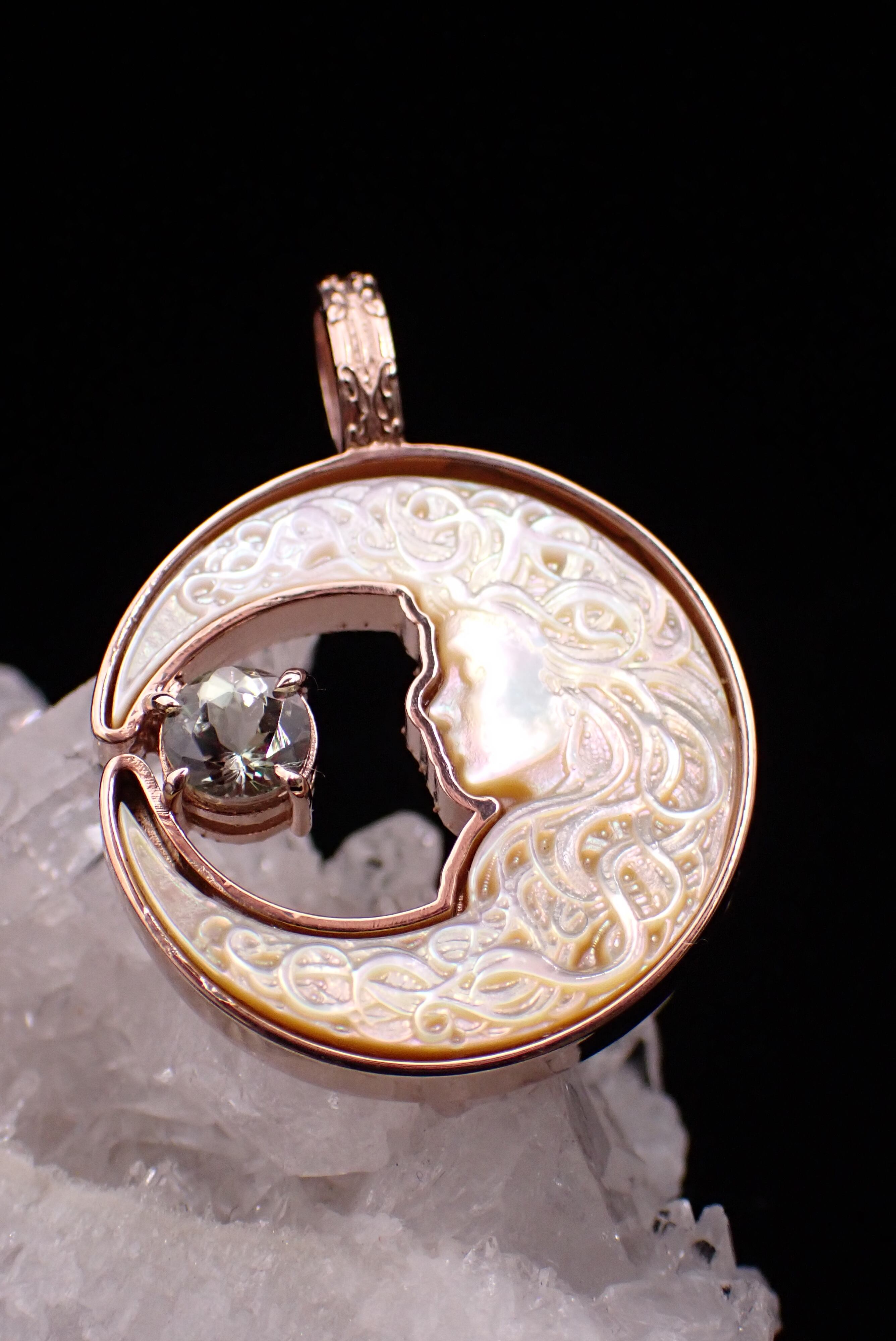 美しく描かれた白蝶貝の月の中に、深く輝くゾイサイトのペンダントです。