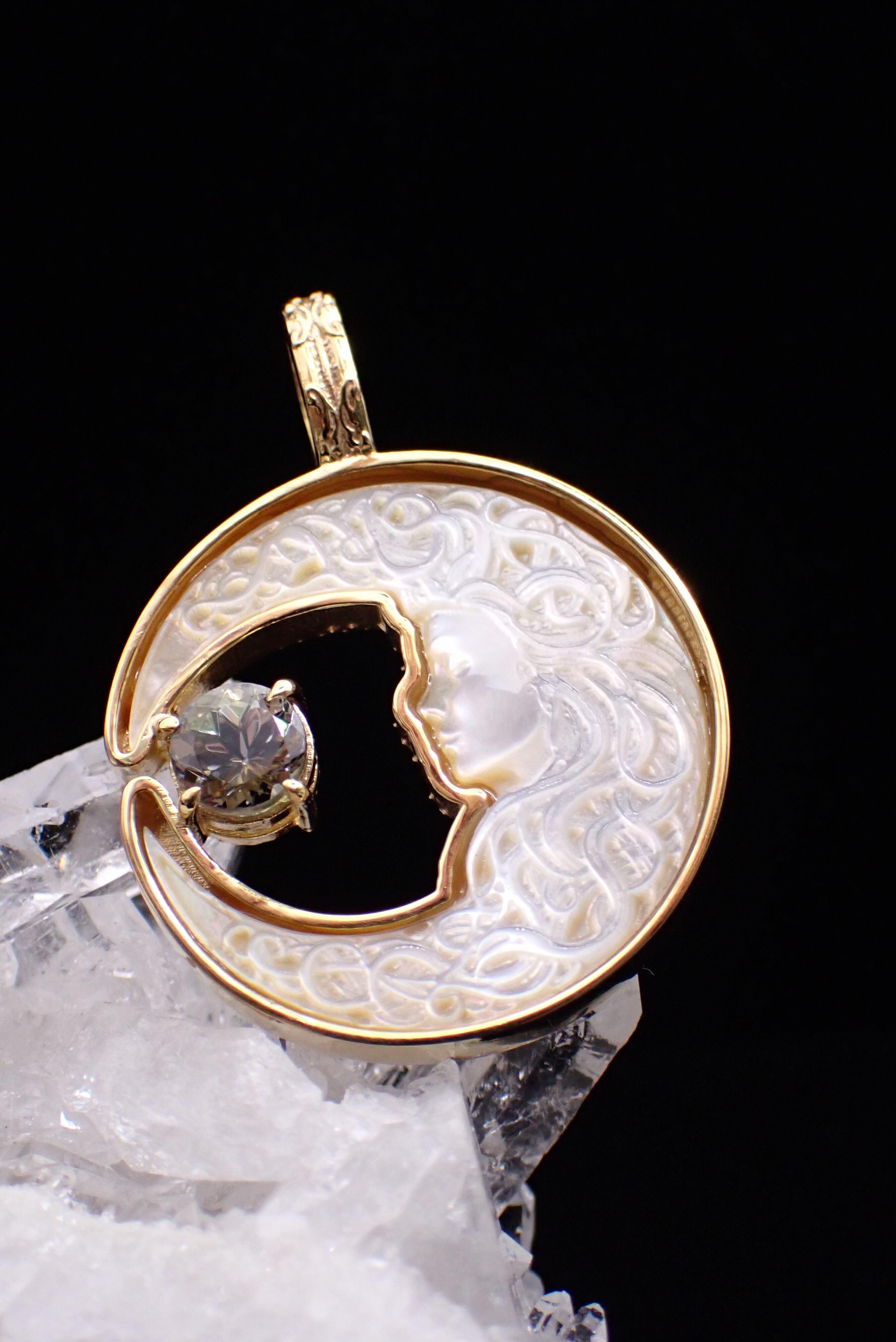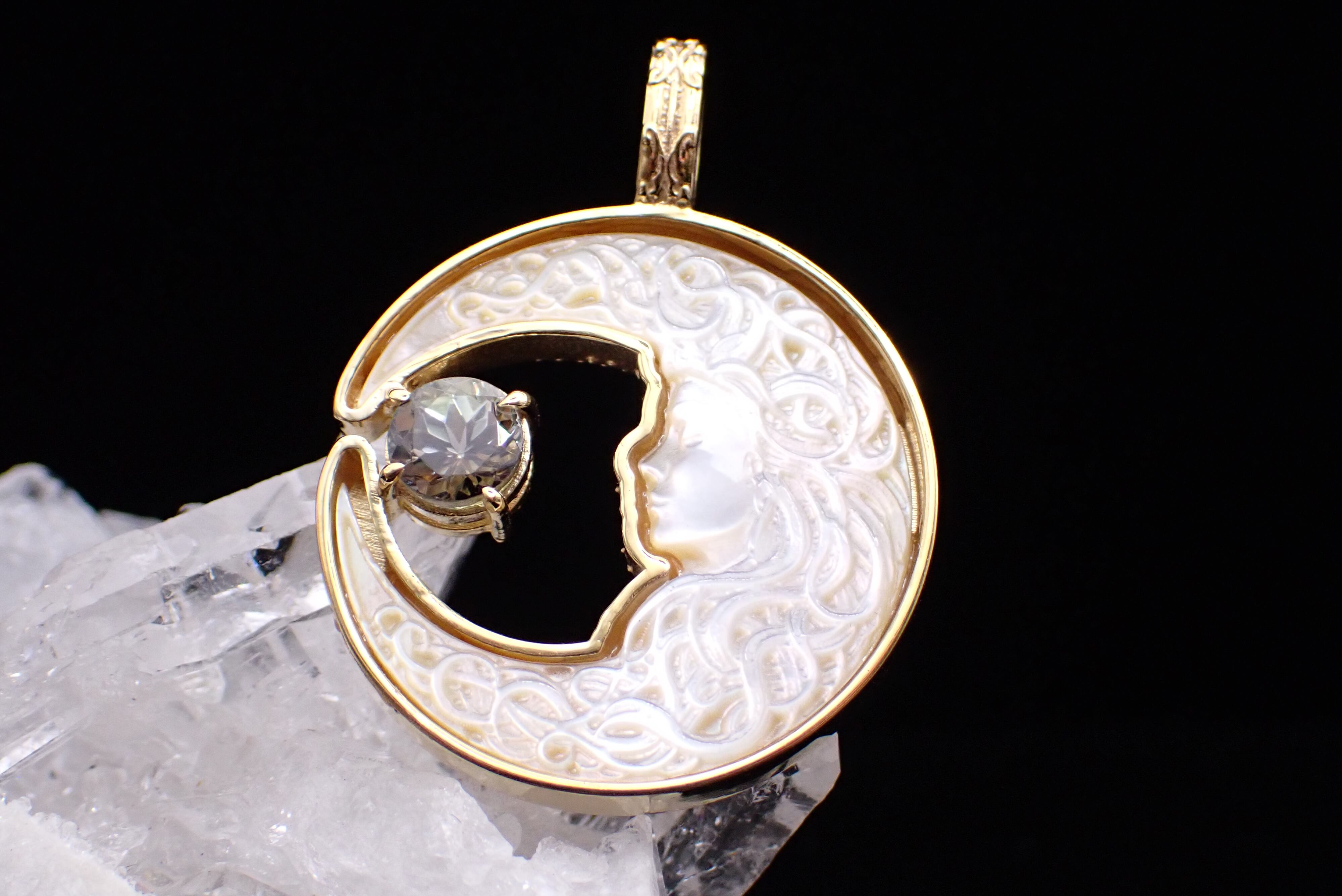 美しく描かれた白蝶貝の月の中に、深く輝くゾイサイトのペンダントです。