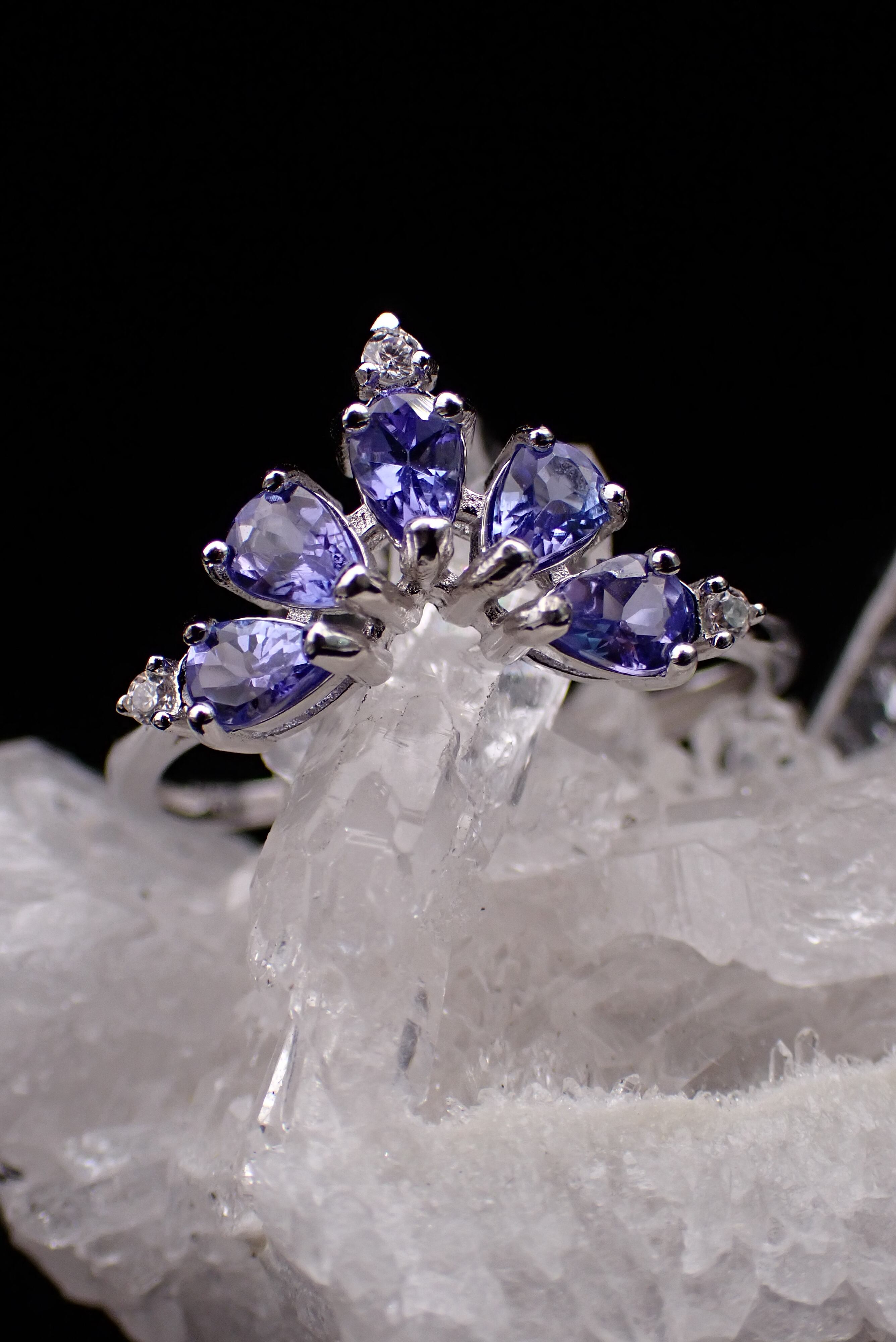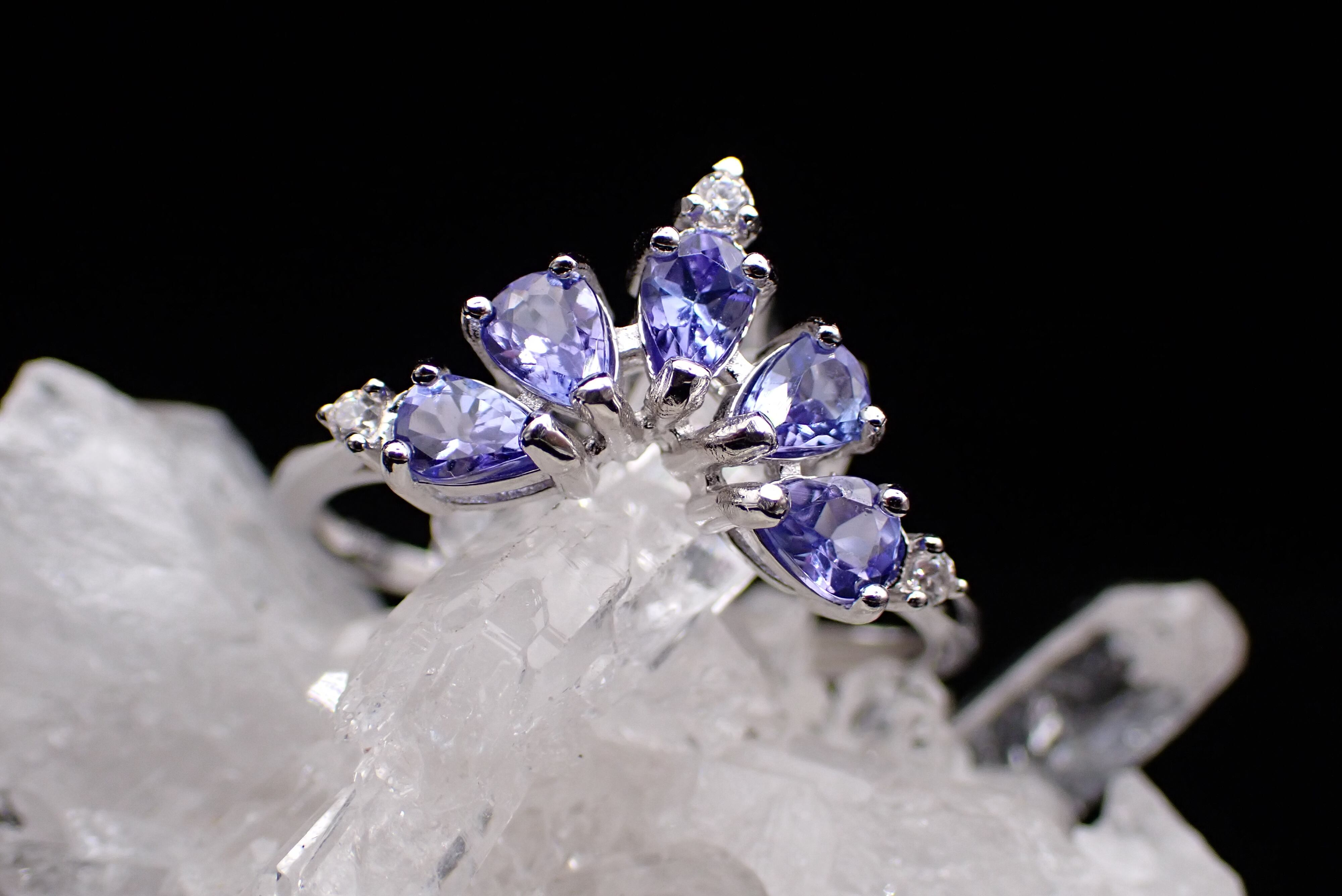 ドロップのタンザナイトたちが5つ、孔雀が羽根をひろげたように並んだリングです。