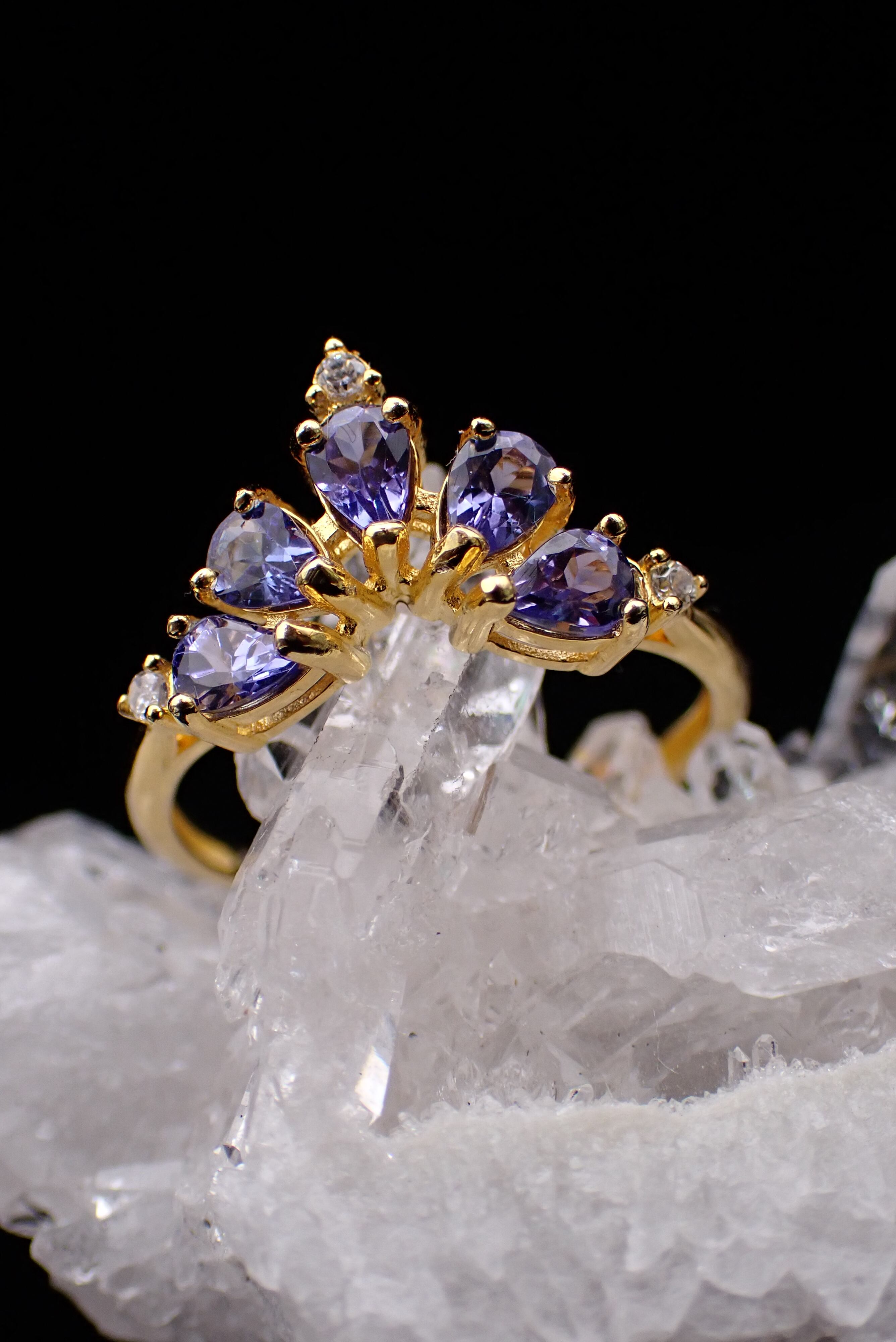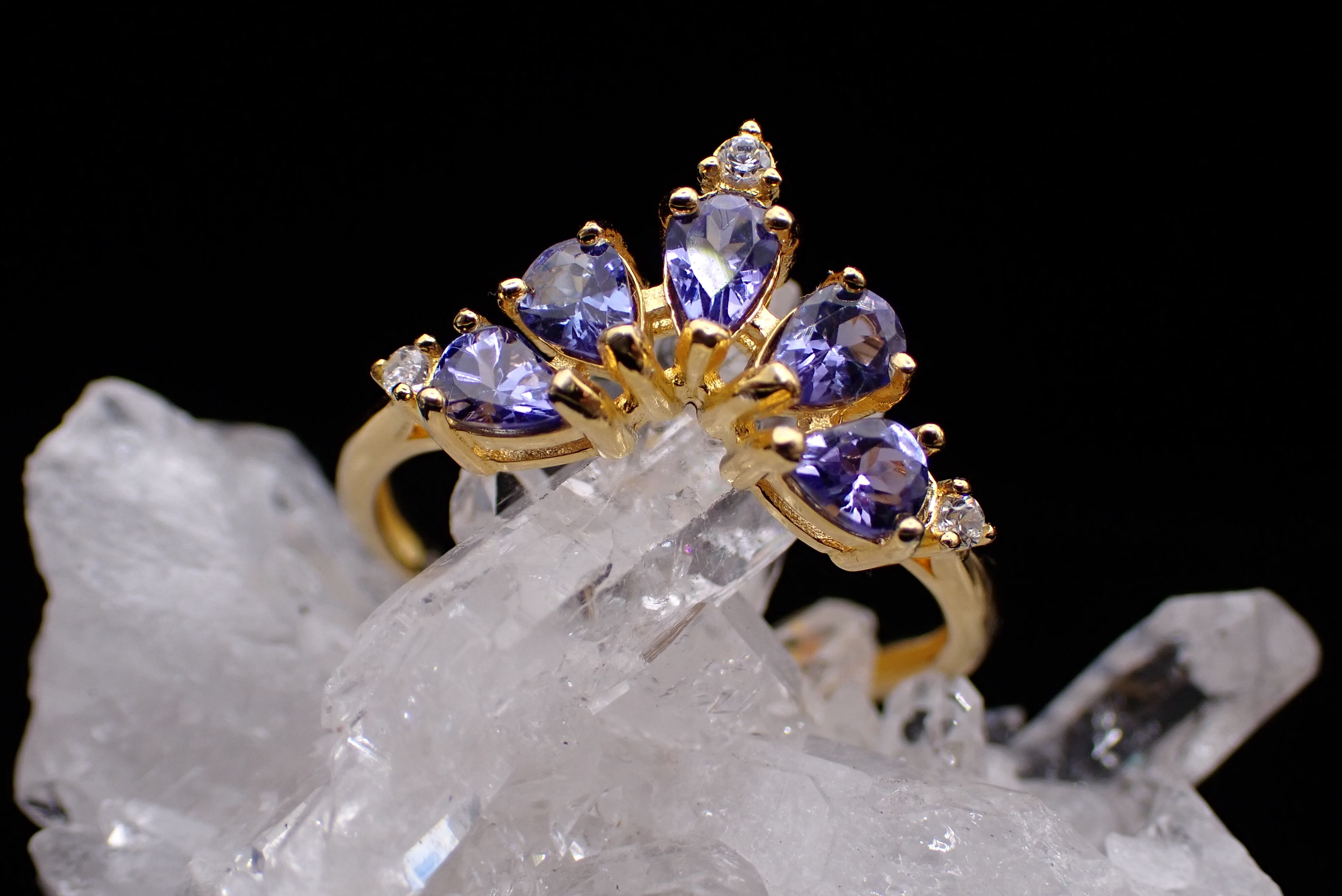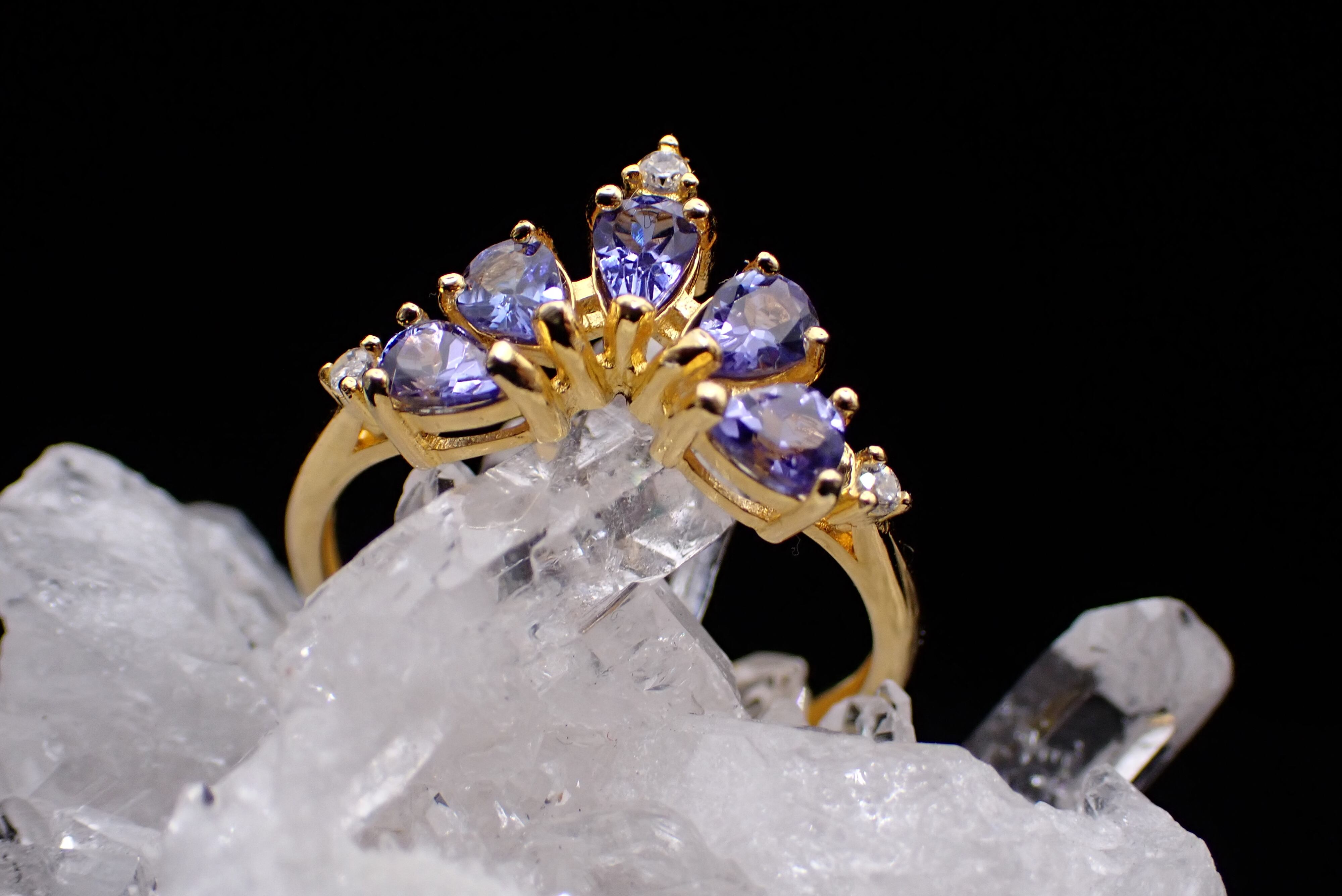 ドロップのタンザナイトたちが5つ、孔雀が羽根をひろげたように並んだリングです。