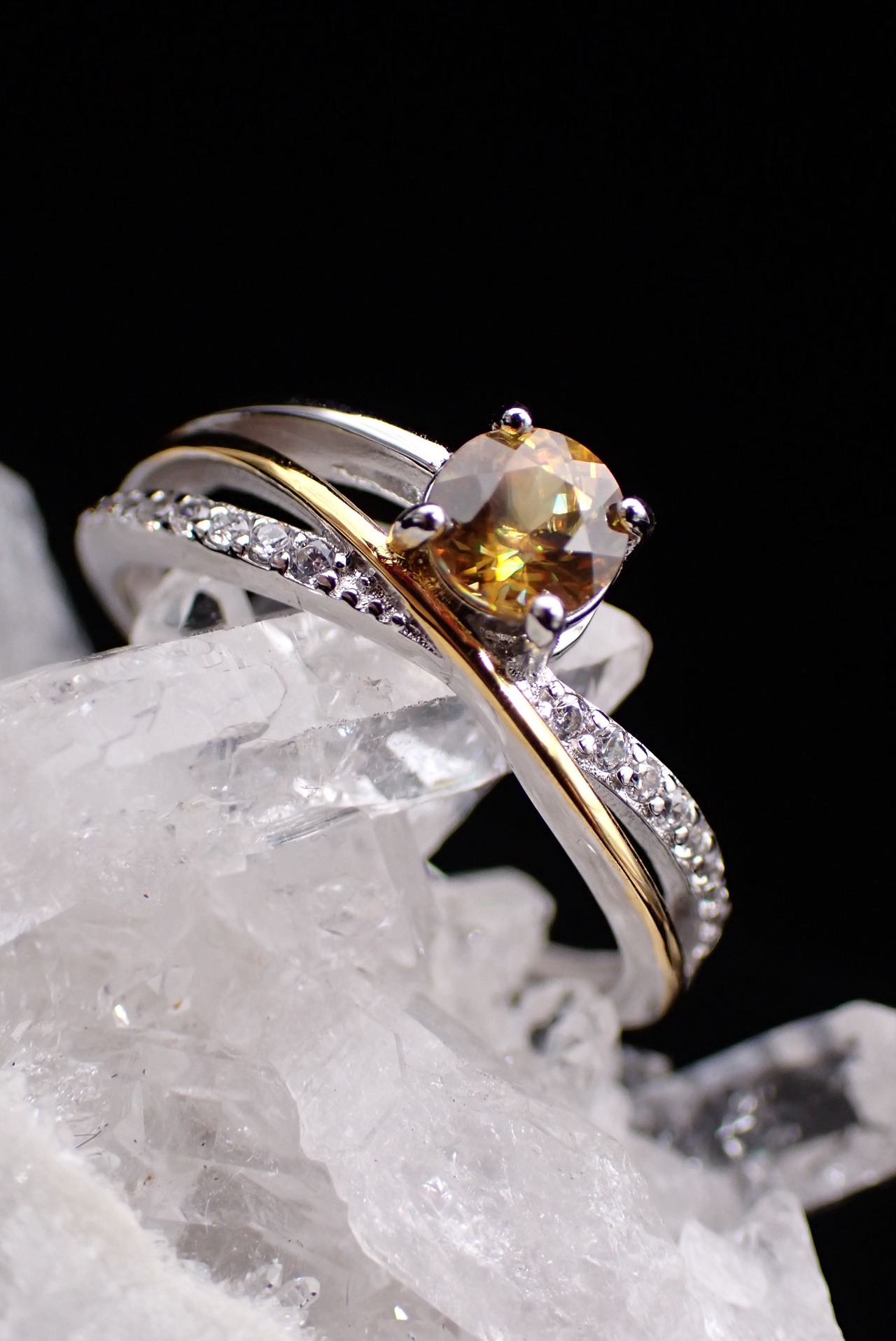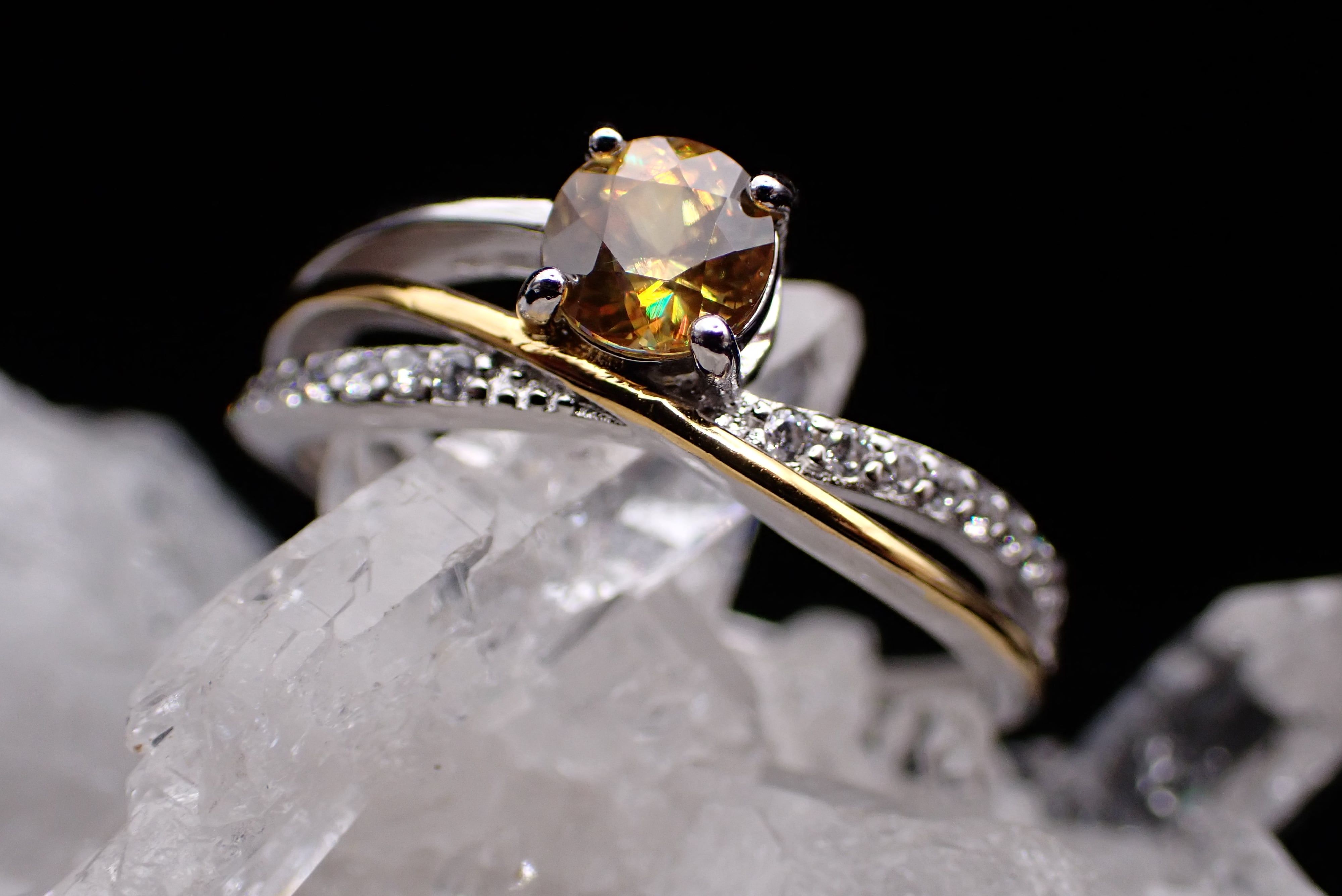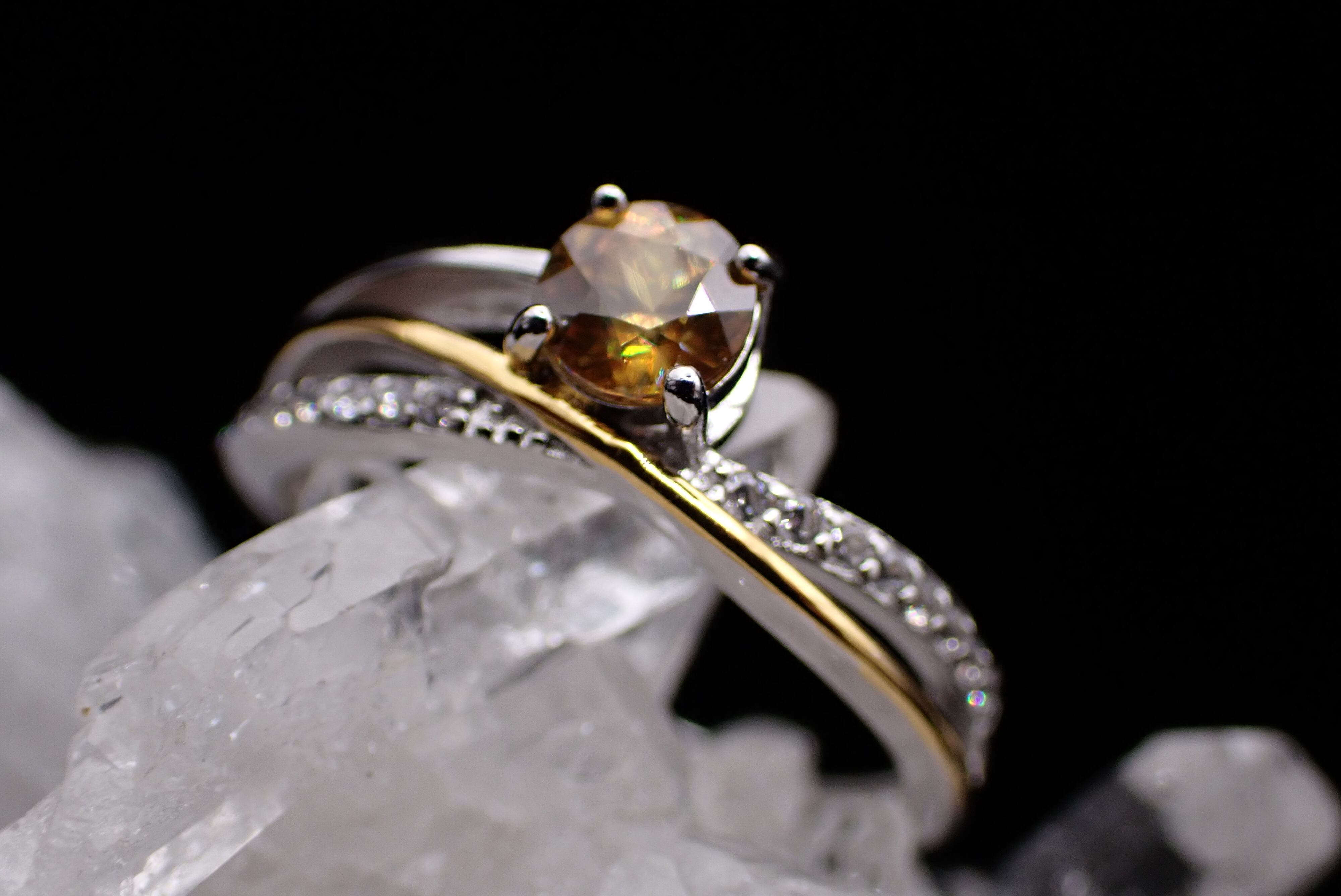 流れるようなゴールドとシルバーが交差する中央に、鮮やかな輝きのファイアが美しいスフェーンが鎮座します。