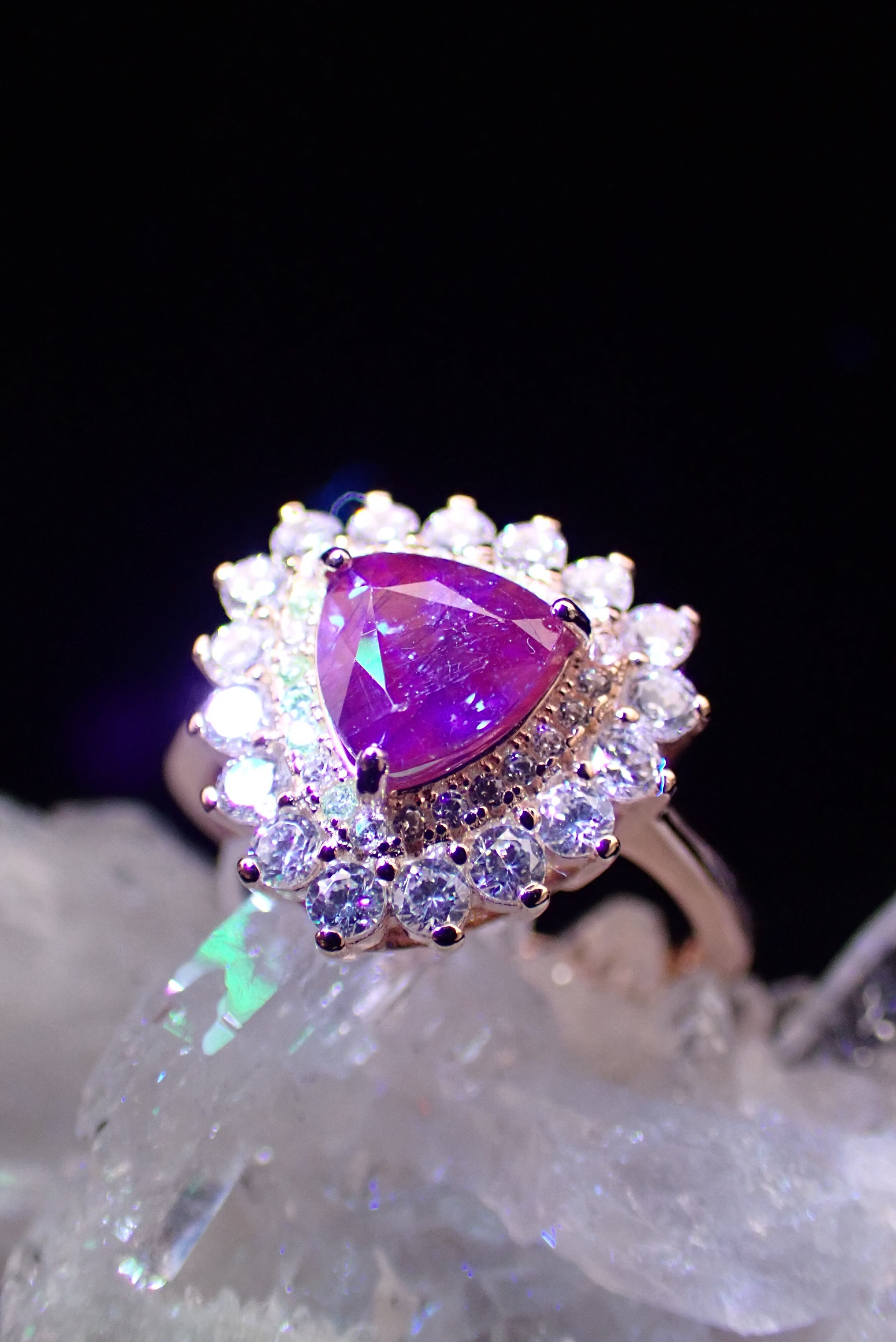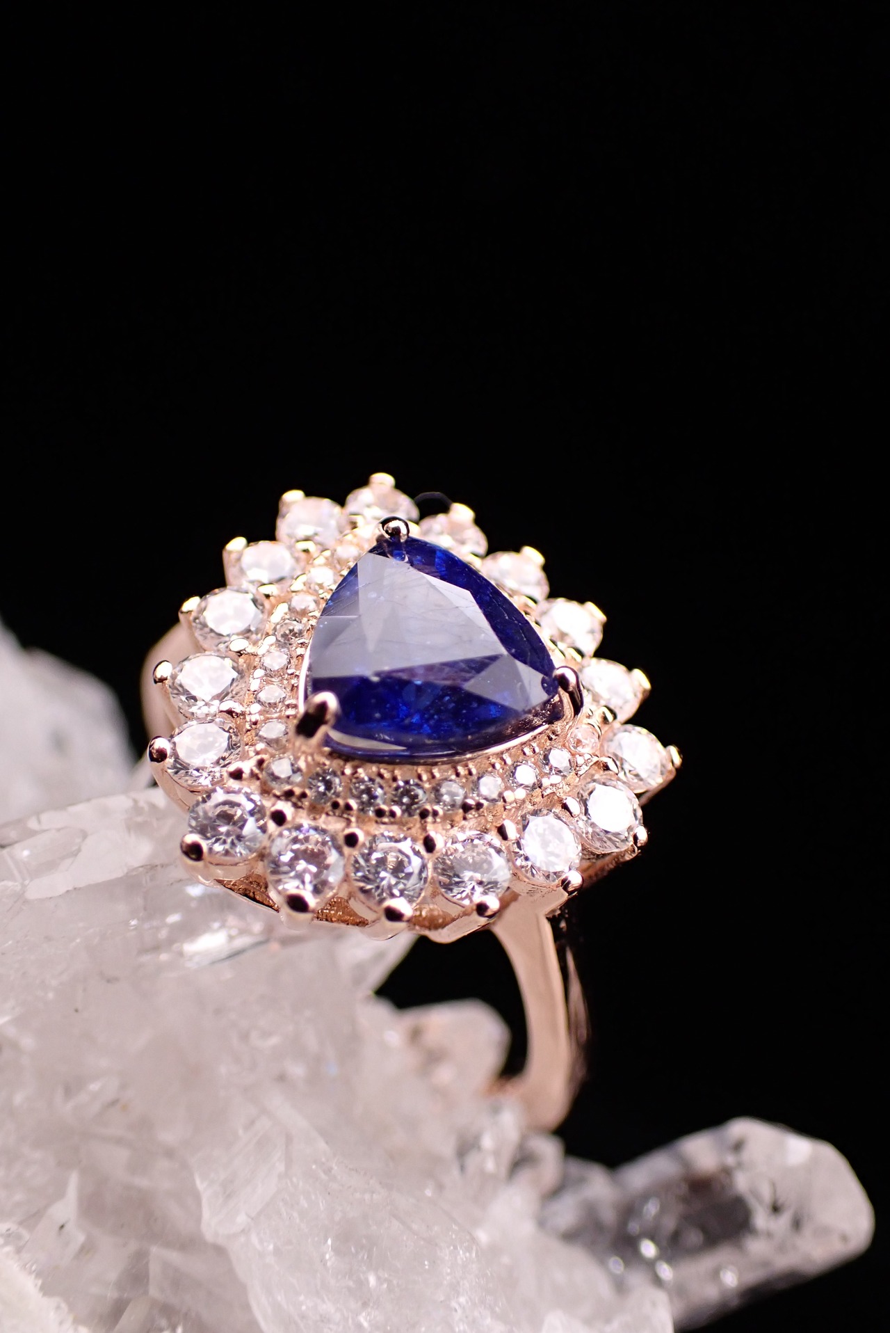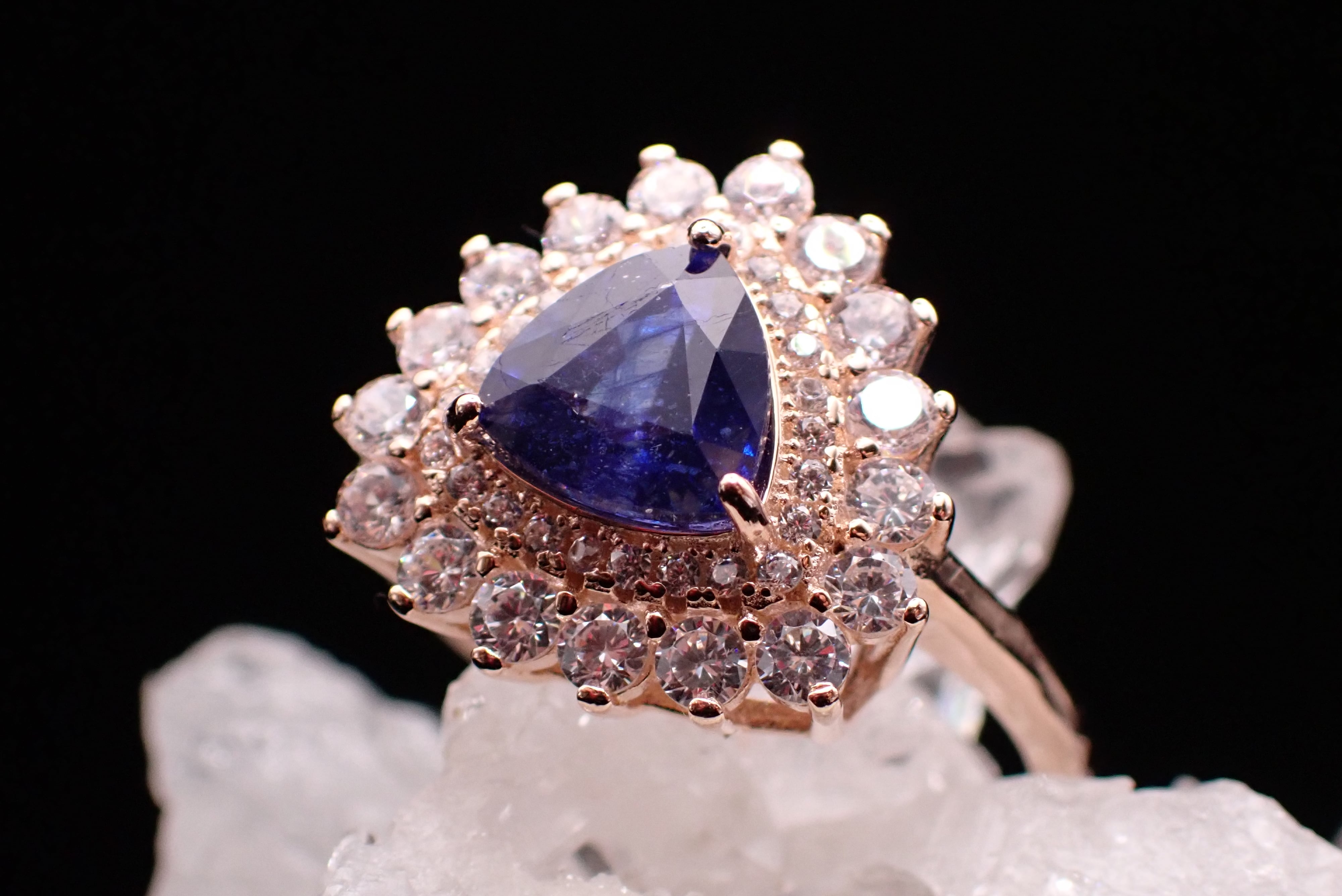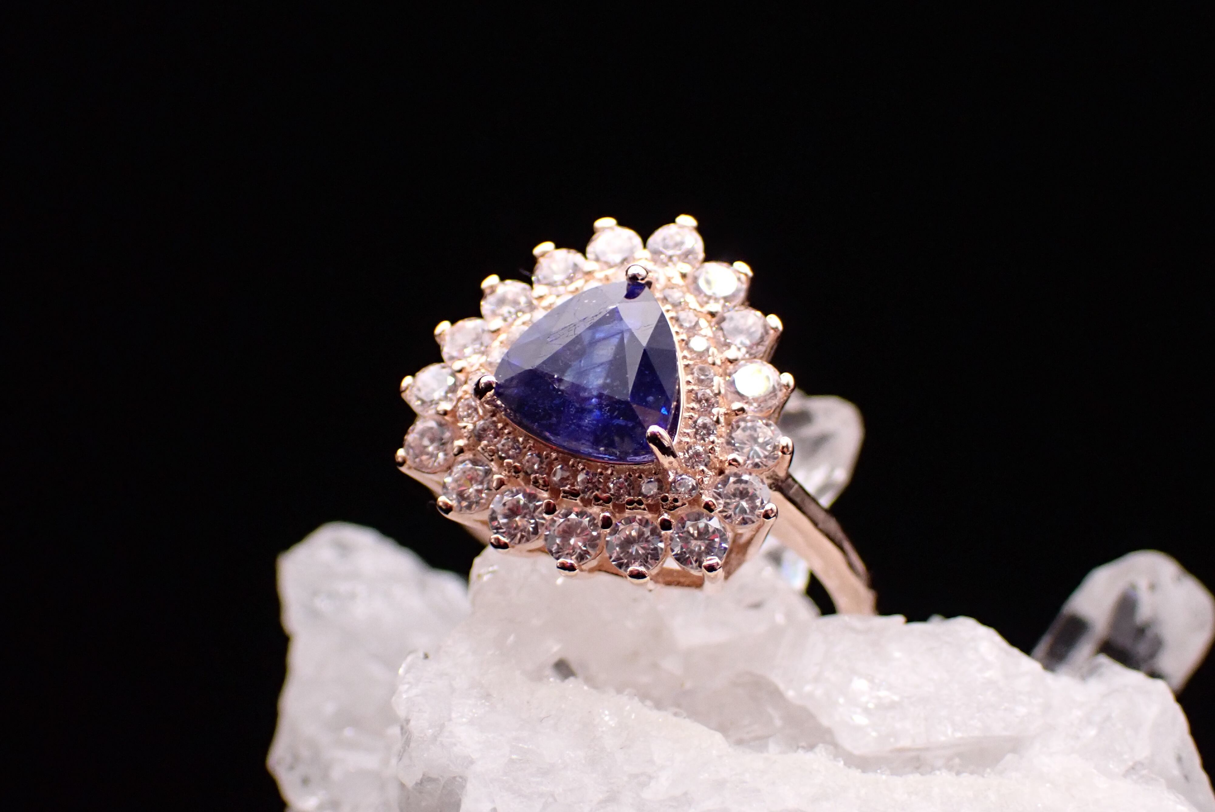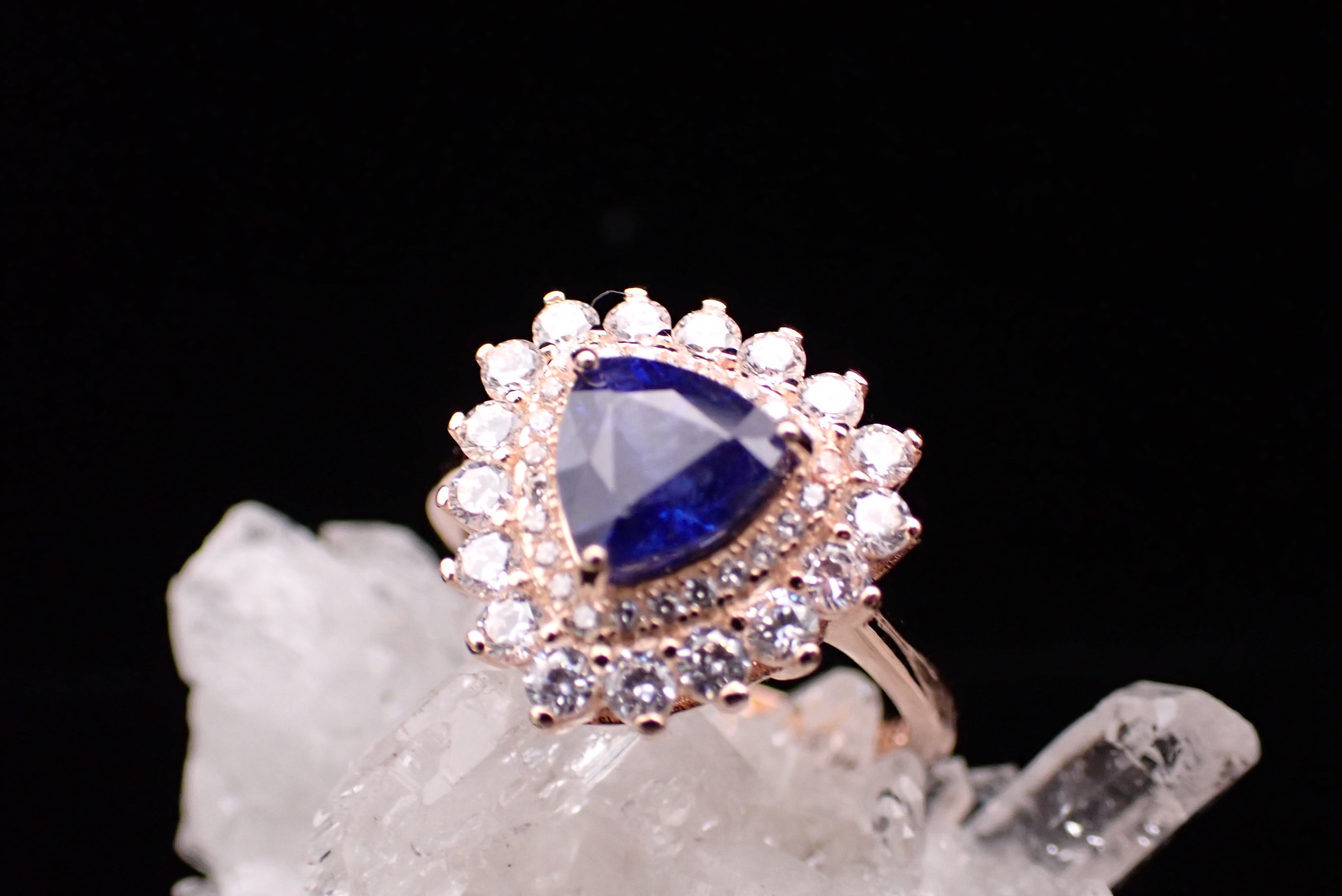 煌びやかに散るジルコニアの中央に佇む、深い青を携えたサファイアのリングです。