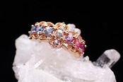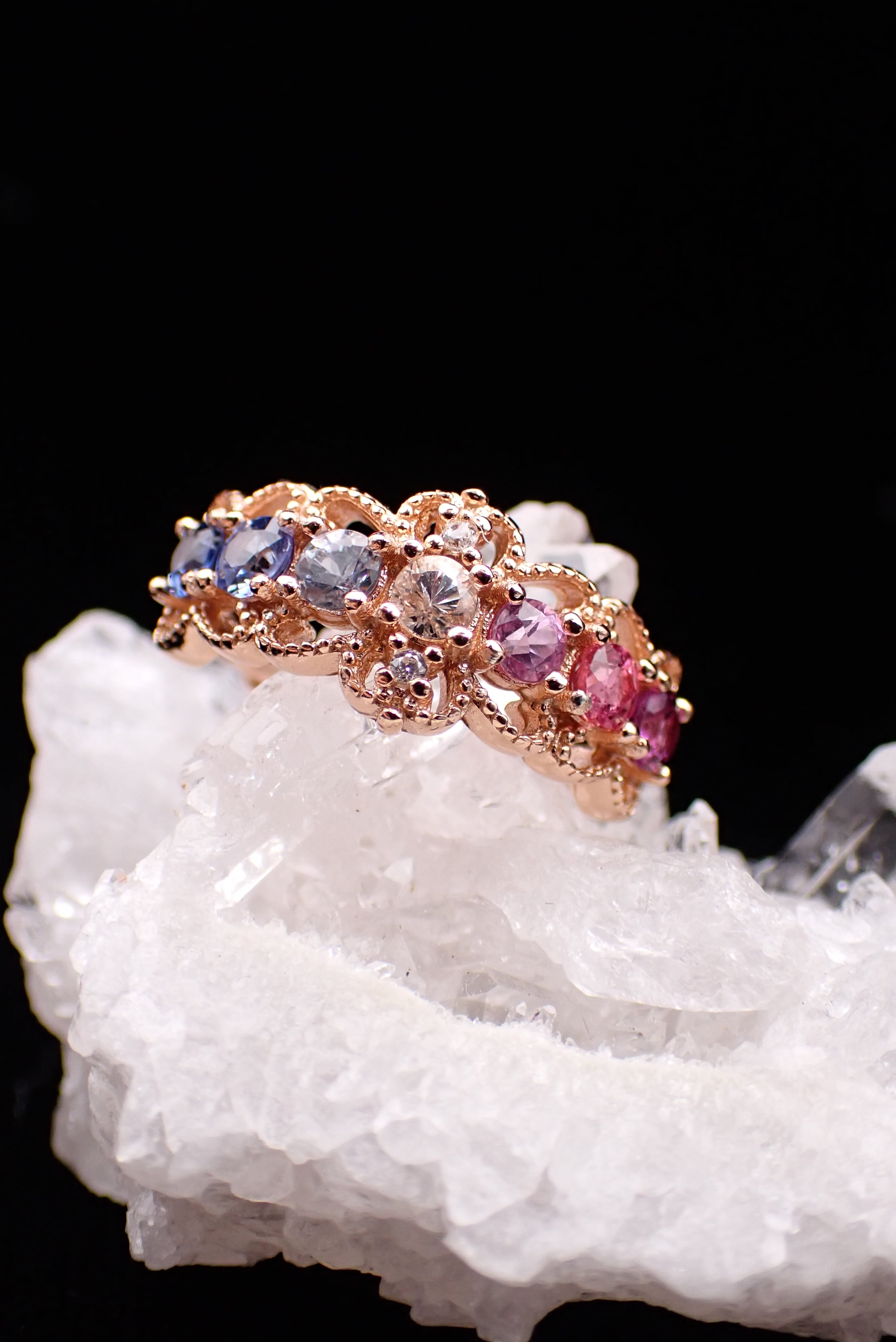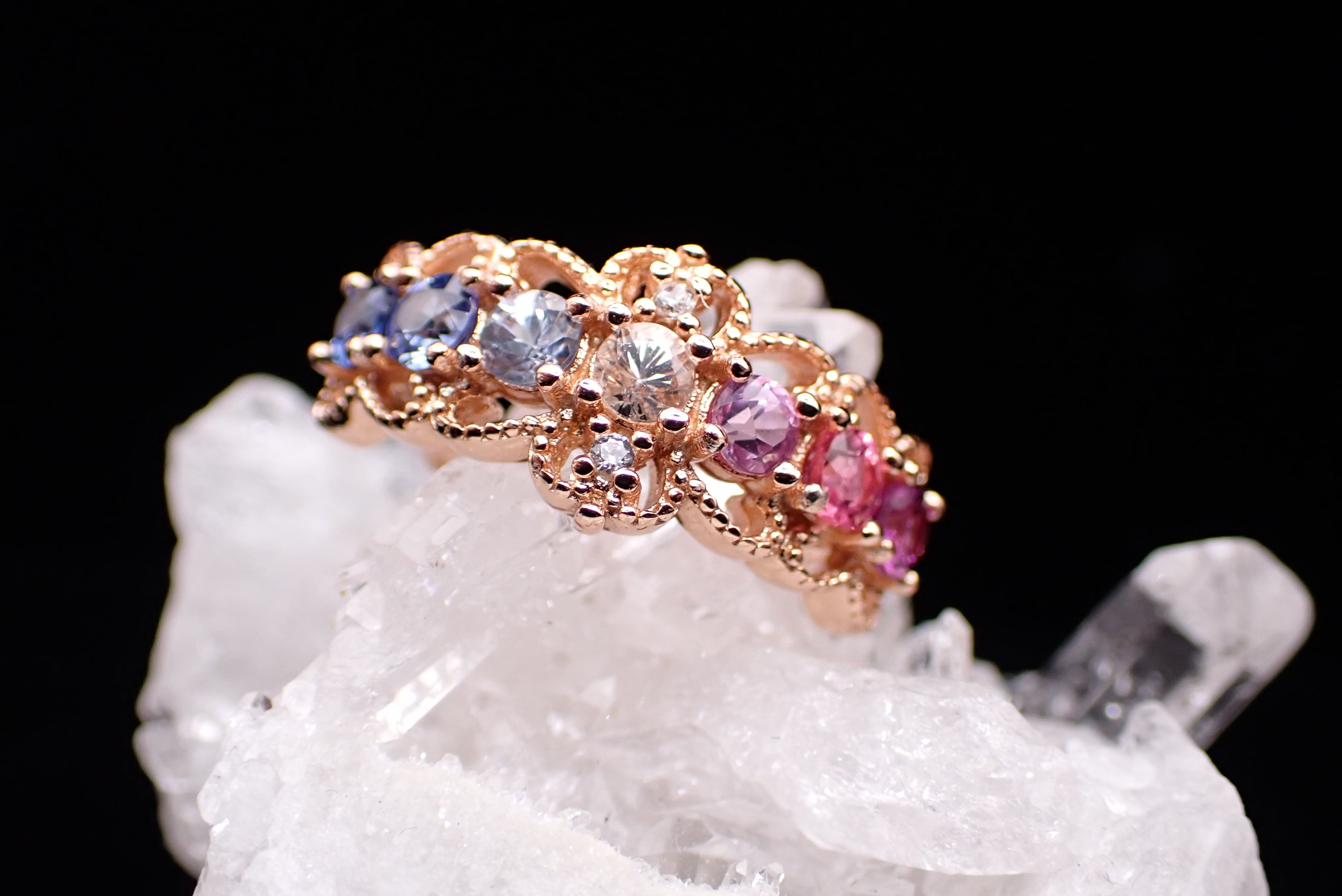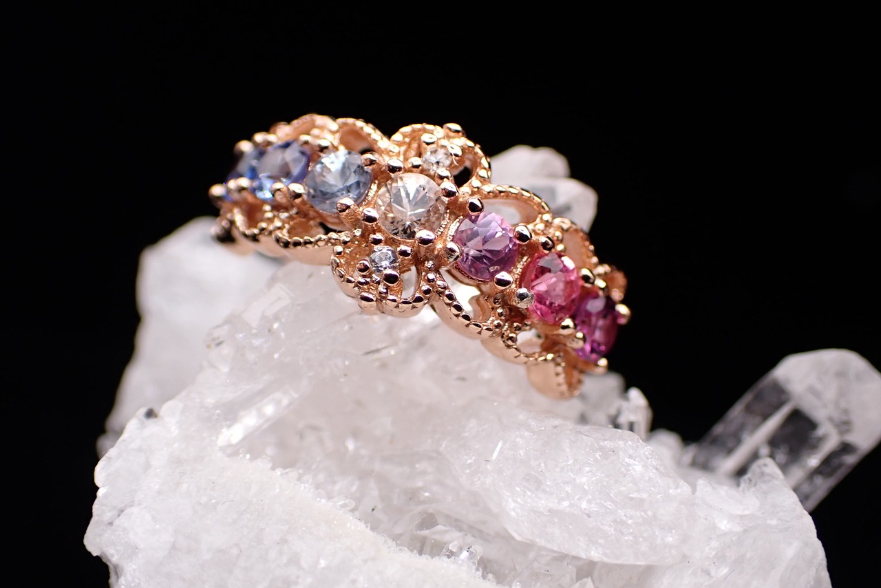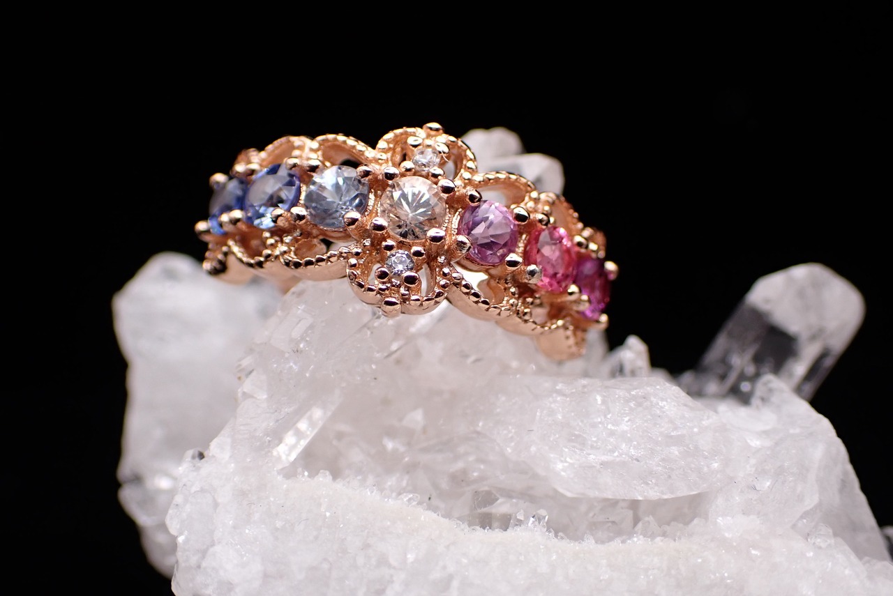 上下にレースがついたようなデザインに、美しいカラーストーンたちがグラデーションになるように並んだゴージャスなリングです。
