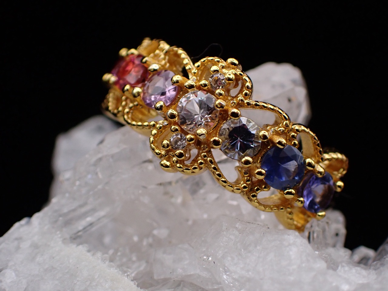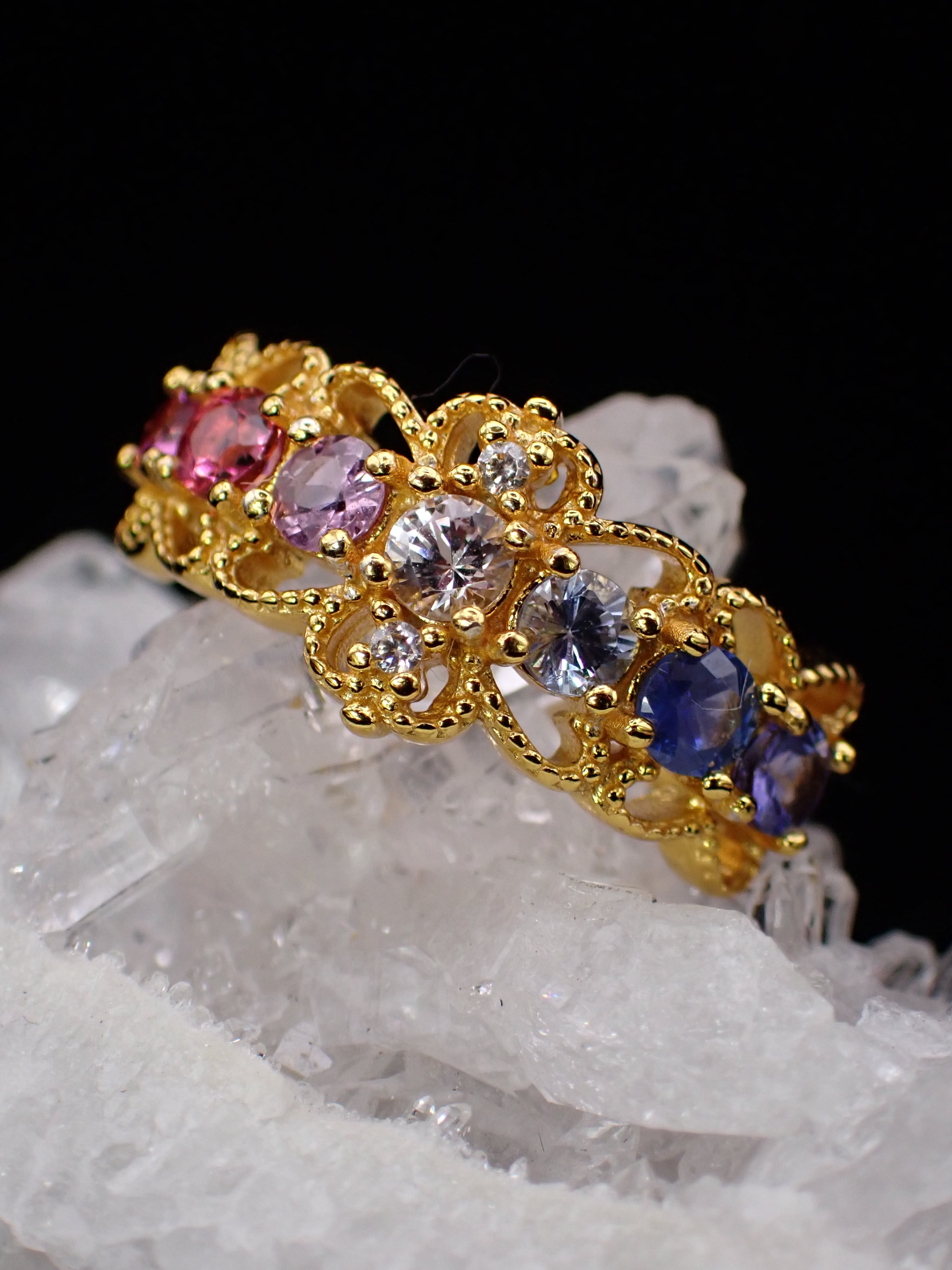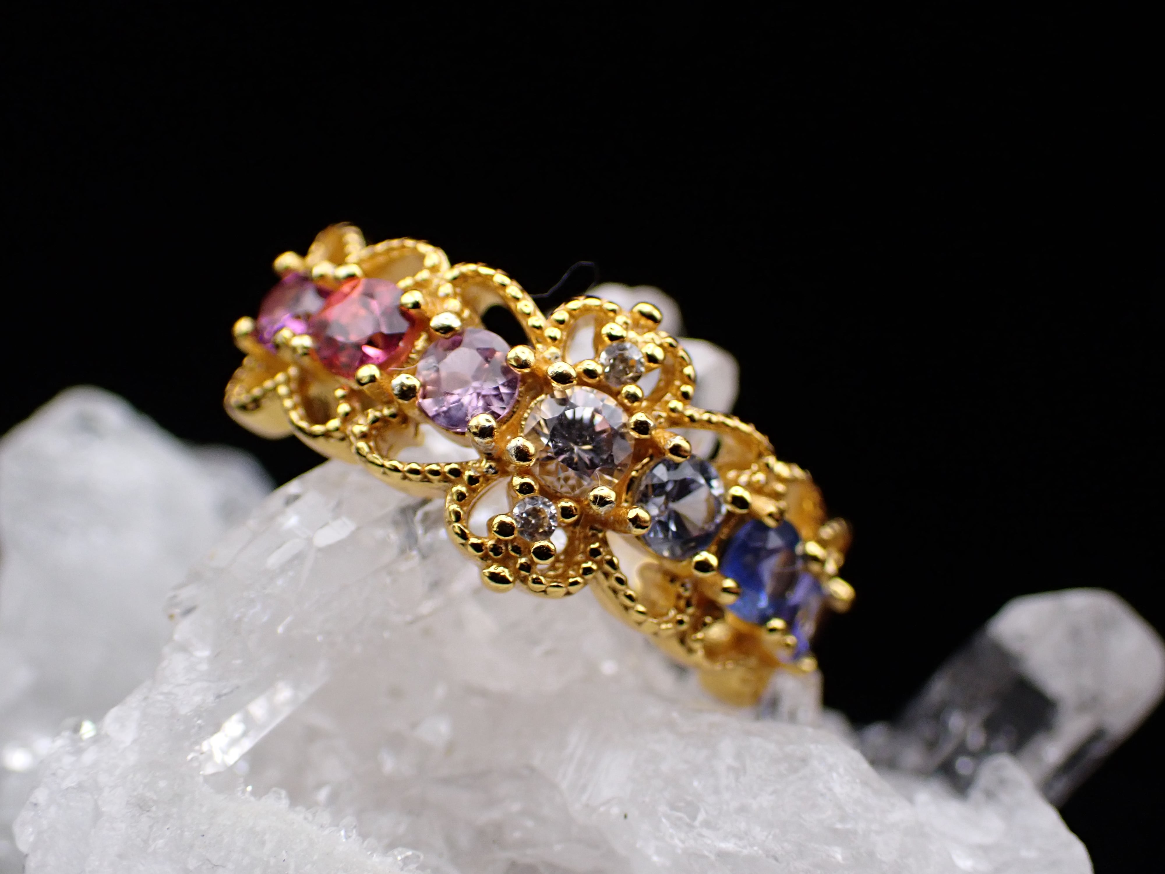 上下にレースがついたようなデザインに、美しいカラーストーンたちがグラデーションになるように並んだゴージャスなリングです。