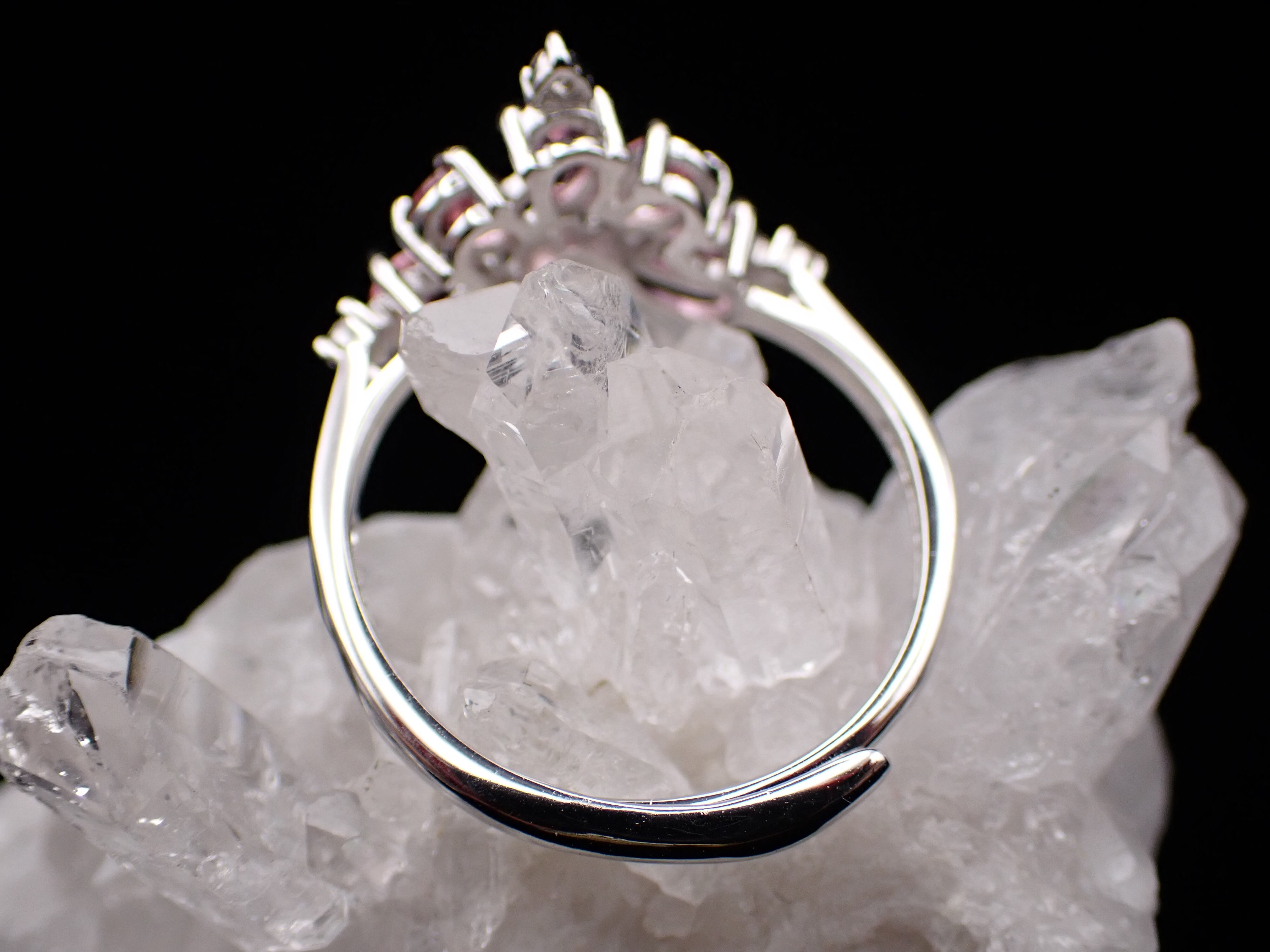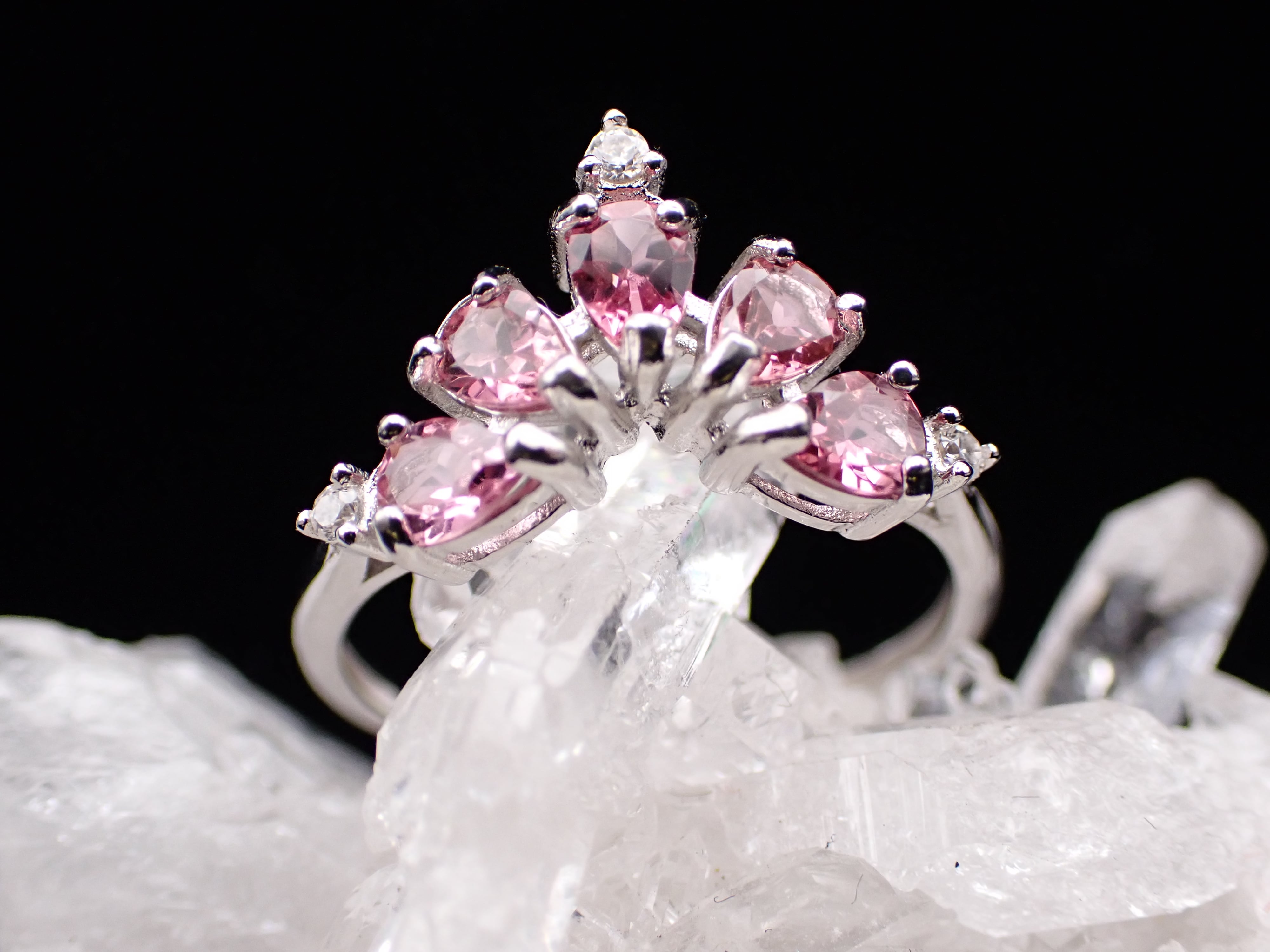 ドロップのピンクトルマリンたちが5つ、孔雀が羽根をひろげたように並んだリングです。
