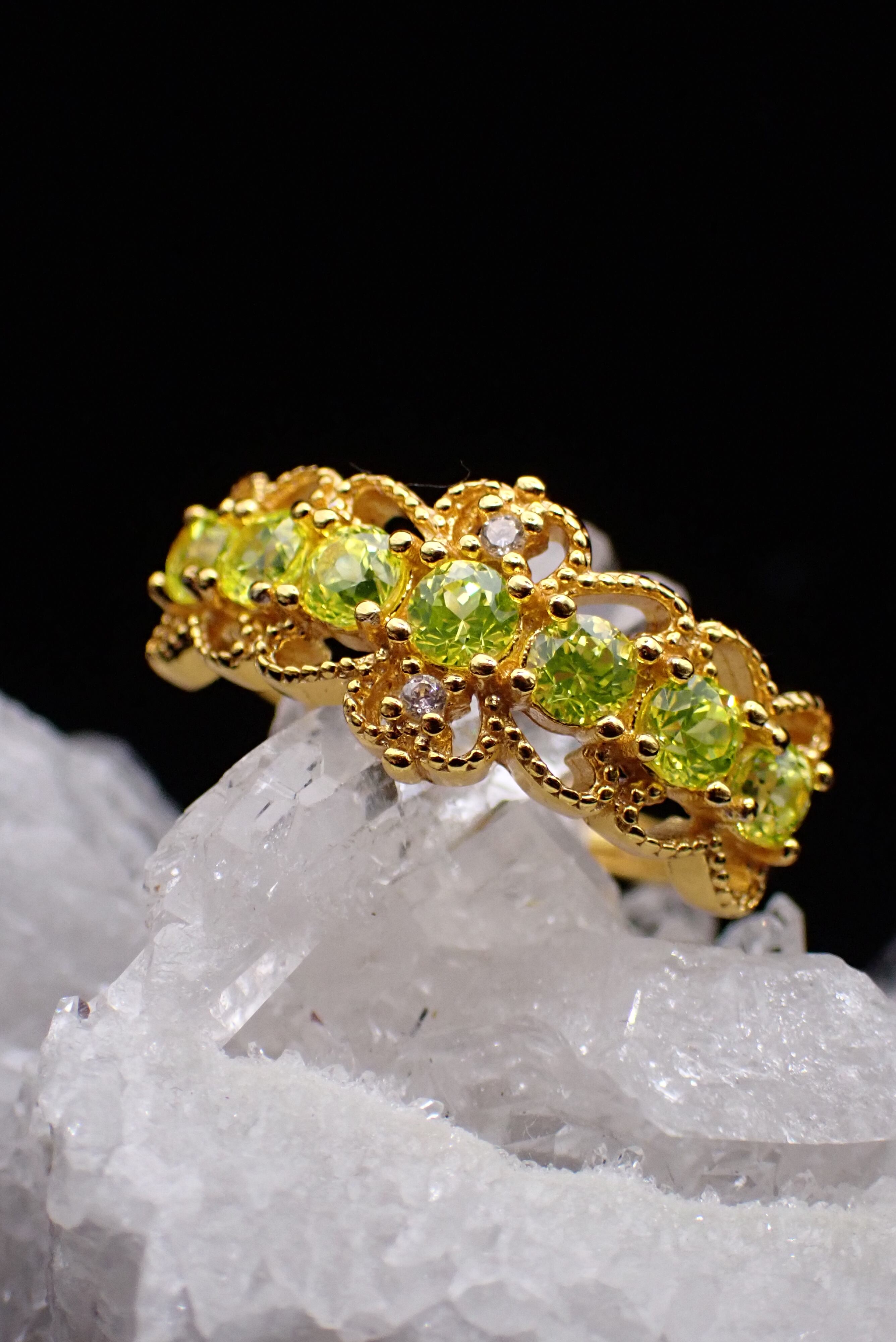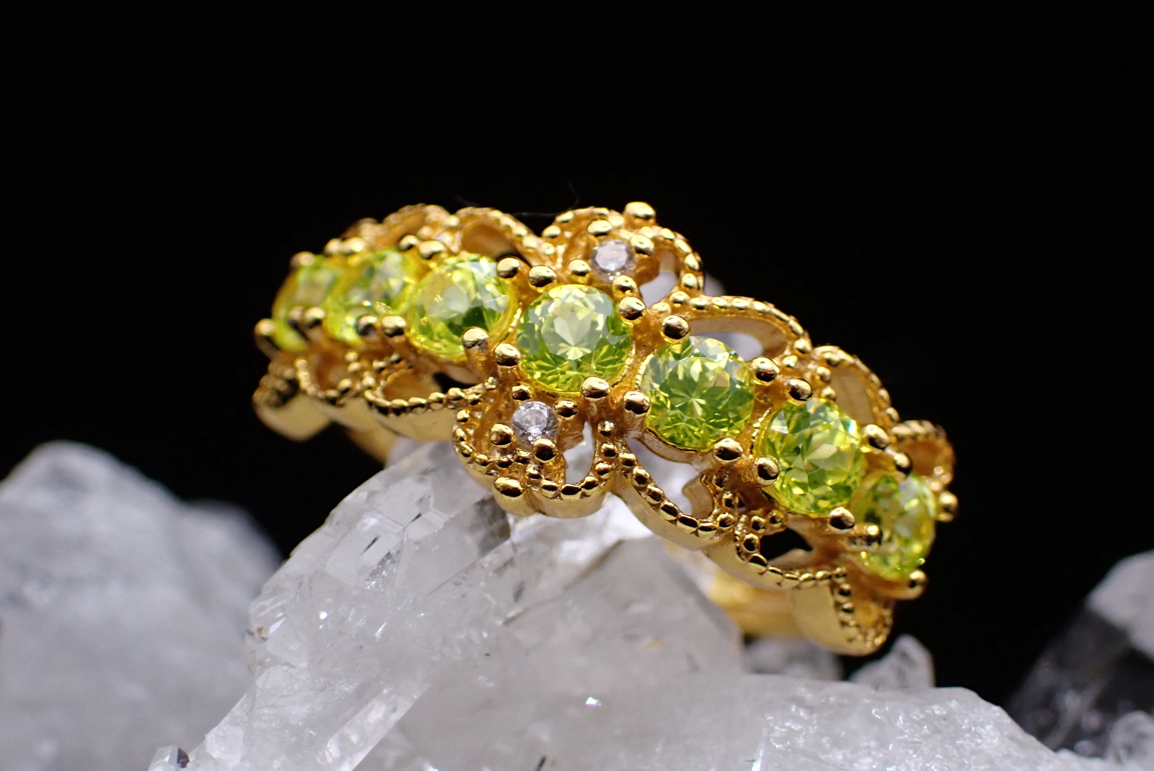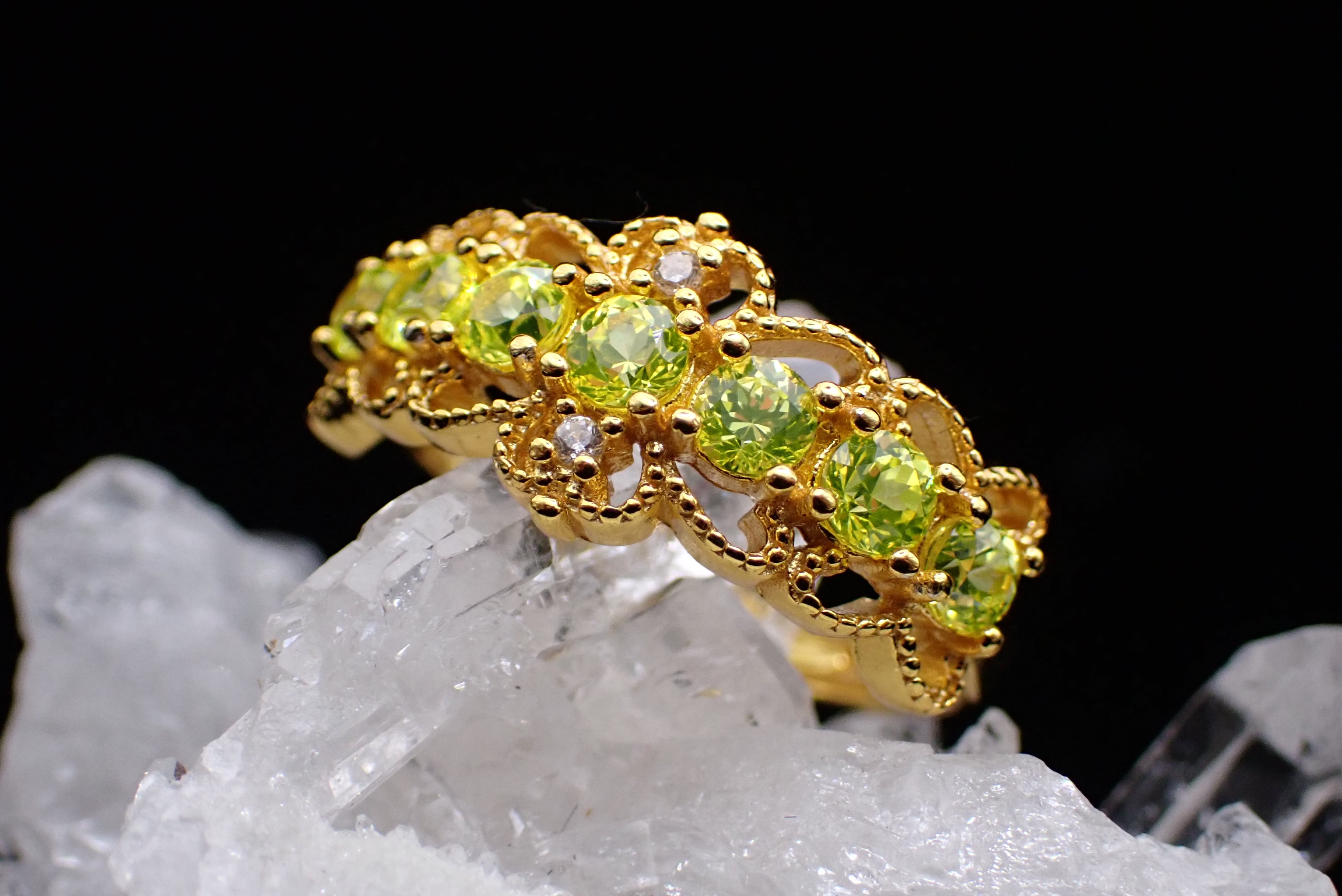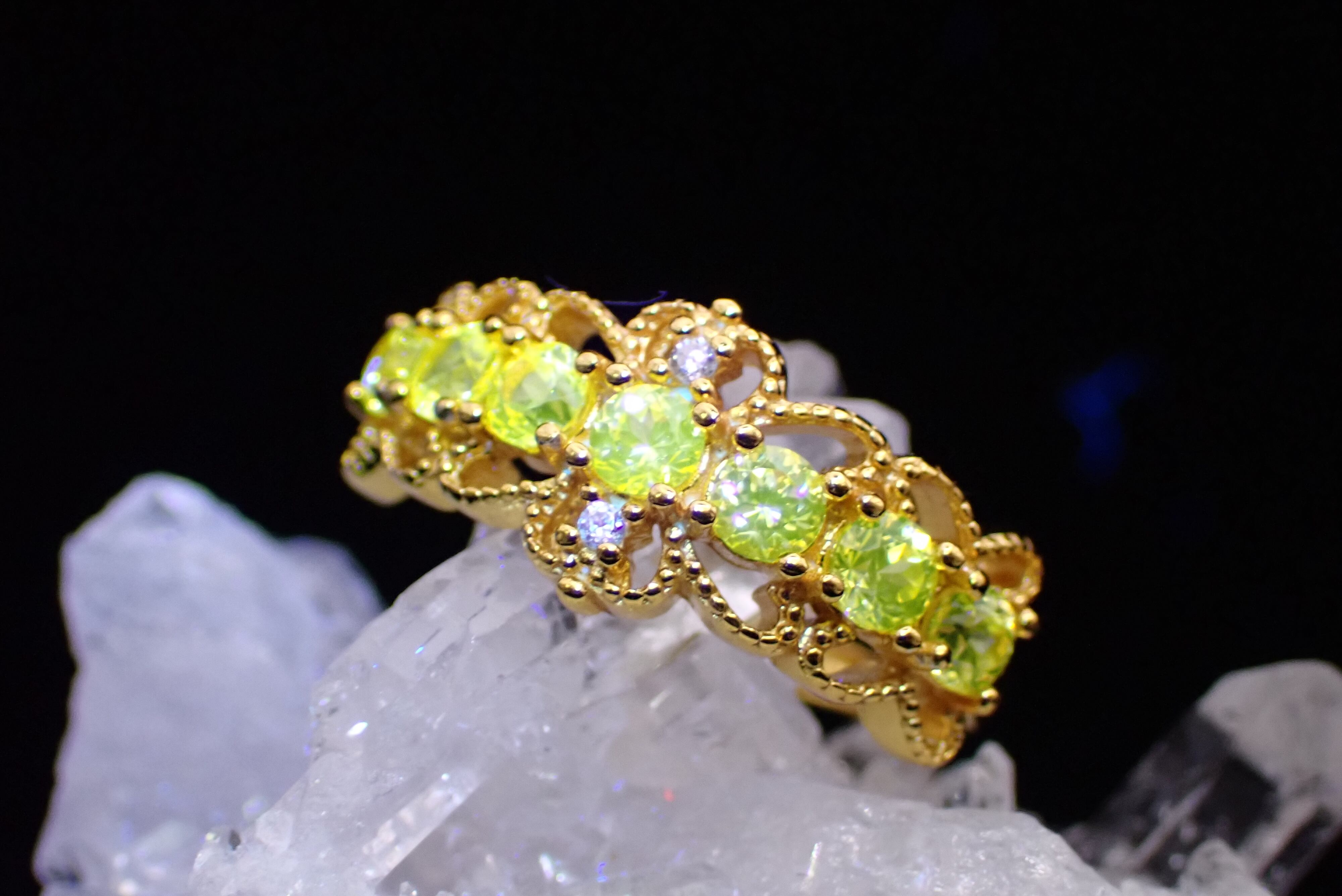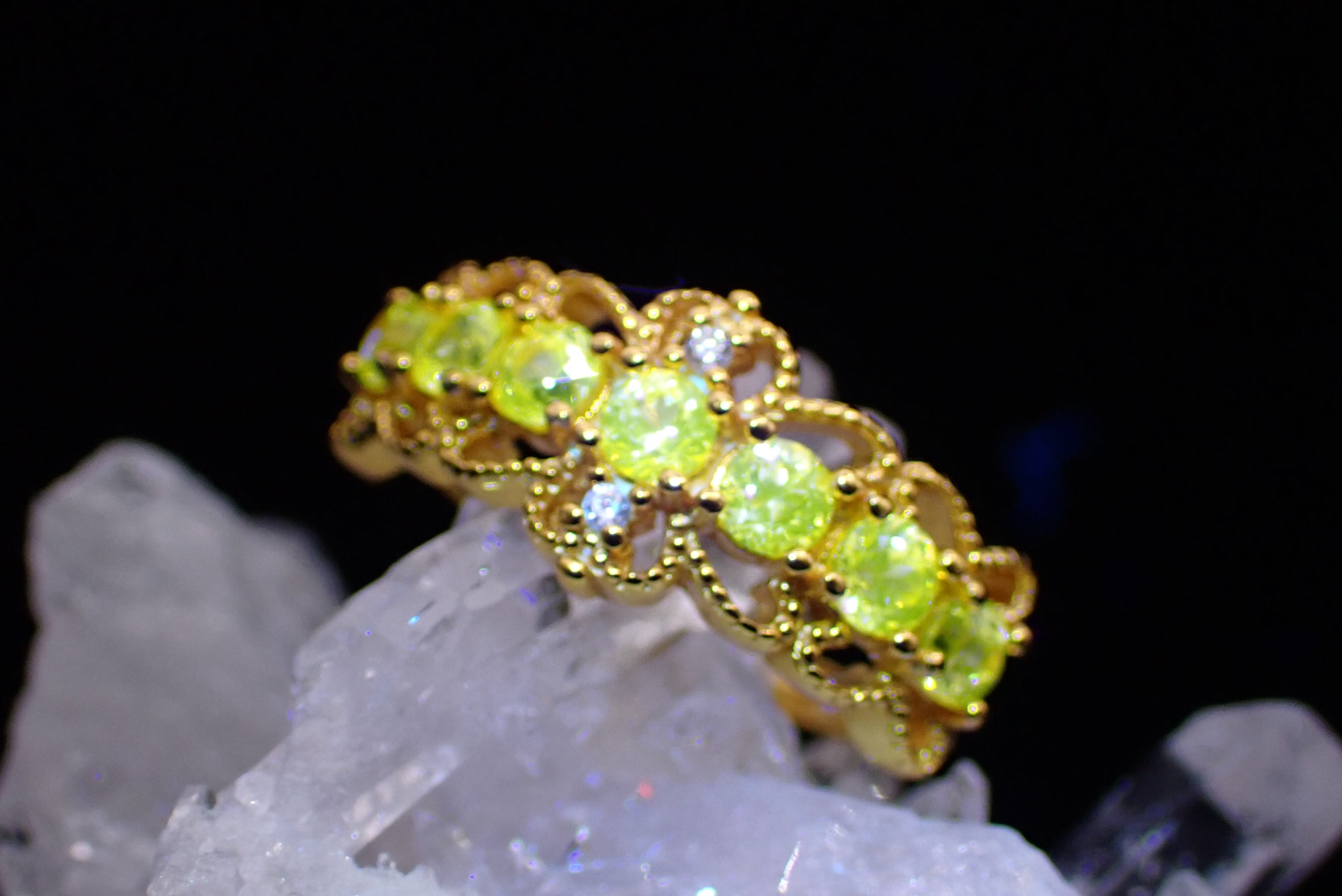 上下にレースがついたようなデザインに、美しいYAG(イットリウムアルミニウムガーネット)が並んだゴージャスなリングです。