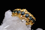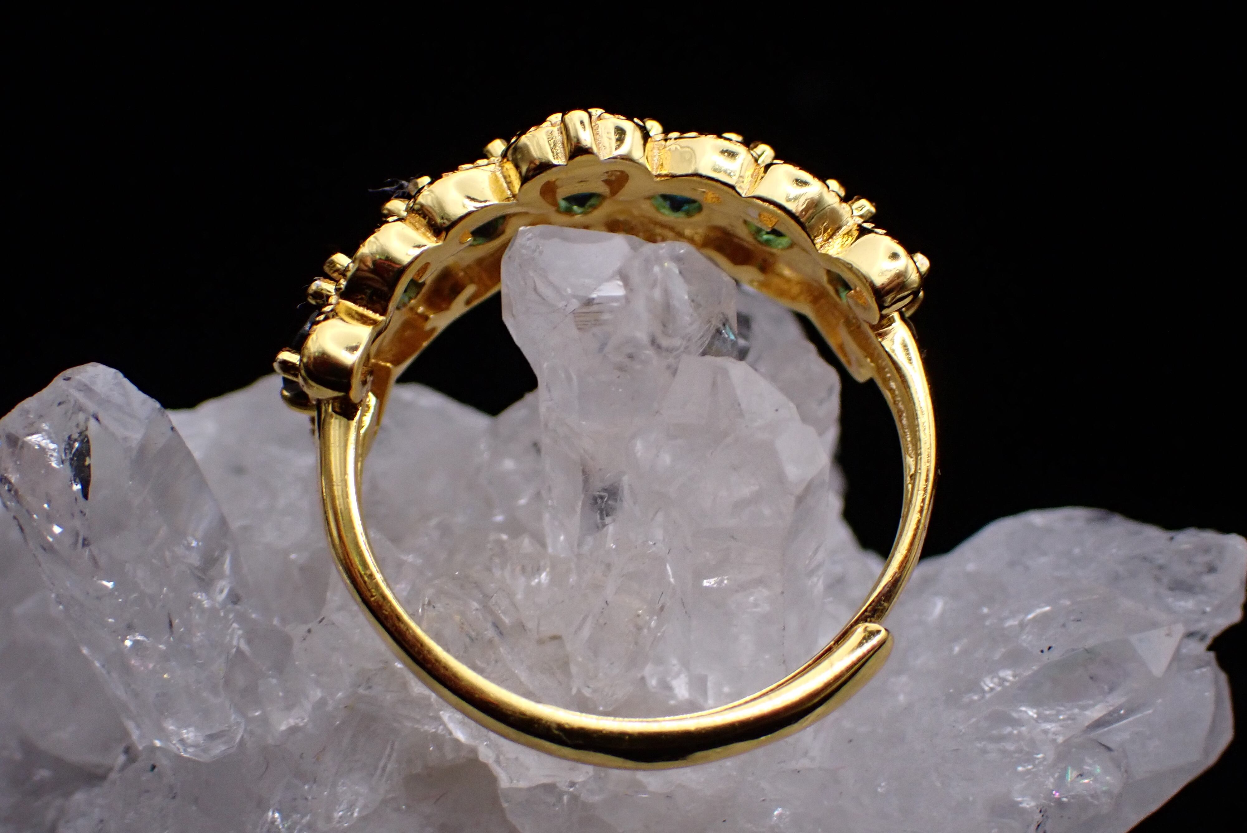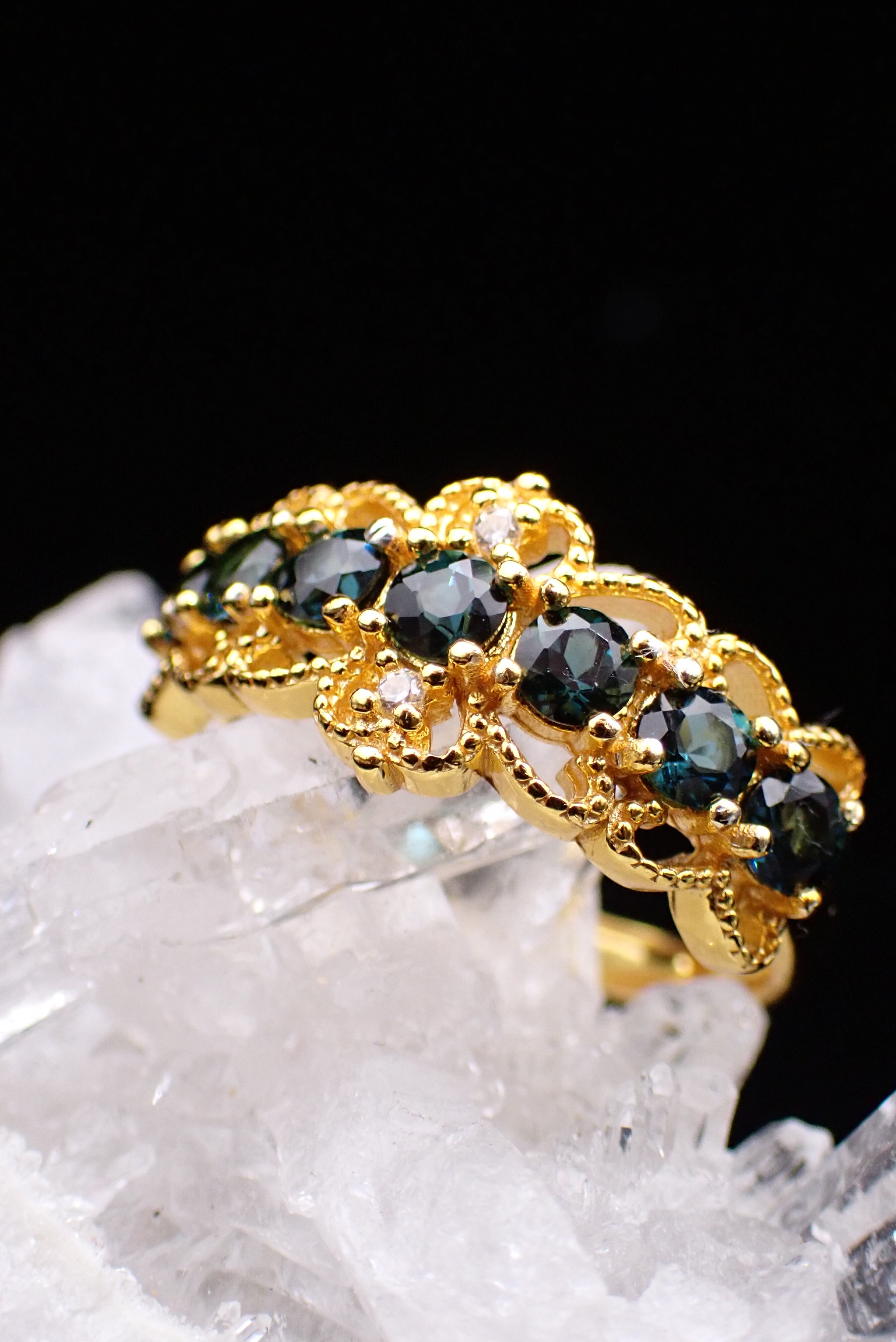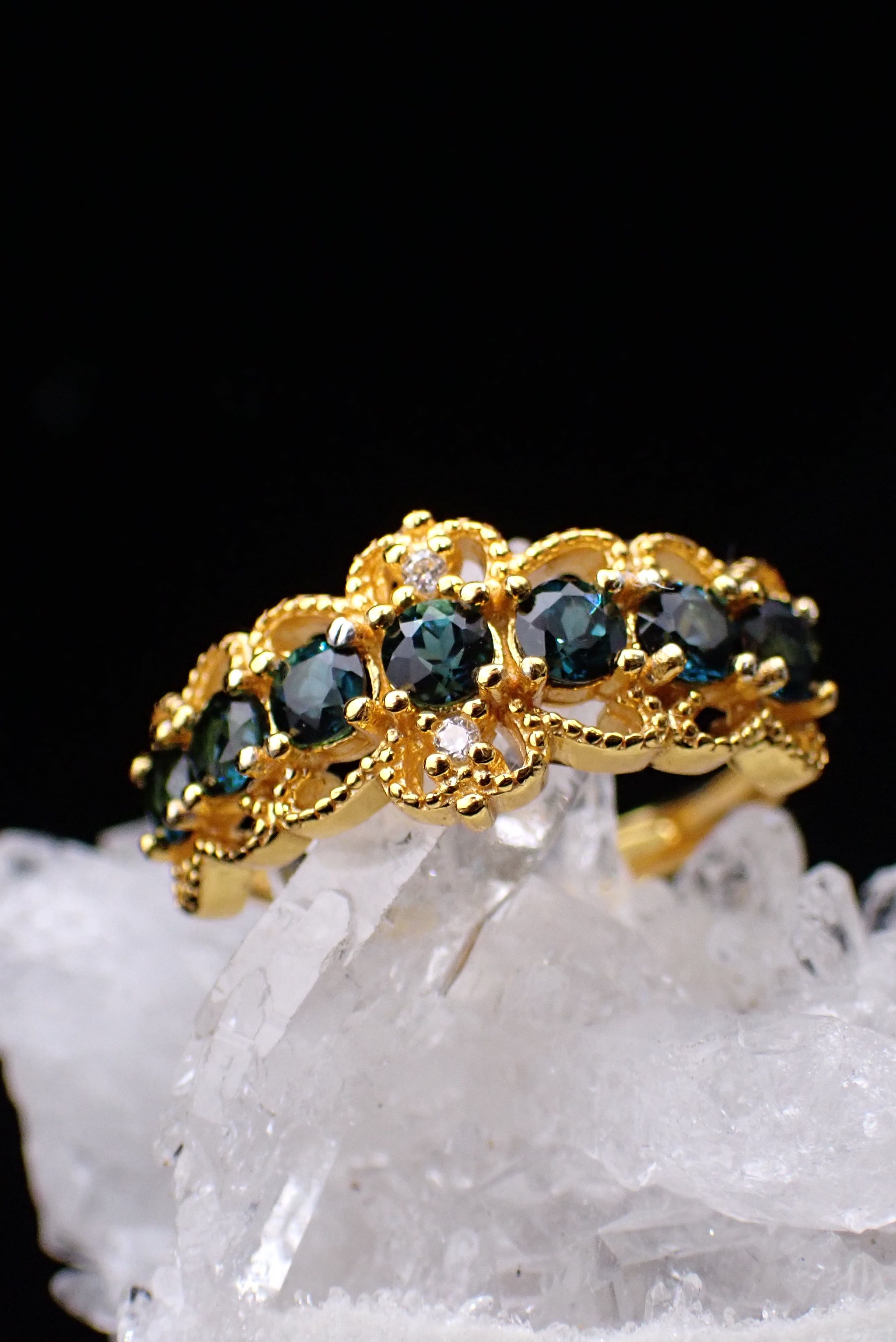 上下にレースがついたようなデザインに、深いグリーントルマリンが並んだゴージャスなリングです。