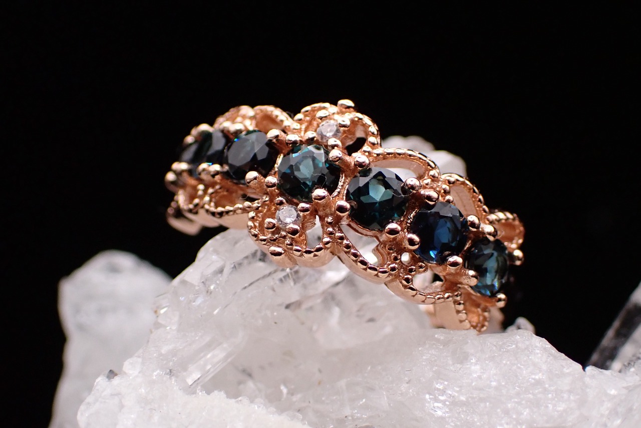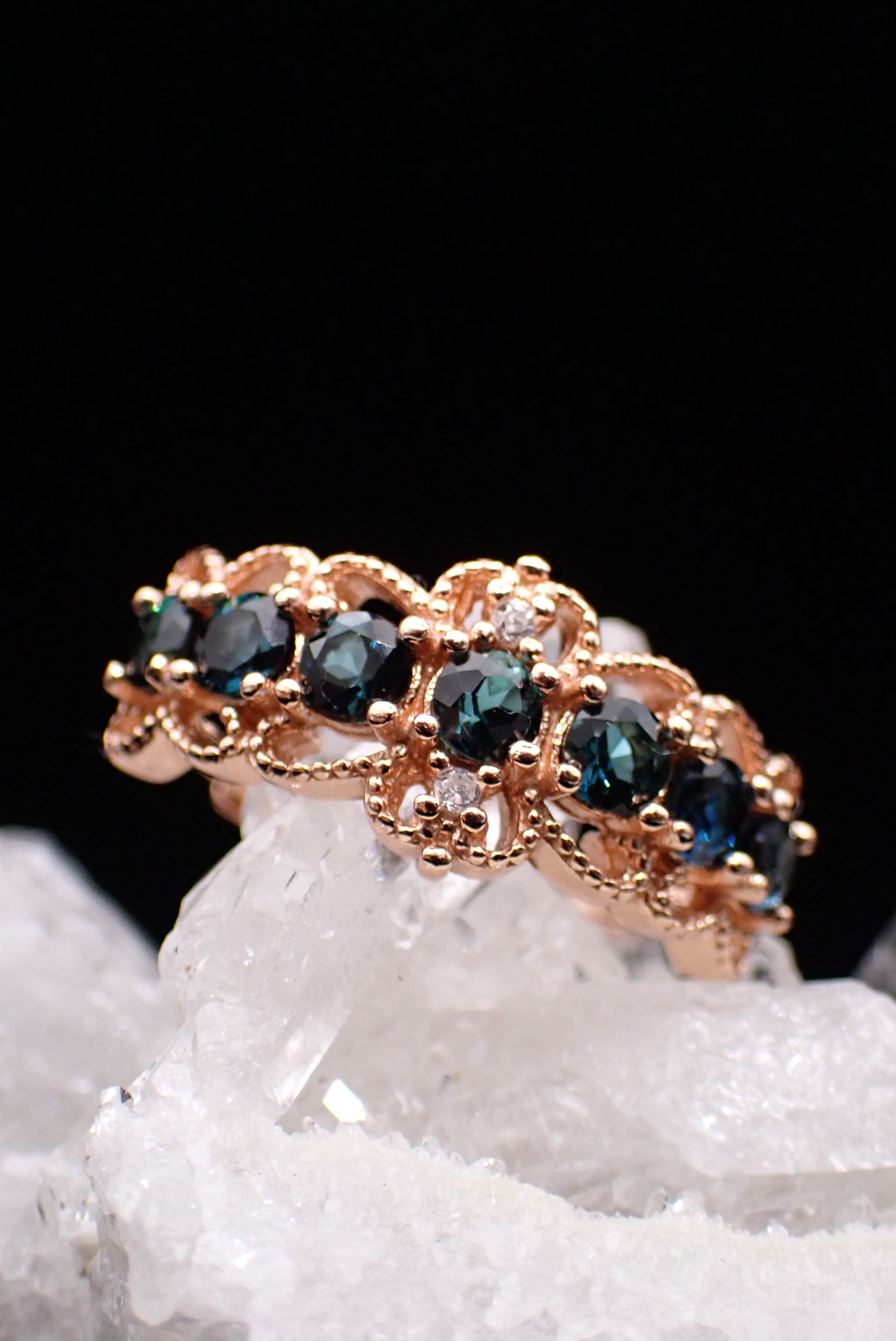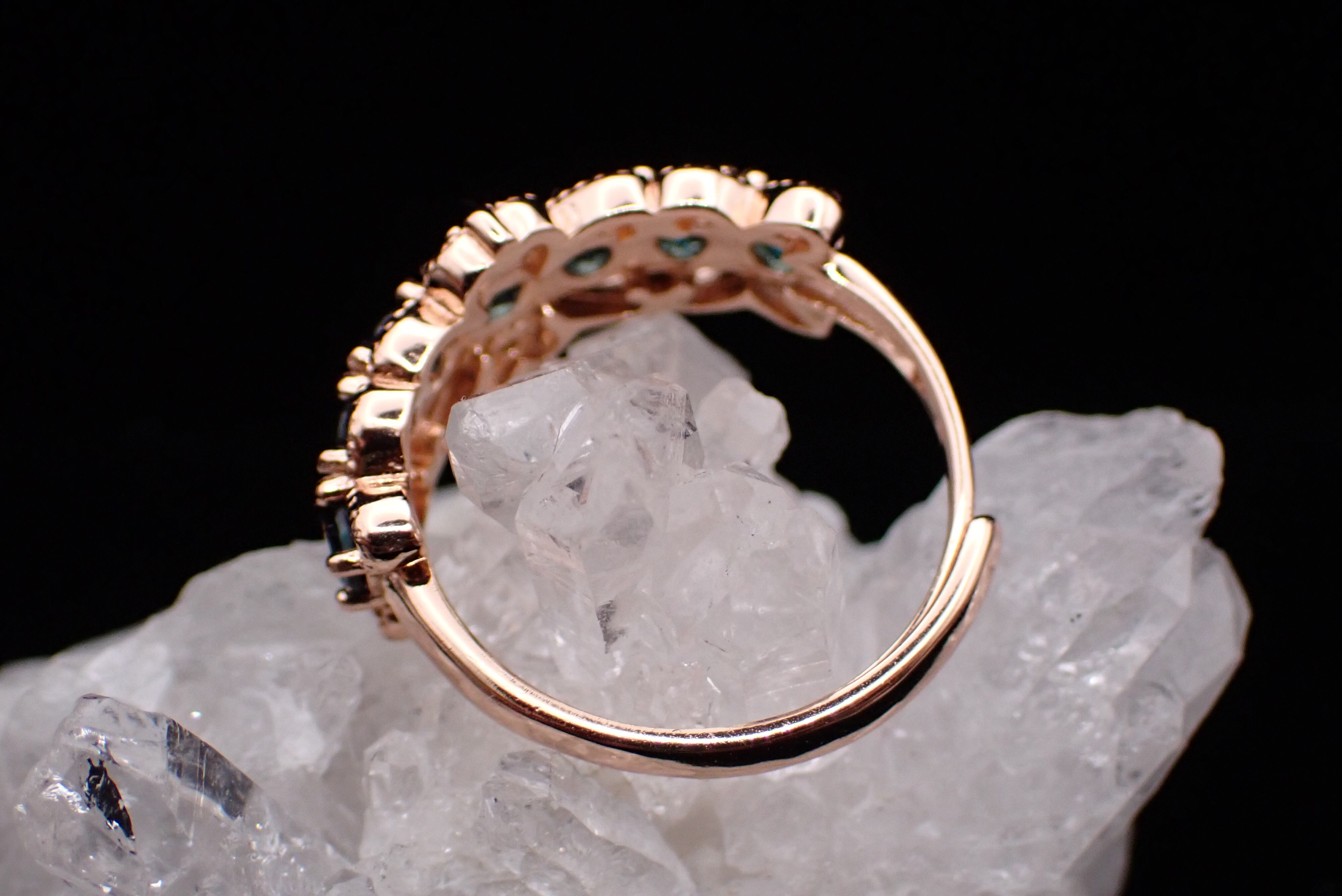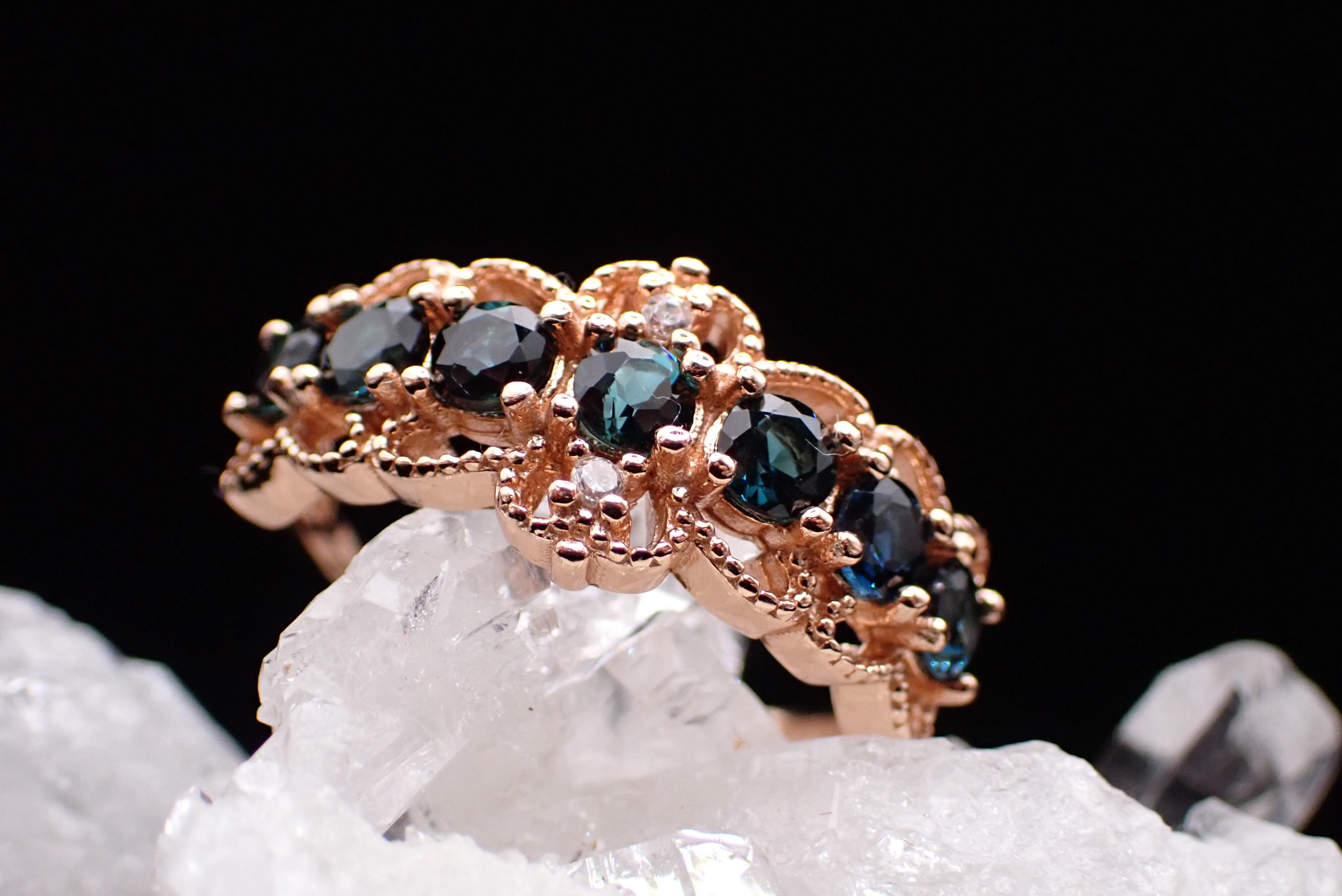 上下にレースがついたようなデザインに、深いグリーントルマリンが並んだゴージャスなリングです。