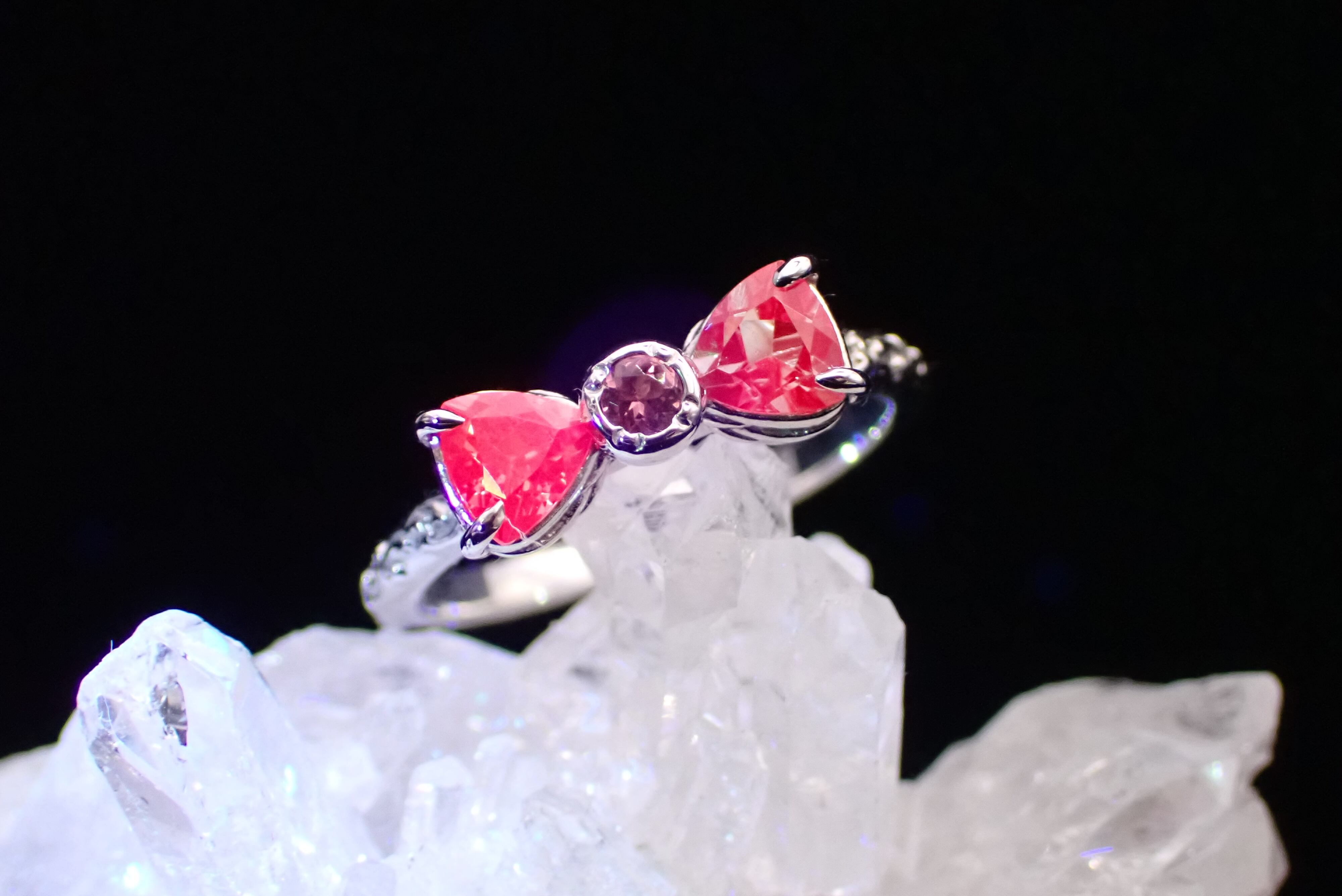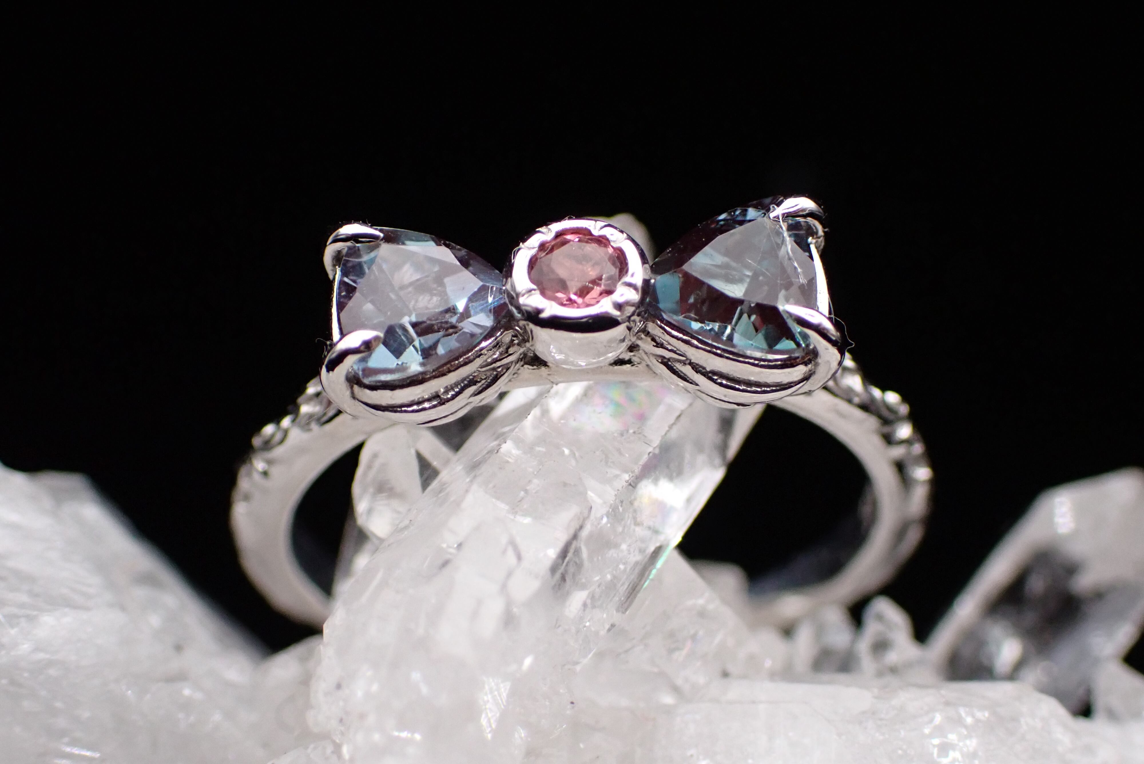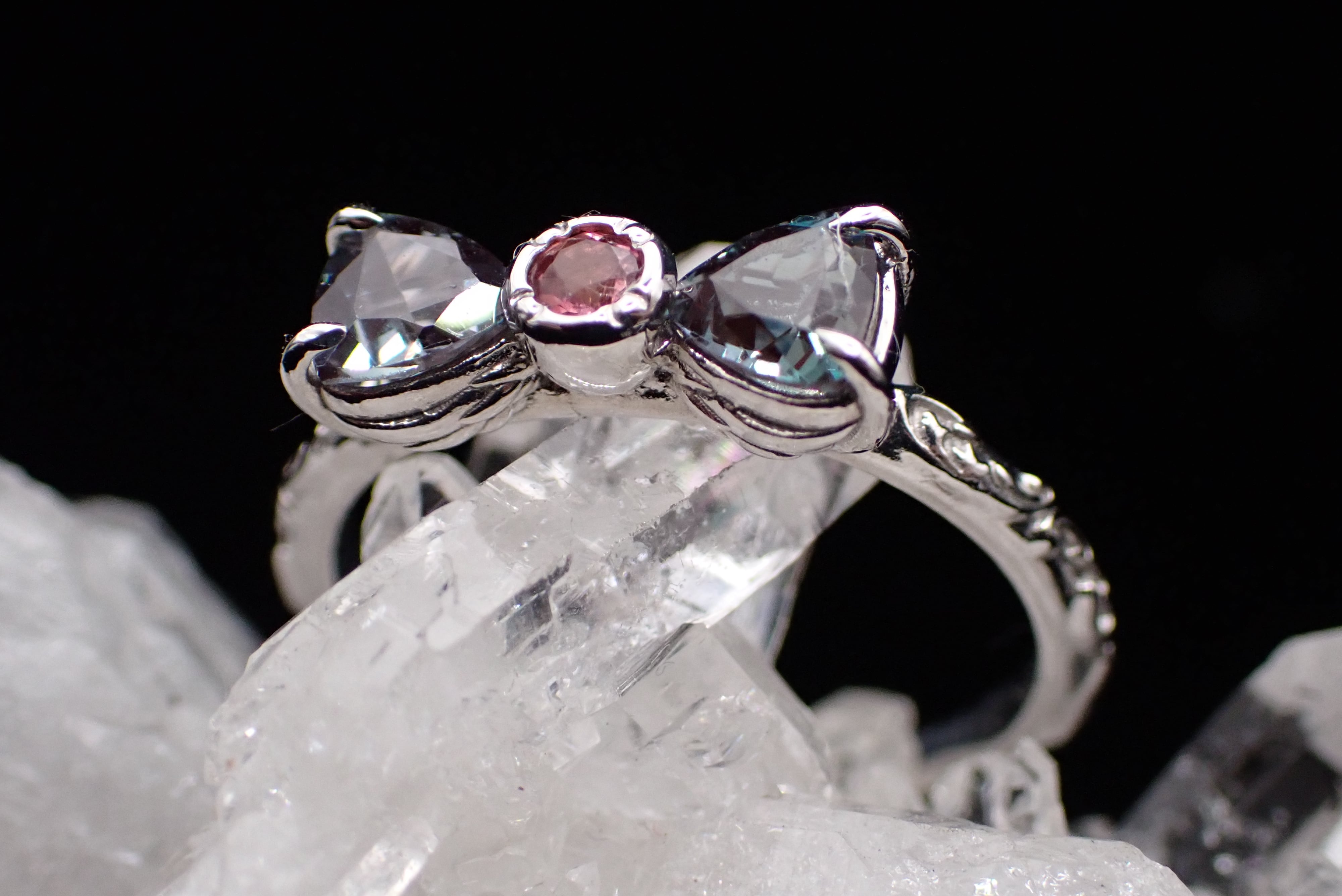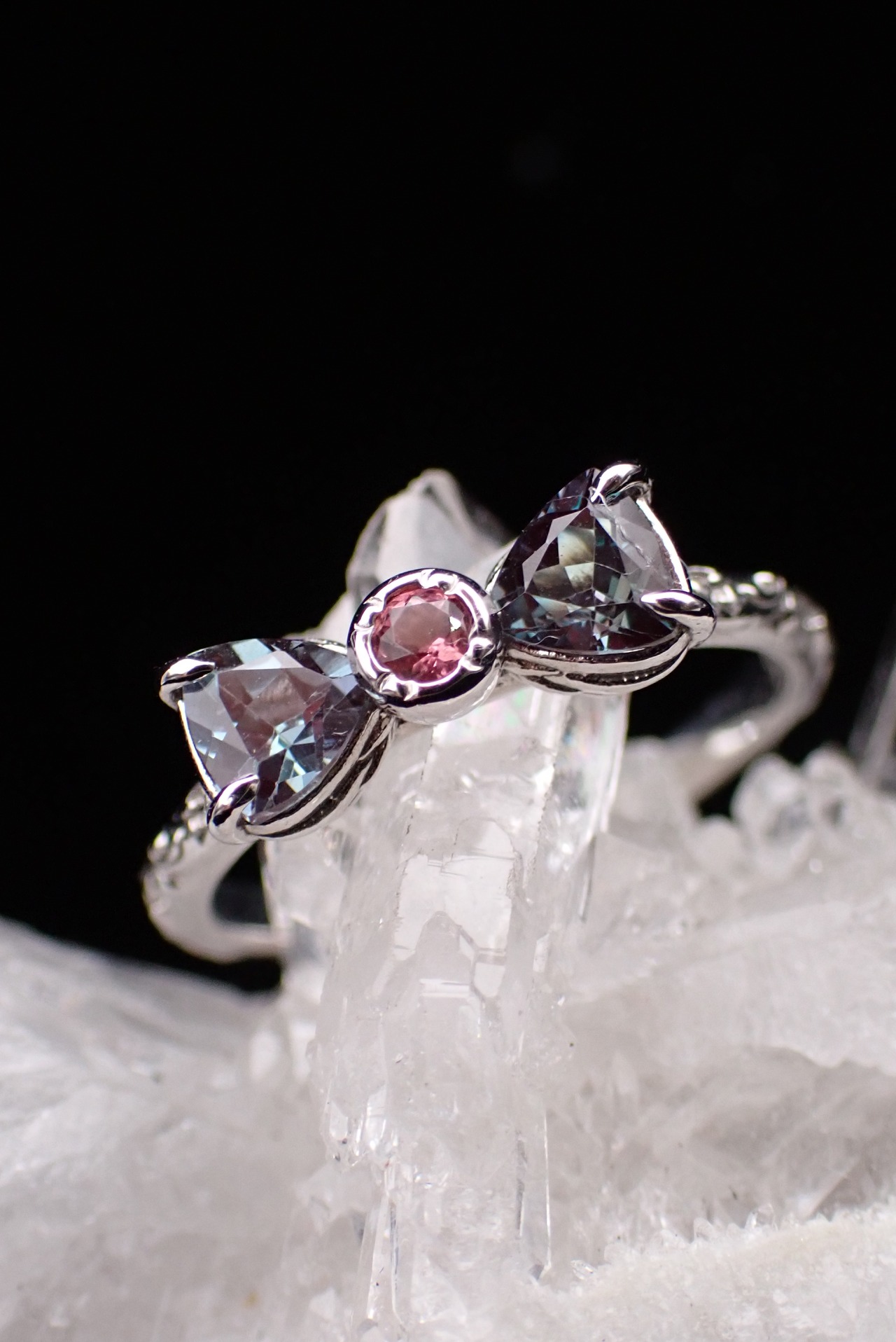 中央は合成アレキサンドライトを引き立てるカットの美しいピンクサファイアです。