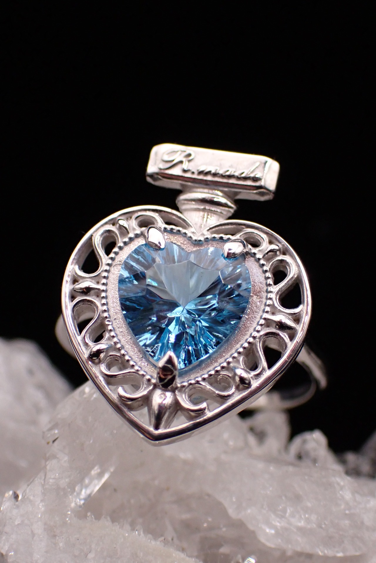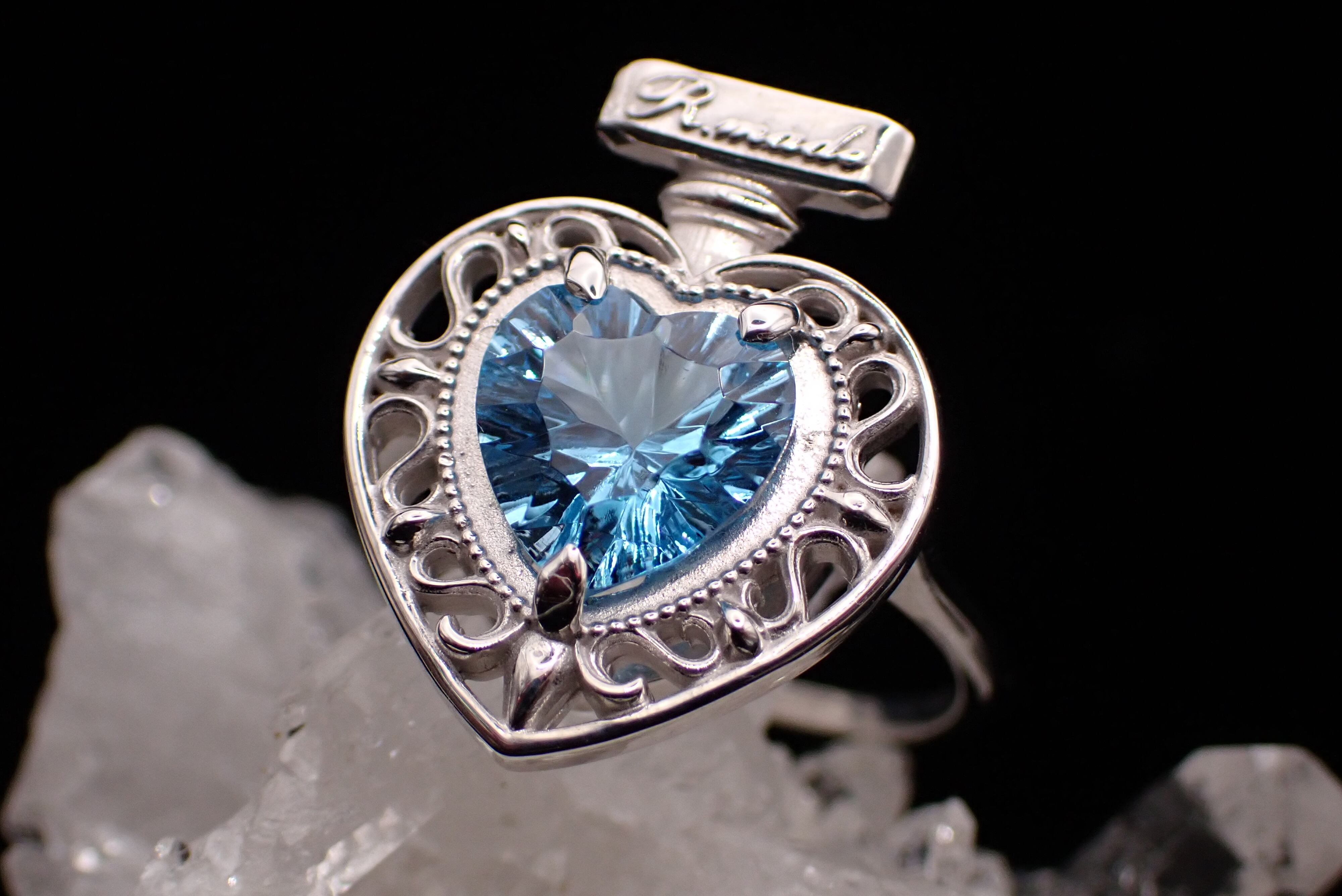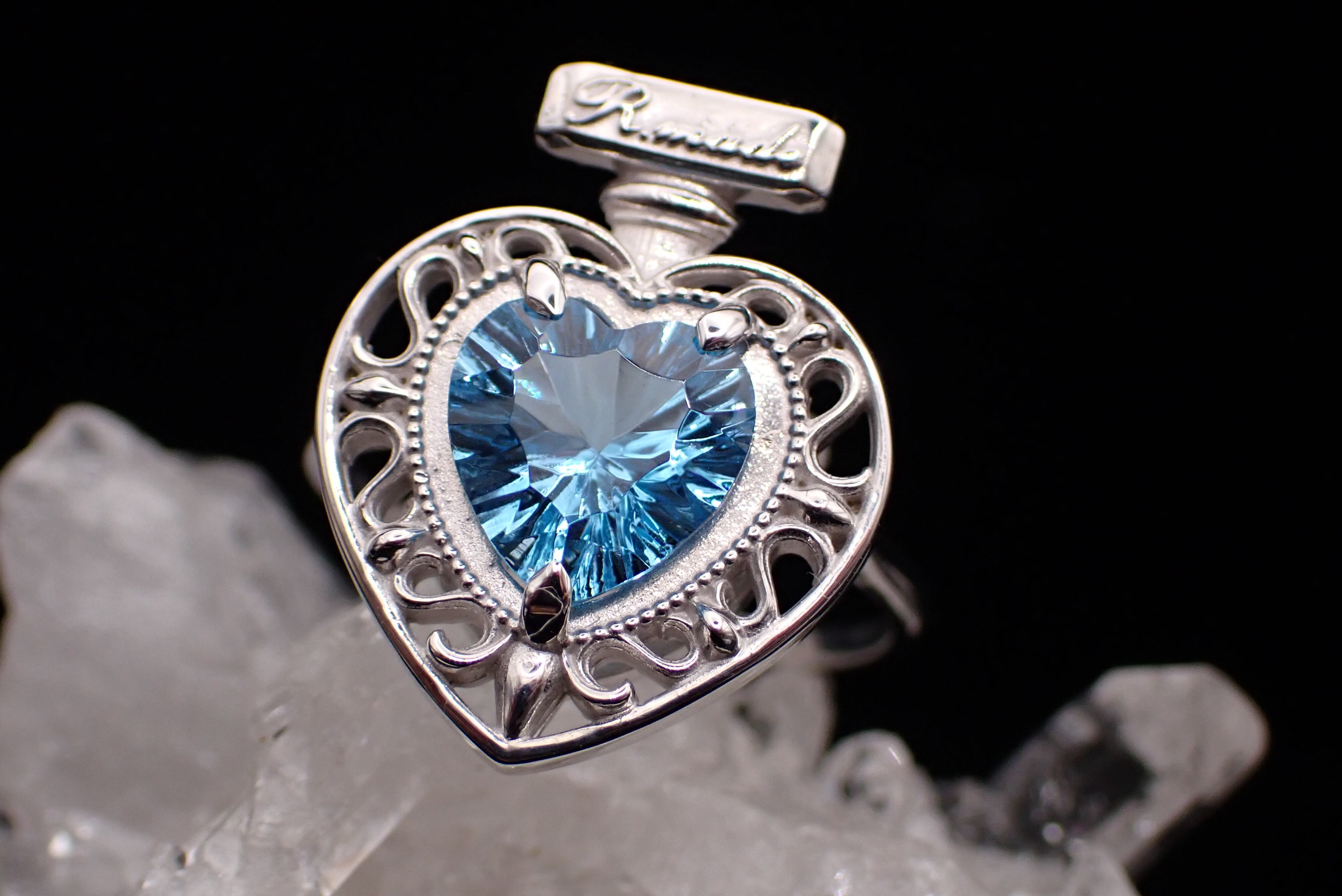 アール・ヌーヴォーシリーズの中でも人気の透かしデザインを活かし、芳しい香りが広がるようなハート型の香水瓶の中へ石を納めました。