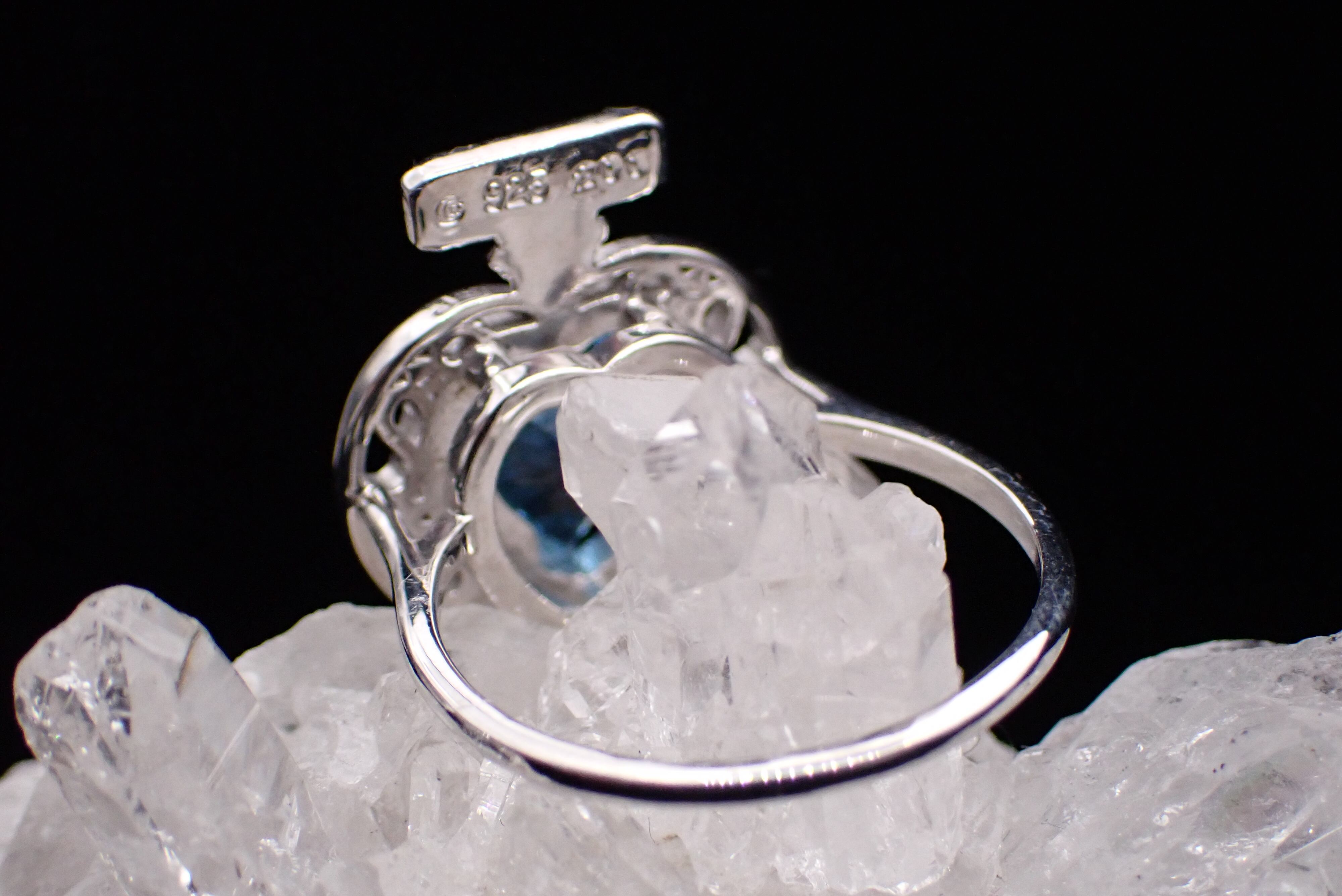 中石のブルートパーズは爽やかなブルーが美しく、写真では映りきらない輝きを蓄えたコンケーブカットとなっております。