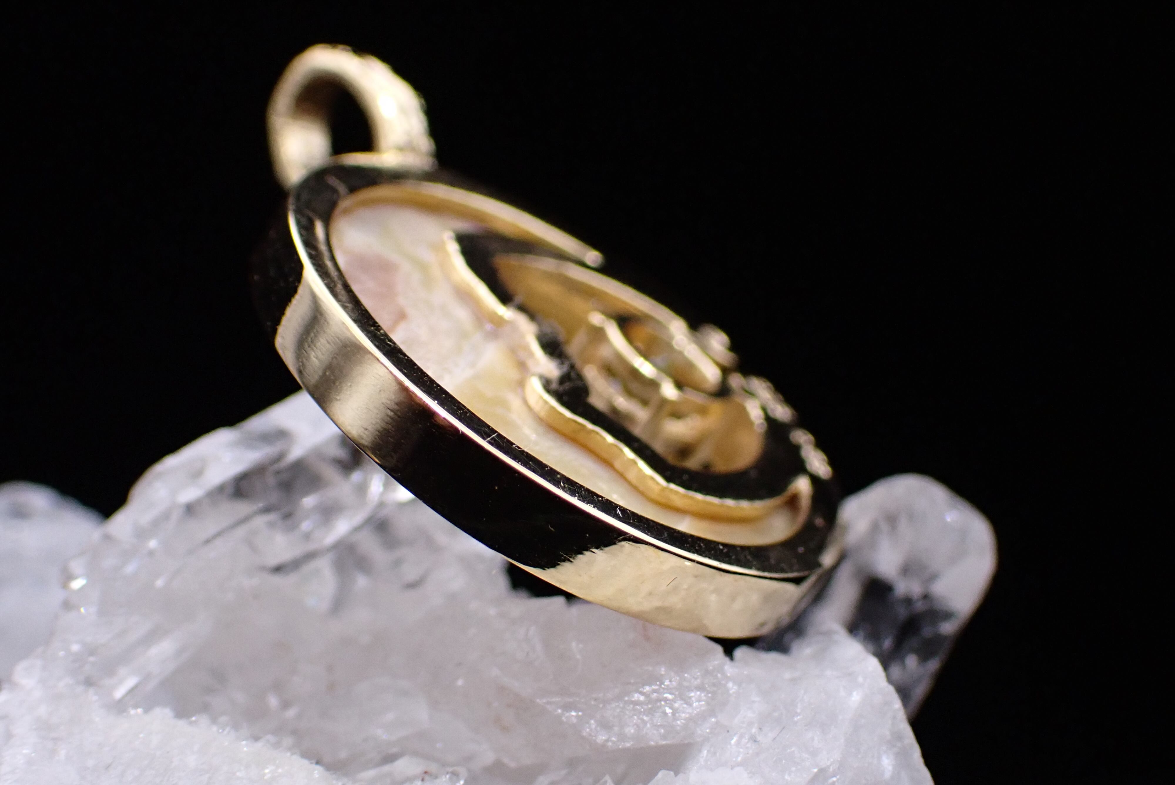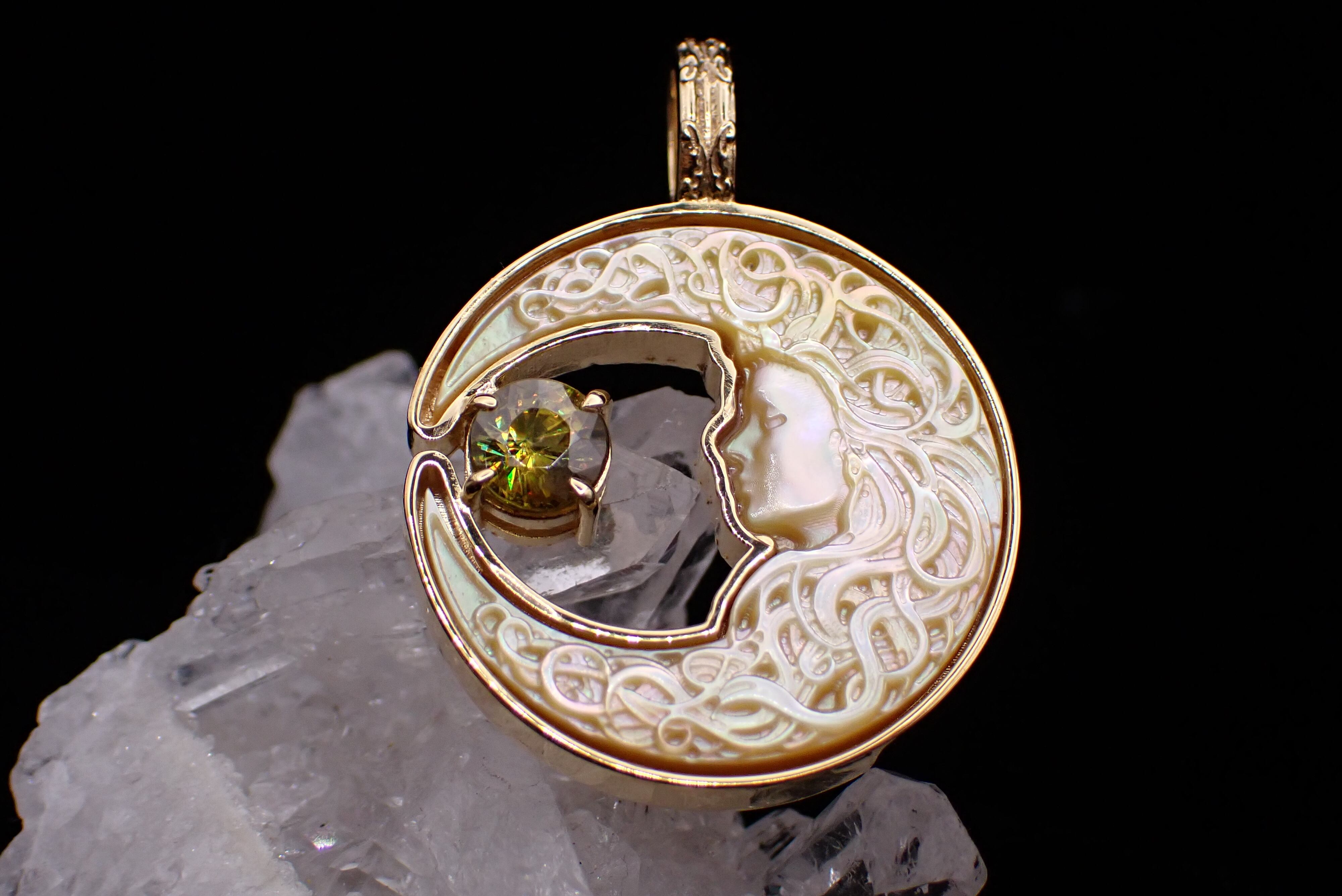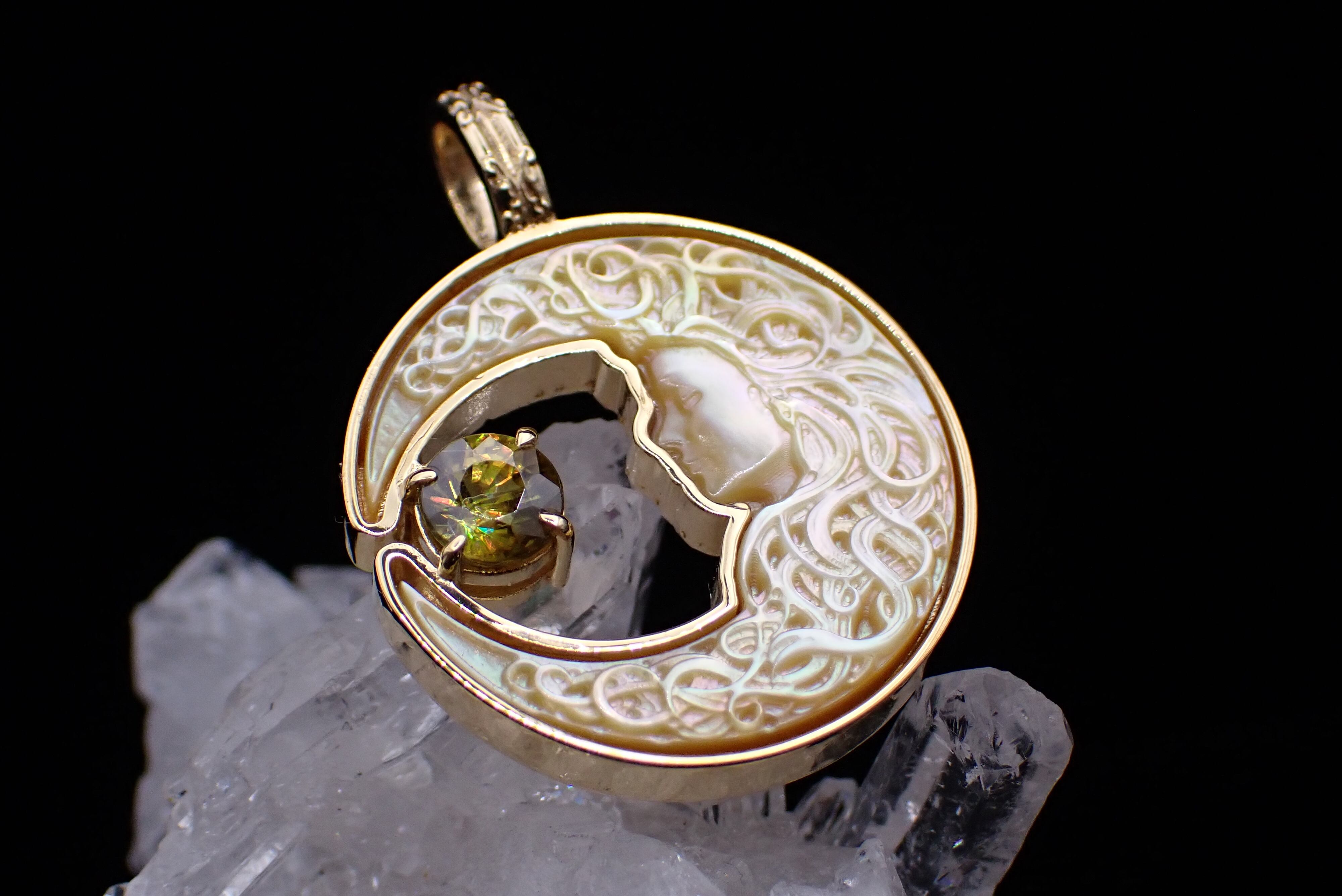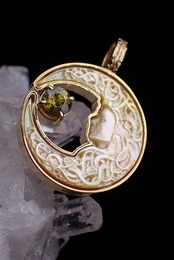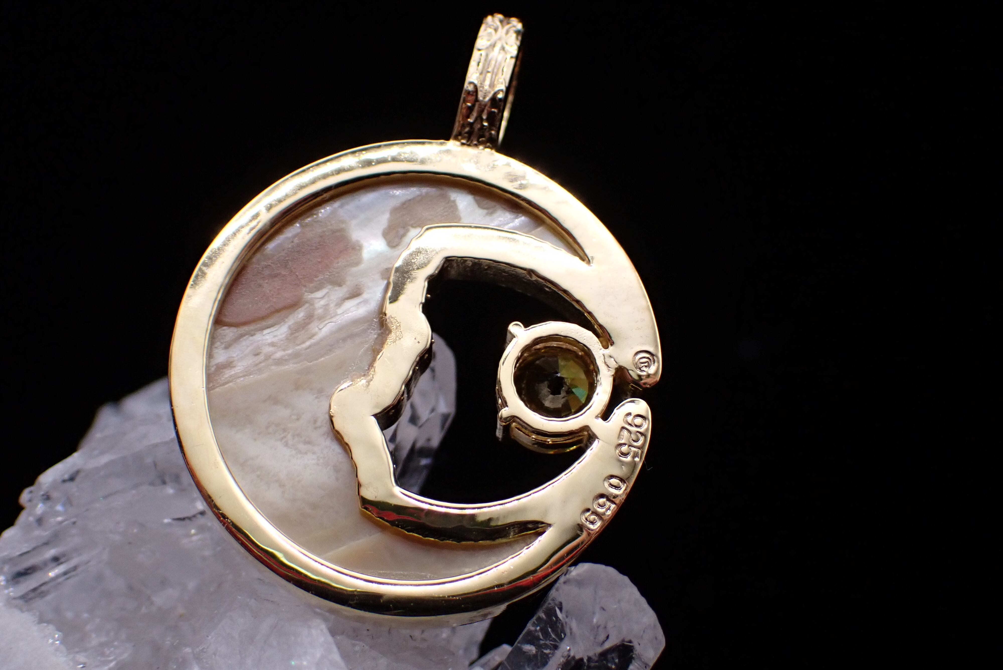 美しく描かれた白蝶貝の月の中に、鮮やかに輝くスフェーンのペンダントです。