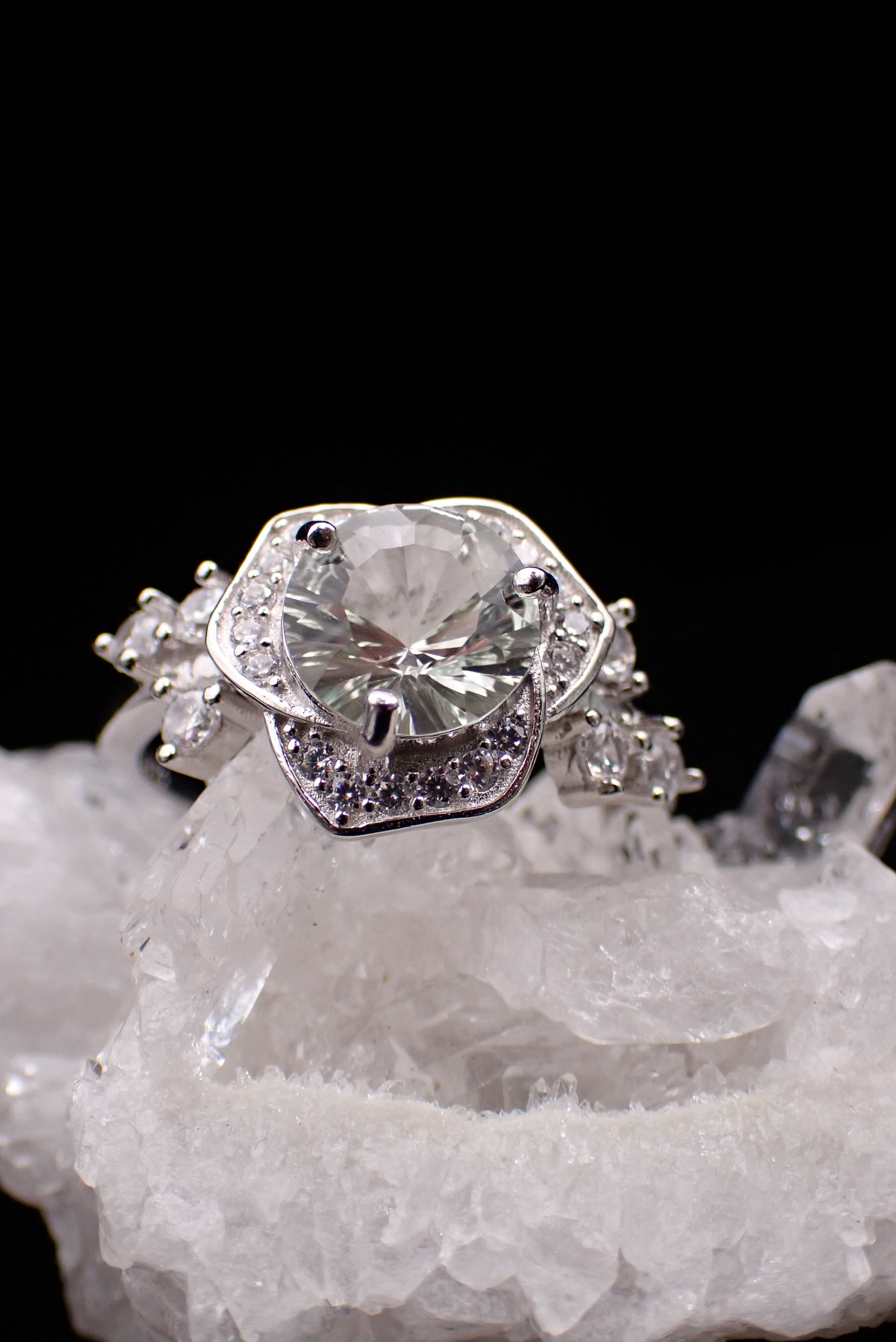 美しいジルコニアの中に8mmの大きなコンケーブカットのグリーンアメジストが豪華に輝きます。