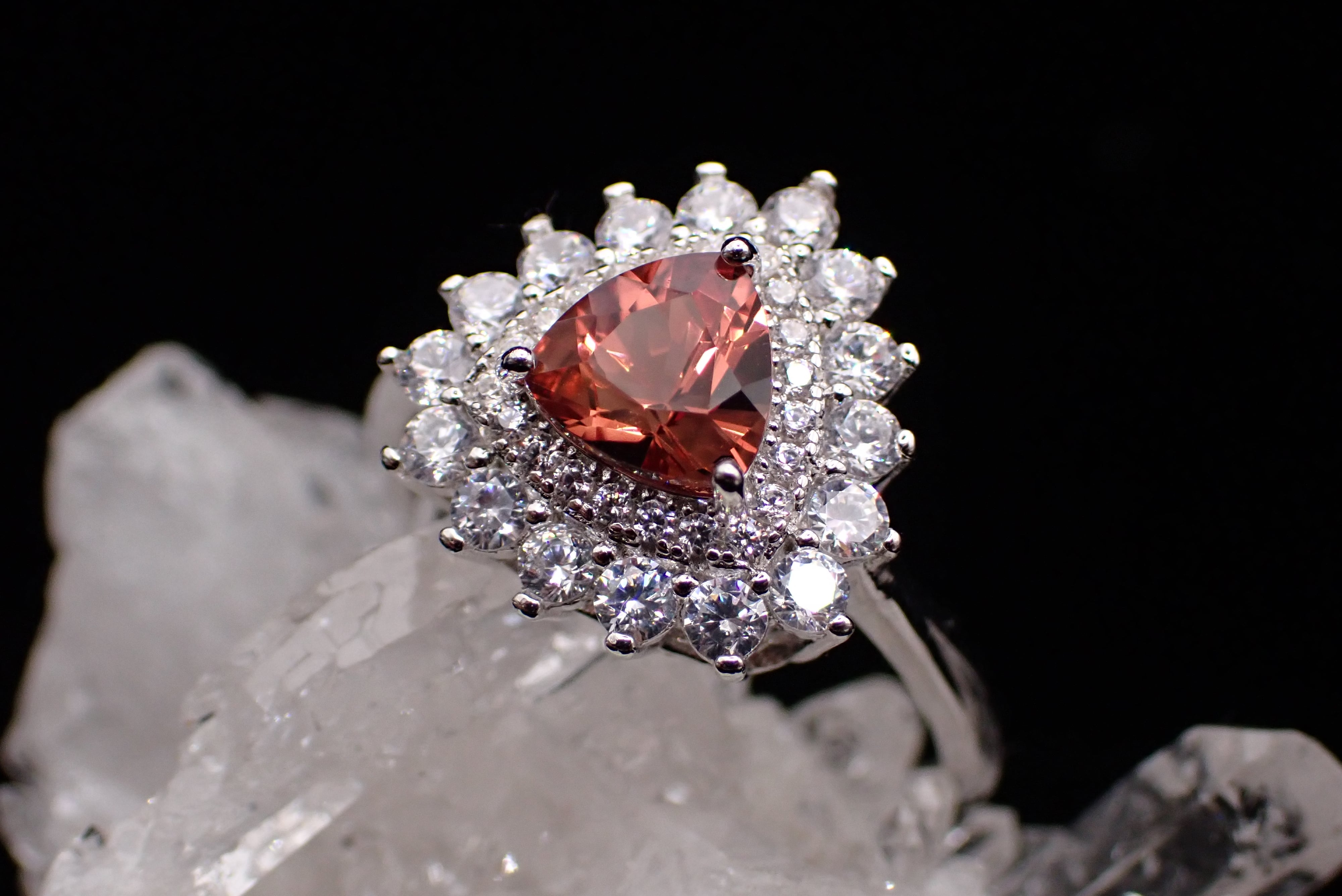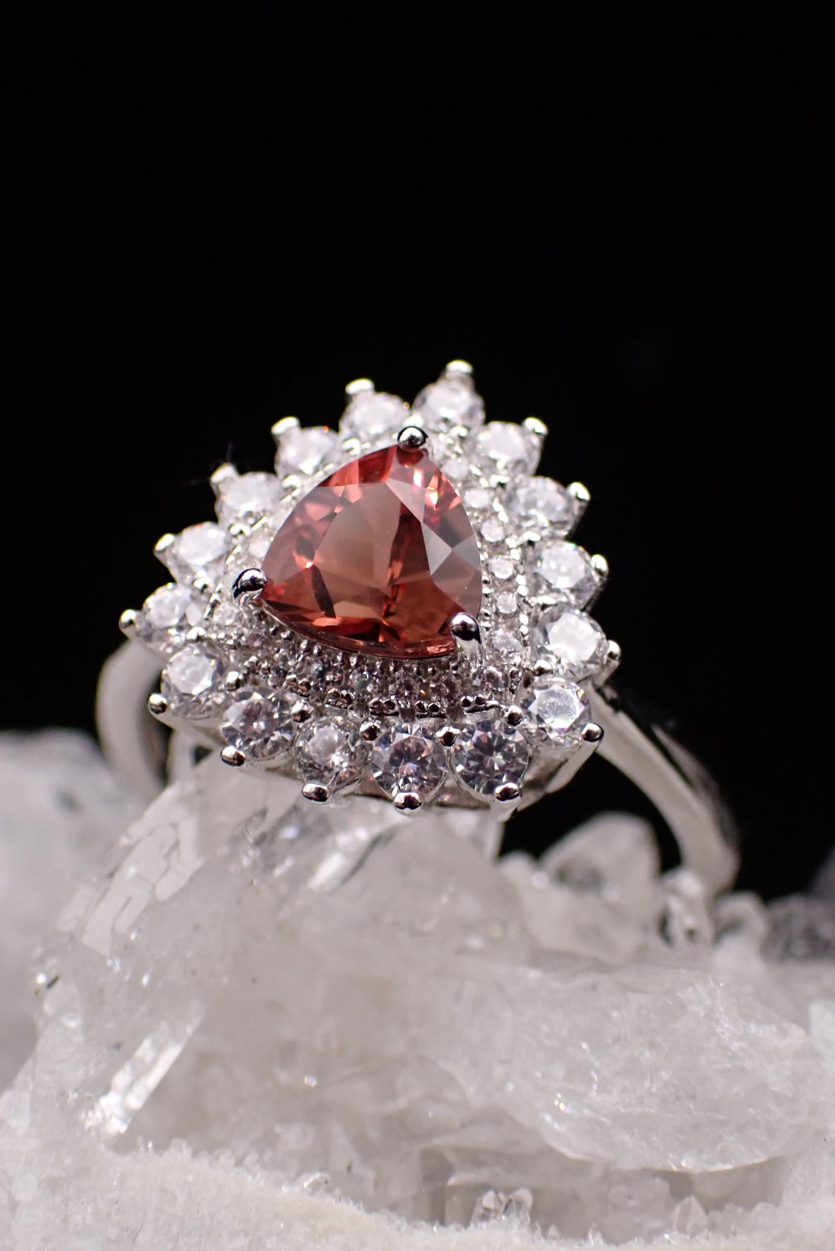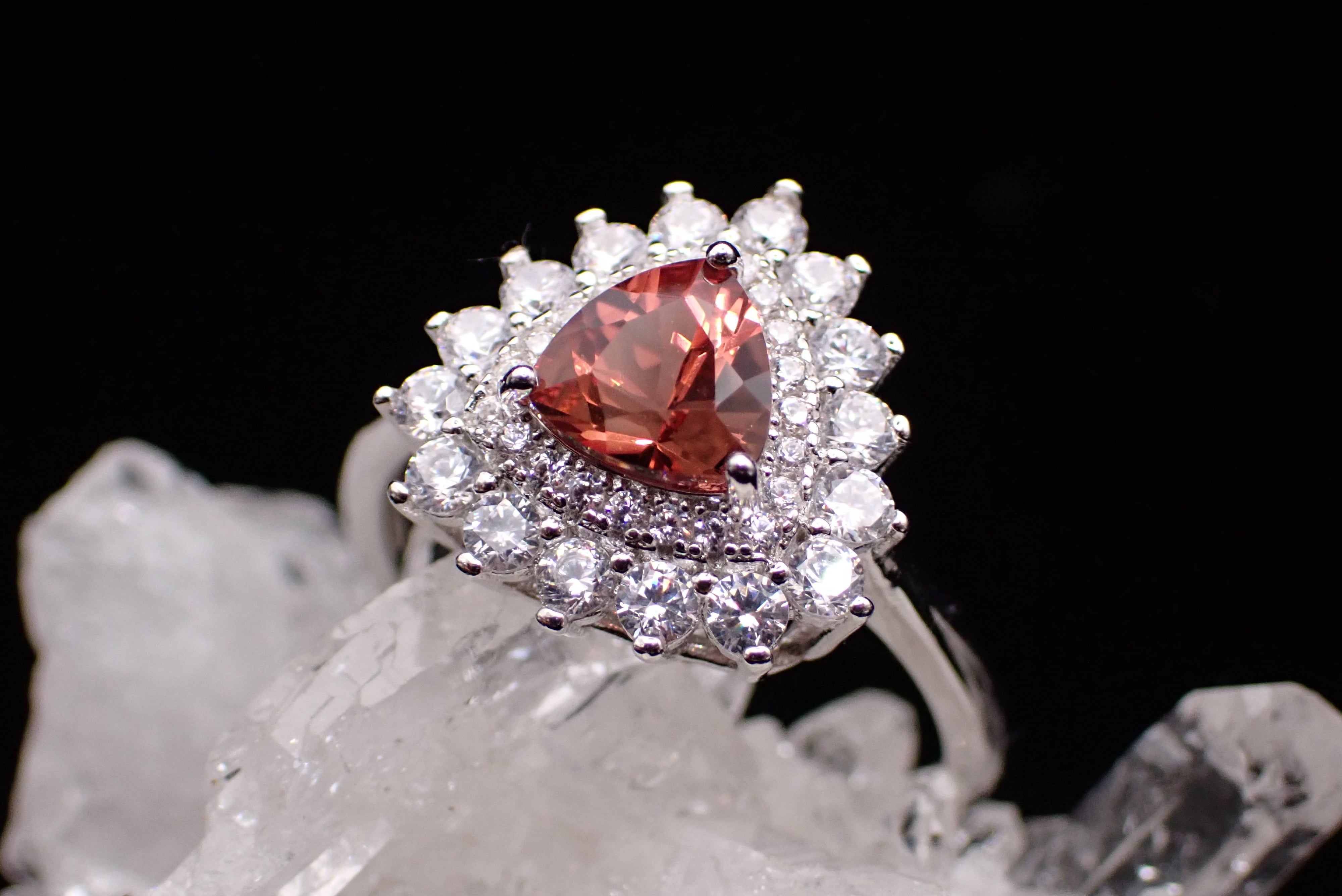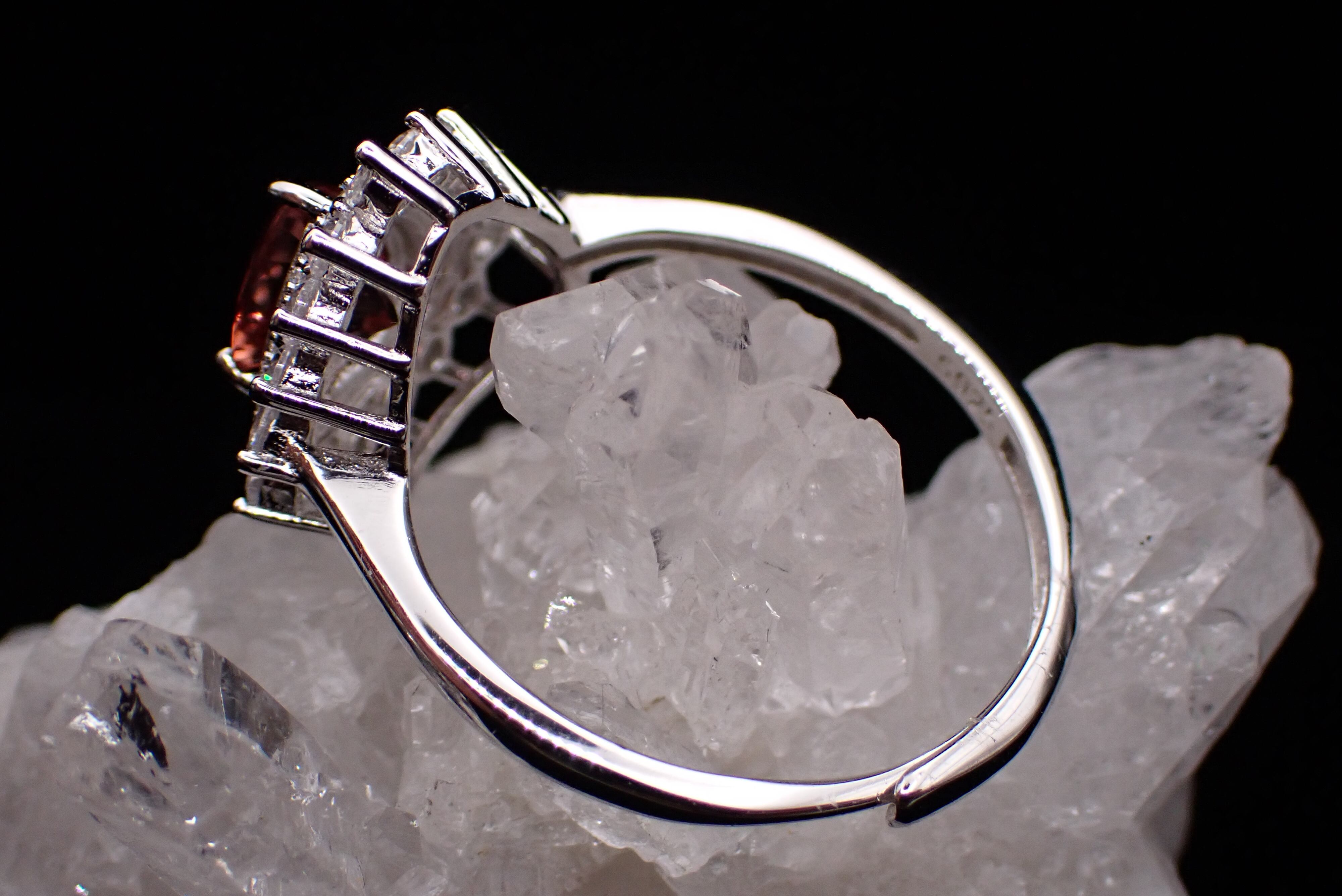 煌びやかに散るジルコニアの中央に佇む、とろみのある赤が美しいアンデシンのリングです。