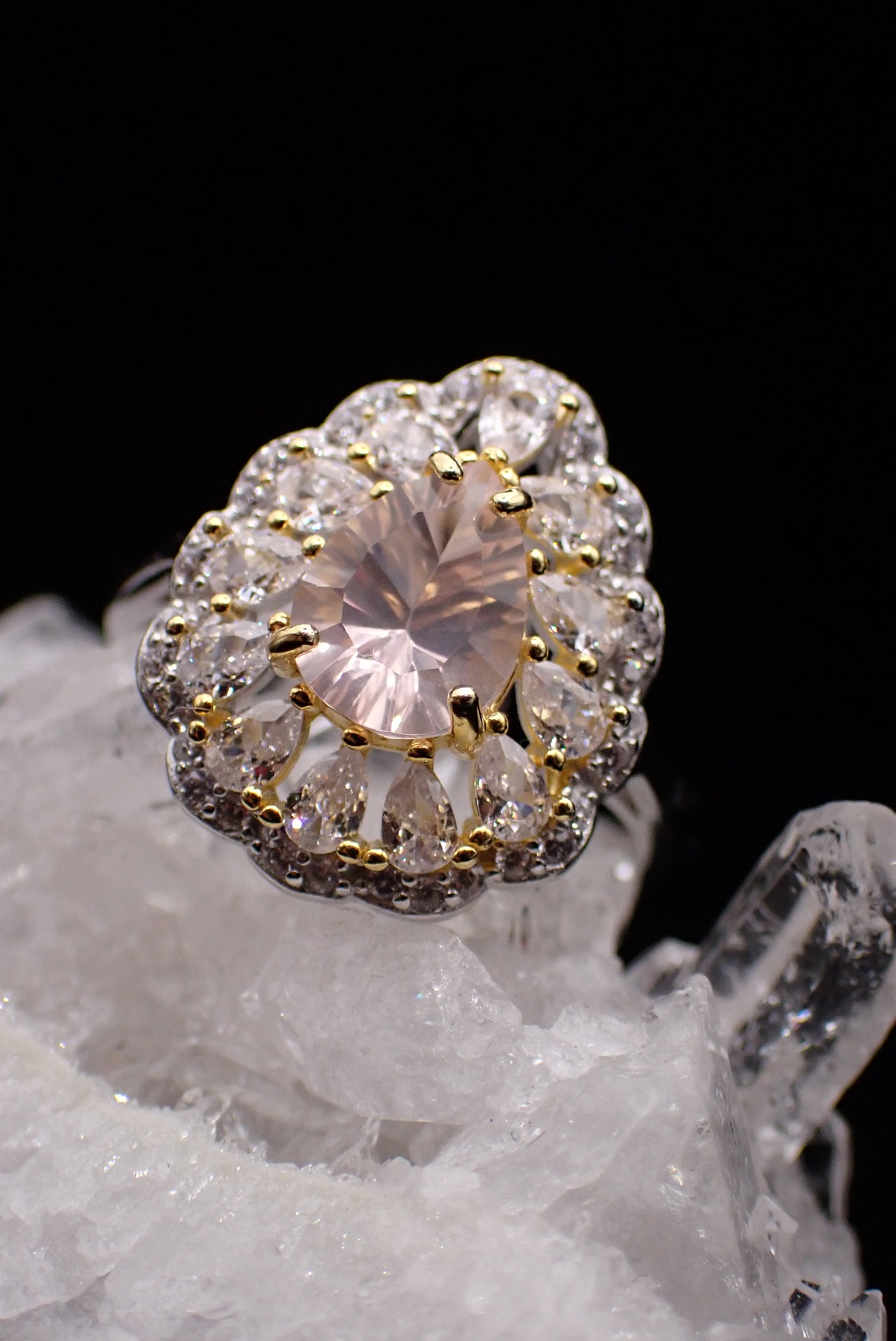 大輪の雫の華の中央に、桜色のコンケーブカットの美しいローズクォーツが咲くリングです。