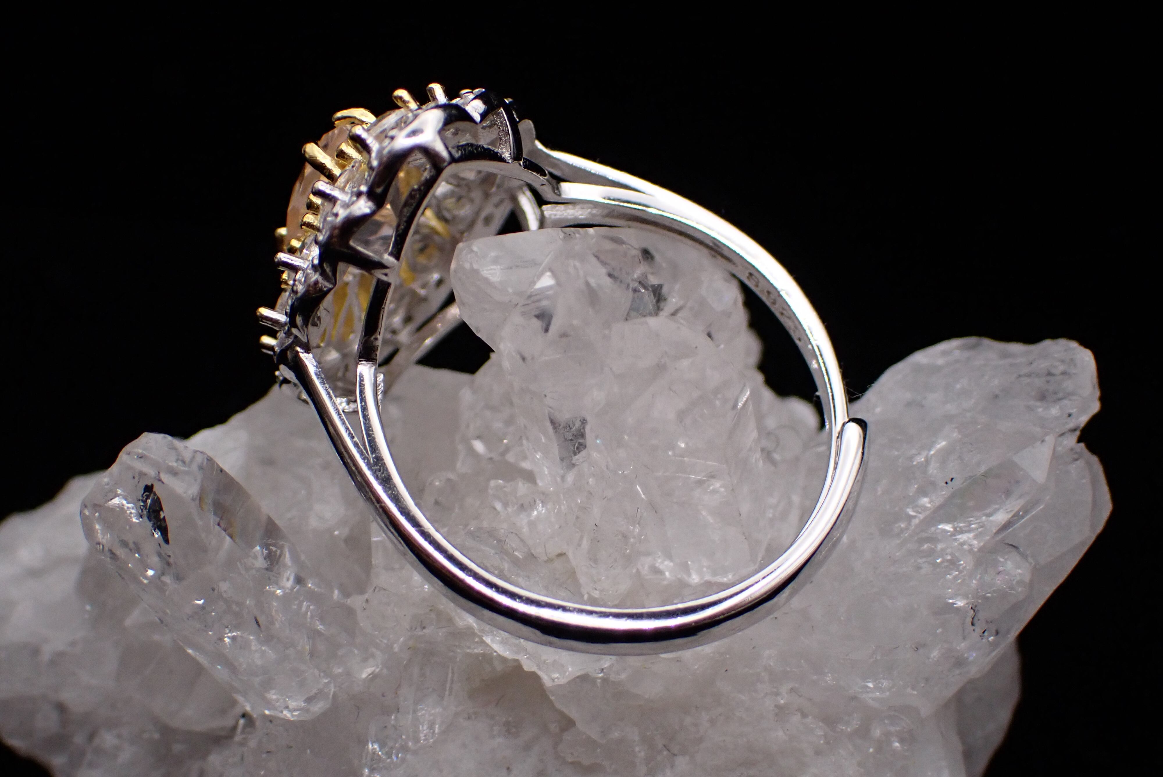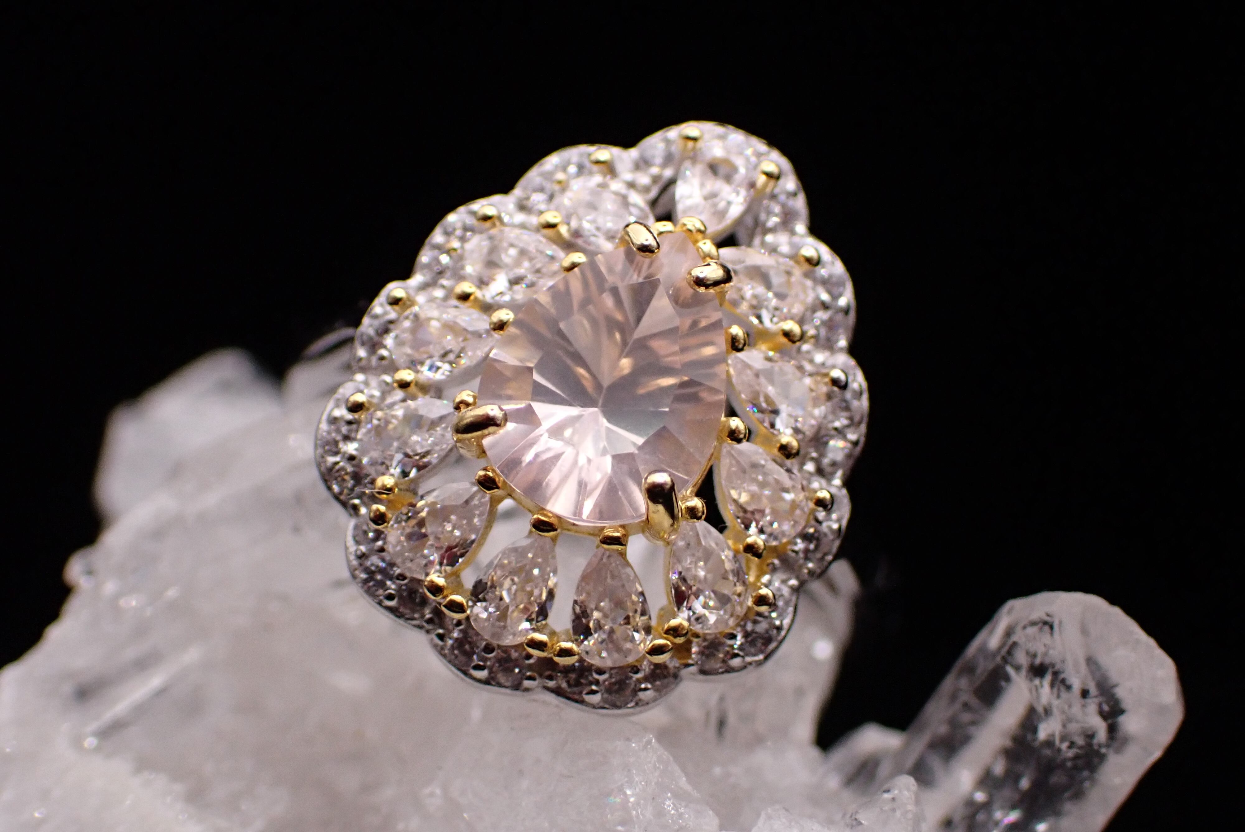 取り巻きのジルコニアたちがキラキラと輝き、ローズクォーツの美しい輝きを引き立てます。