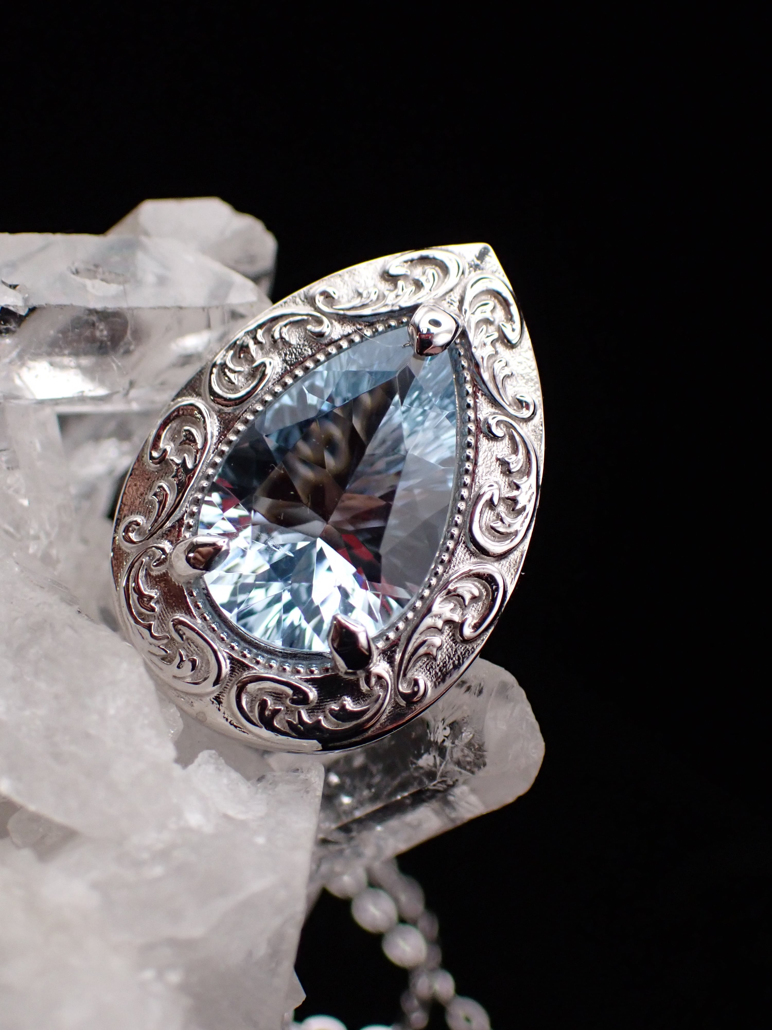 天使の涙をそのまま宝石にしたような美しいアクアマリンを、絵画のように額縁の中へ納めました。