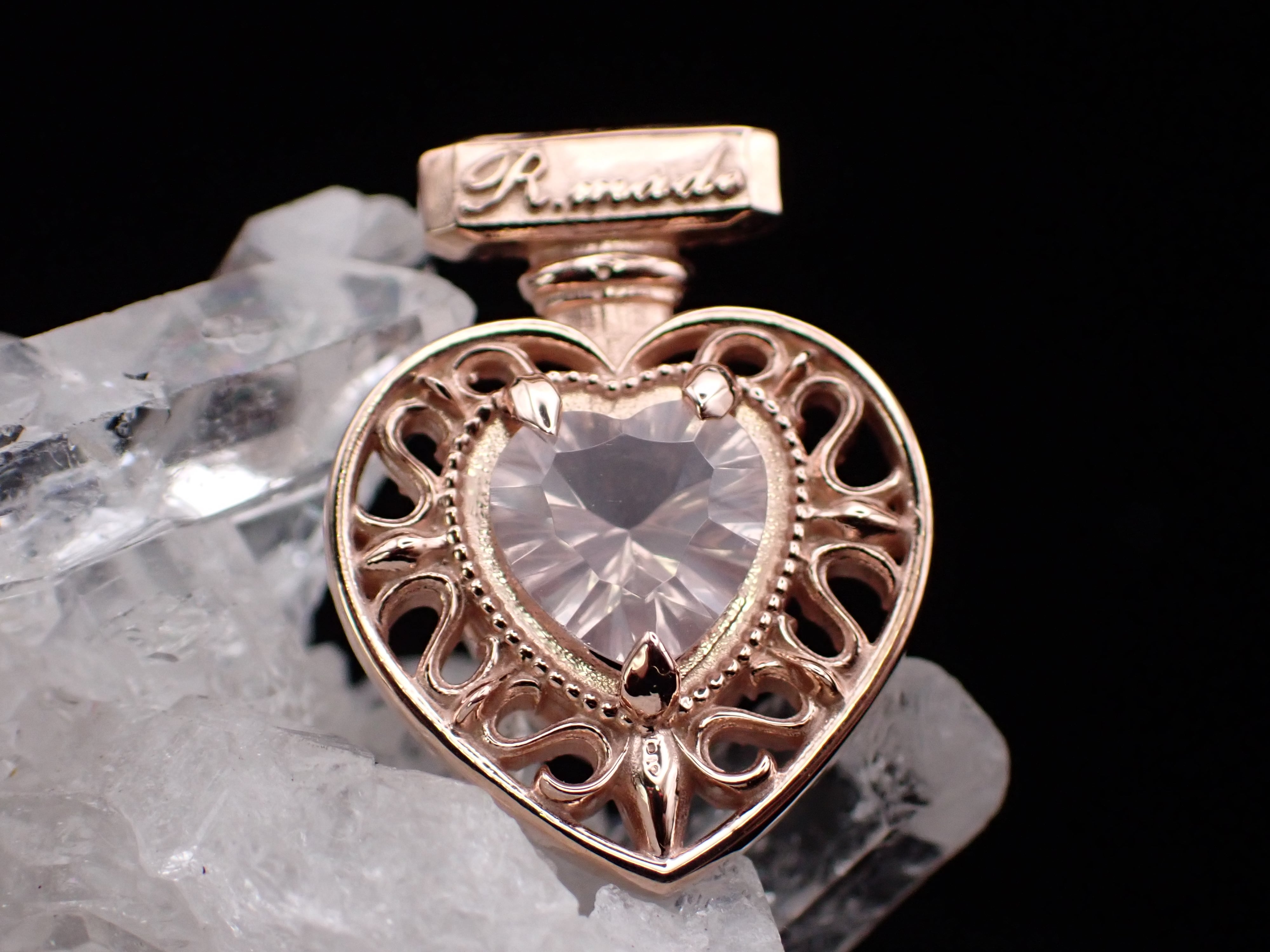 アール・ヌーヴォーシリーズの中でも人気の透かしデザインを活かし、芳しい香りが広がるようなハート型の香水瓶の中へ石を納めました。