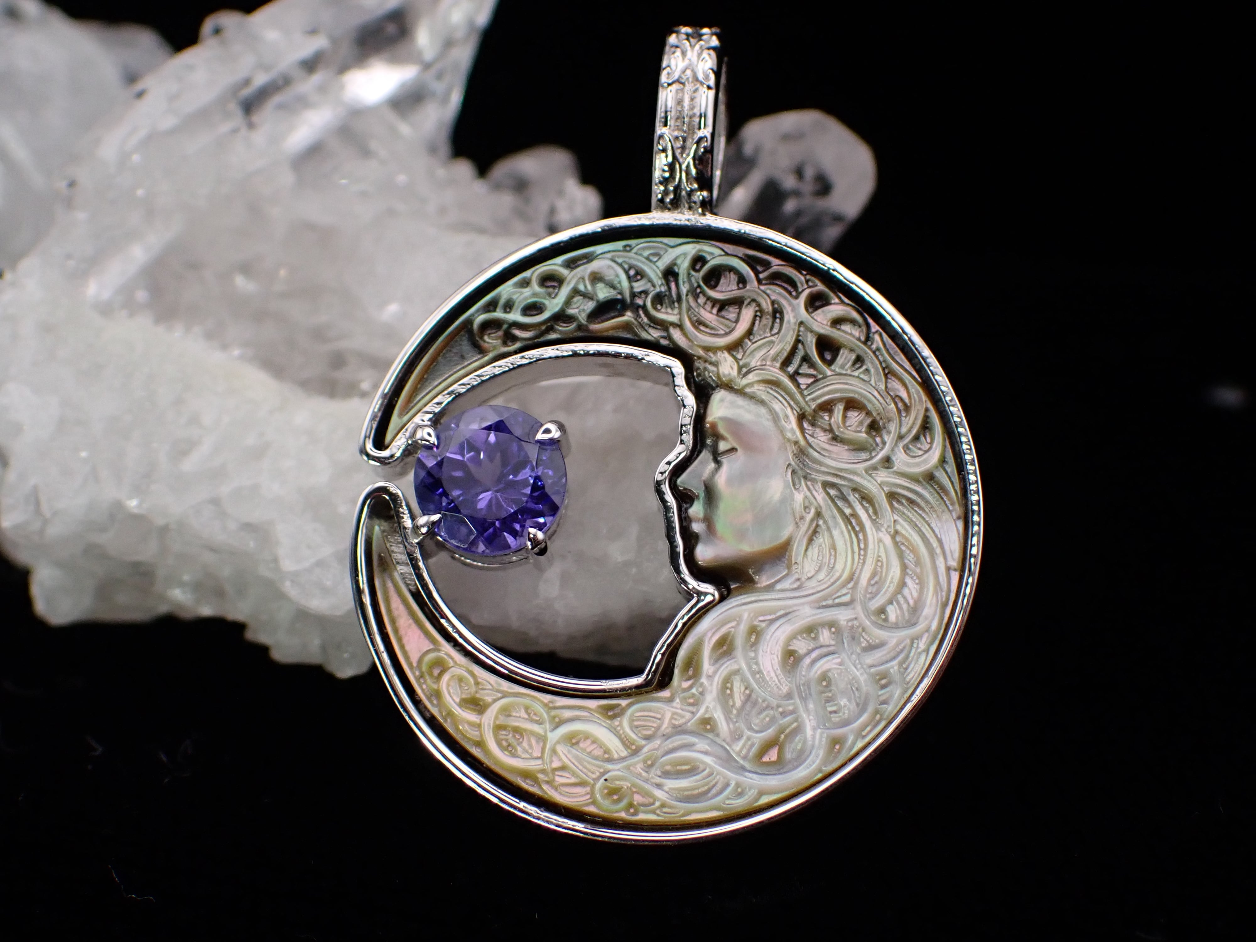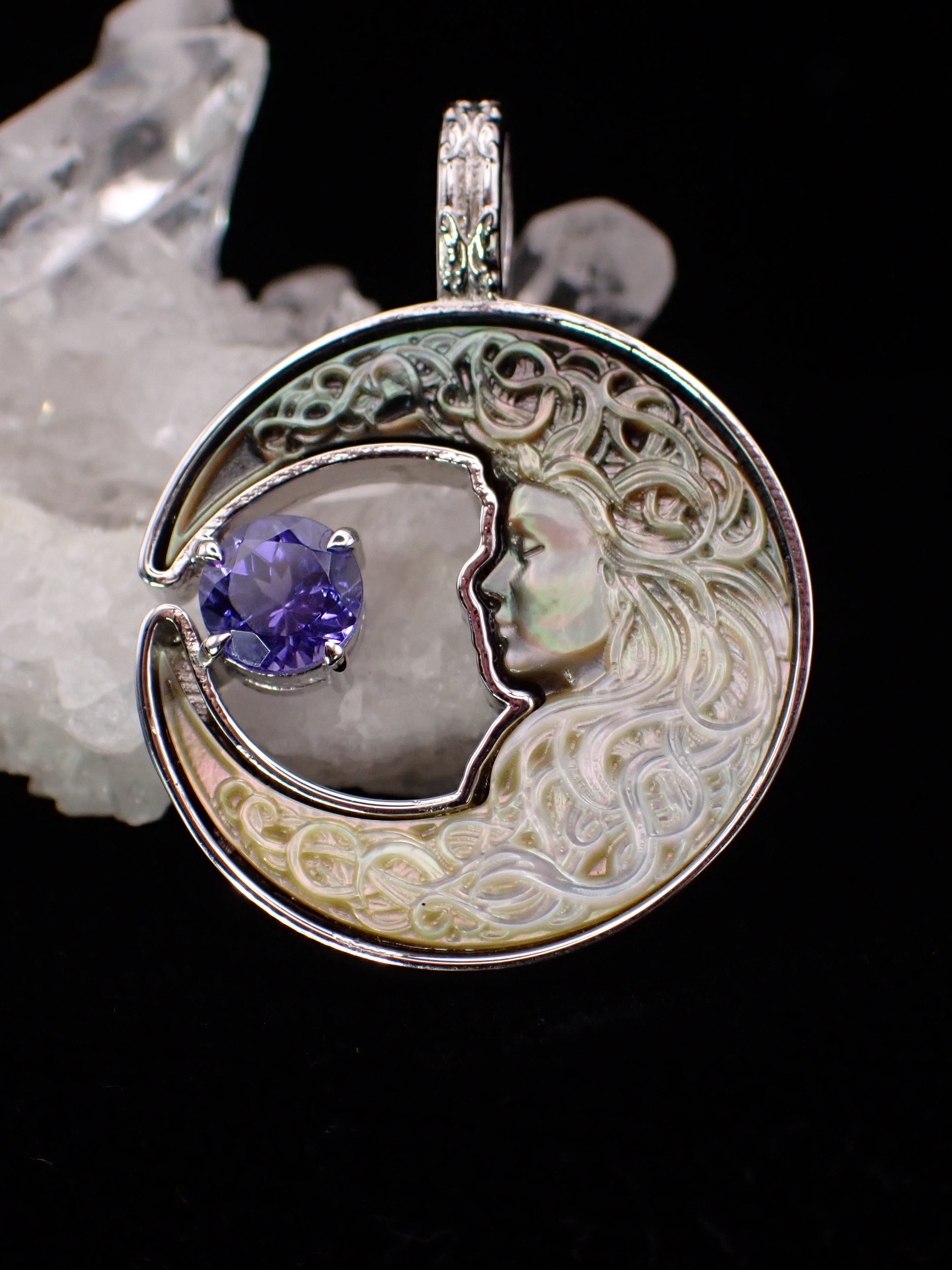 美しく描かれた白蝶貝の月の中に、深く輝くタンザナイトのペンダントです。
