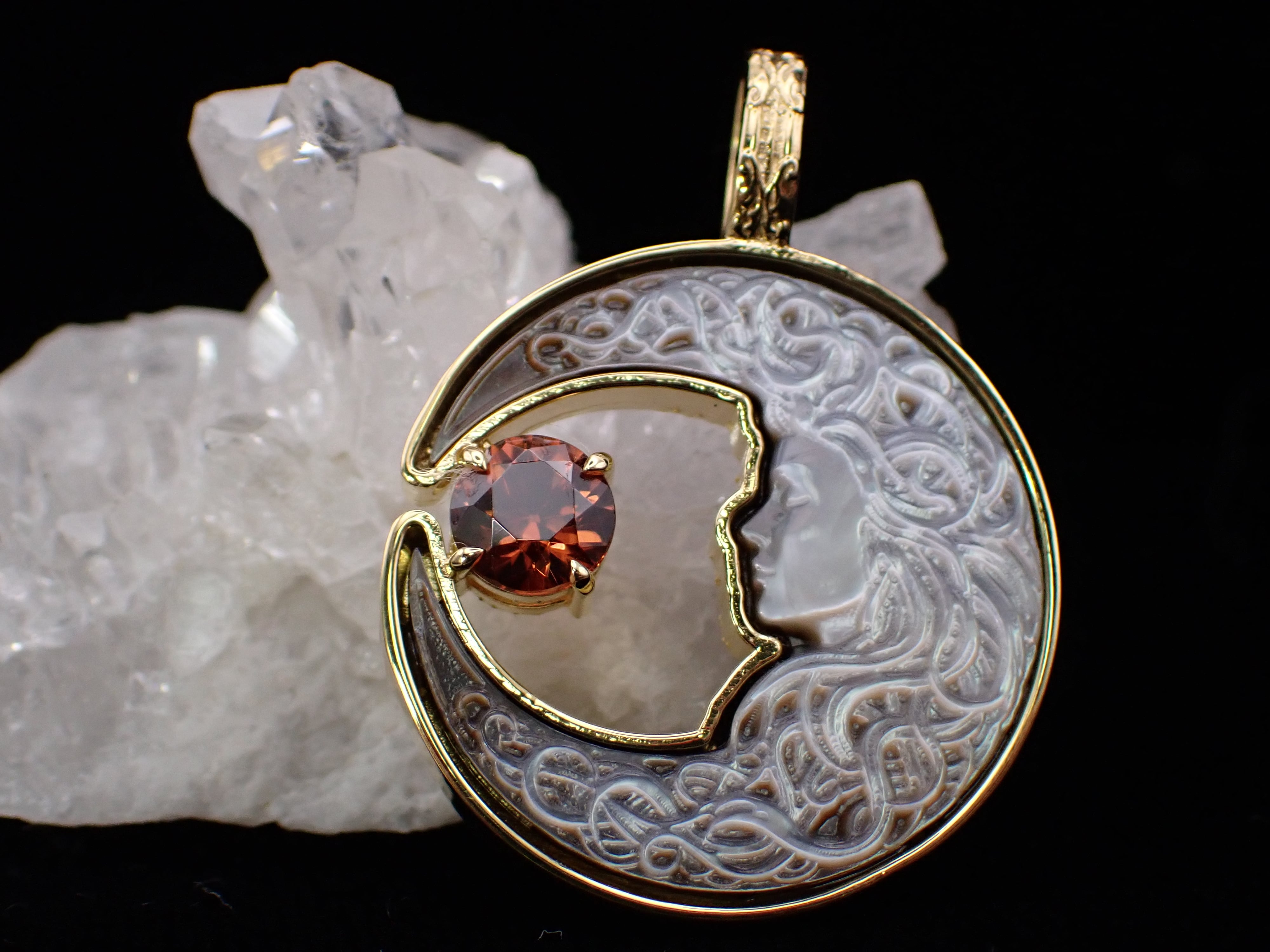 美しく描かれた白蝶貝の月の中に、深く輝くオレンジジルコンのペンダントです。