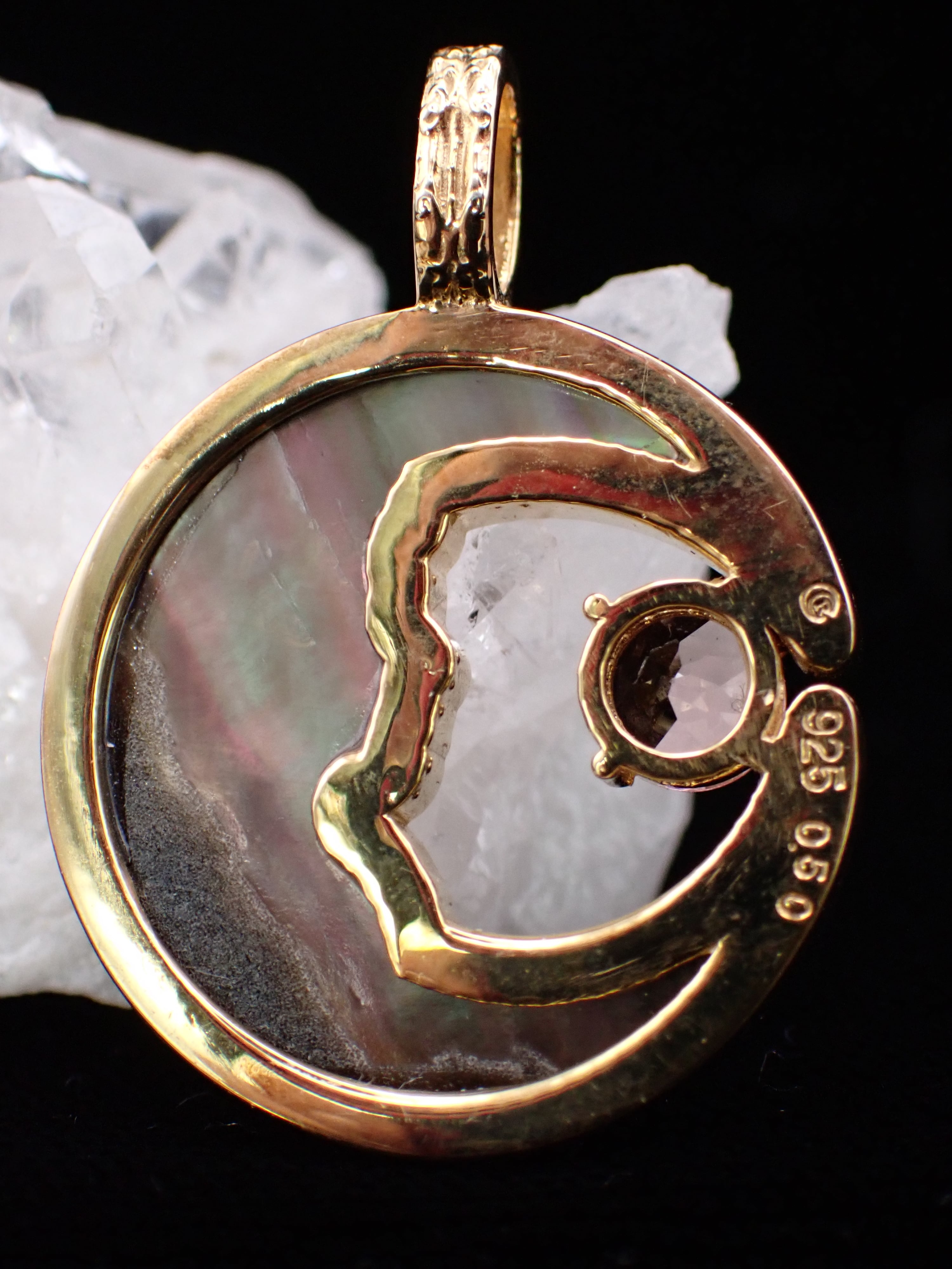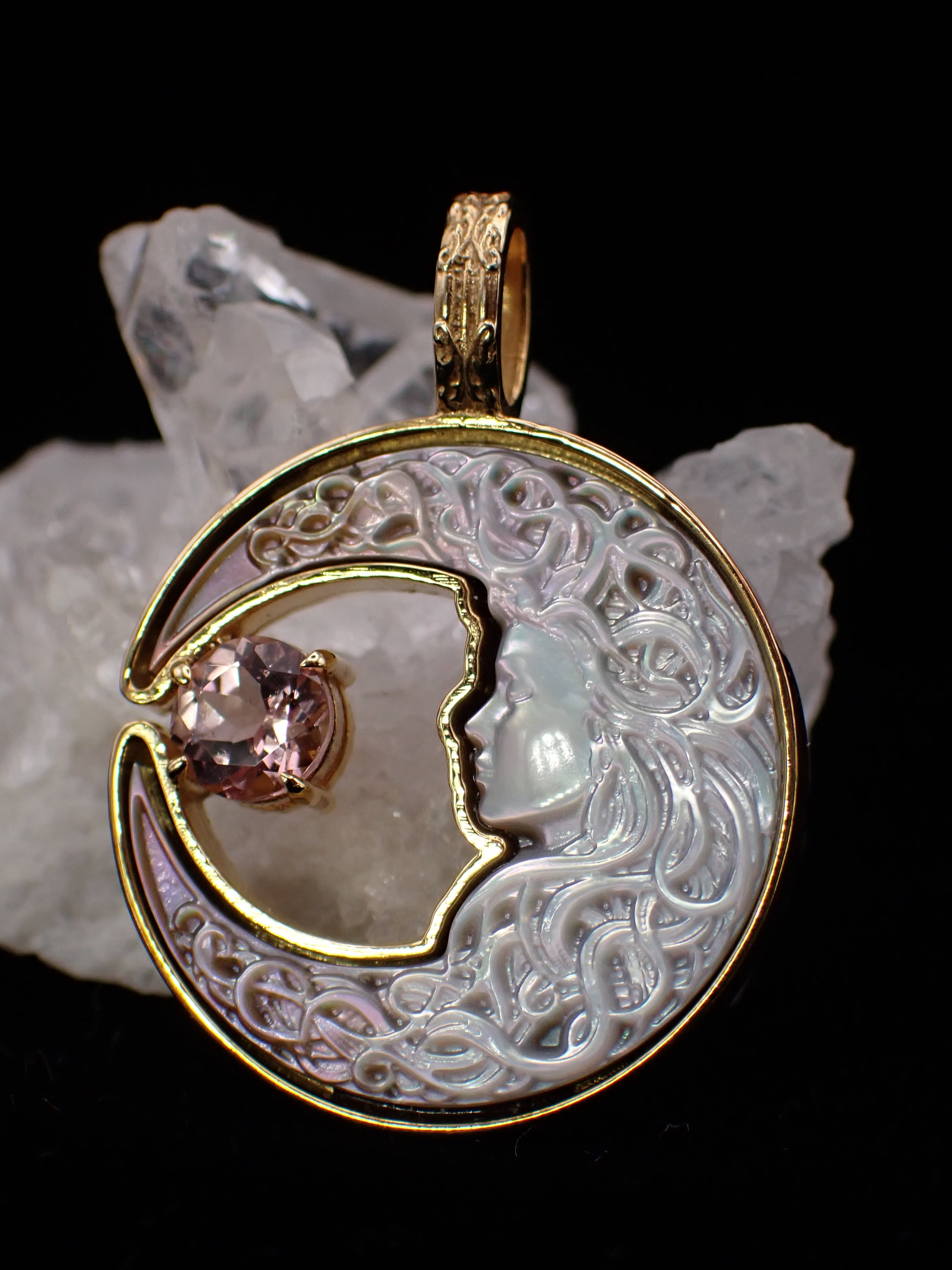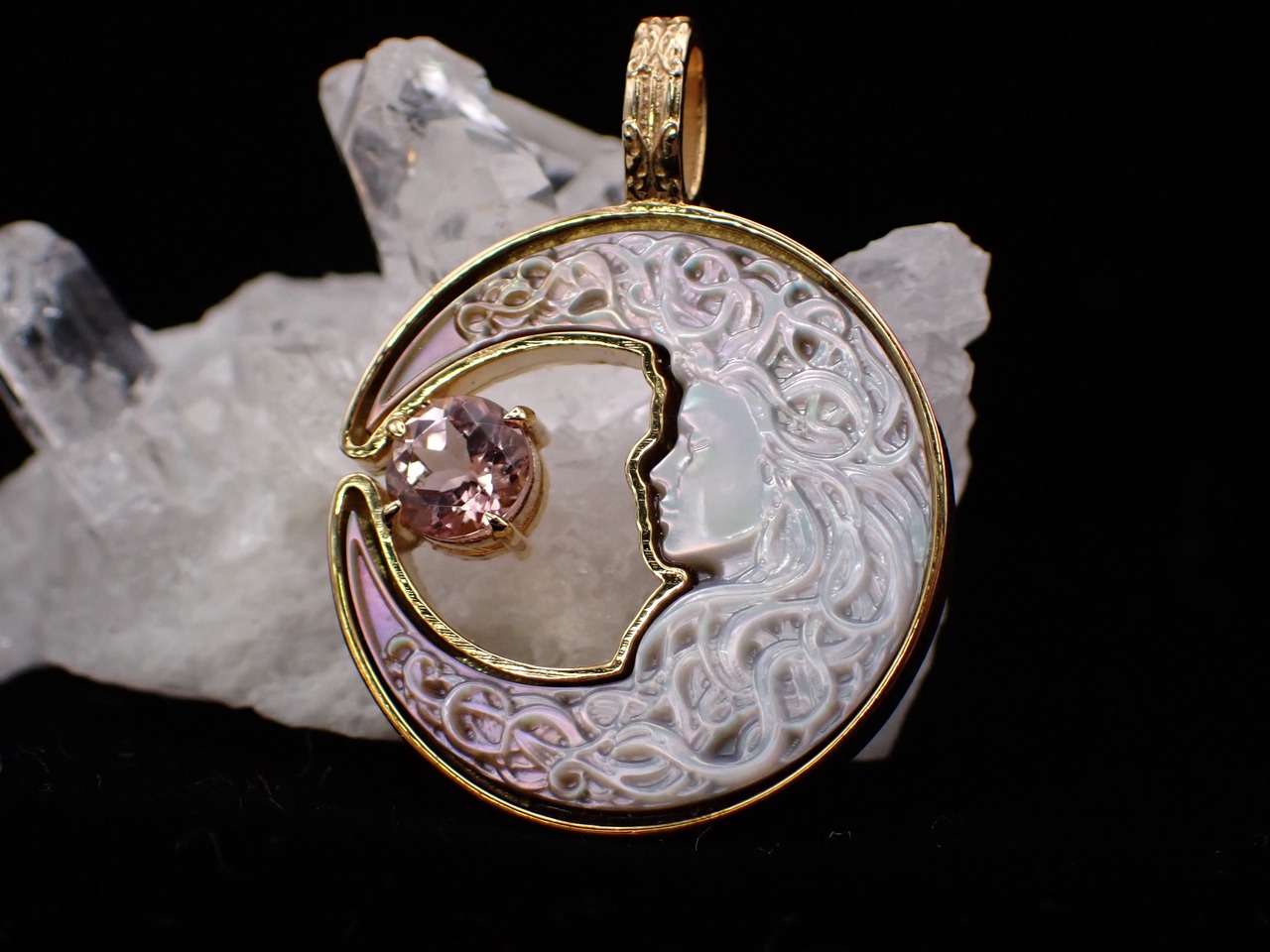 美しく描かれた白蝶貝の月の中に、優しく輝くピンクトルマリンのペンダントです。