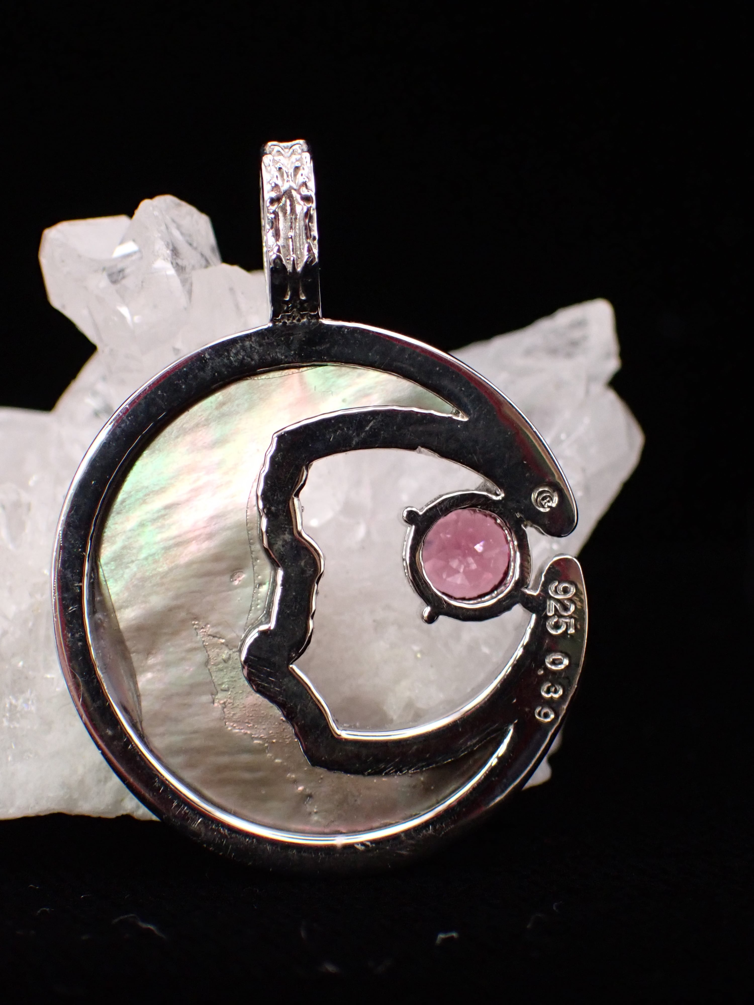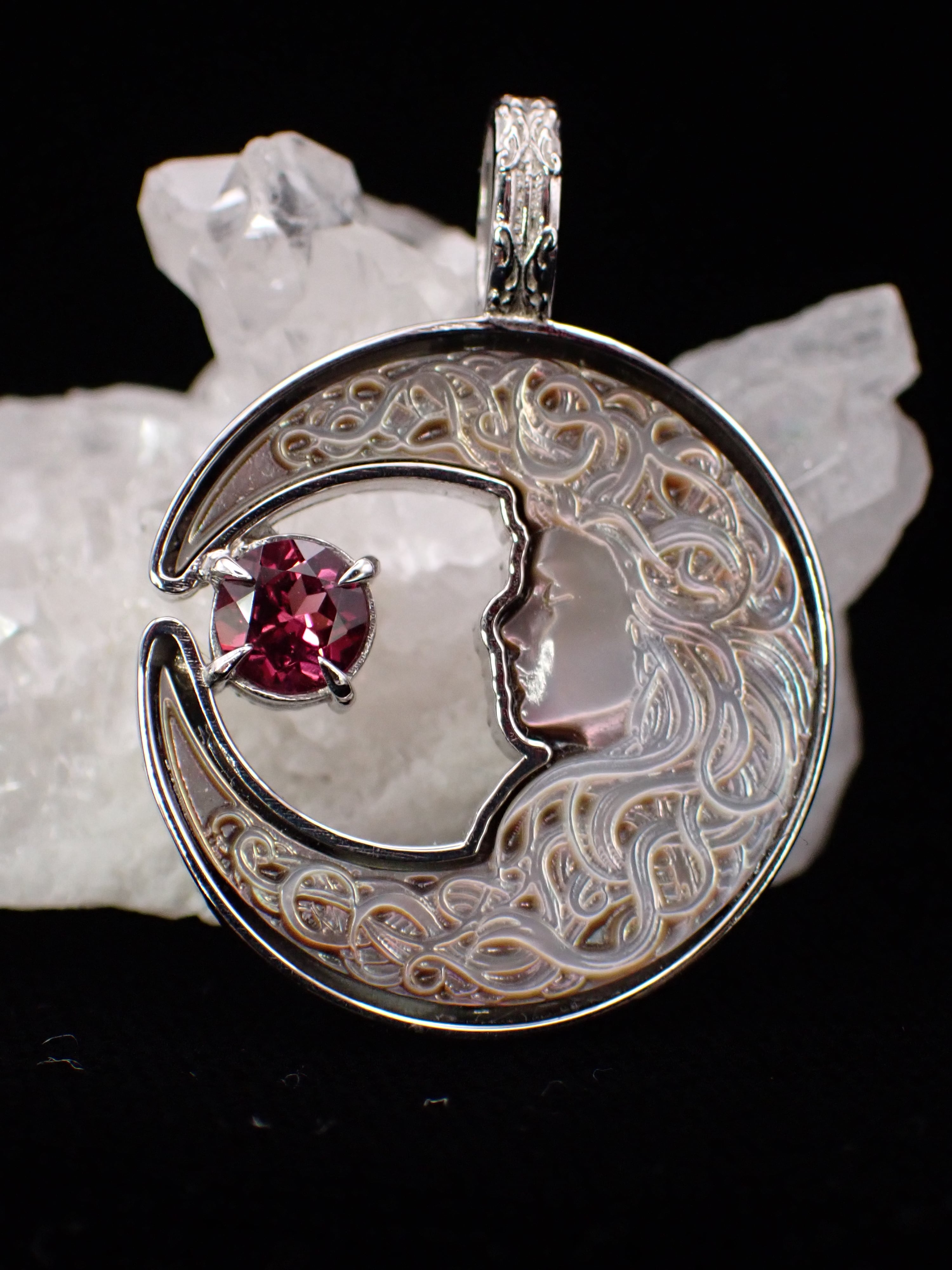 美しく描かれた白蝶貝の月の中に、優しく輝くロードライトガーネットのペンダントです。