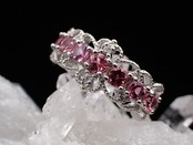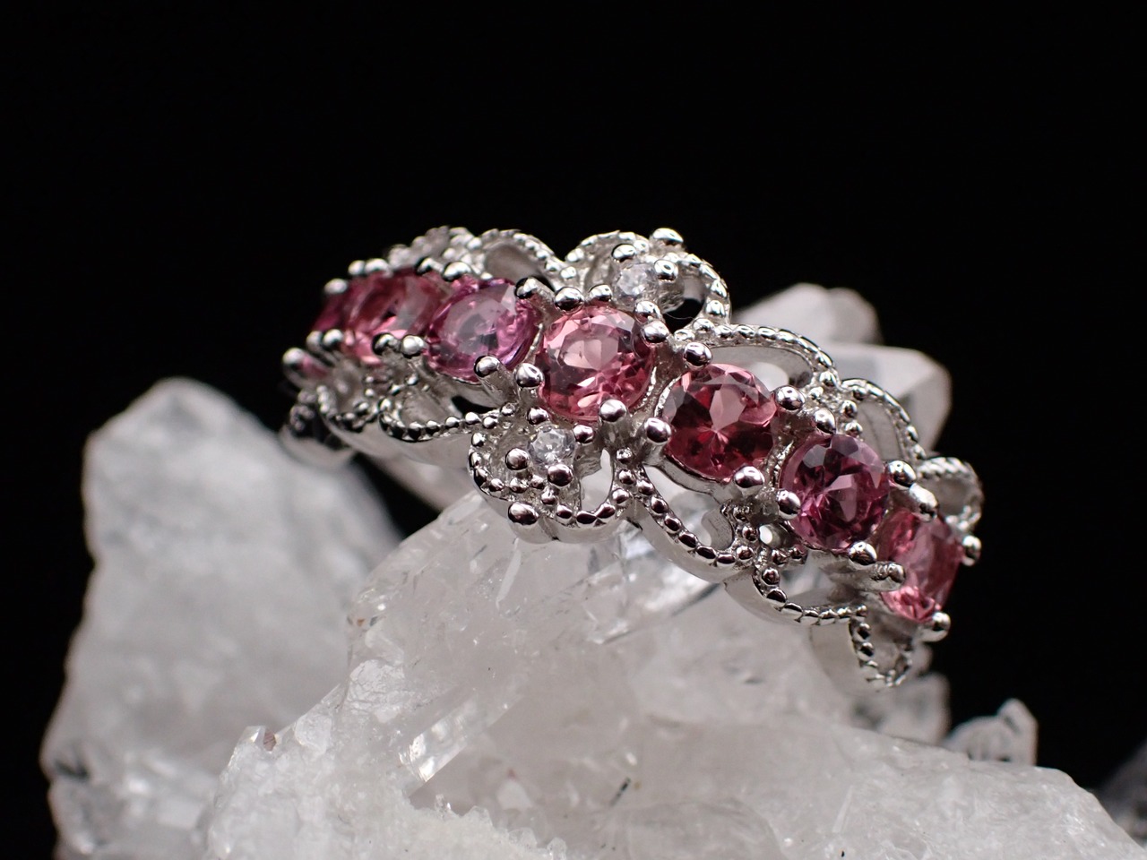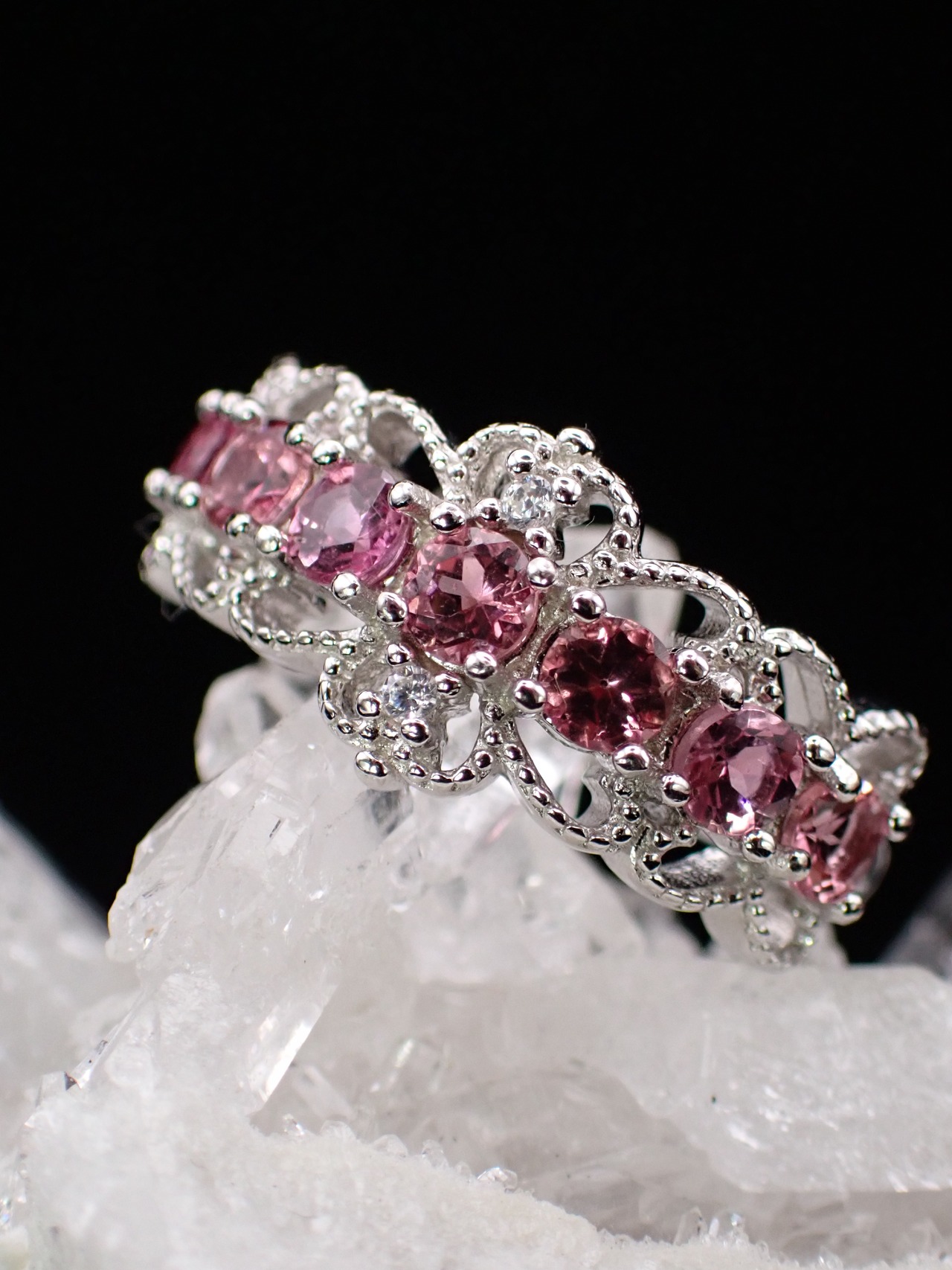 上下にレースがついたようなデザインに、可愛らしいピンクトルマリンが並んだゴージャスなリングです。