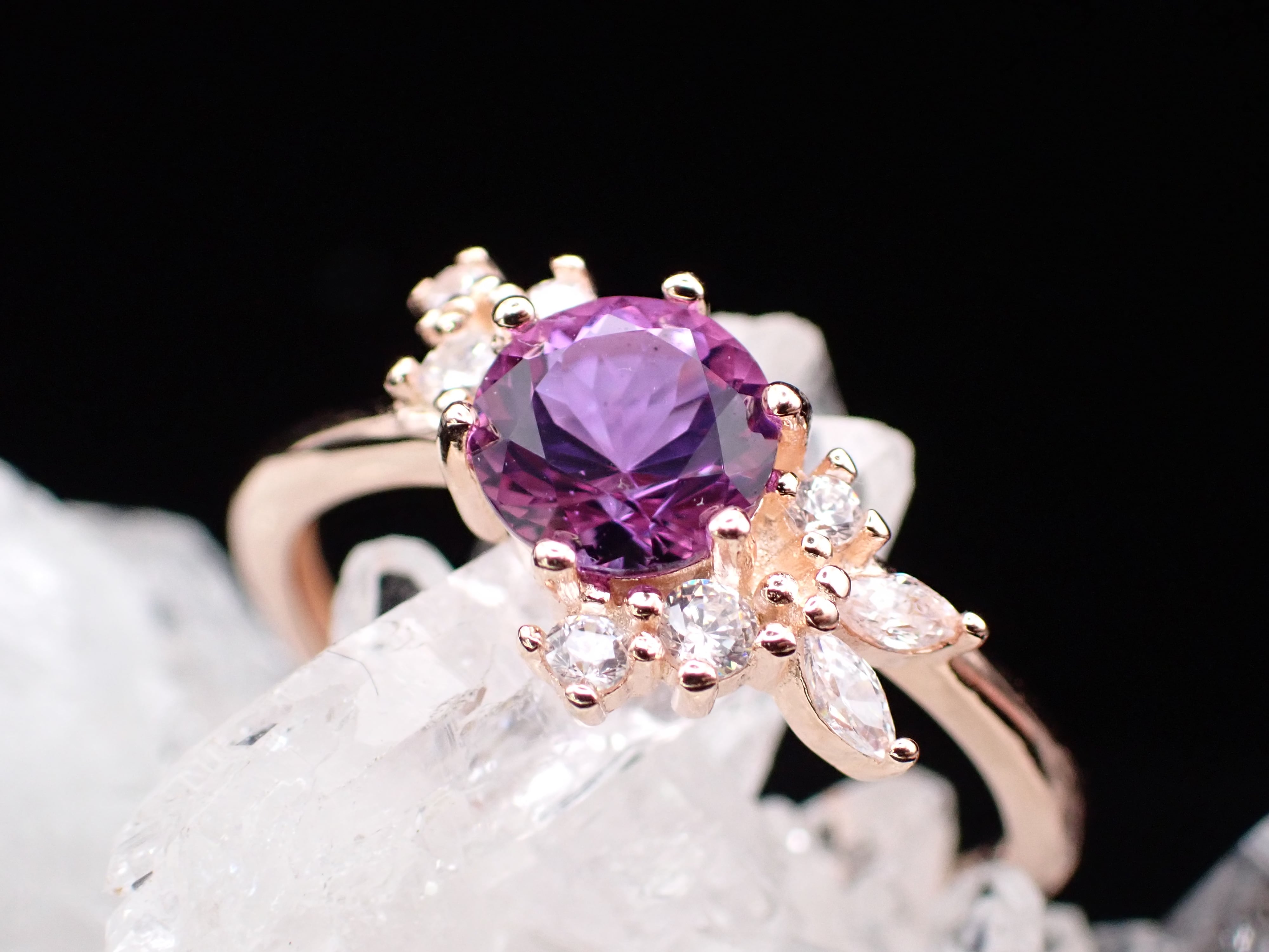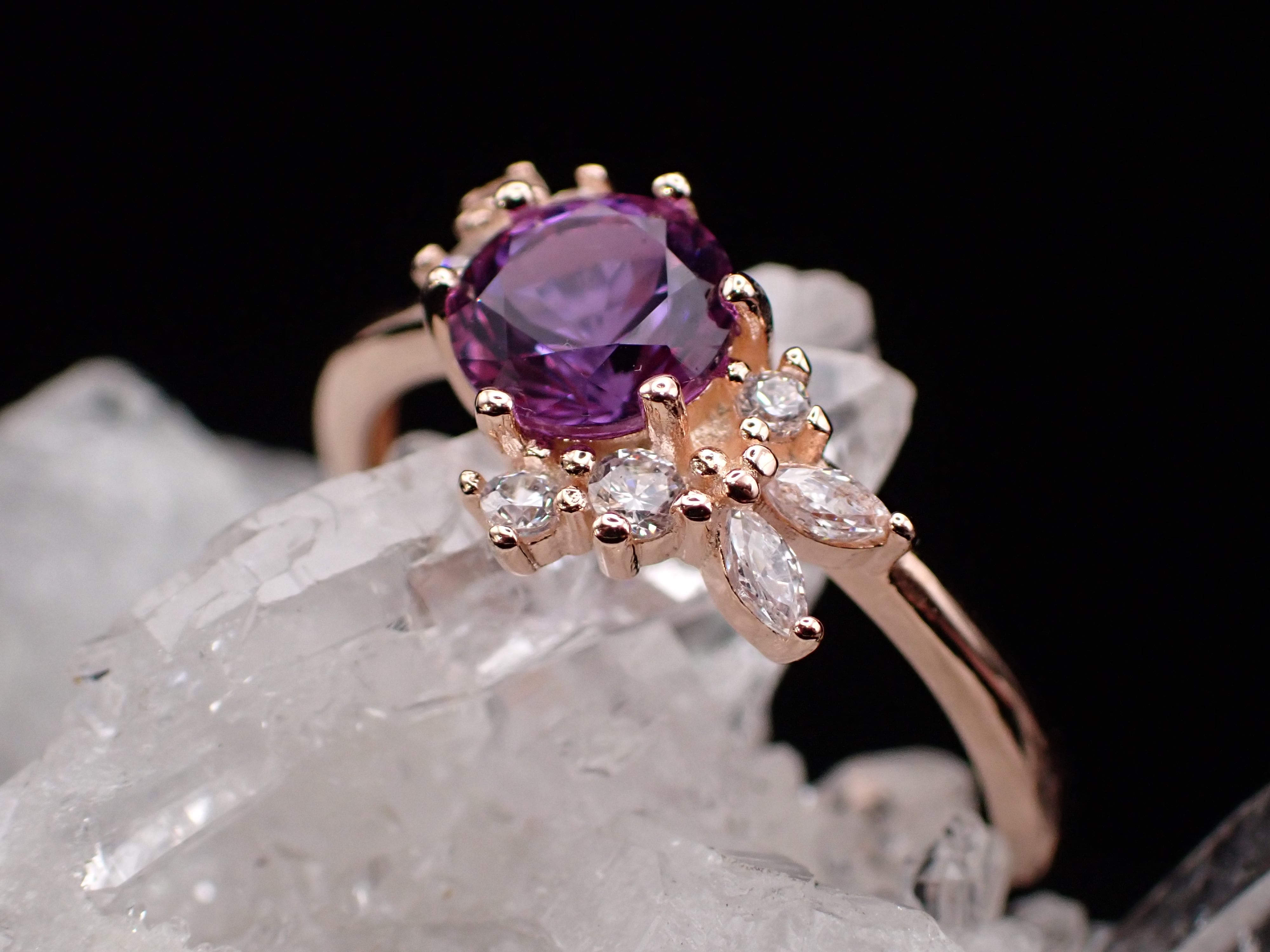 花束のように並んだ小さなジルコニアたちが、カラーシフトが美しいザンドライトガラスをさらに輝かせる繊細なリングです。