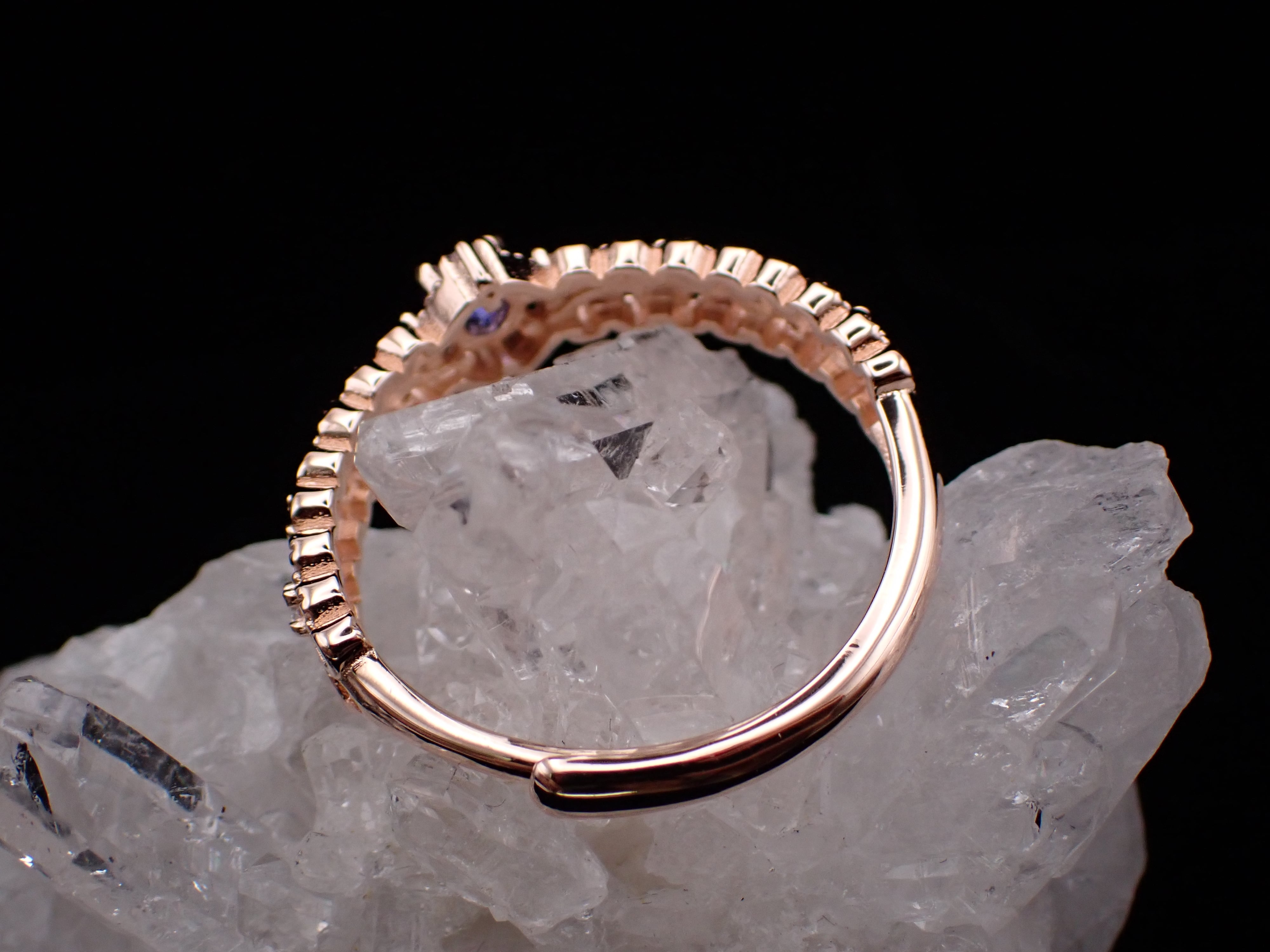 細かく蝶柄にレースを編み込んだ様なデザインに、鮮やかなすみれ色のタンザナイト を添えた可愛らしいリングです。