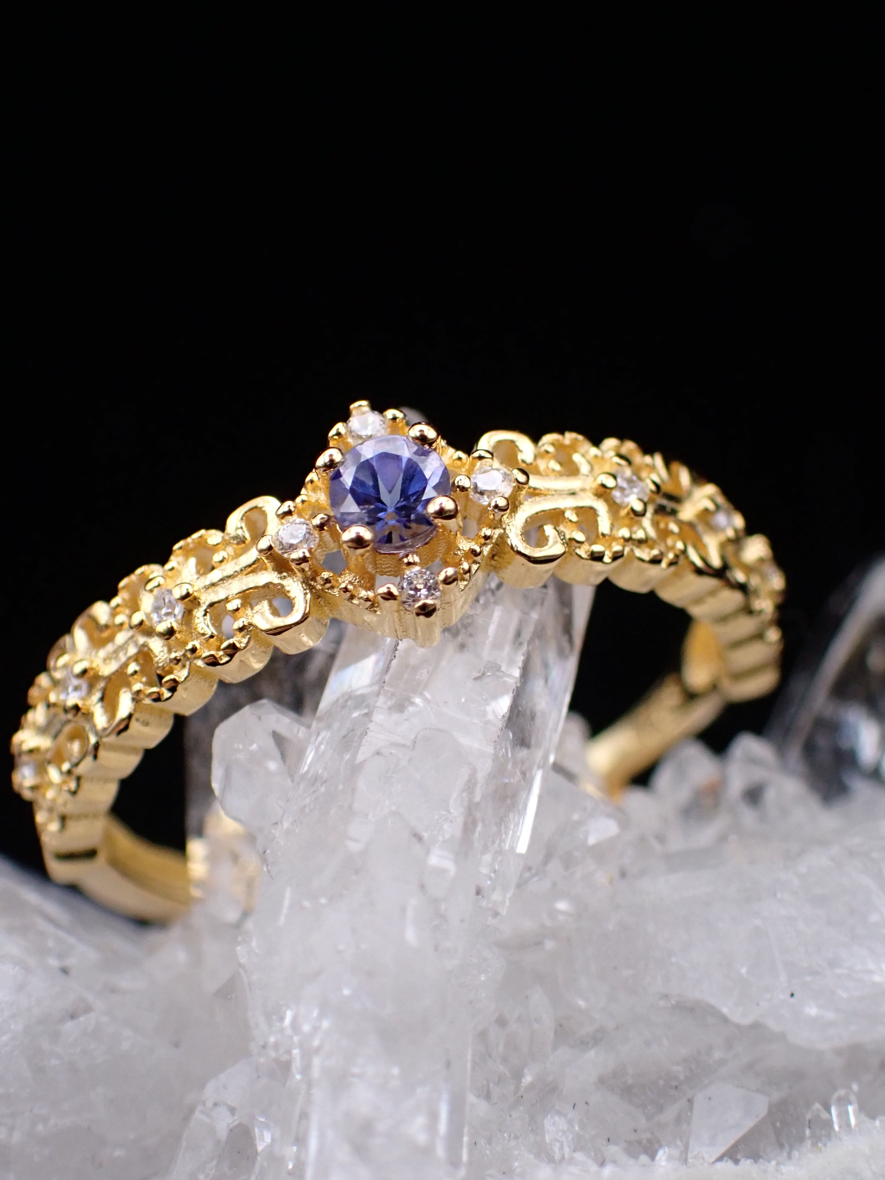 細かく蝶柄にレースを編み込んだ様なデザインに、鮮やかなすみれ色のタンザナイト を添えた可愛らしいリングです。