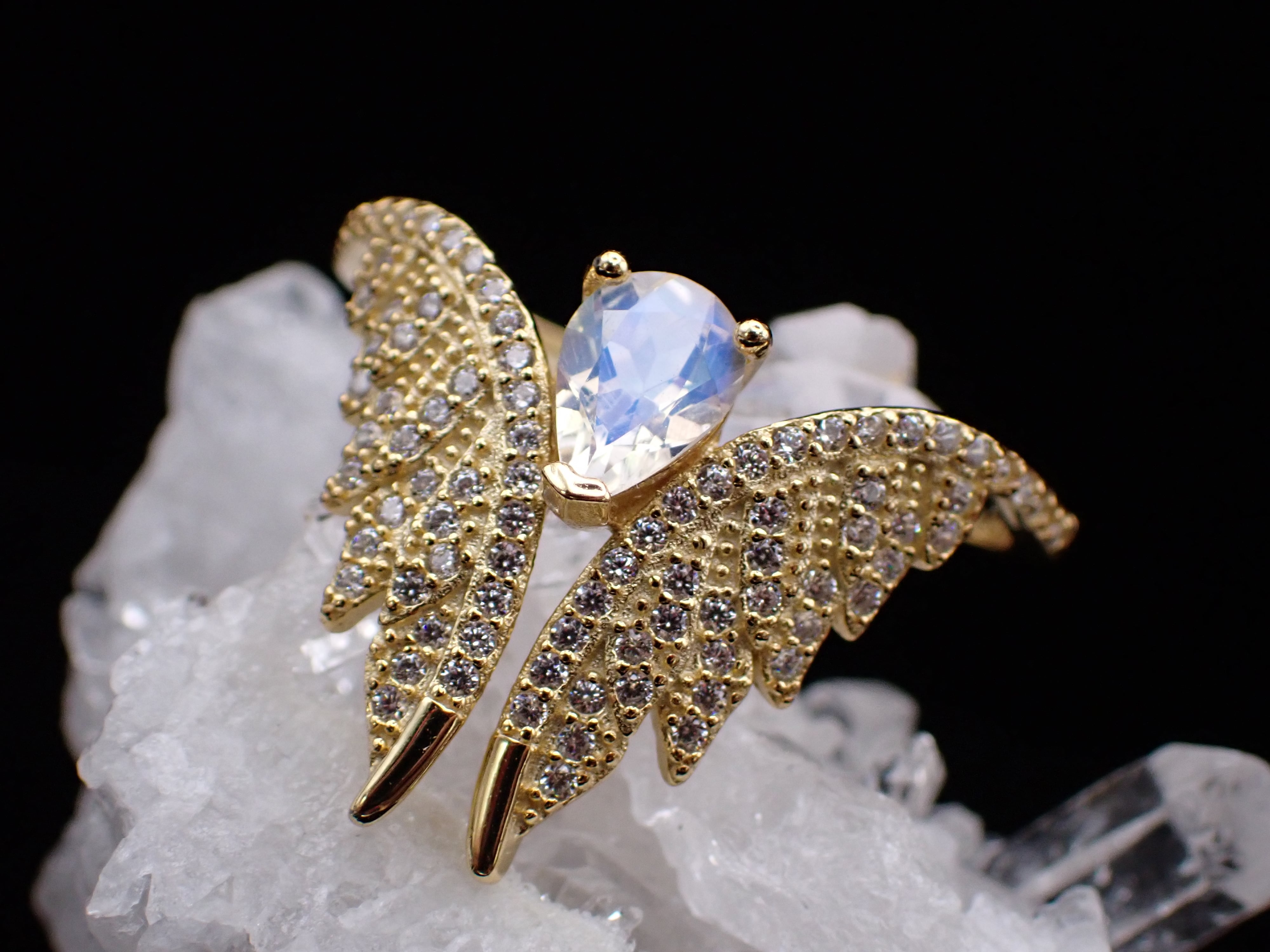 今にも飛び立ちそうな大きな翼のデザインに、優しくシラーが現れるアンデシンラブラドライトを添えた美しいリングです。